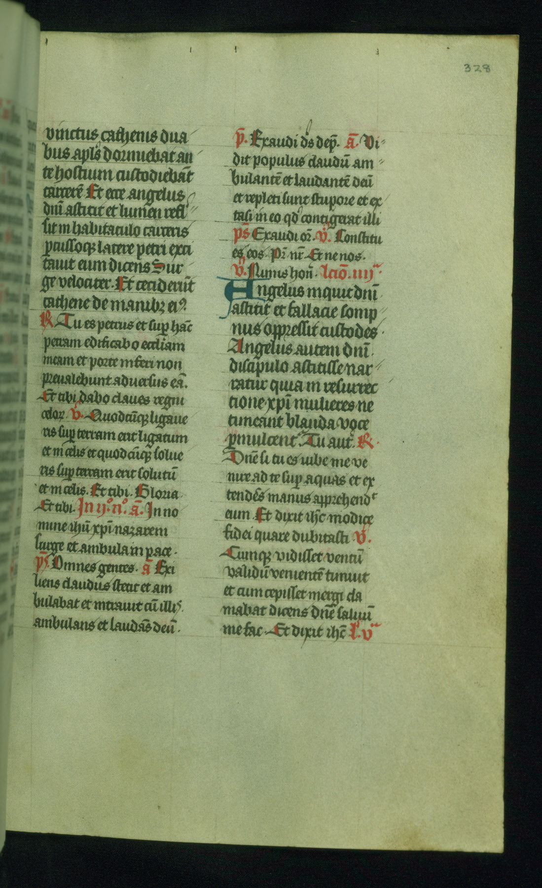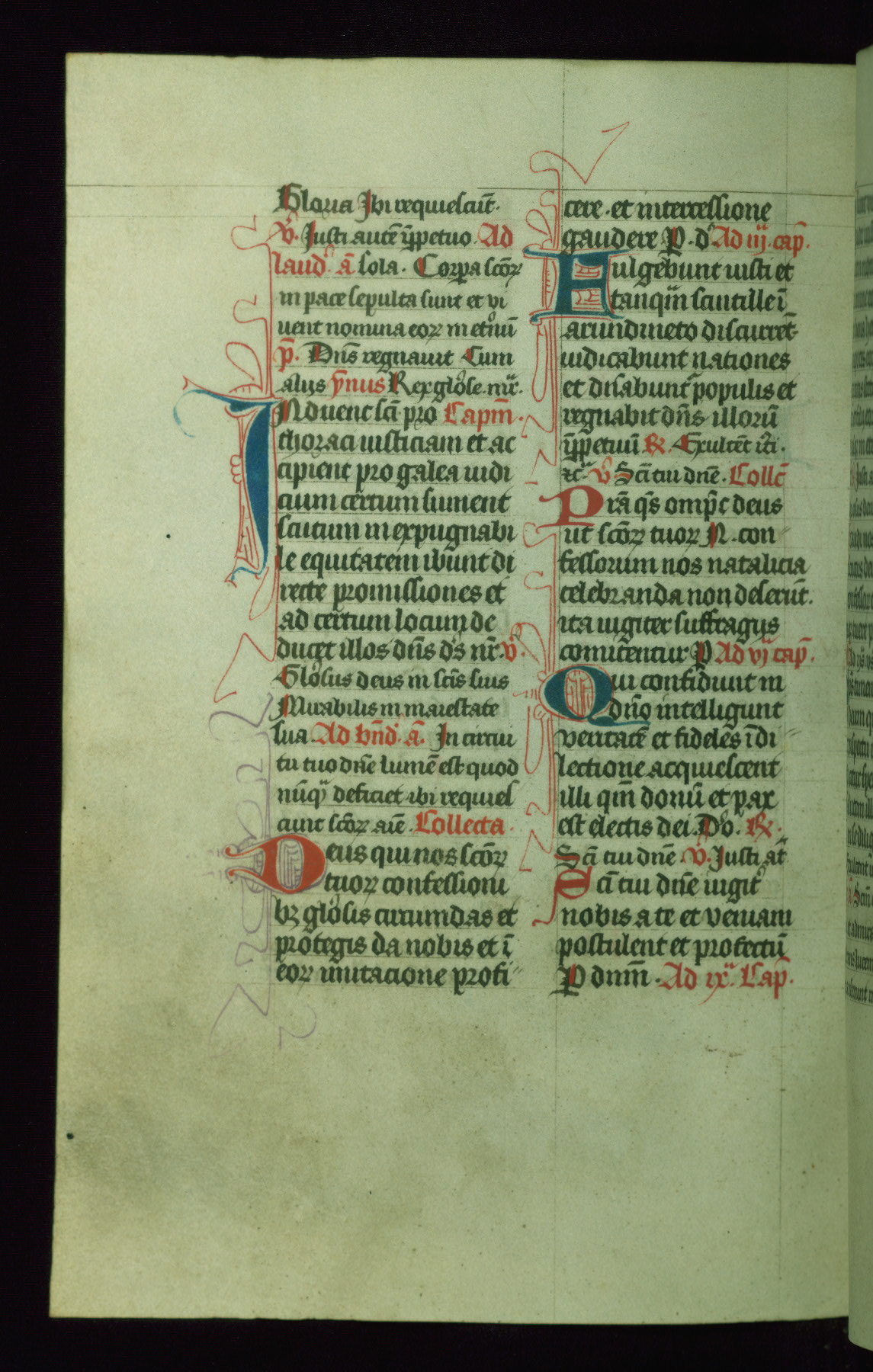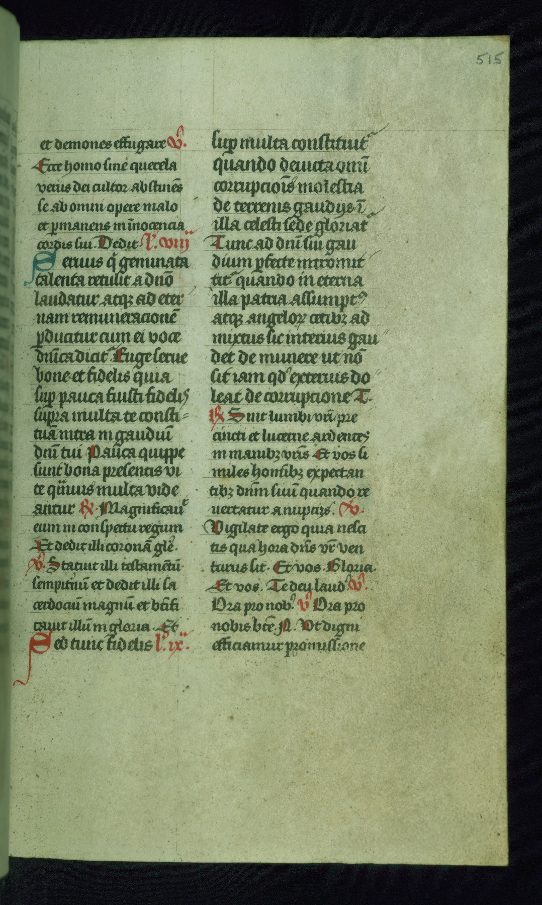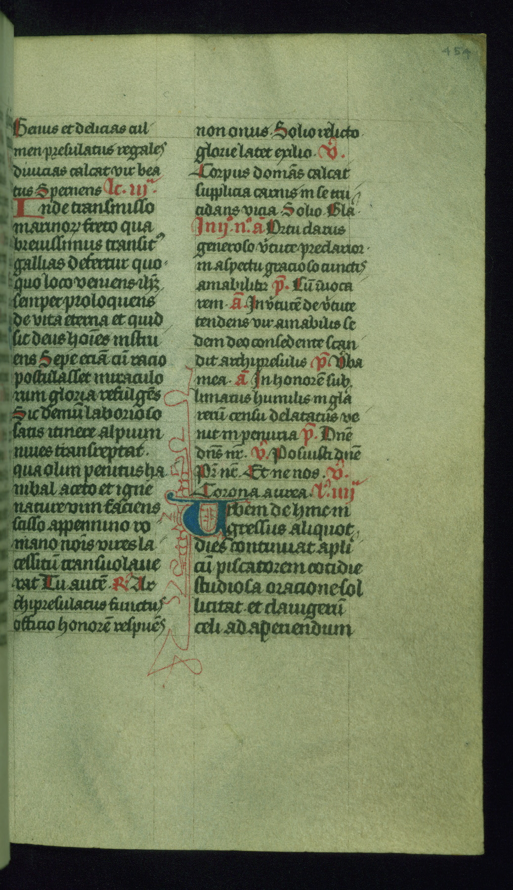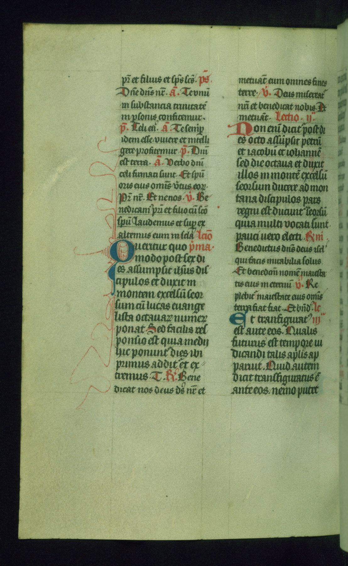 This small breviary, composed of more than 500 folios, is extraordinary for its length, considering it is the summer portion of a two-volume breviary for the use of Liège. The manuscript was completed for ecclesiastical use at the Cathedral of Notre-Dame and St.-Lambert in Liège ca. 1420. This attribution is suggested, for instance, by the petitions to the congregation of this cathedral (fols. 114v-117v), as well as the armorial shield of the family of Surlet de Chokier of Liège represented at the opening of the Psalms. The manuscript has modest, but interesting, decoration with historiated and decorated initials marking the liturgical texts, and occasional angels playing instruments in the margins. The most notable pictorial effect is found in the initials inhabited by transparent figures on rich blue ground. The technique is found, for instance, on fol. 156r with the gold monstrance held by translucent angels for the feast of the Corpus Christi.