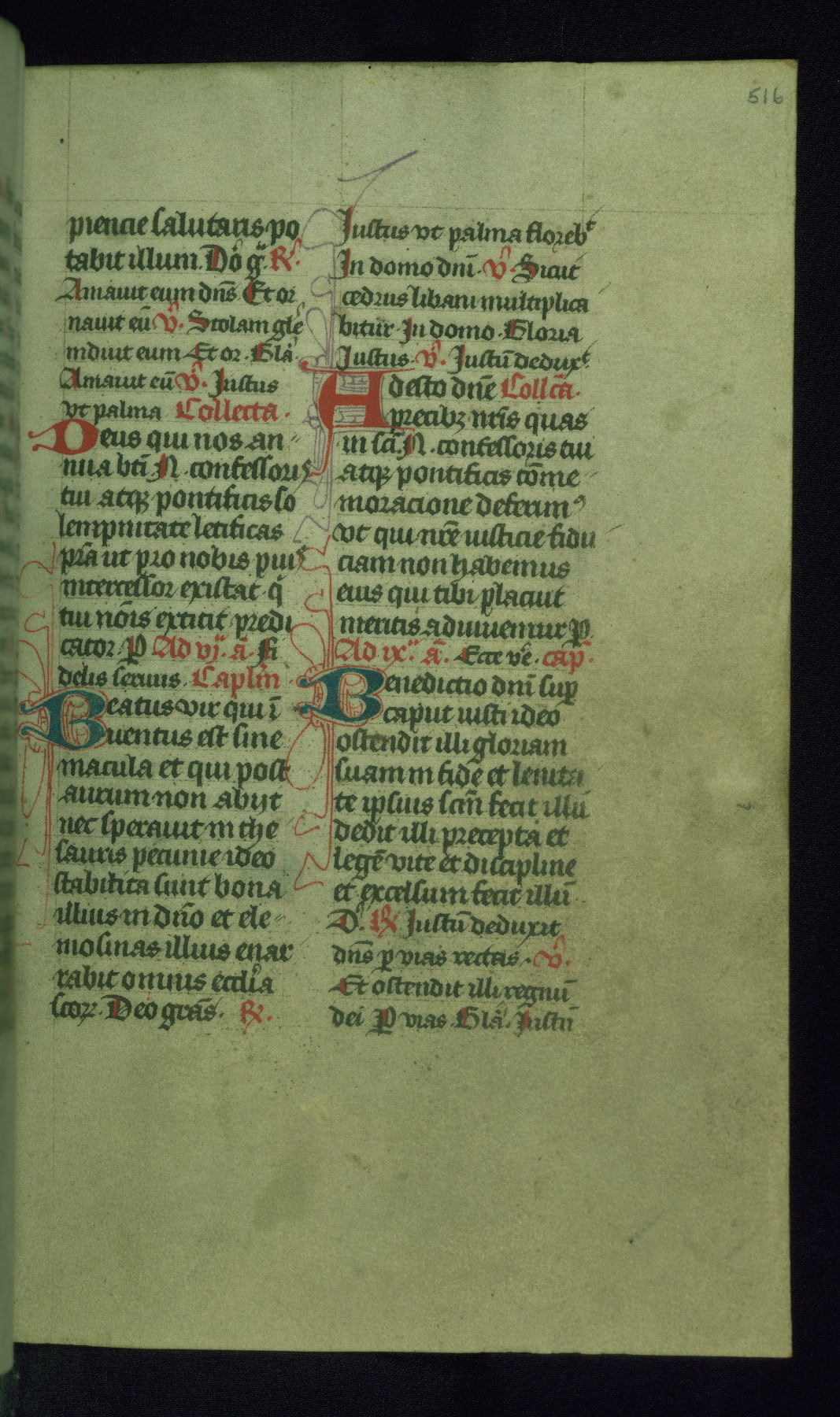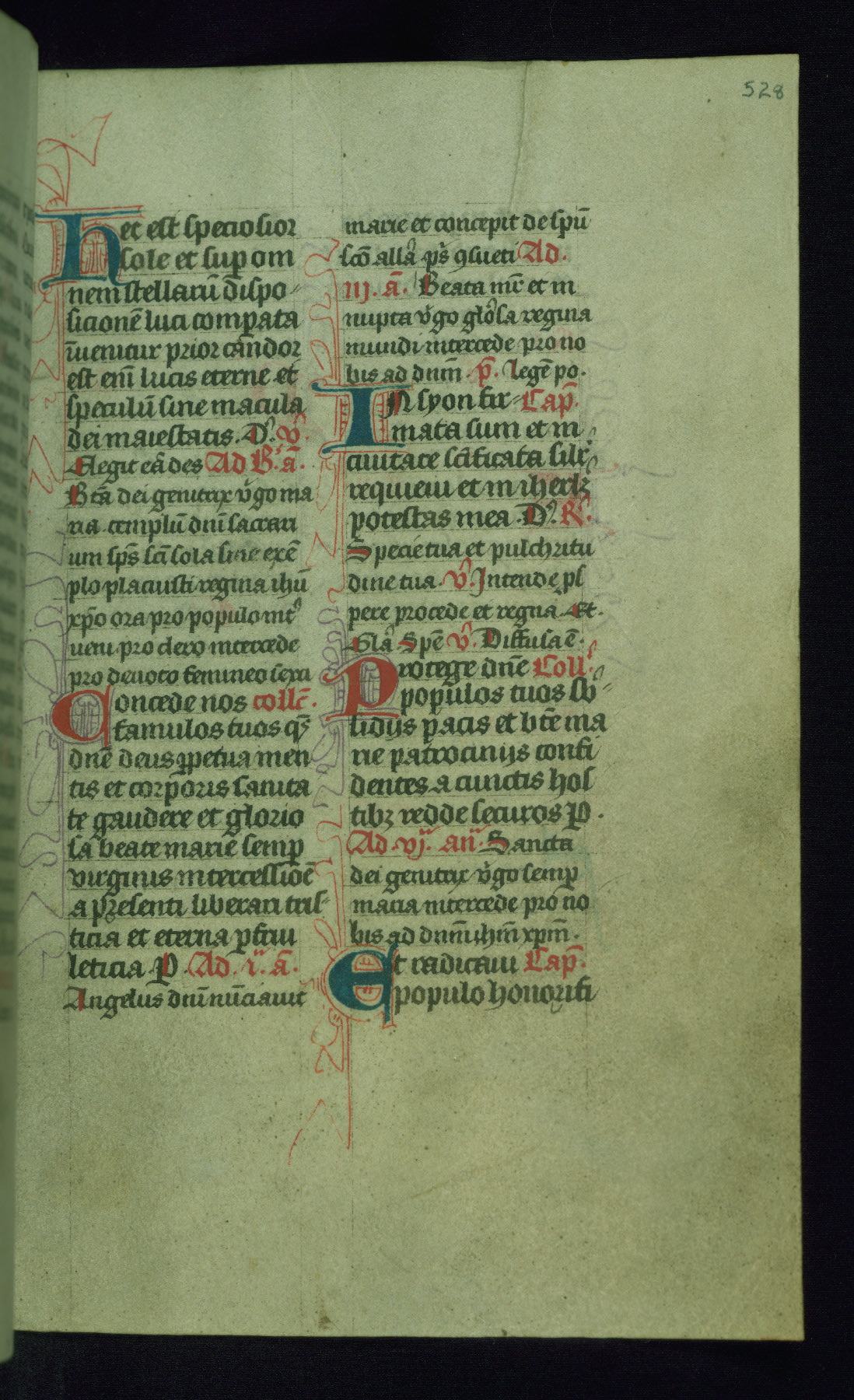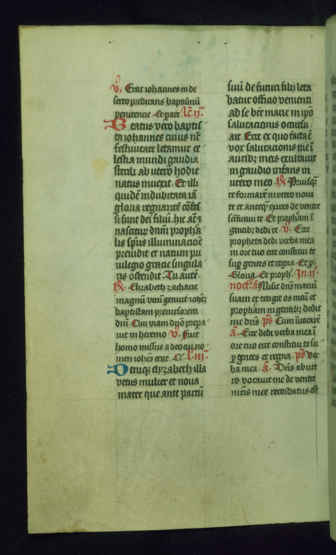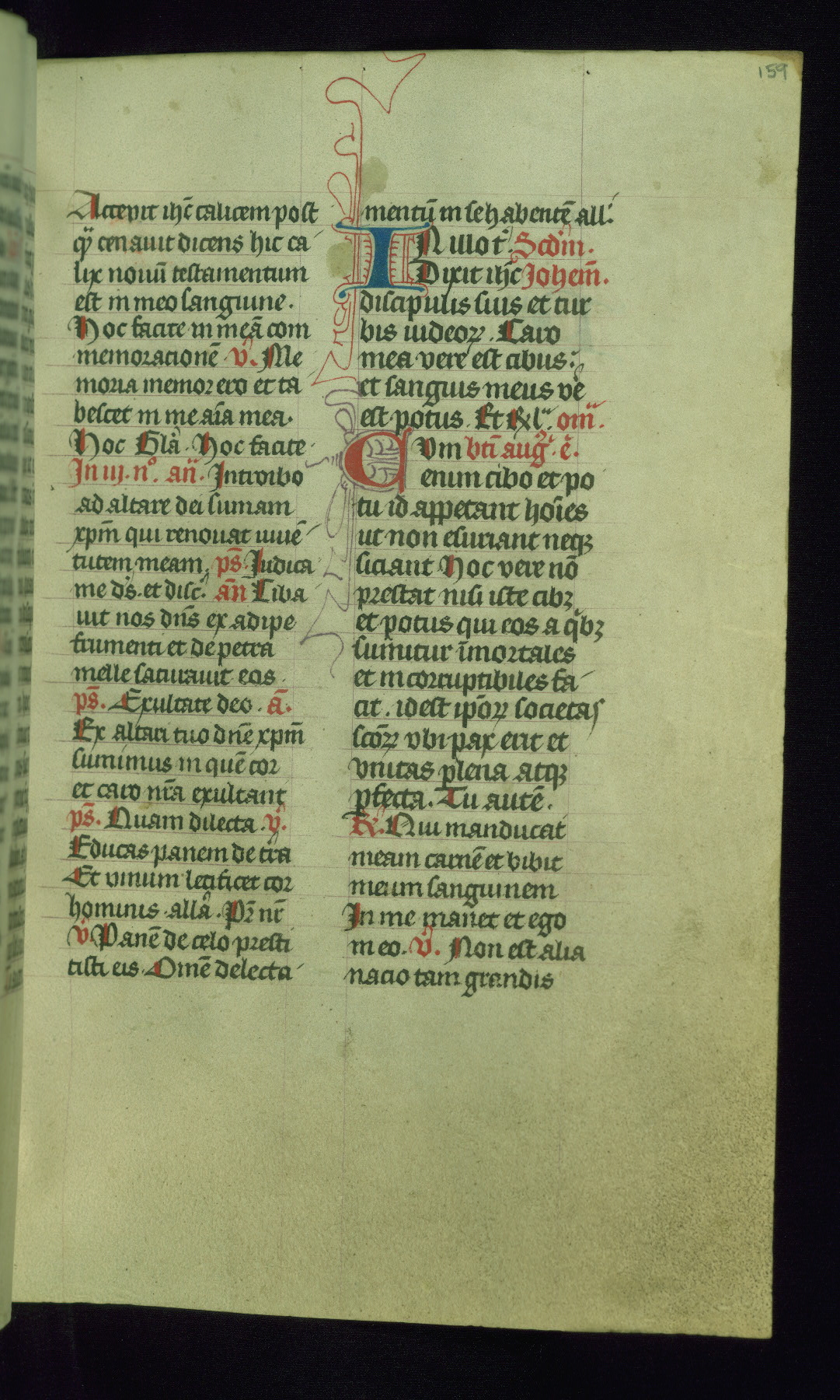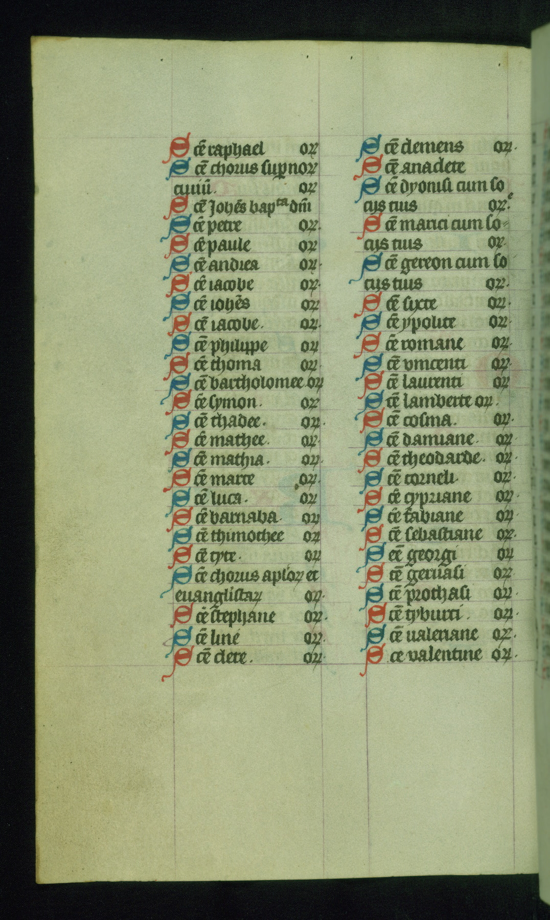 This small breviary, composed of more than 500 folios, is extraordinary for its length, considering it is the summer portion of a two-volume breviary for the use of Liège. The manuscript was completed for ecclesiastical use at the Cathedral of Notre-Dame and St.-Lambert in Liège ca. 1420. This attribution is suggested, for instance, by the petitions to the congregation of this cathedral (fols. 114v-117v), as well as the armorial shield of the family of Surlet de Chokier of Liège represented at the opening of the Psalms. The manuscript has modest, but interesting, decoration with historiated and decorated initials marking the liturgical texts, and occasional angels playing instruments in the margins. The most notable pictorial effect is found in the initials inhabited by transparent figures on rich blue ground. The technique is found, for instance, on fol. 156r with the gold monstrance held by translucent angels for the feast of the Corpus Christi.