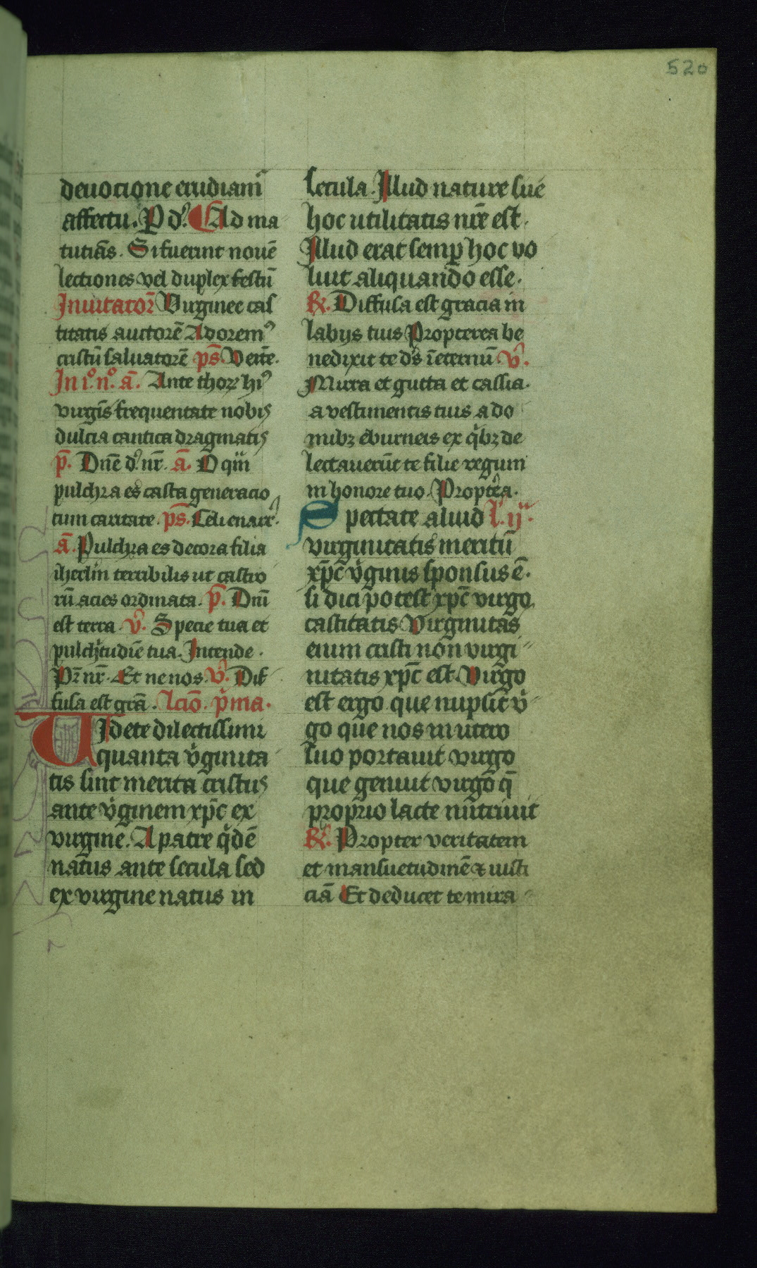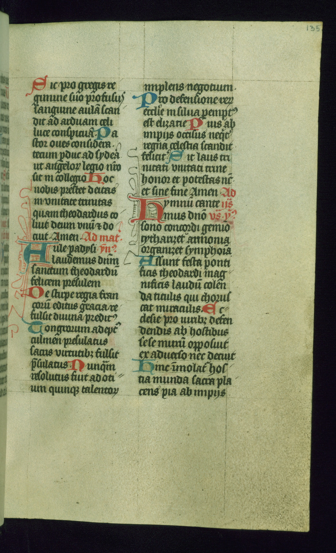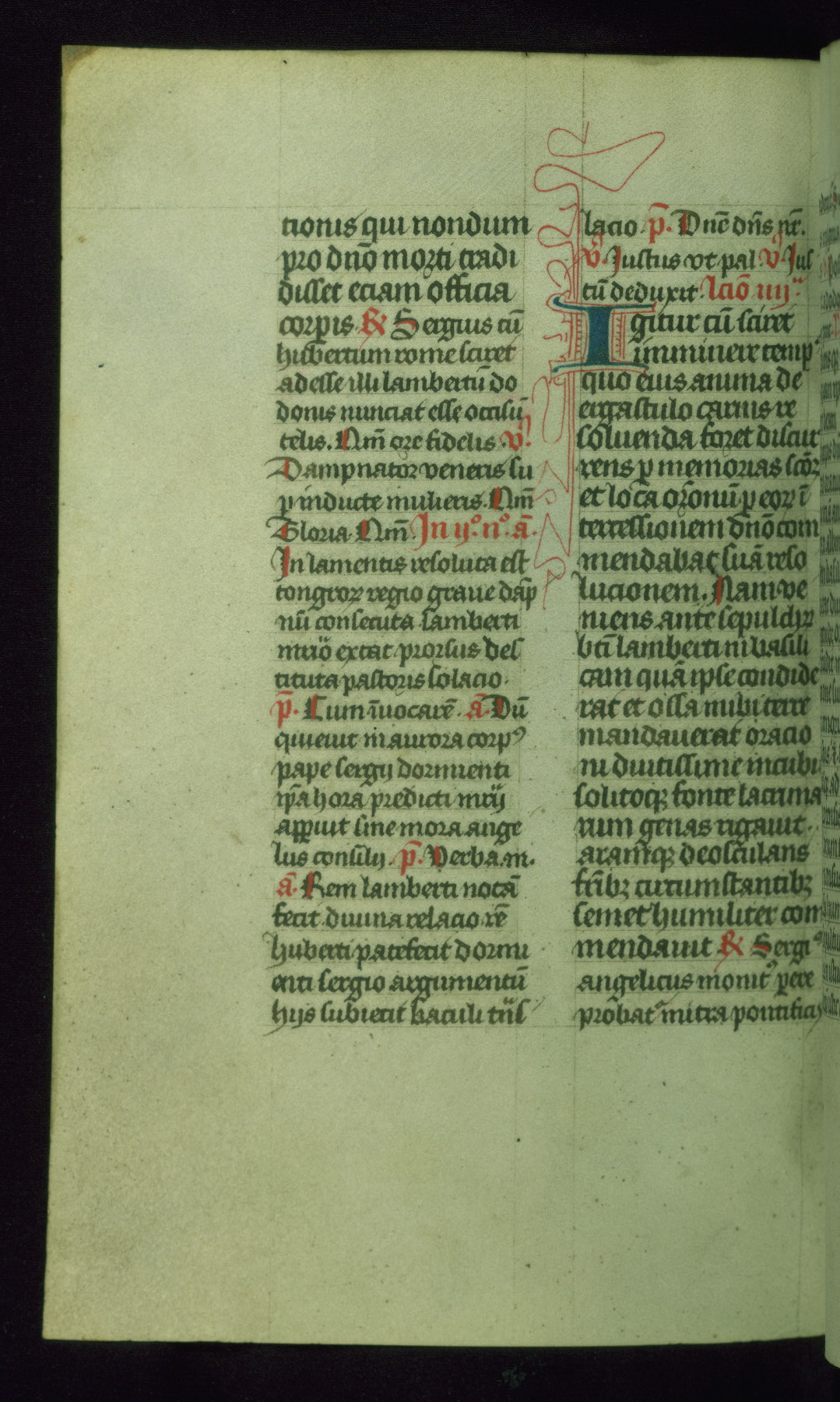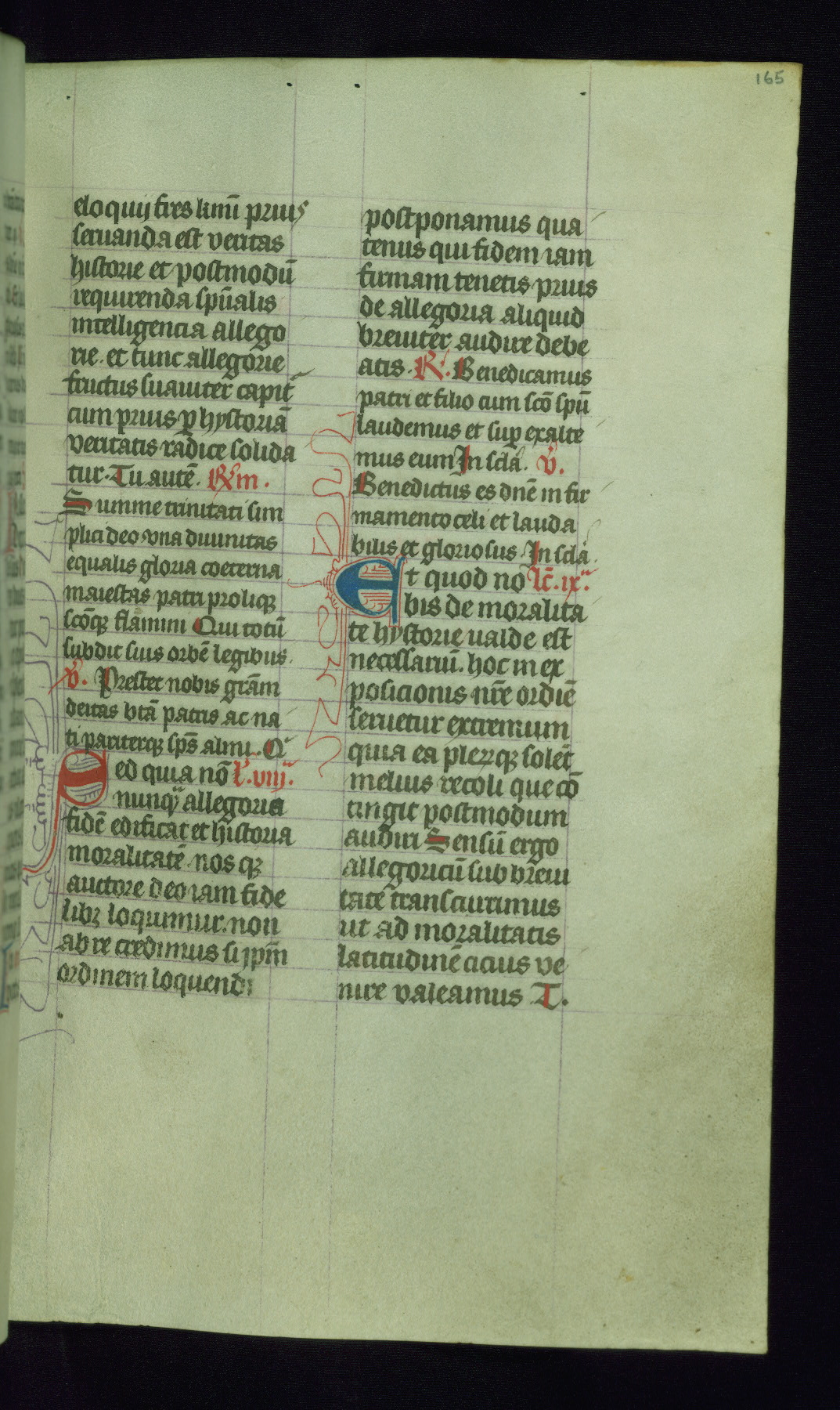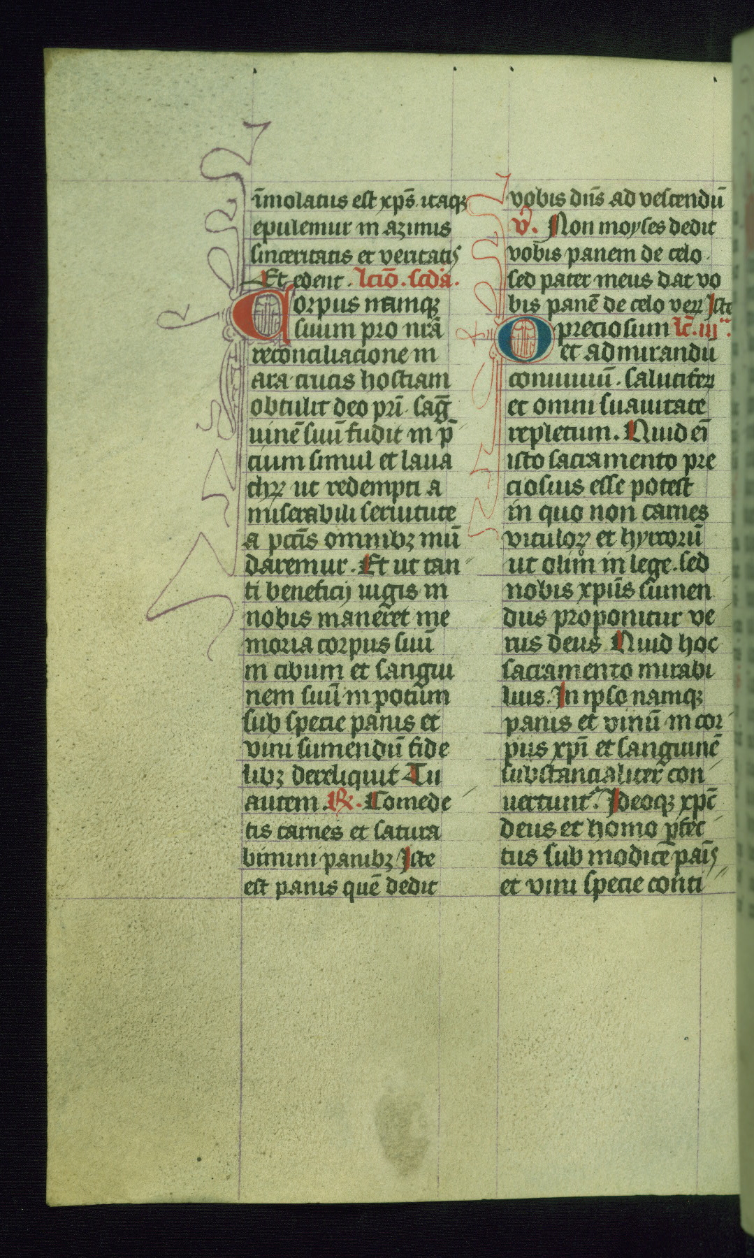 This small breviary, composed of more than 500 folios, is extraordinary for its length, considering it is the summer portion of a two-volume breviary for the use of Liège. The manuscript was completed for ecclesiastical use at the Cathedral of Notre-Dame and St.-Lambert in Liège ca. 1420. This attribution is suggested, for instance, by the petitions to the congregation of this cathedral (fols. 114v-117v), as well as the armorial shield of the family of Surlet de Chokier of Liège represented at the opening of the Psalms. The manuscript has modest, but interesting, decoration with historiated and decorated initials marking the liturgical texts, and occasional angels playing instruments in the margins. The most notable pictorial effect is found in the initials inhabited by transparent figures on rich blue ground. The technique is found, for instance, on fol. 156r with the gold monstrance held by translucent angels for the feast of the Corpus Christi.