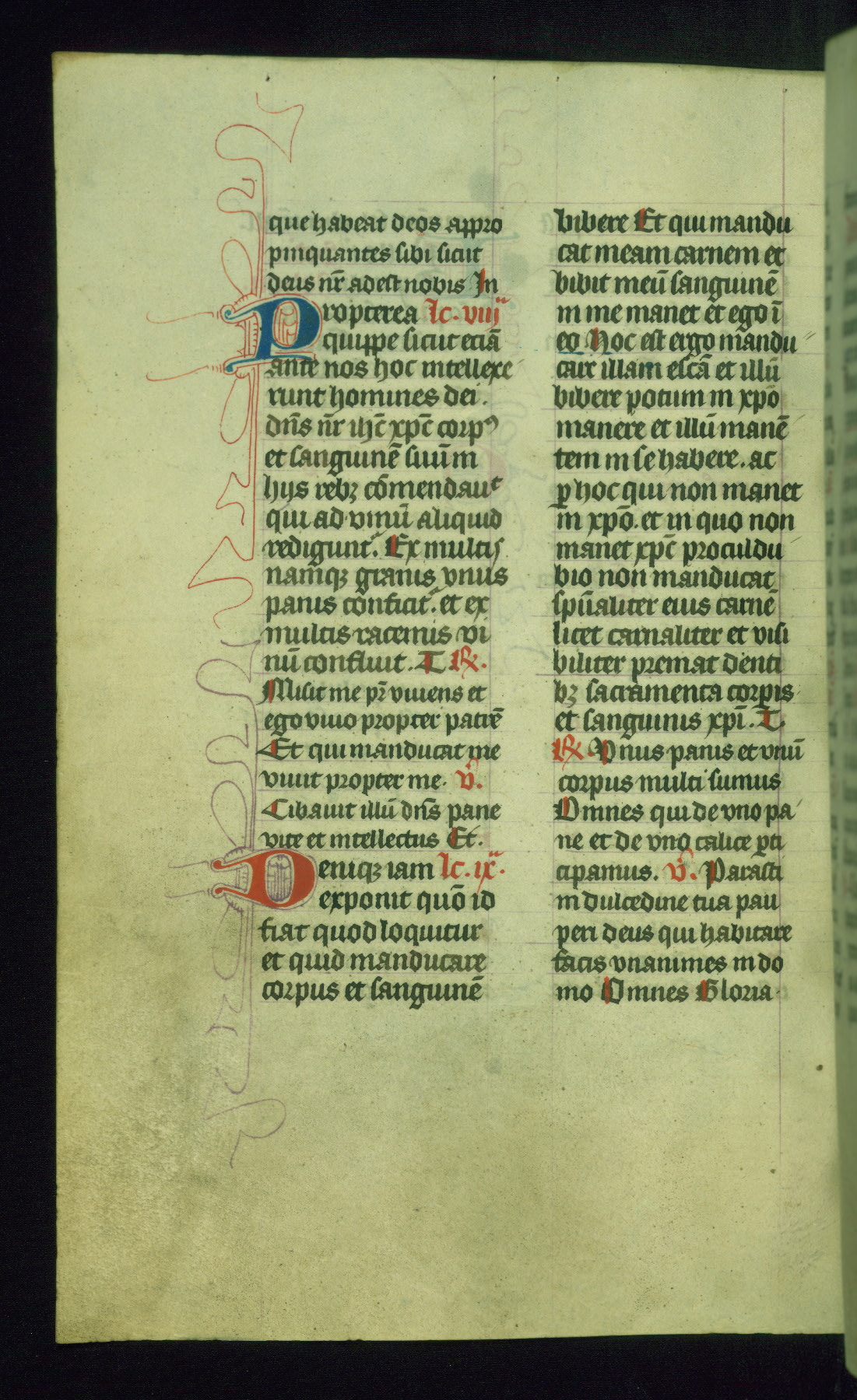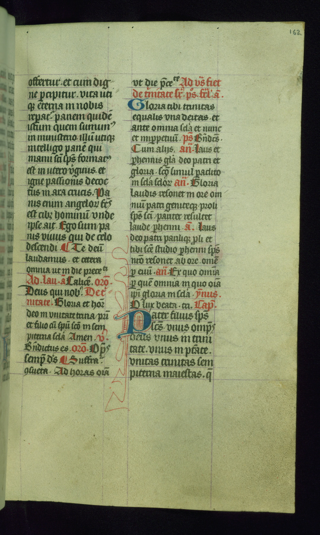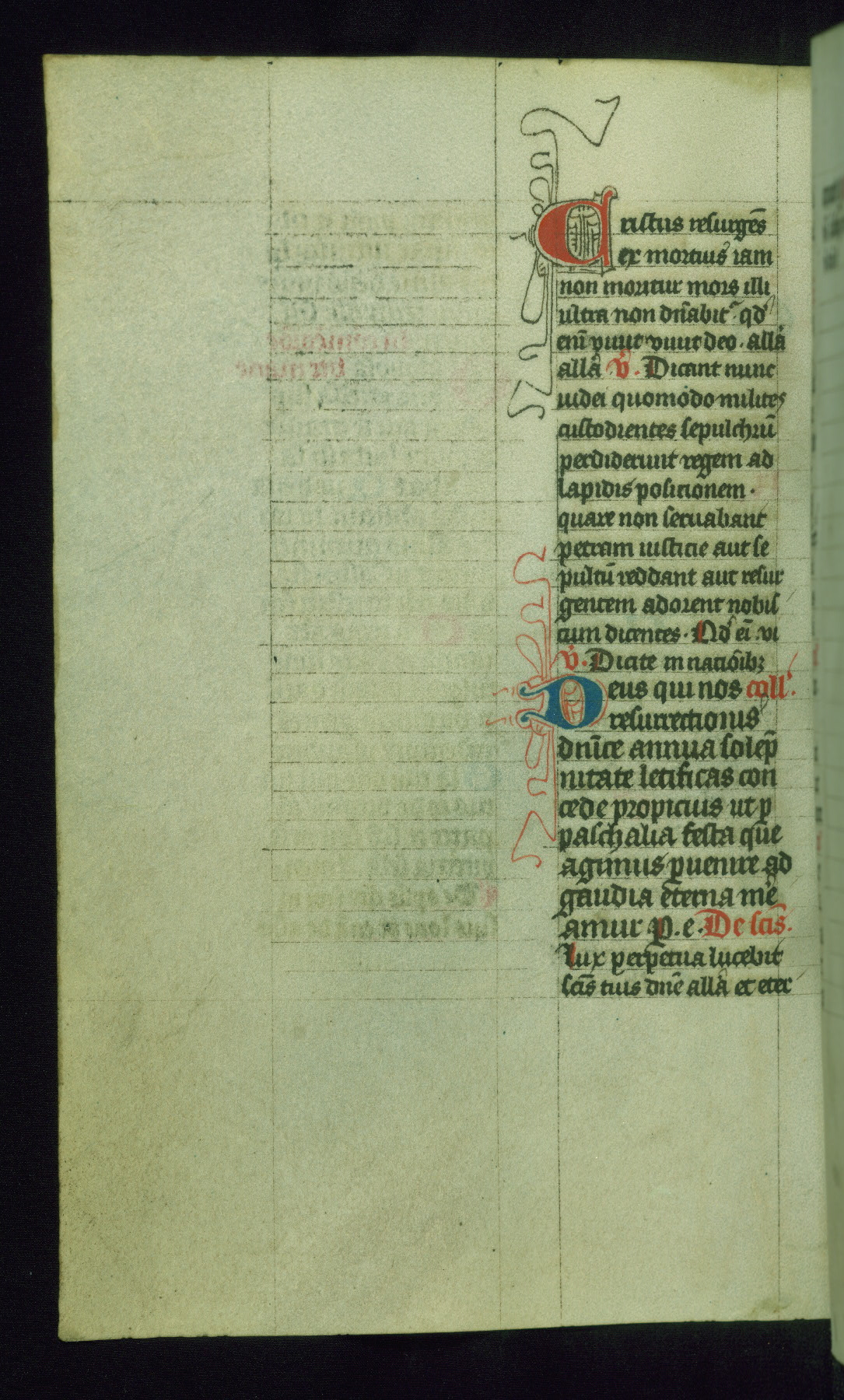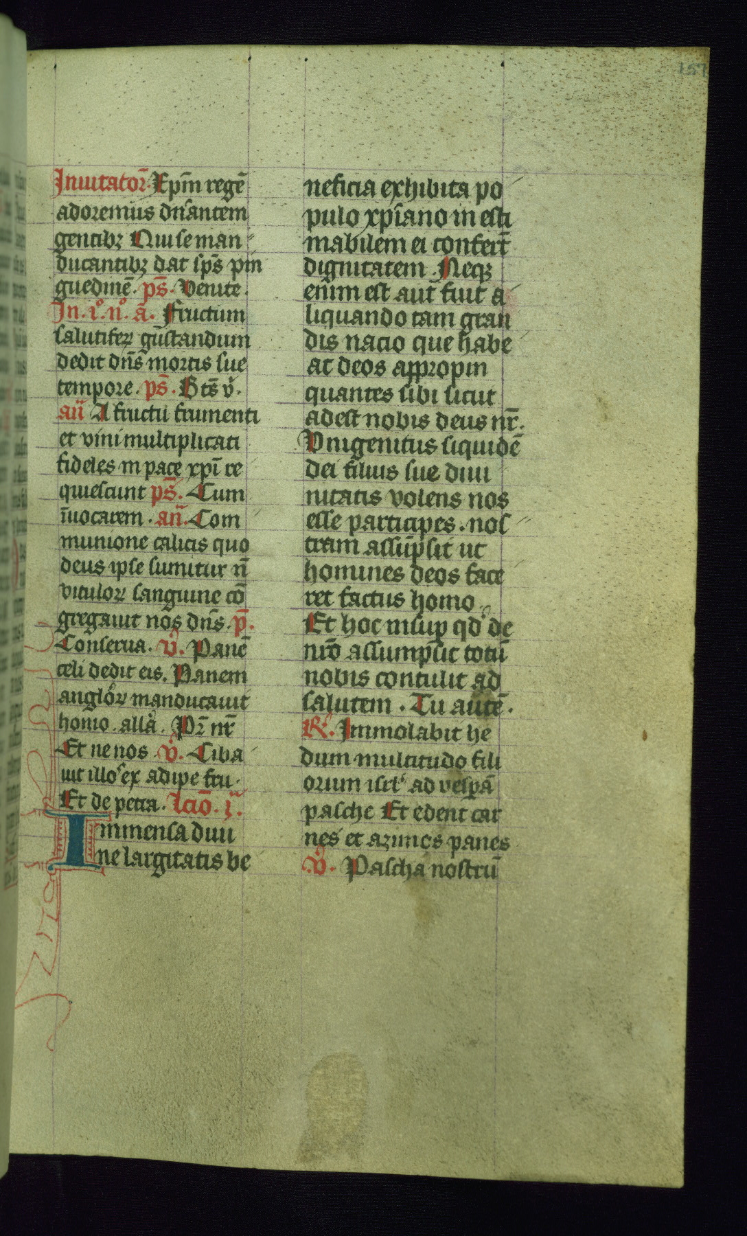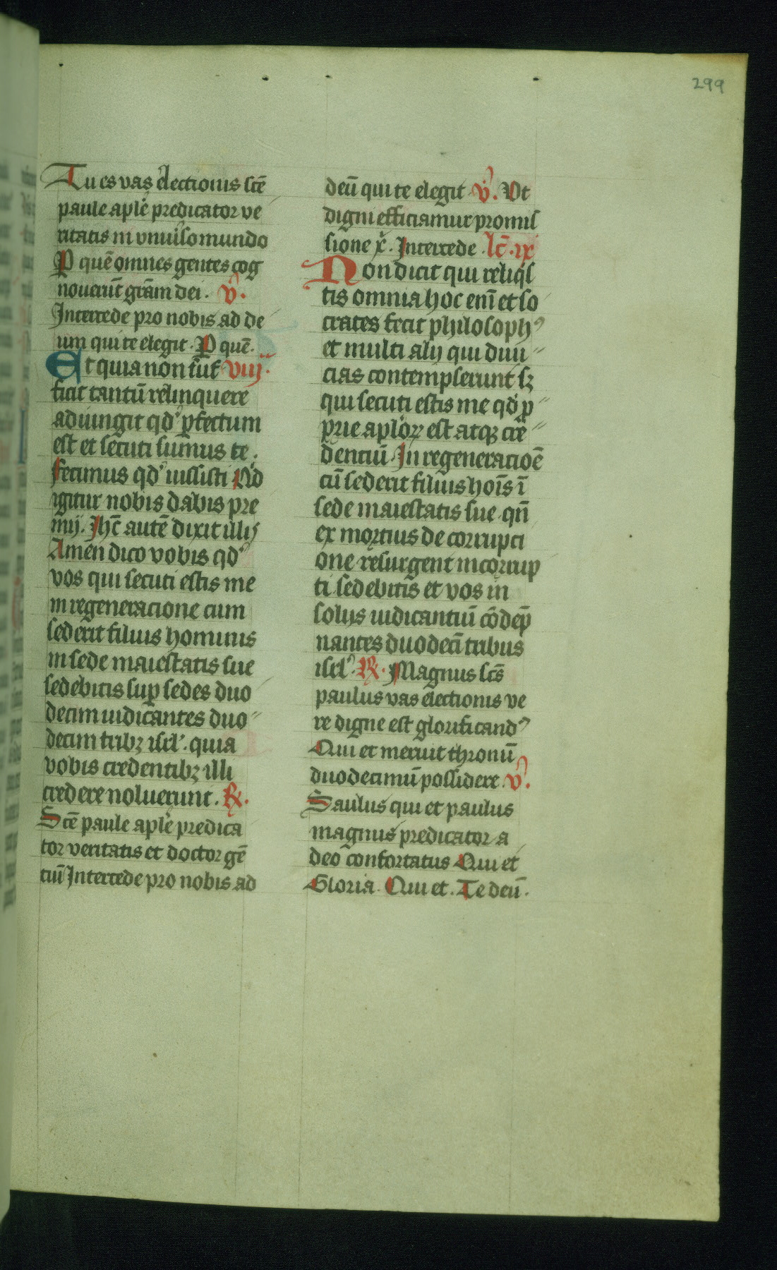 This small breviary, composed of more than 500 folios, is extraordinary for its length, considering it is the summer portion of a two-volume breviary for the use of Liège. The manuscript was completed for ecclesiastical use at the Cathedral of Notre-Dame and St.-Lambert in Liège ca. 1420. This attribution is suggested, for instance, by the petitions to the congregation of this cathedral (fols. 114v-117v), as well as the armorial shield of the family of Surlet de Chokier of Liège represented at the opening of the Psalms. The manuscript has modest, but interesting, decoration with historiated and decorated initials marking the liturgical texts, and occasional angels playing instruments in the margins. The most notable pictorial effect is found in the initials inhabited by transparent figures on rich blue ground. The technique is found, for instance, on fol. 156r with the gold monstrance held by translucent angels for the feast of the Corpus Christi.