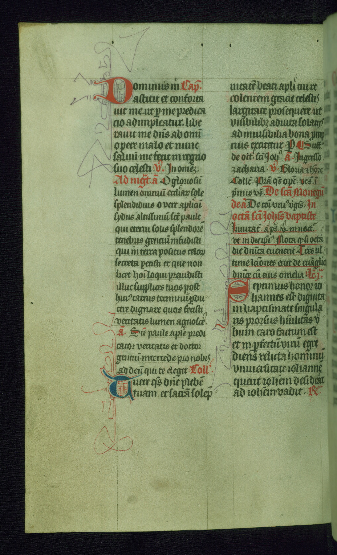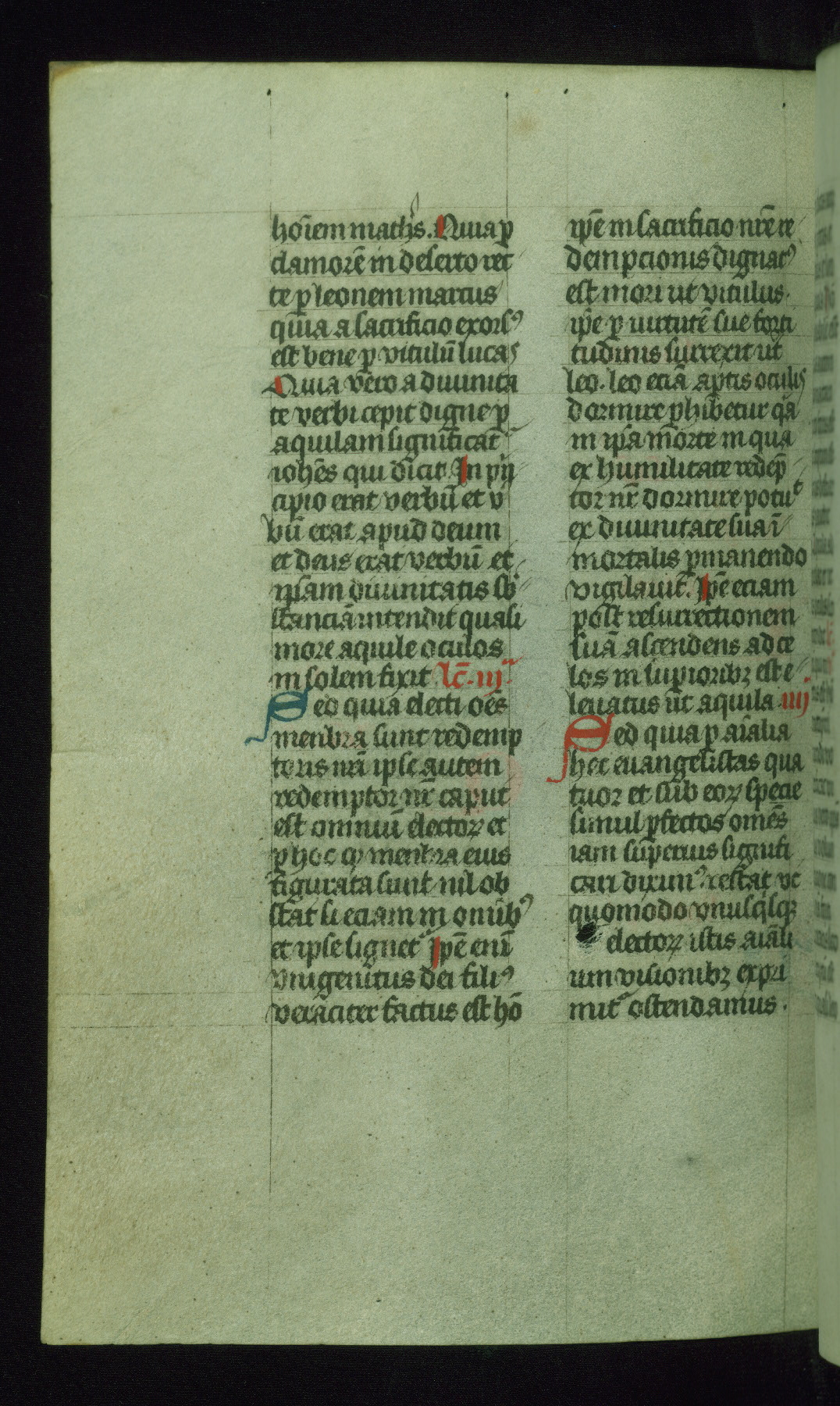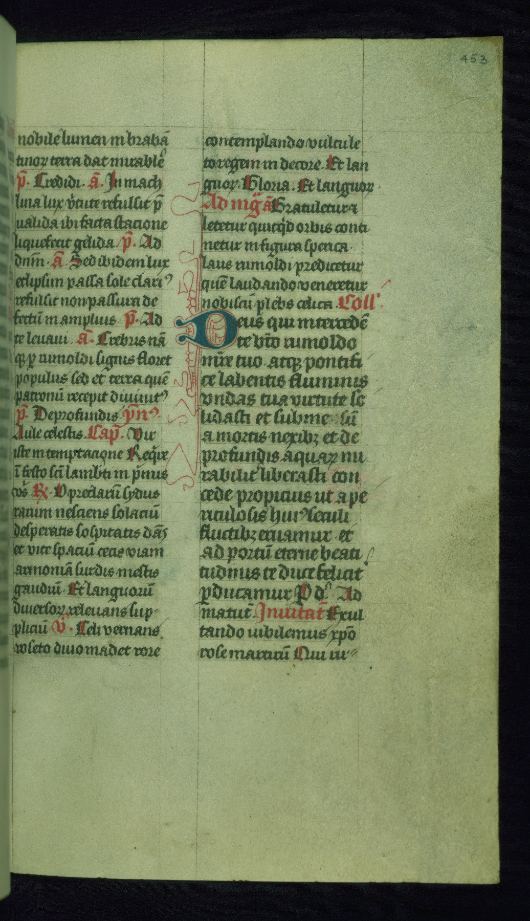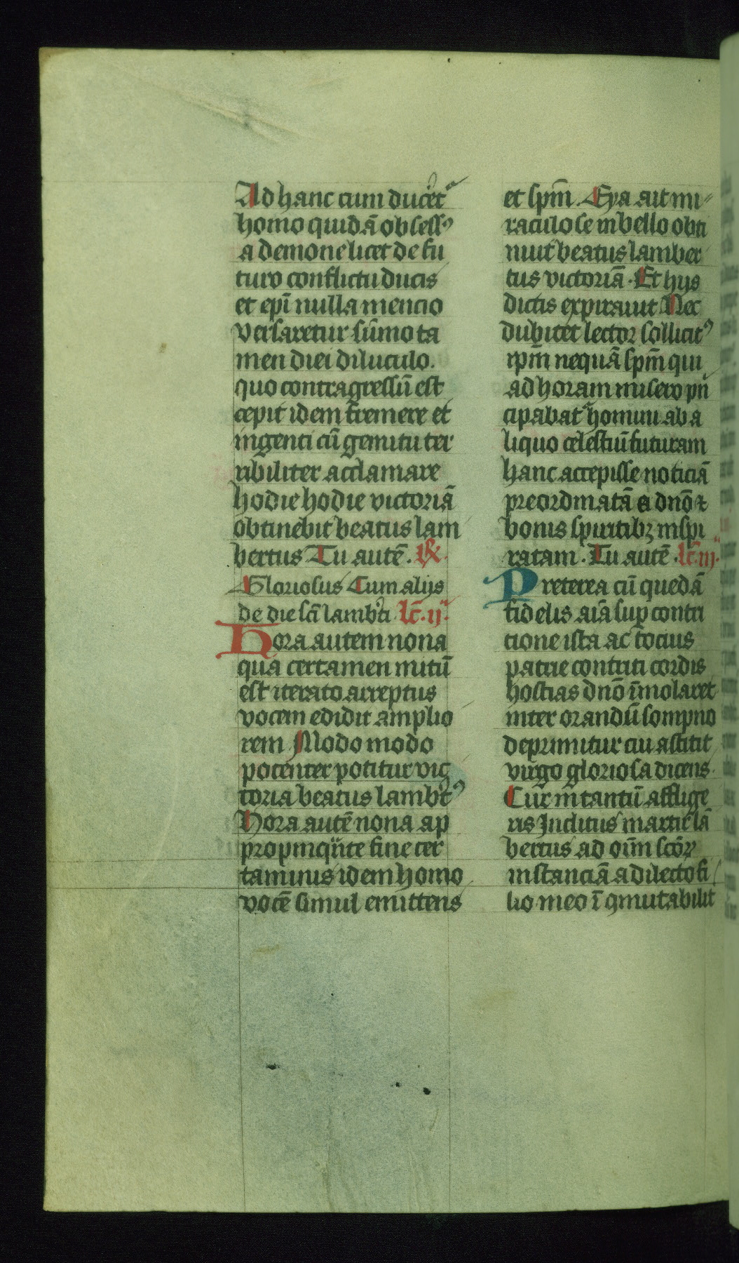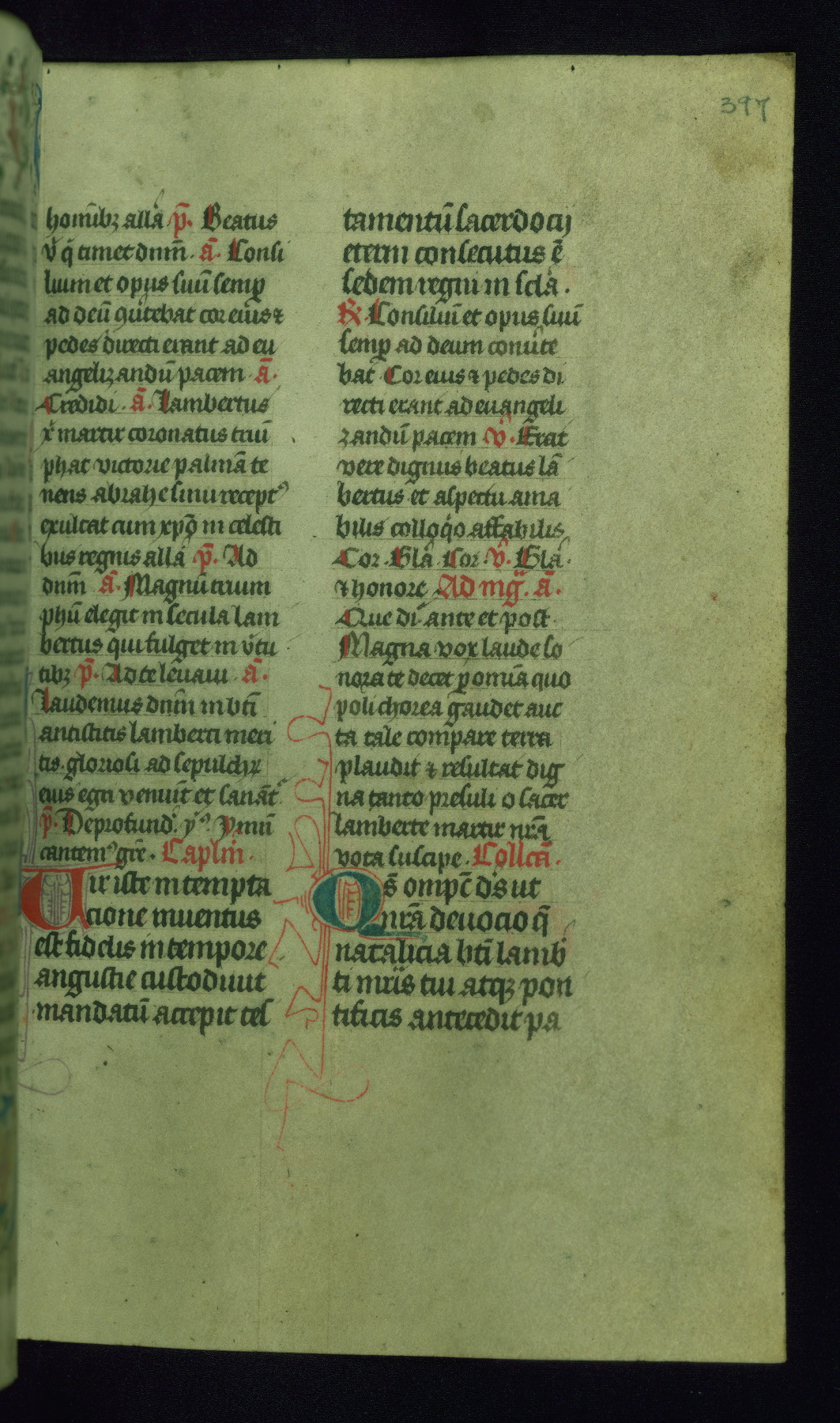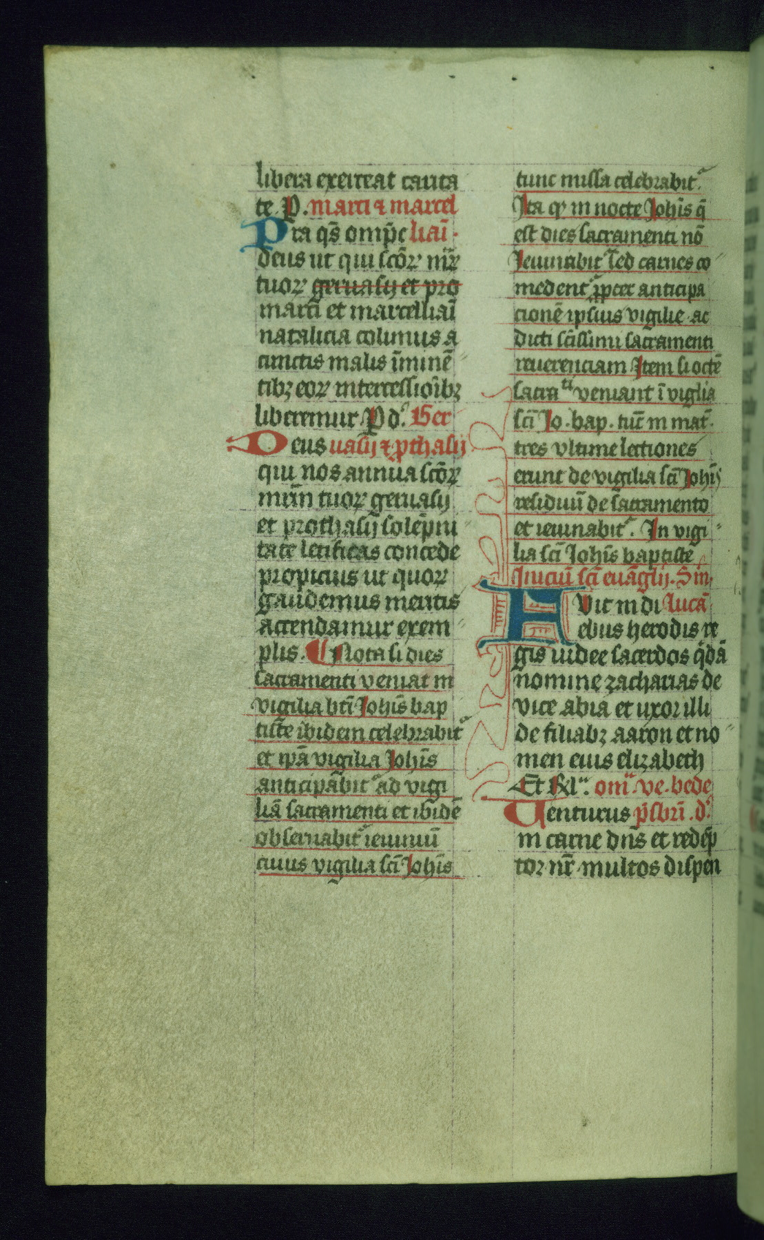 This small breviary, composed of more than 500 folios, is extraordinary for its length, considering it is the summer portion of a two-volume breviary for the use of Liège. The manuscript was completed for ecclesiastical use at the Cathedral of Notre-Dame and St.-Lambert in Liège ca. 1420. This attribution is suggested, for instance, by the petitions to the congregation of this cathedral (fols. 114v-117v), as well as the armorial shield of the family of Surlet de Chokier of Liège represented at the opening of the Psalms. The manuscript has modest, but interesting, decoration with historiated and decorated initials marking the liturgical texts, and occasional angels playing instruments in the margins. The most notable pictorial effect is found in the initials inhabited by transparent figures on rich blue ground. The technique is found, for instance, on fol. 156r with the gold monstrance held by translucent angels for the feast of the Corpus Christi.