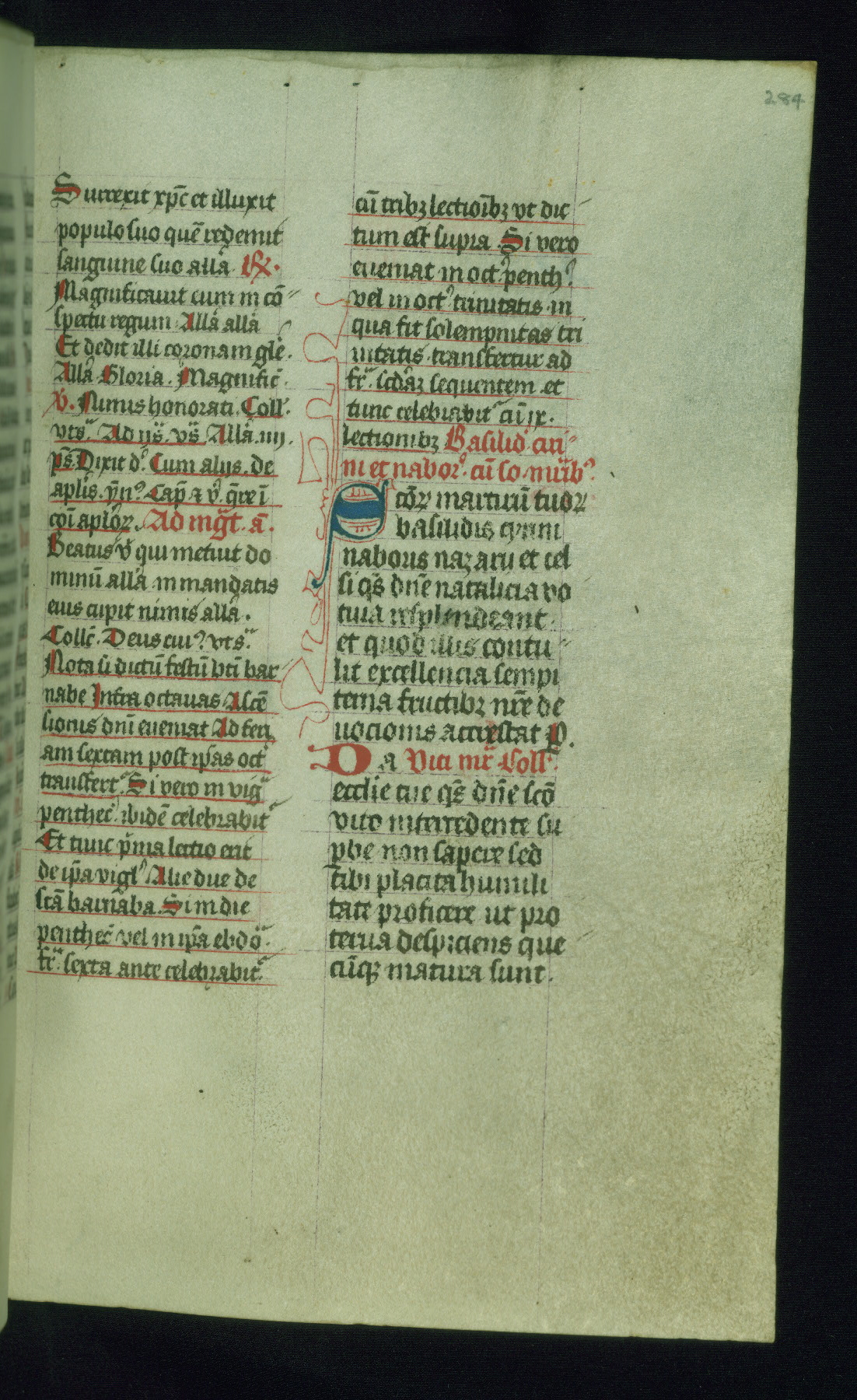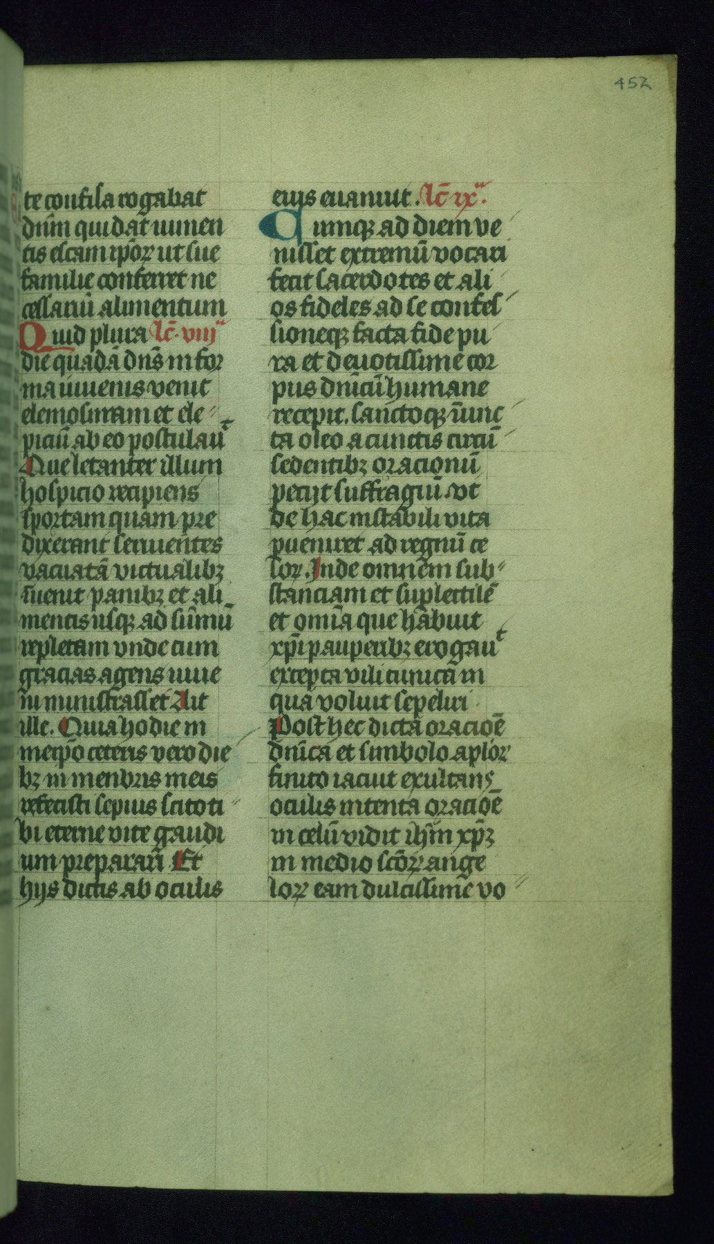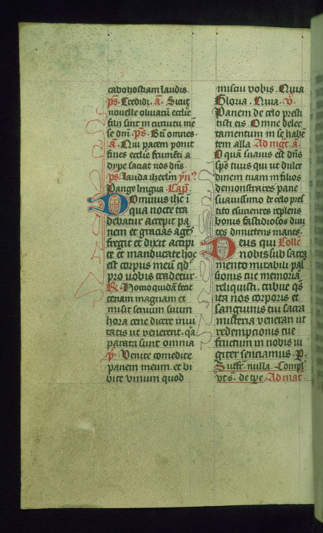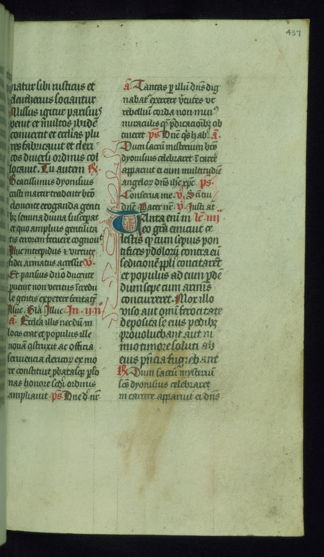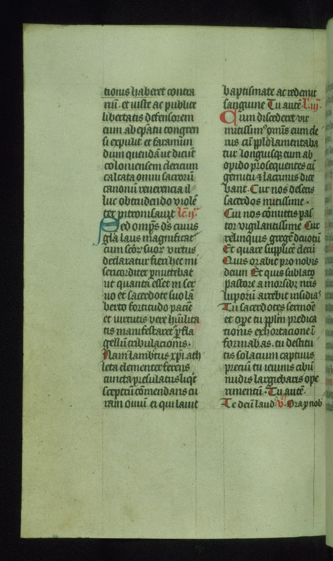 This small breviary, composed of more than 500 folios, is extraordinary for its length, considering it is the summer portion of a two-volume breviary for the use of Liège. The manuscript was completed for ecclesiastical use at the Cathedral of Notre-Dame and St.-Lambert in Liège ca. 1420. This attribution is suggested, for instance, by the petitions to the congregation of this cathedral (fols. 114v-117v), as well as the armorial shield of the family of Surlet de Chokier of Liège represented at the opening of the Psalms. The manuscript has modest, but interesting, decoration with historiated and decorated initials marking the liturgical texts, and occasional angels playing instruments in the margins. The most notable pictorial effect is found in the initials inhabited by transparent figures on rich blue ground. The technique is found, for instance, on fol. 156r with the gold monstrance held by translucent angels for the feast of the Corpus Christi.