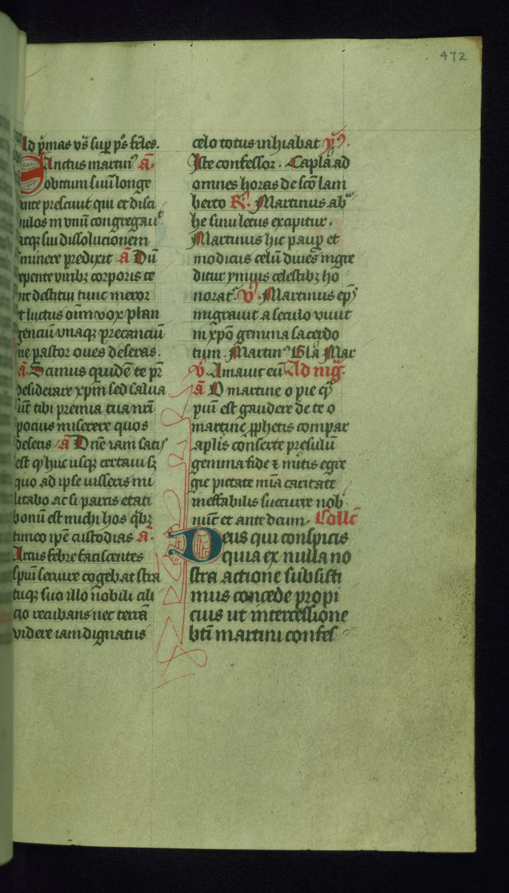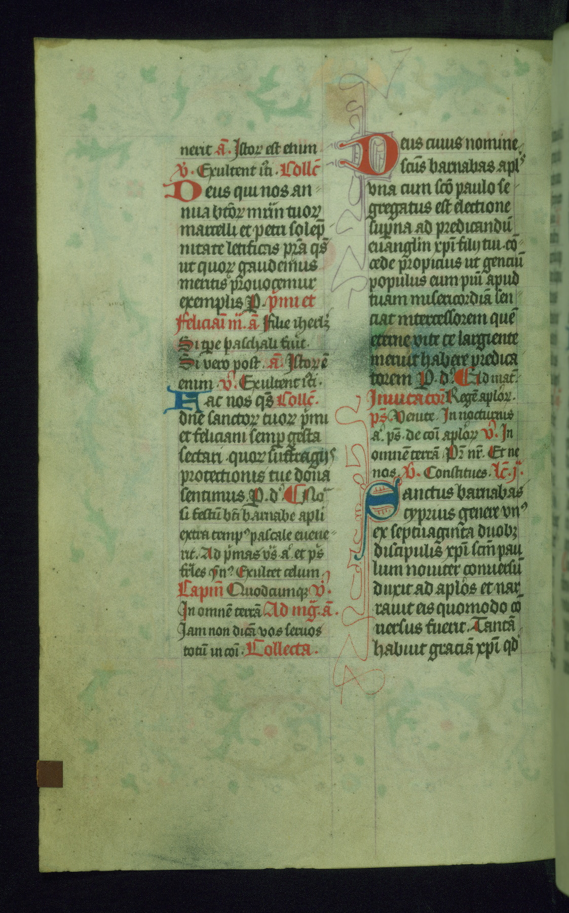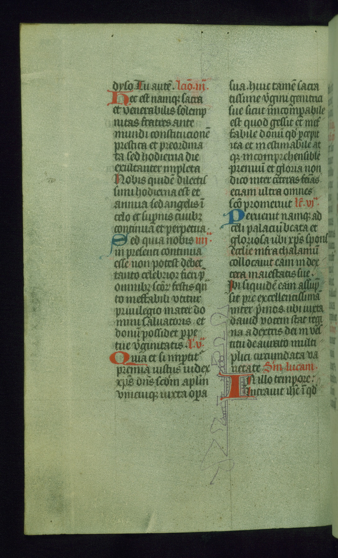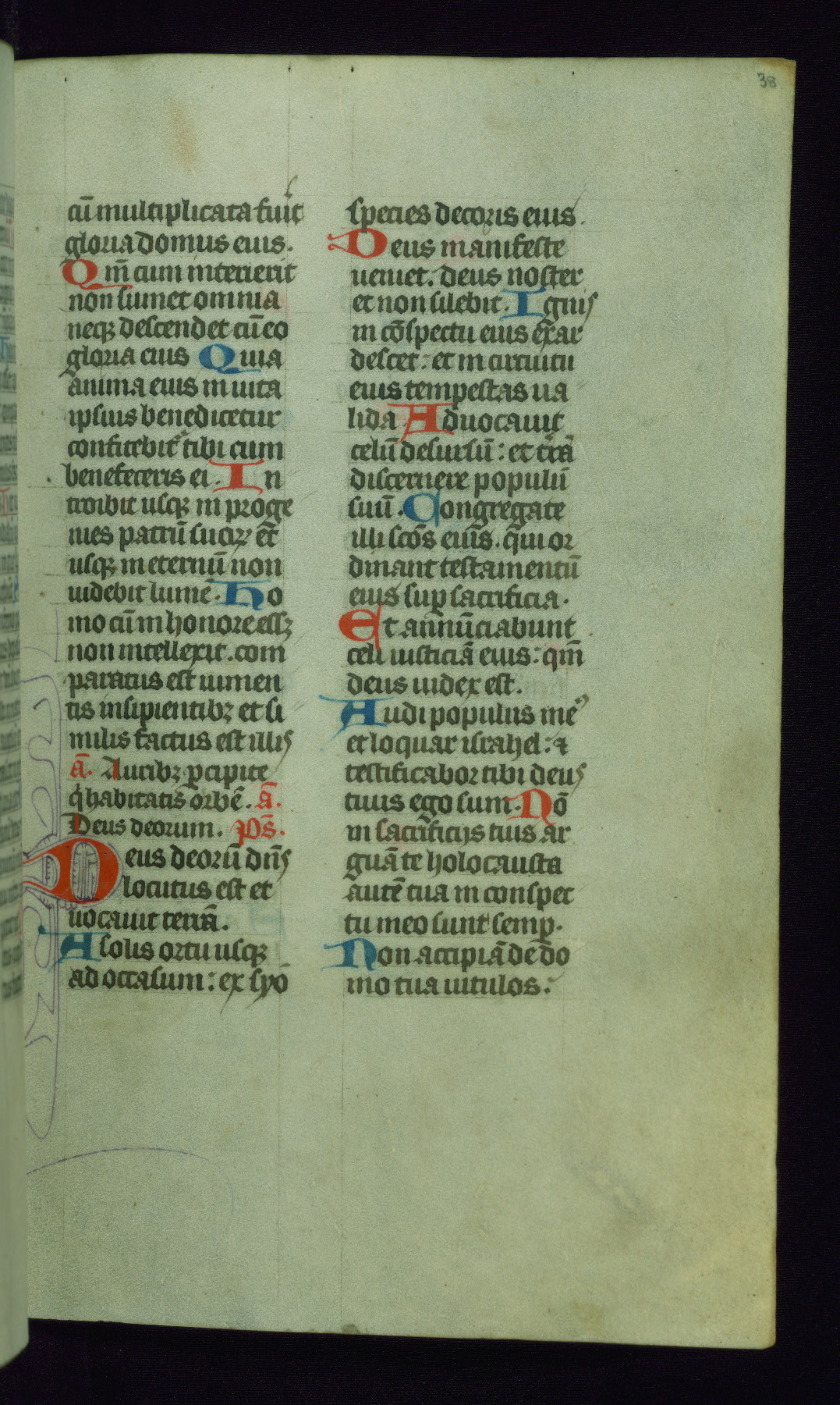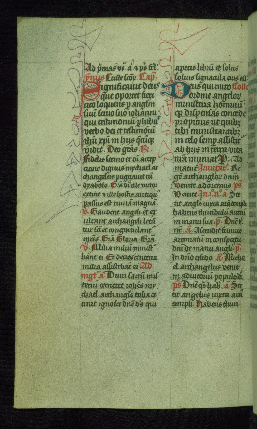This small breviary, composed of more than 500 folios, is extraordinary for its length, considering it is the summer portion of a two-volume breviary for the use of Liège. The manuscript was completed for ecclesiastical use at the Cathedral of Notre-Dame and St.-Lambert in Liège ca. 1420. This attribution is suggested, for instance, by the petitions to the congregation of this cathedral (fols. 114v-117v), as well as the armorial shield of the family of Surlet de Chokier of Liège represented at the opening of the Psalms. The manuscript has modest, but interesting, decoration with historiated and decorated initials marking the liturgical texts, and occasional angels playing instruments in the margins. The most notable pictorial effect is found in the initials inhabited by transparent figures on rich blue ground. The technique is found, for instance, on fol. 156r with the gold monstrance held by translucent angels for the feast of the Corpus Christi.