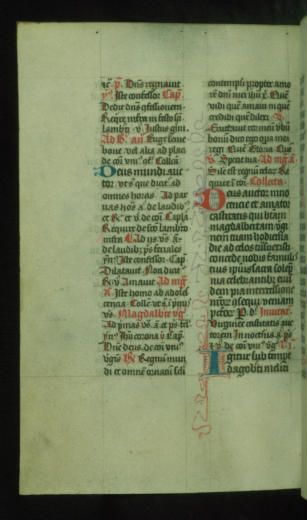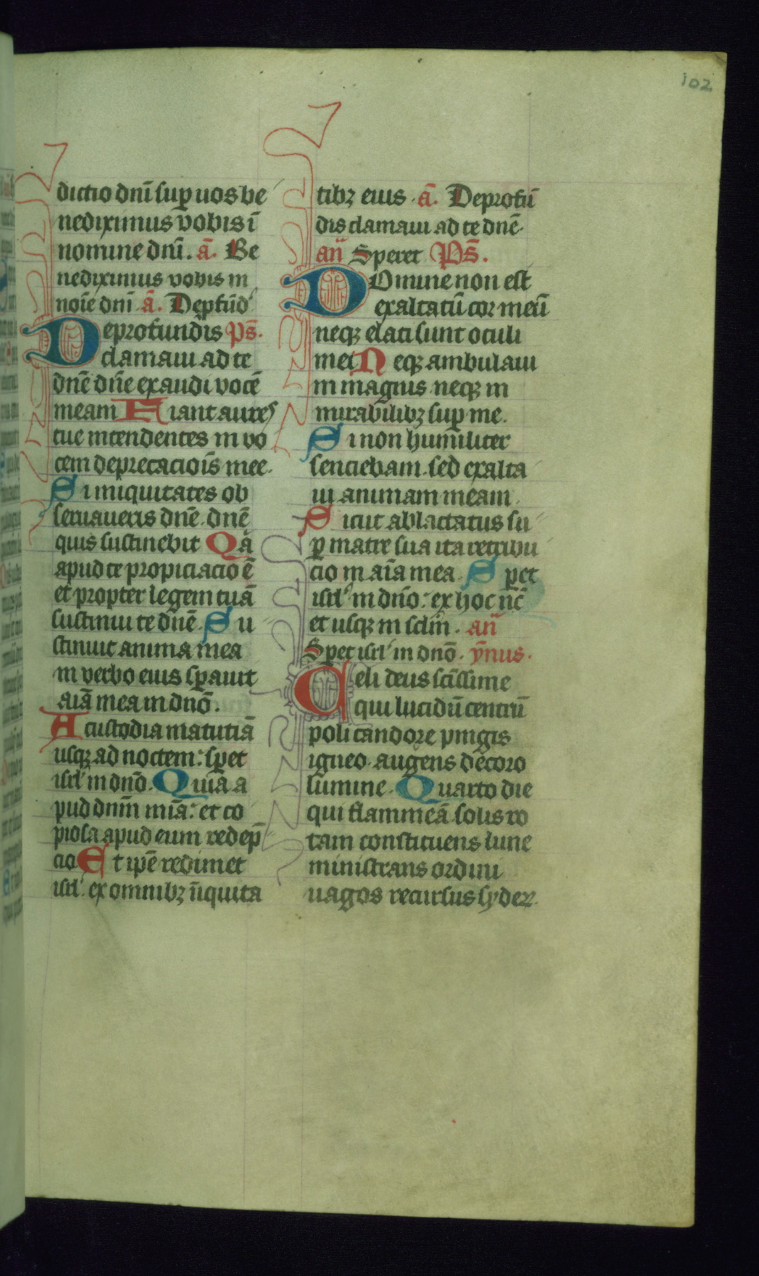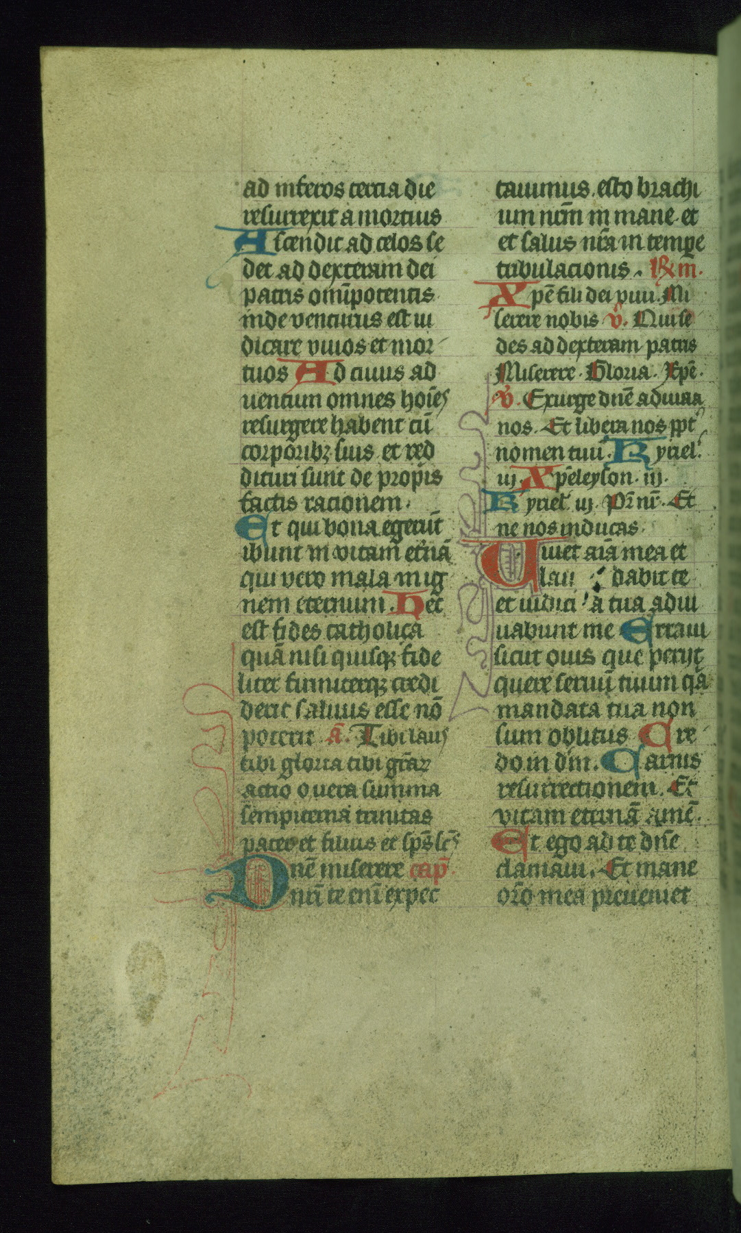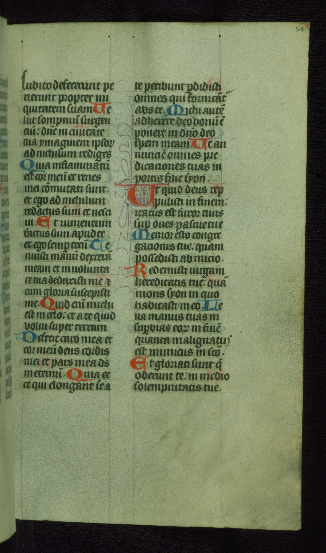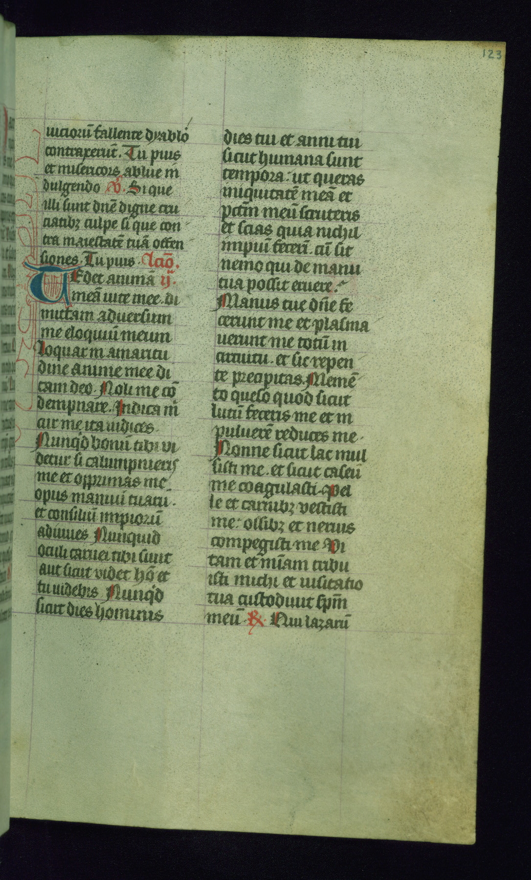 This small breviary, composed of more than 500 folios, is extraordinary for its length, considering it is the summer portion of a two-volume breviary for the use of Liège. The manuscript was completed for ecclesiastical use at the Cathedral of Notre-Dame and St.-Lambert in Liège ca. 1420. This attribution is suggested, for instance, by the petitions to the congregation of this cathedral (fols. 114v-117v), as well as the armorial shield of the family of Surlet de Chokier of Liège represented at the opening of the Psalms. The manuscript has modest, but interesting, decoration with historiated and decorated initials marking the liturgical texts, and occasional angels playing instruments in the margins. The most notable pictorial effect is found in the initials inhabited by transparent figures on rich blue ground. The technique is found, for instance, on fol. 156r with the gold monstrance held by translucent angels for the feast of the Corpus Christi.