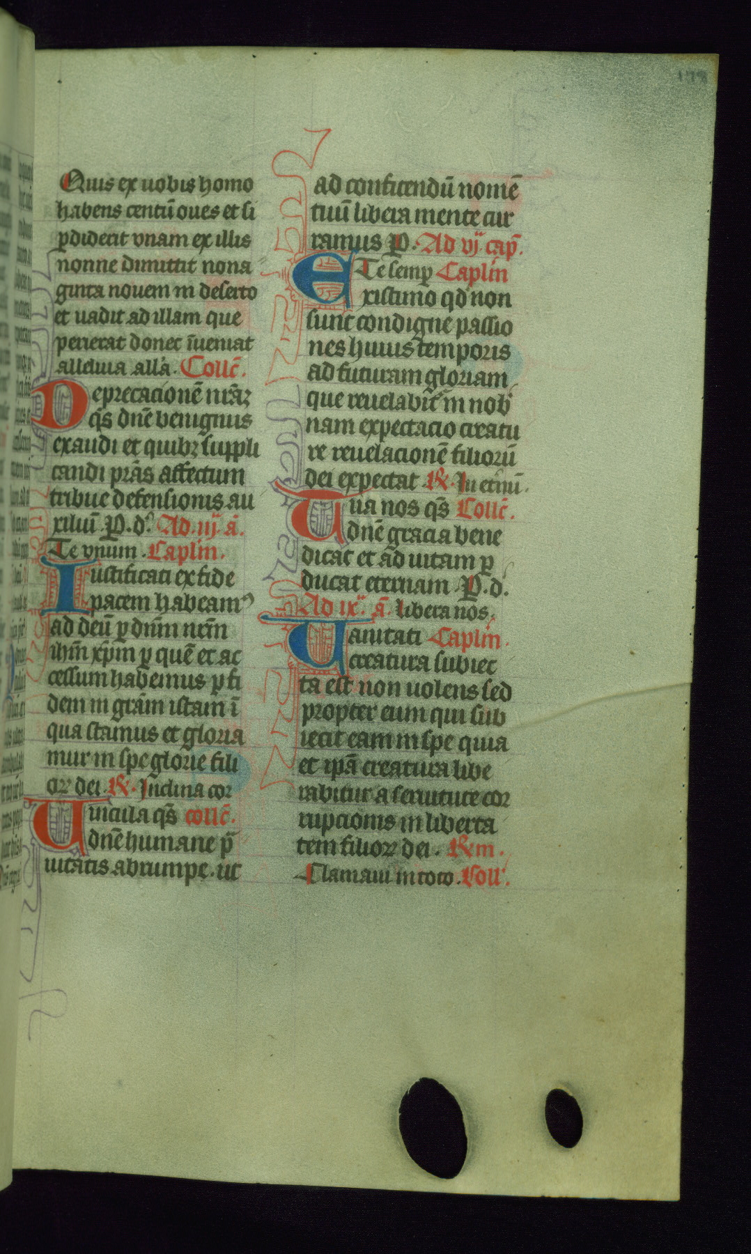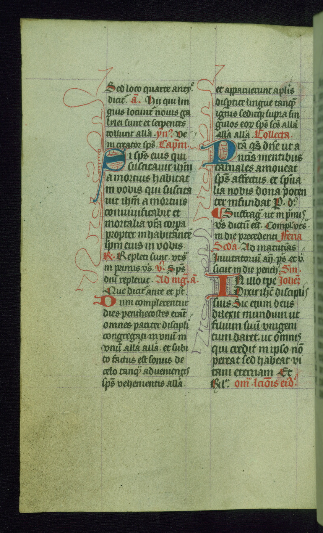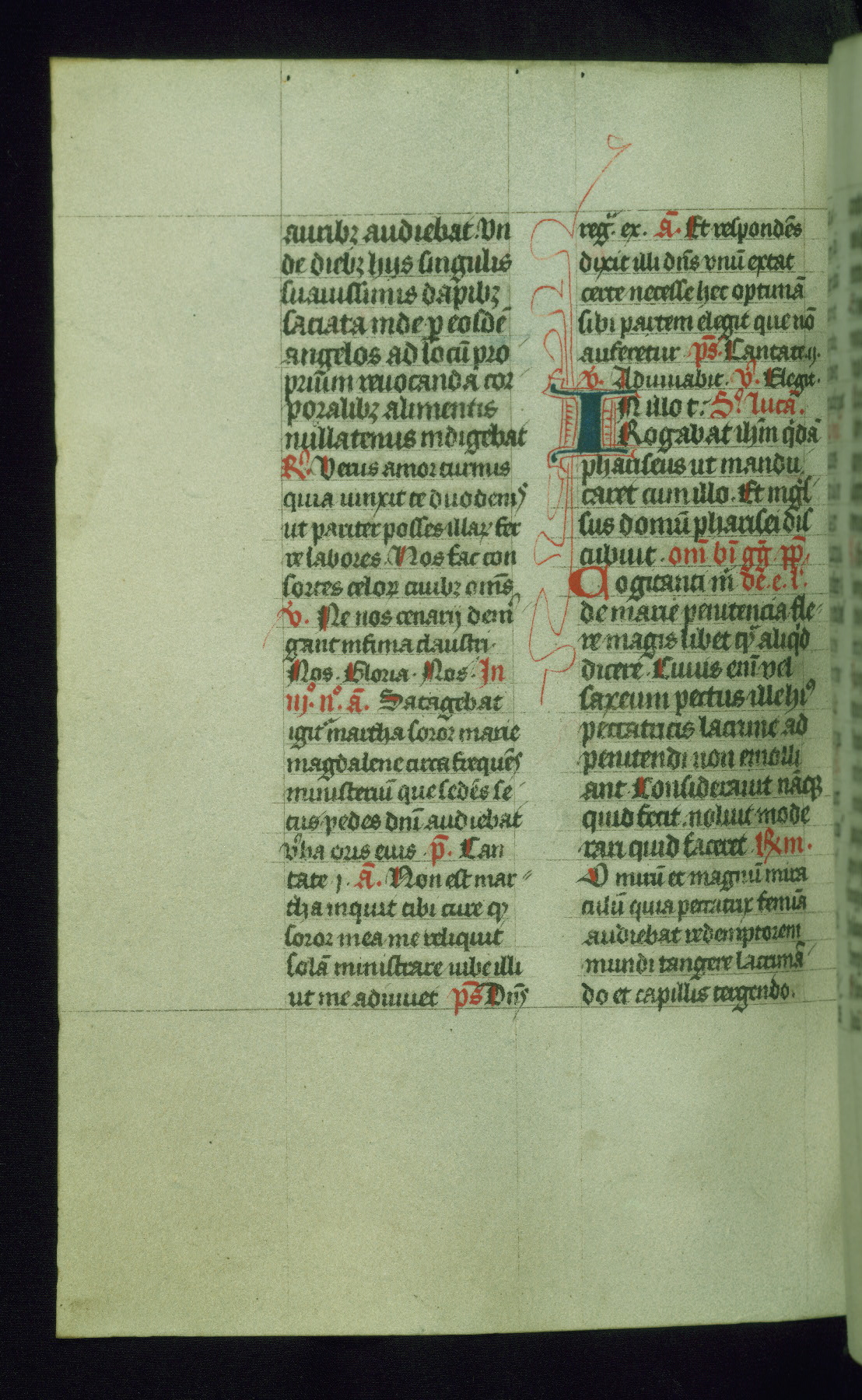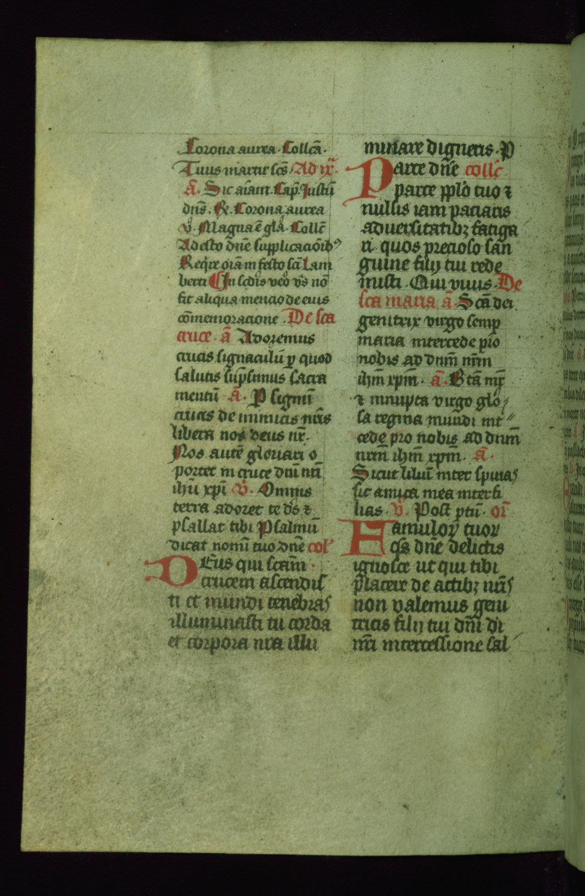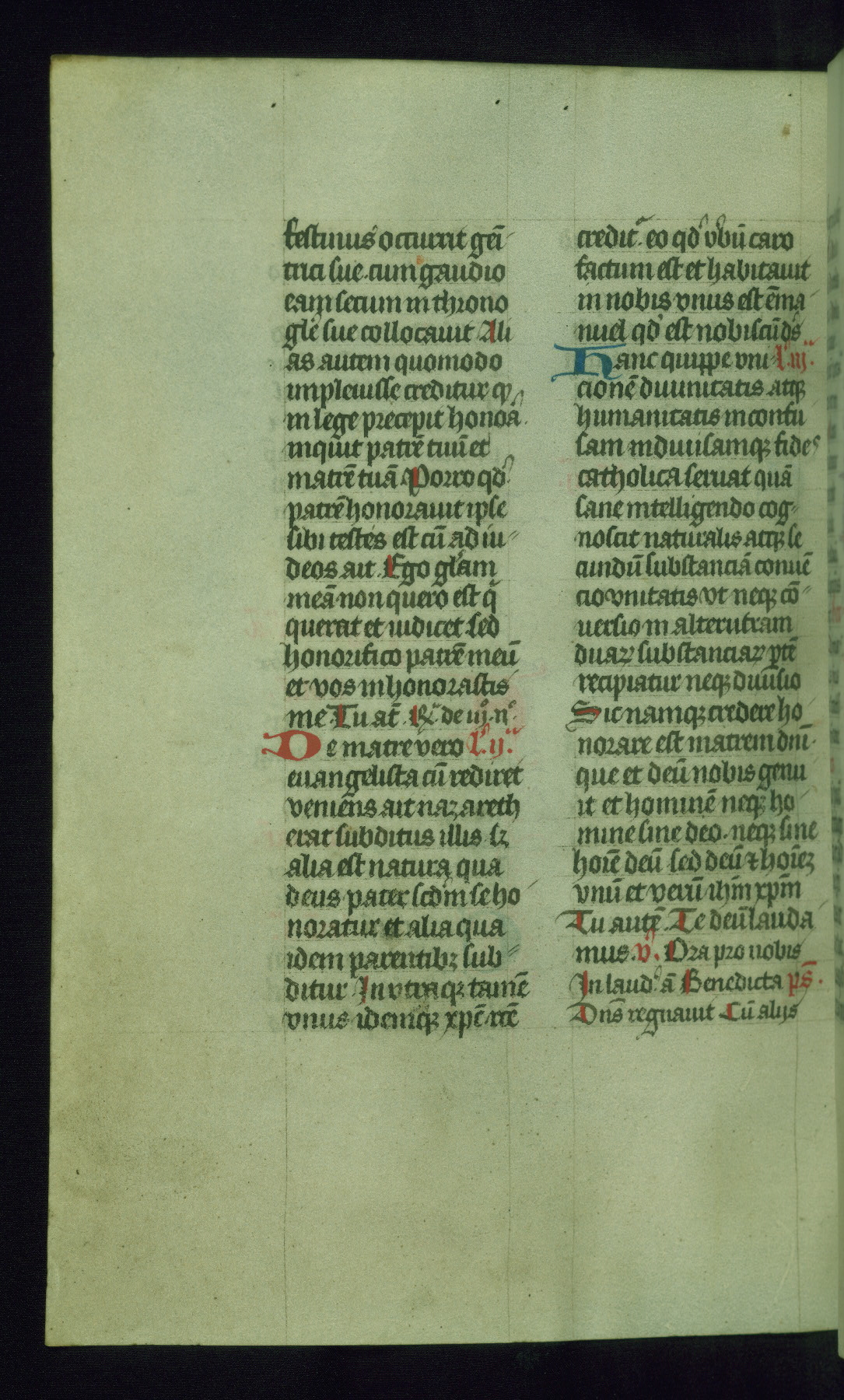 This small breviary, composed of more than 500 folios, is extraordinary for its length, considering it is the summer portion of a two-volume breviary for the use of Liège. The manuscript was completed for ecclesiastical use at the Cathedral of Notre-Dame and St.-Lambert in Liège ca. 1420. This attribution is suggested, for instance, by the petitions to the congregation of this cathedral (fols. 114v-117v), as well as the armorial shield of the family of Surlet de Chokier of Liège represented at the opening of the Psalms. The manuscript has modest, but interesting, decoration with historiated and decorated initials marking the liturgical texts, and occasional angels playing instruments in the margins. The most notable pictorial effect is found in the initials inhabited by transparent figures on rich blue ground. The technique is found, for instance, on fol. 156r with the gold monstrance held by translucent angels for the feast of the Corpus Christi.