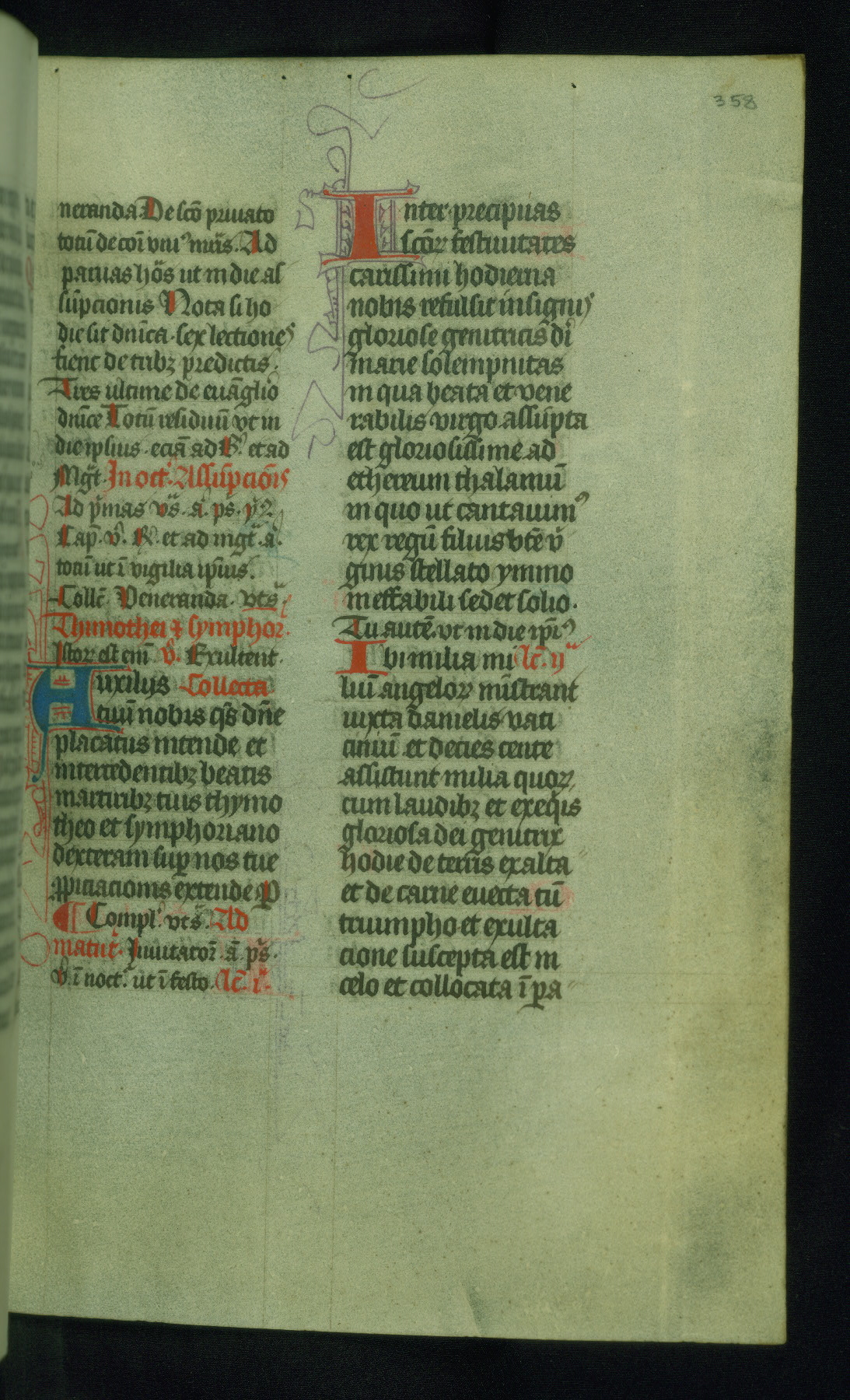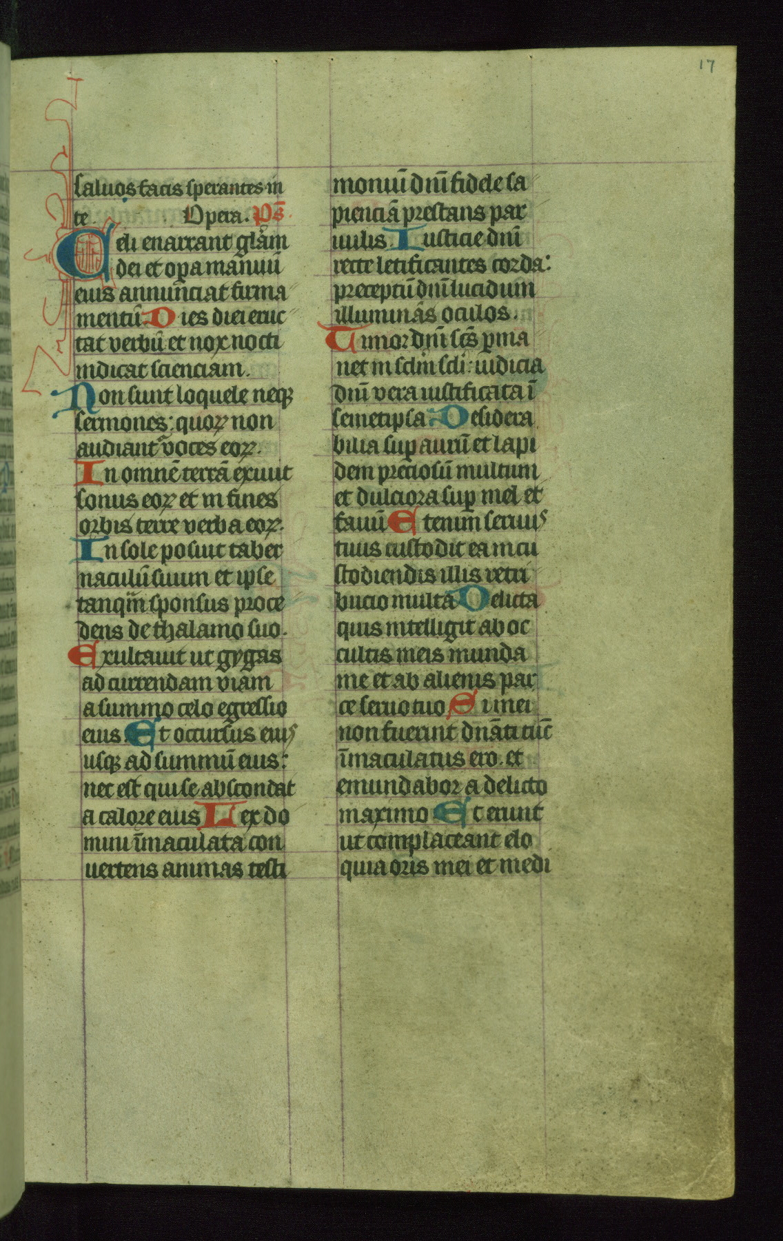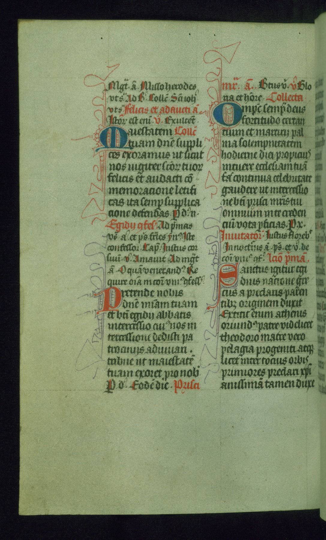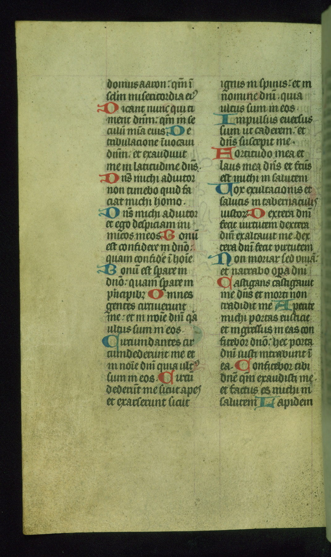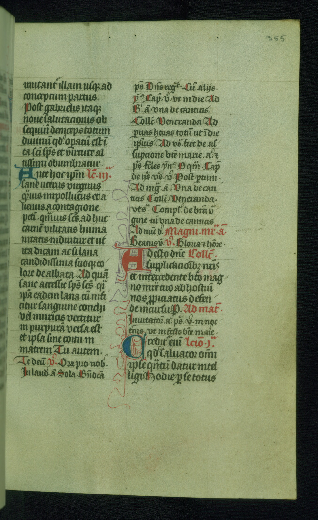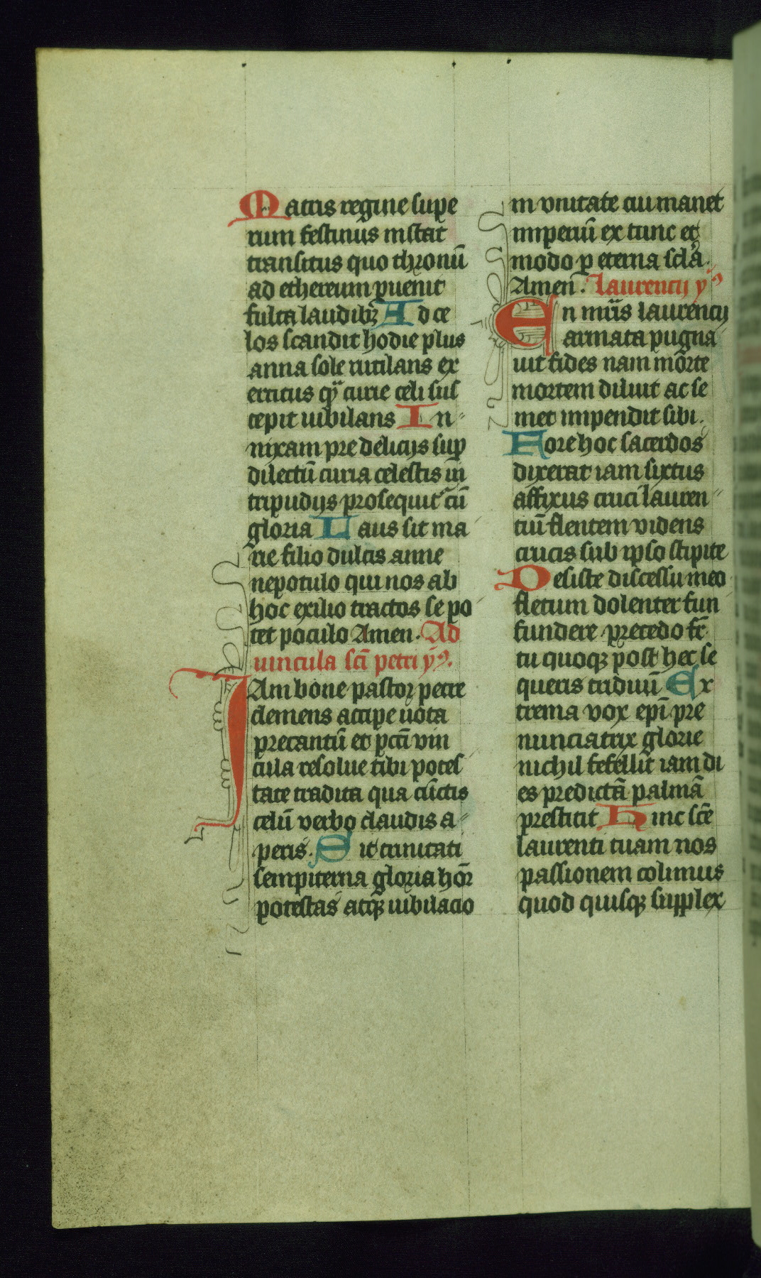 This small breviary, composed of more than 500 folios, is extraordinary for its length, considering it is the summer portion of a two-volume breviary for the use of Liège. The manuscript was completed for ecclesiastical use at the Cathedral of Notre-Dame and St.-Lambert in Liège ca. 1420. This attribution is suggested, for instance, by the petitions to the congregation of this cathedral (fols. 114v-117v), as well as the armorial shield of the family of Surlet de Chokier of Liège represented at the opening of the Psalms. The manuscript has modest, but interesting, decoration with historiated and decorated initials marking the liturgical texts, and occasional angels playing instruments in the margins. The most notable pictorial effect is found in the initials inhabited by transparent figures on rich blue ground. The technique is found, for instance, on fol. 156r with the gold monstrance held by translucent angels for the feast of the Corpus Christi.