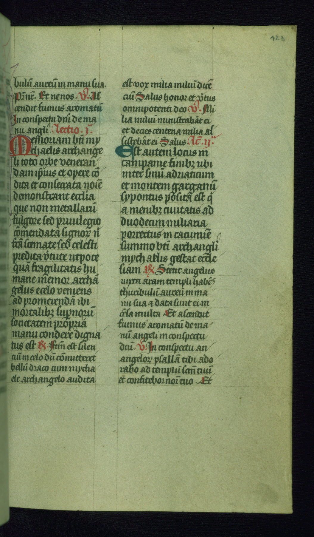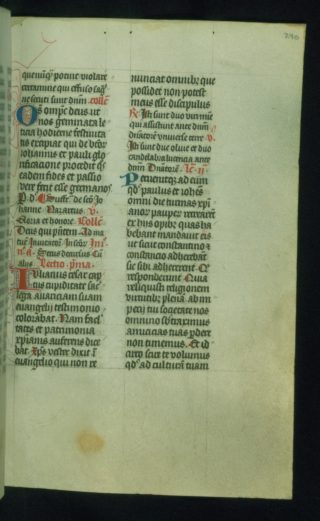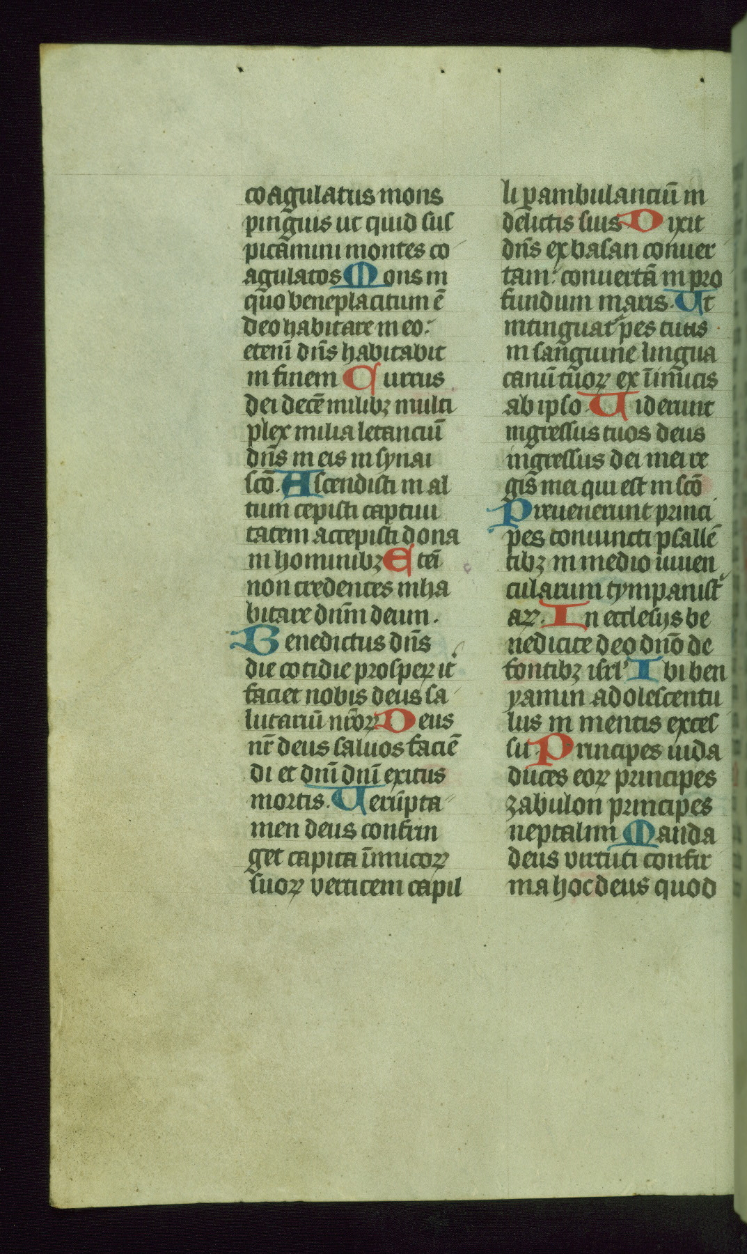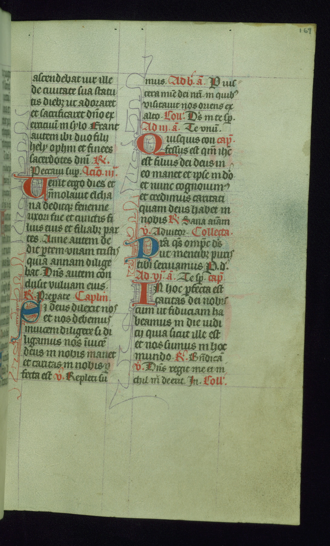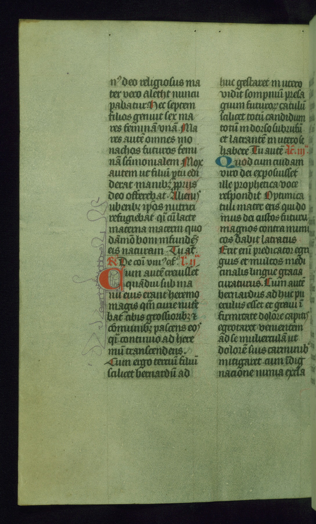 This small breviary, composed of more than 500 folios, is extraordinary for its length, considering it is the summer portion of a two-volume breviary for the use of Liège. The manuscript was completed for ecclesiastical use at the Cathedral of Notre-Dame and St.-Lambert in Liège ca. 1420. This attribution is suggested, for instance, by the petitions to the congregation of this cathedral (fols. 114v-117v), as well as the armorial shield of the family of Surlet de Chokier of Liège represented at the opening of the Psalms. The manuscript has modest, but interesting, decoration with historiated and decorated initials marking the liturgical texts, and occasional angels playing instruments in the margins. The most notable pictorial effect is found in the initials inhabited by transparent figures on rich blue ground. The technique is found, for instance, on fol. 156r with the gold monstrance held by translucent angels for the feast of the Corpus Christi.