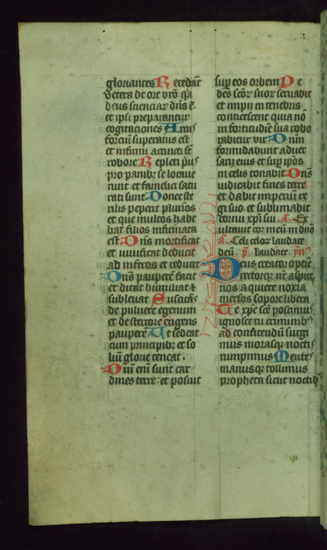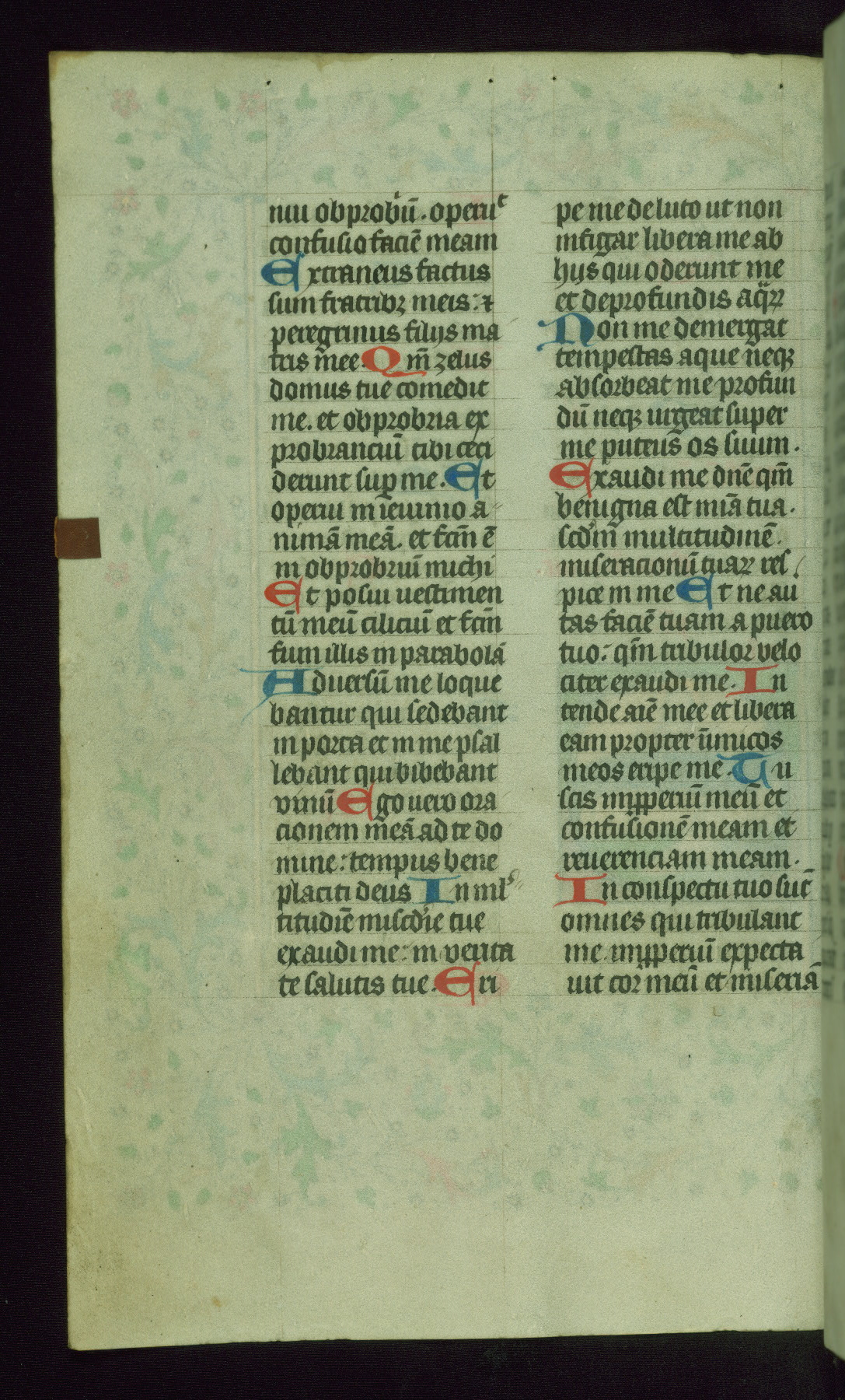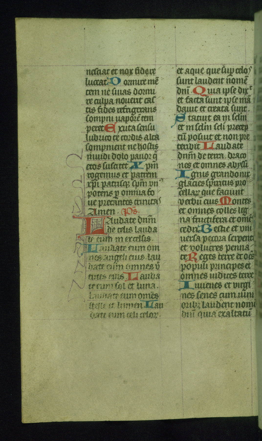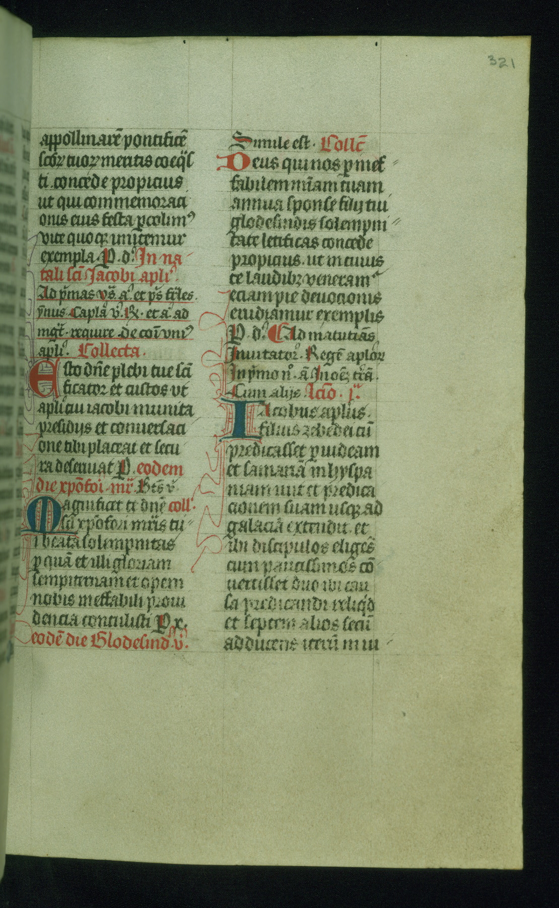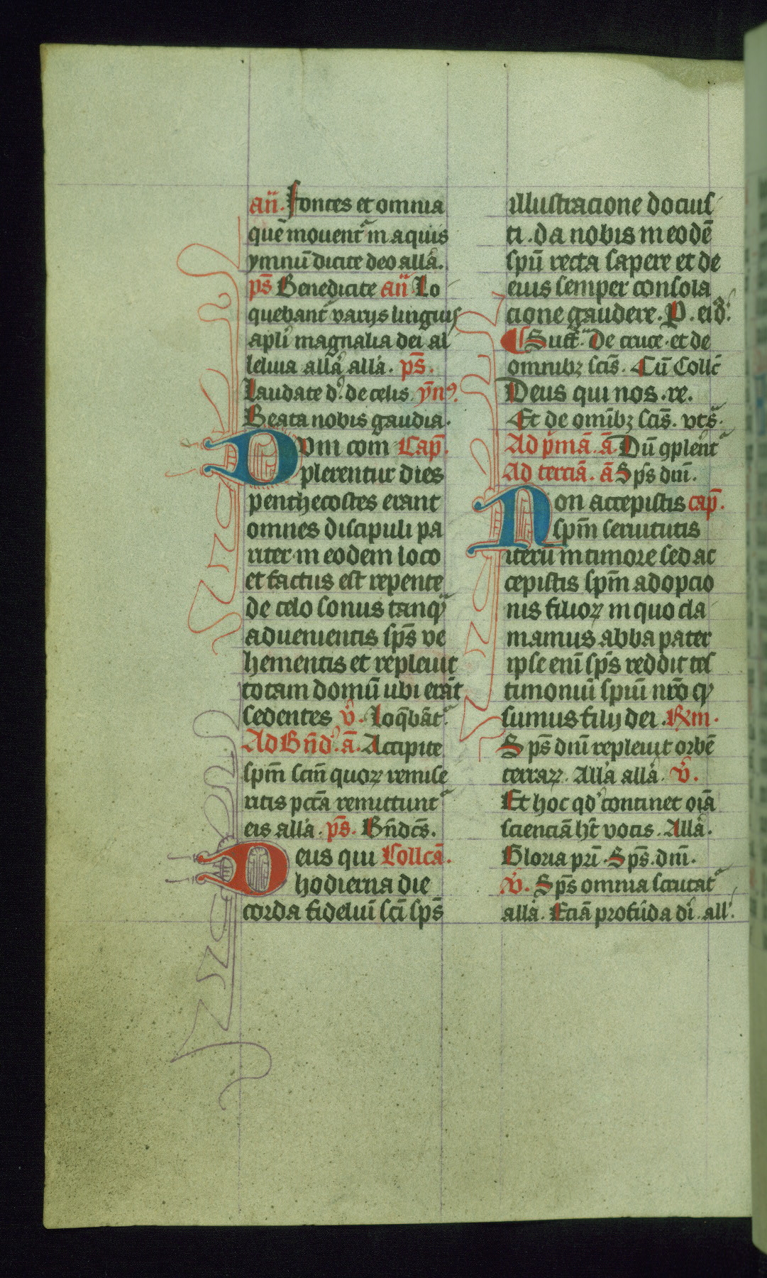 This small breviary, composed of more than 500 folios, is extraordinary for its length, considering it is the summer portion of a two-volume breviary for the use of Liège. The manuscript was completed for ecclesiastical use at the Cathedral of Notre-Dame and St.-Lambert in Liège ca. 1420. This attribution is suggested, for instance, by the petitions to the congregation of this cathedral (fols. 114v-117v), as well as the armorial shield of the family of Surlet de Chokier of Liège represented at the opening of the Psalms. The manuscript has modest, but interesting, decoration with historiated and decorated initials marking the liturgical texts, and occasional angels playing instruments in the margins. The most notable pictorial effect is found in the initials inhabited by transparent figures on rich blue ground. The technique is found, for instance, on fol. 156r with the gold monstrance held by translucent angels for the feast of the Corpus Christi.