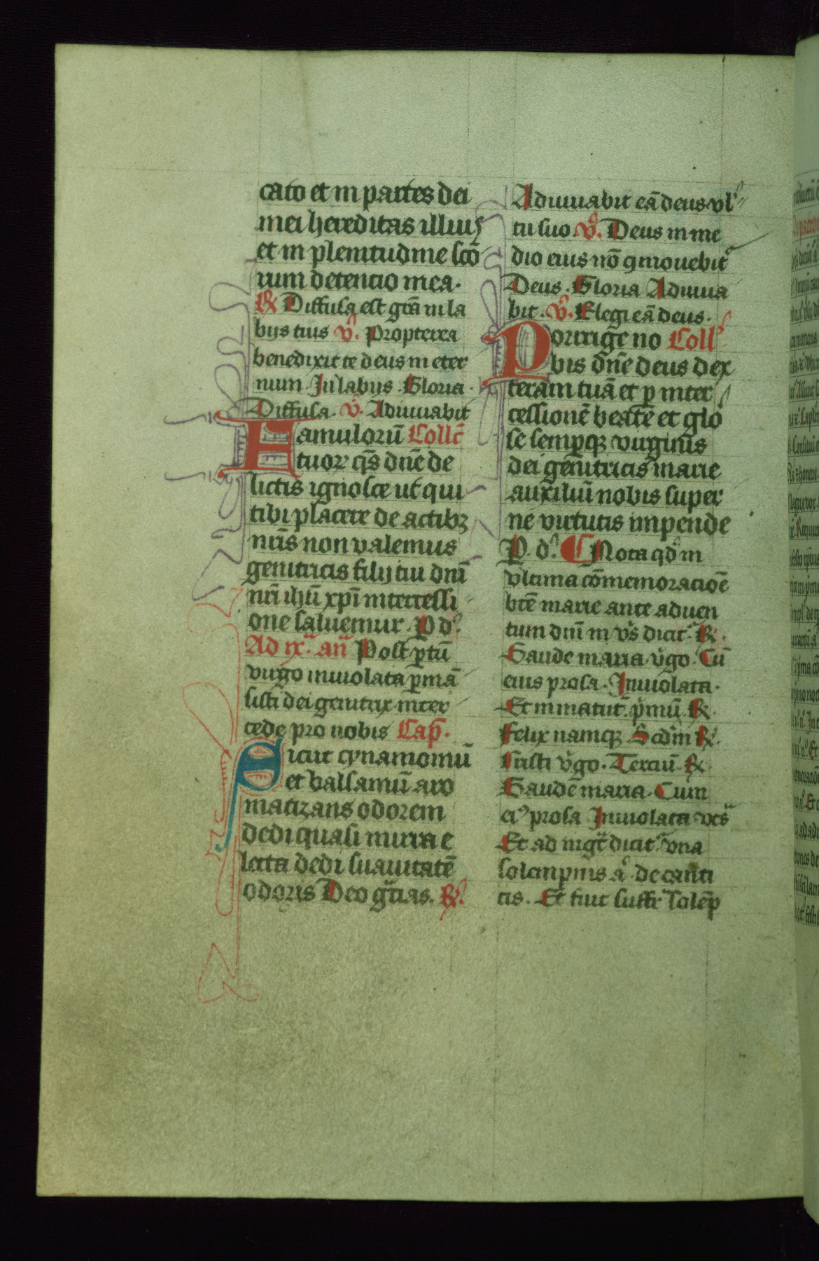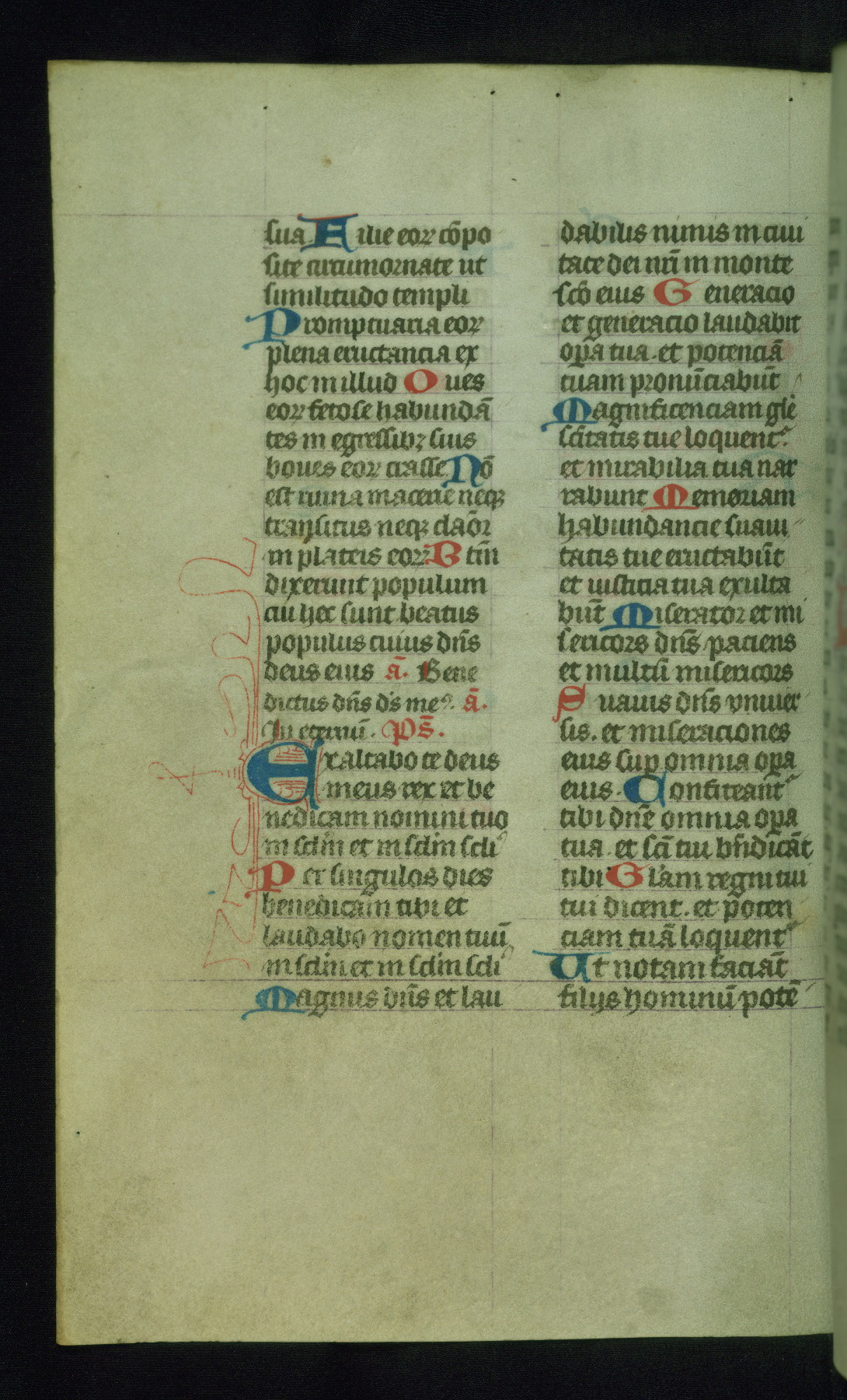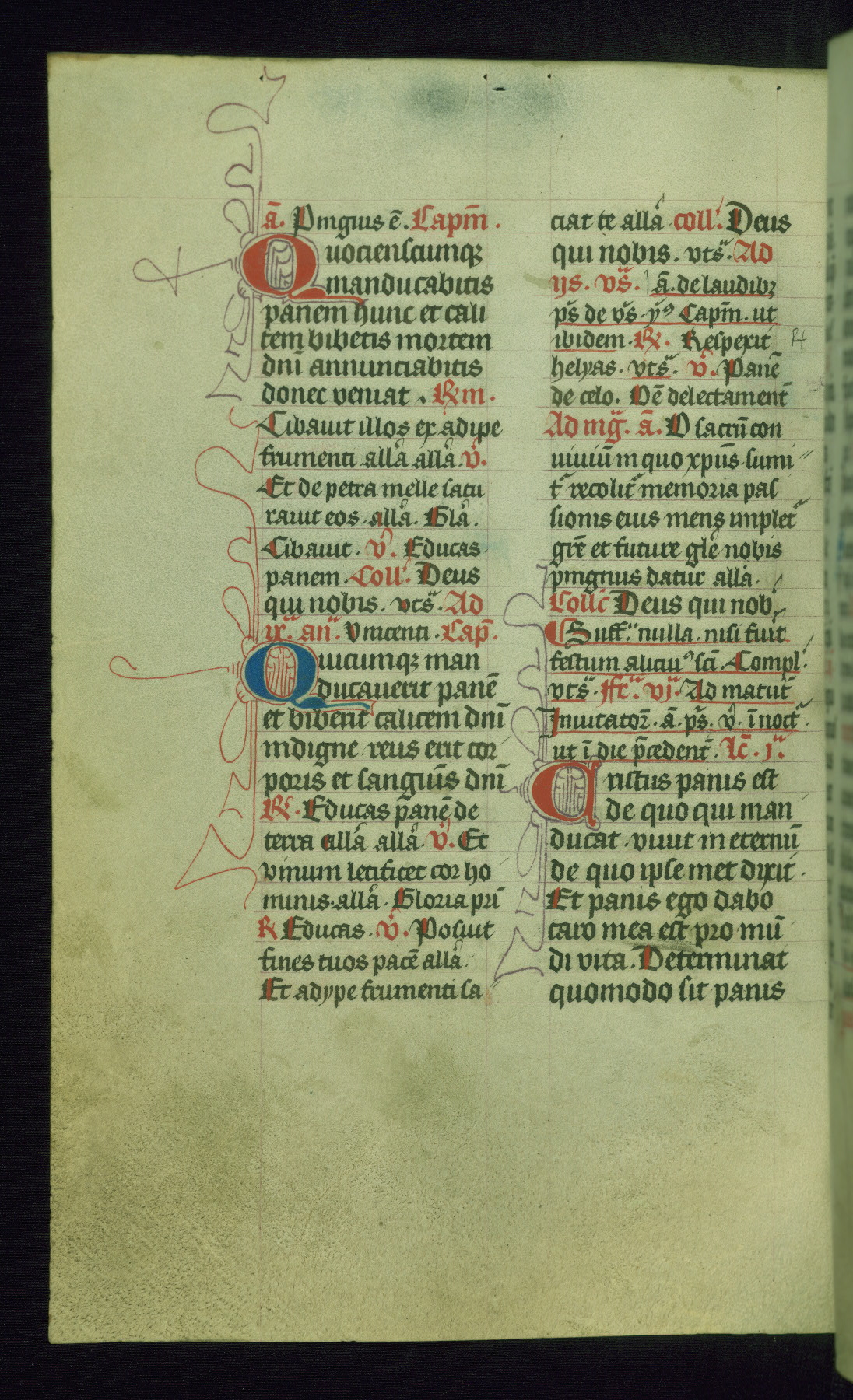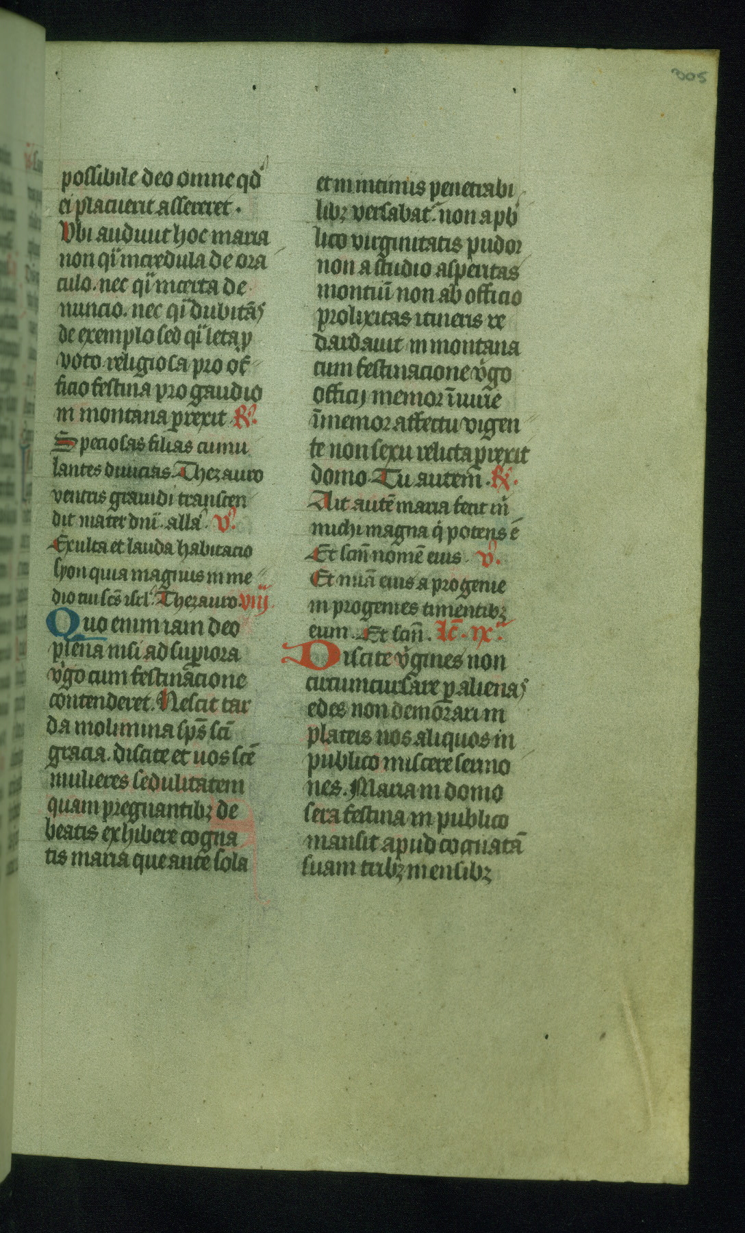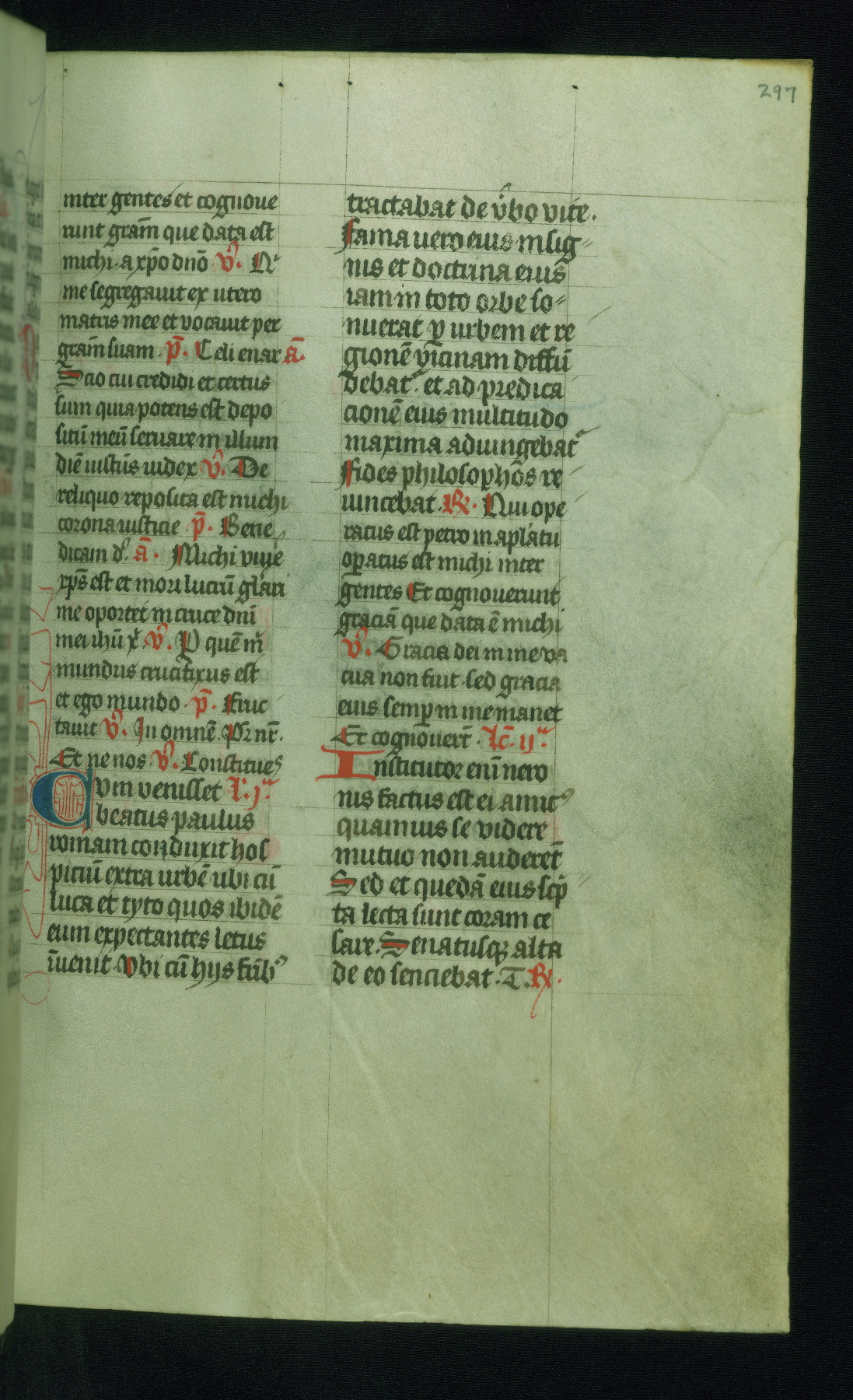 This small breviary, composed of more than 500 folios, is extraordinary for its length, considering it is the summer portion of a two-volume breviary for the use of Liège. The manuscript was completed for ecclesiastical use at the Cathedral of Notre-Dame and St.-Lambert in Liège ca. 1420. This attribution is suggested, for instance, by the petitions to the congregation of this cathedral (fols. 114v-117v), as well as the armorial shield of the family of Surlet de Chokier of Liège represented at the opening of the Psalms. The manuscript has modest, but interesting, decoration with historiated and decorated initials marking the liturgical texts, and occasional angels playing instruments in the margins. The most notable pictorial effect is found in the initials inhabited by transparent figures on rich blue ground. The technique is found, for instance, on fol. 156r with the gold monstrance held by translucent angels for the feast of the Corpus Christi.