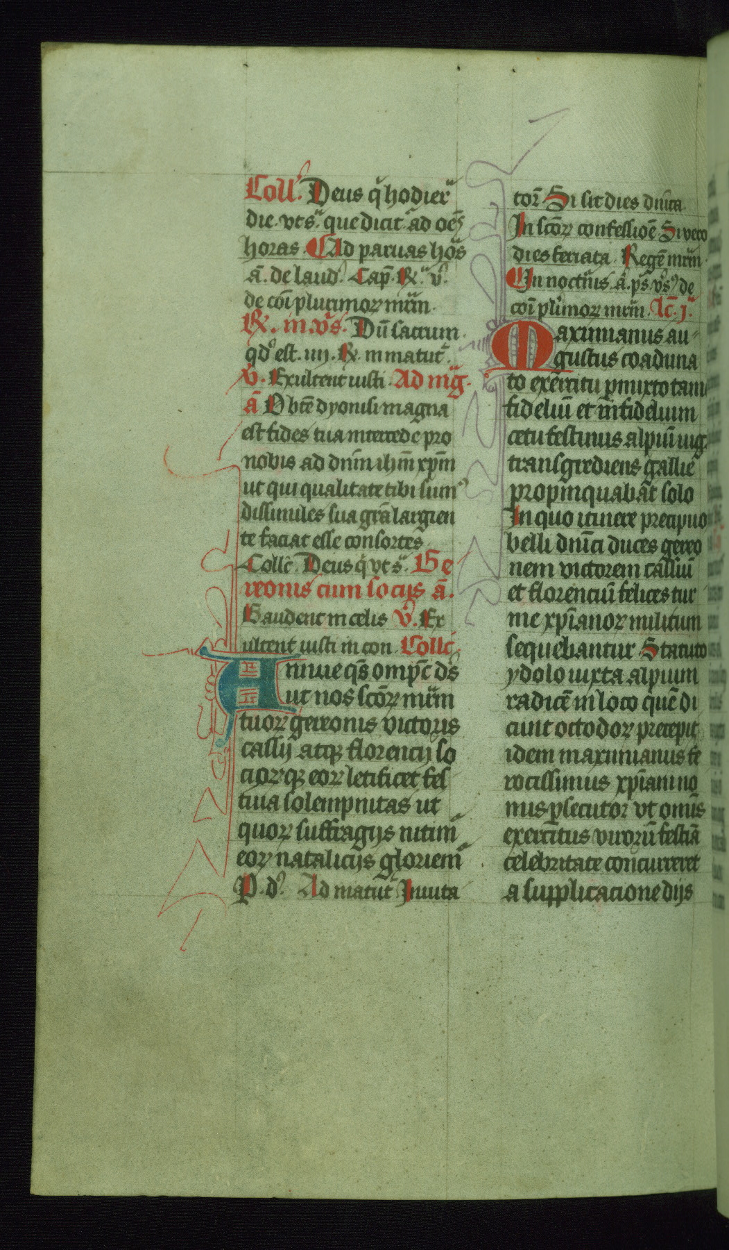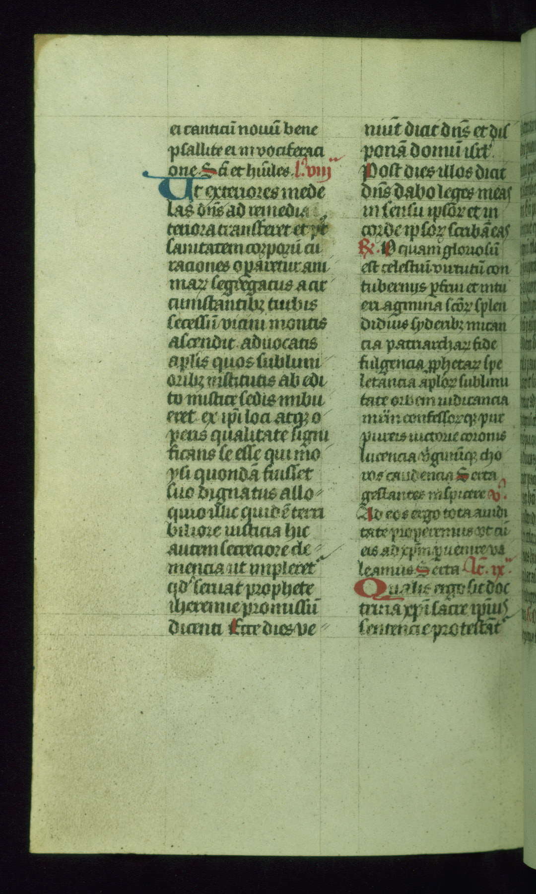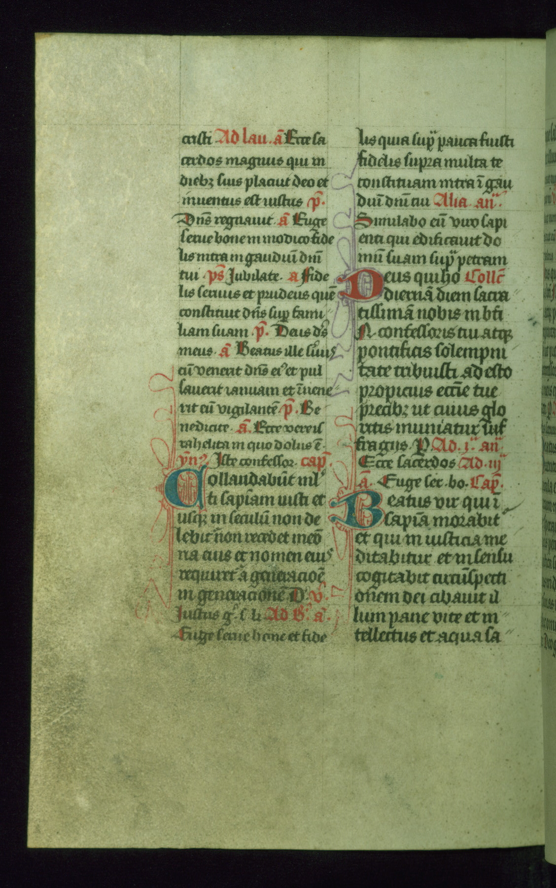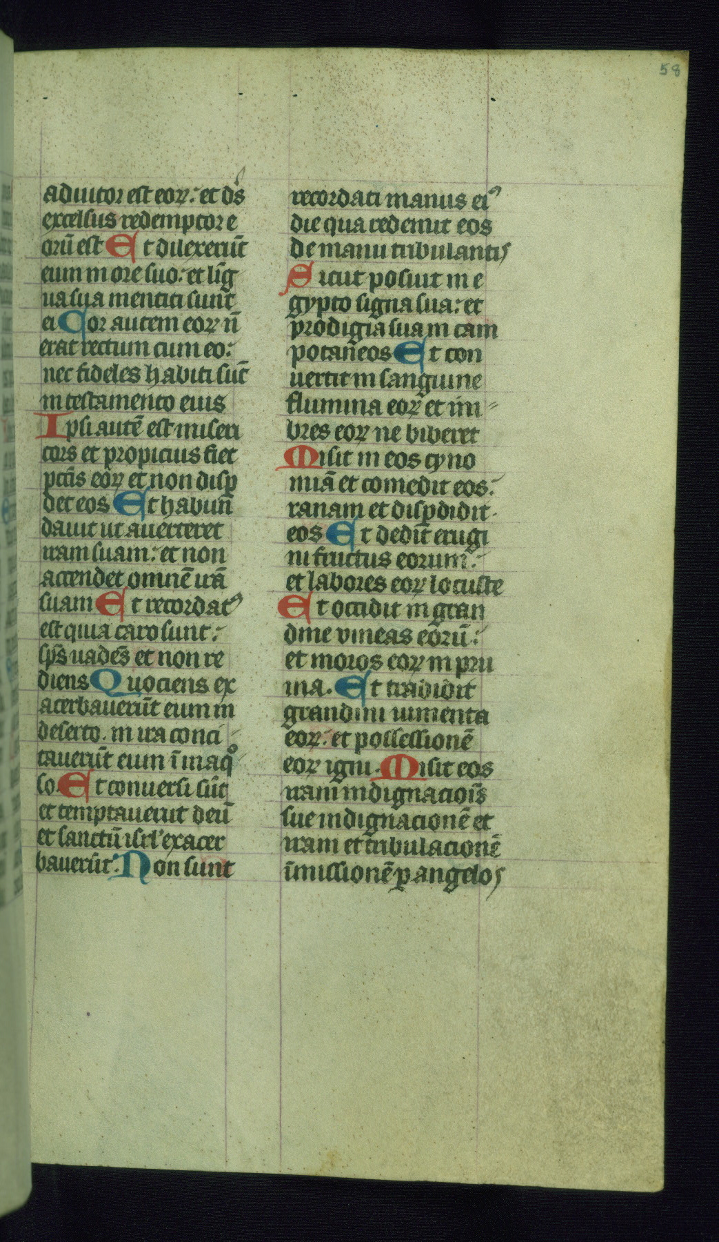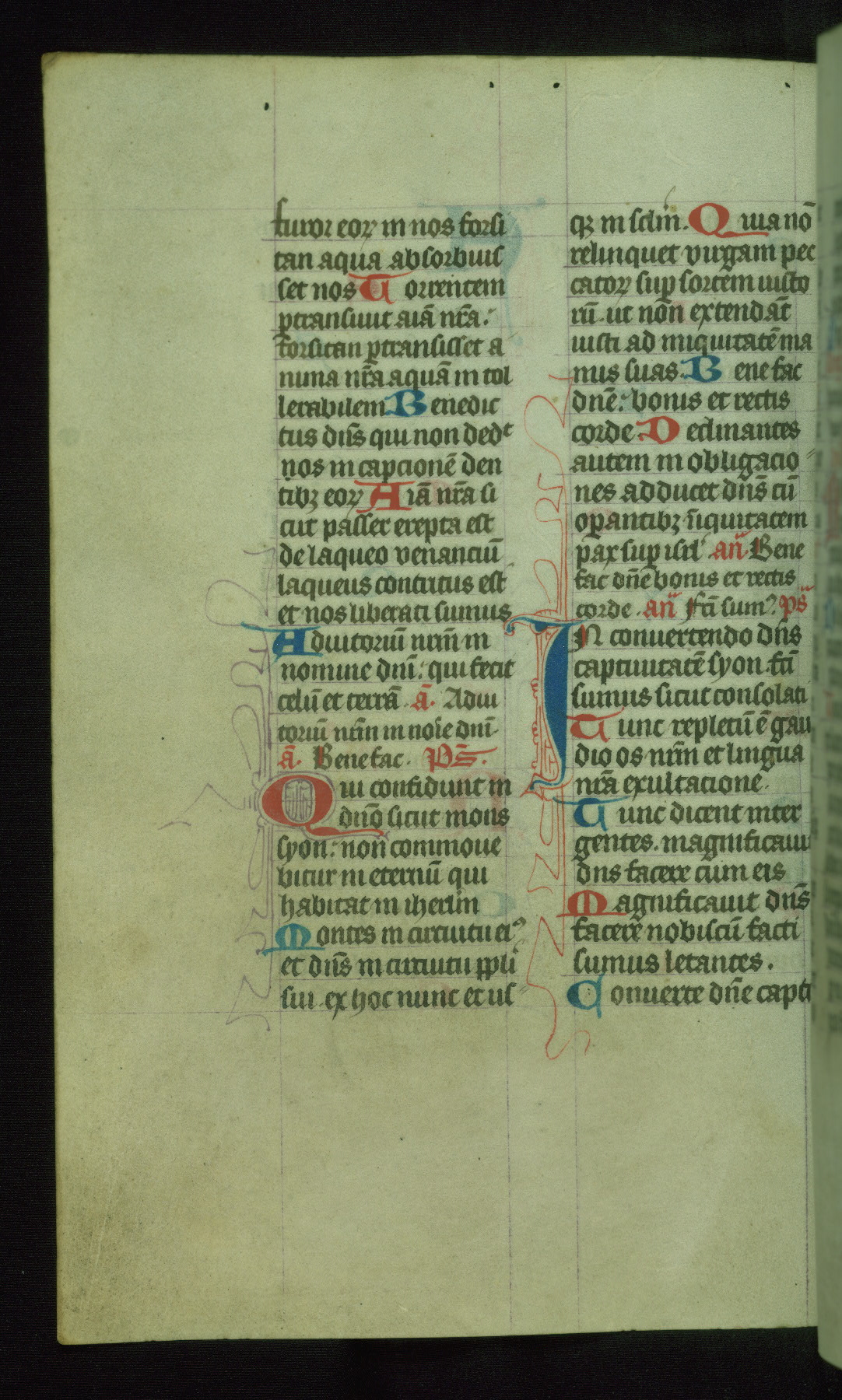 This small breviary, composed of more than 500 folios, is extraordinary for its length, considering it is the summer portion of a two-volume breviary for the use of Liège. The manuscript was completed for ecclesiastical use at the Cathedral of Notre-Dame and St.-Lambert in Liège ca. 1420. This attribution is suggested, for instance, by the petitions to the congregation of this cathedral (fols. 114v-117v), as well as the armorial shield of the family of Surlet de Chokier of Liège represented at the opening of the Psalms. The manuscript has modest, but interesting, decoration with historiated and decorated initials marking the liturgical texts, and occasional angels playing instruments in the margins. The most notable pictorial effect is found in the initials inhabited by transparent figures on rich blue ground. The technique is found, for instance, on fol. 156r with the gold monstrance held by translucent angels for the feast of the Corpus Christi.