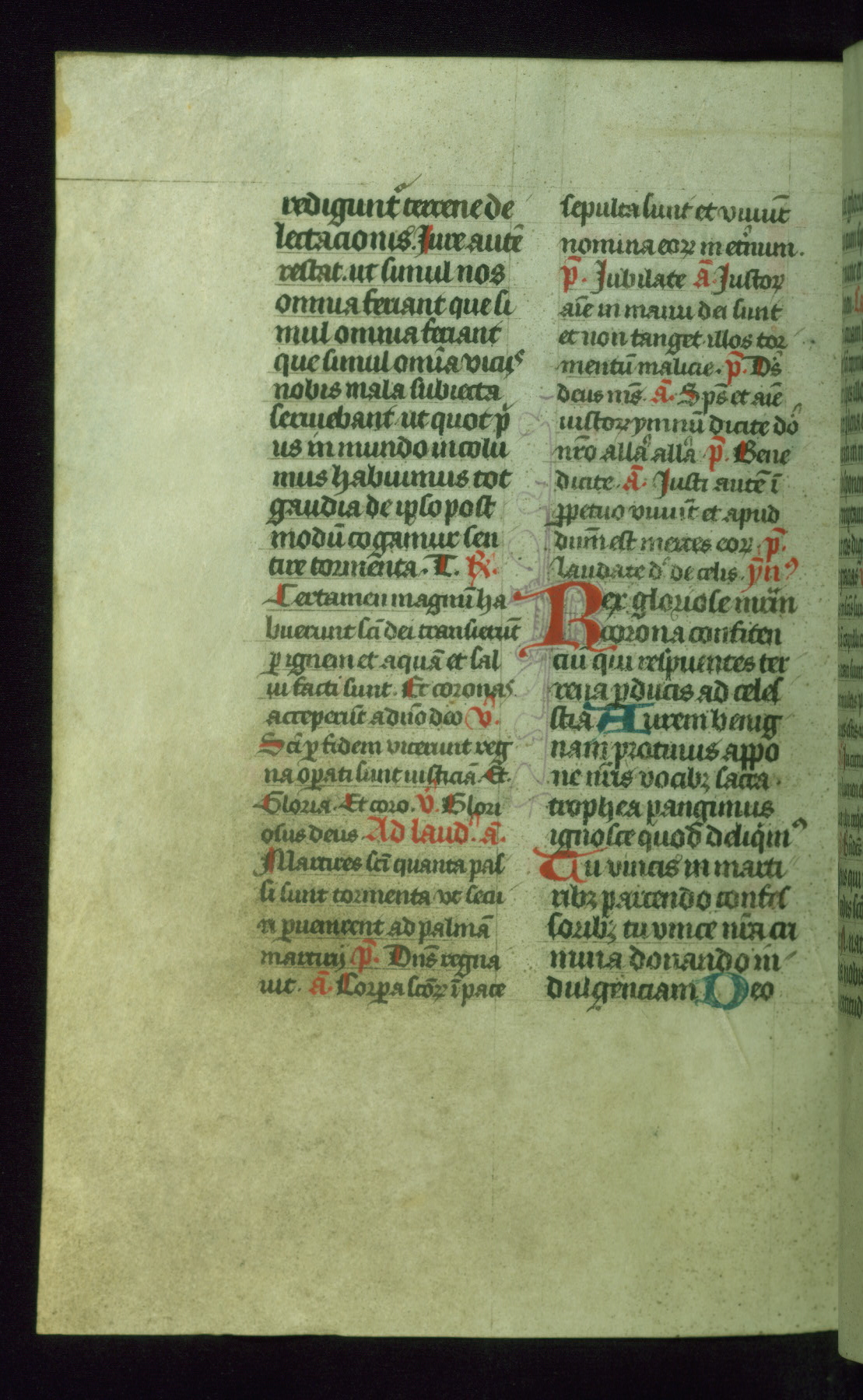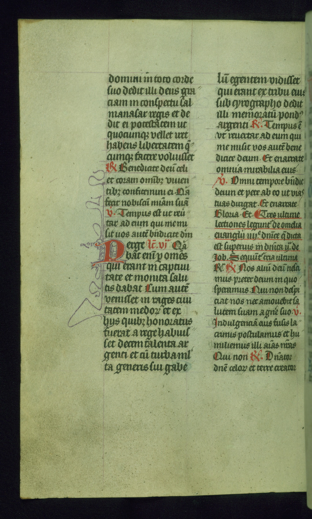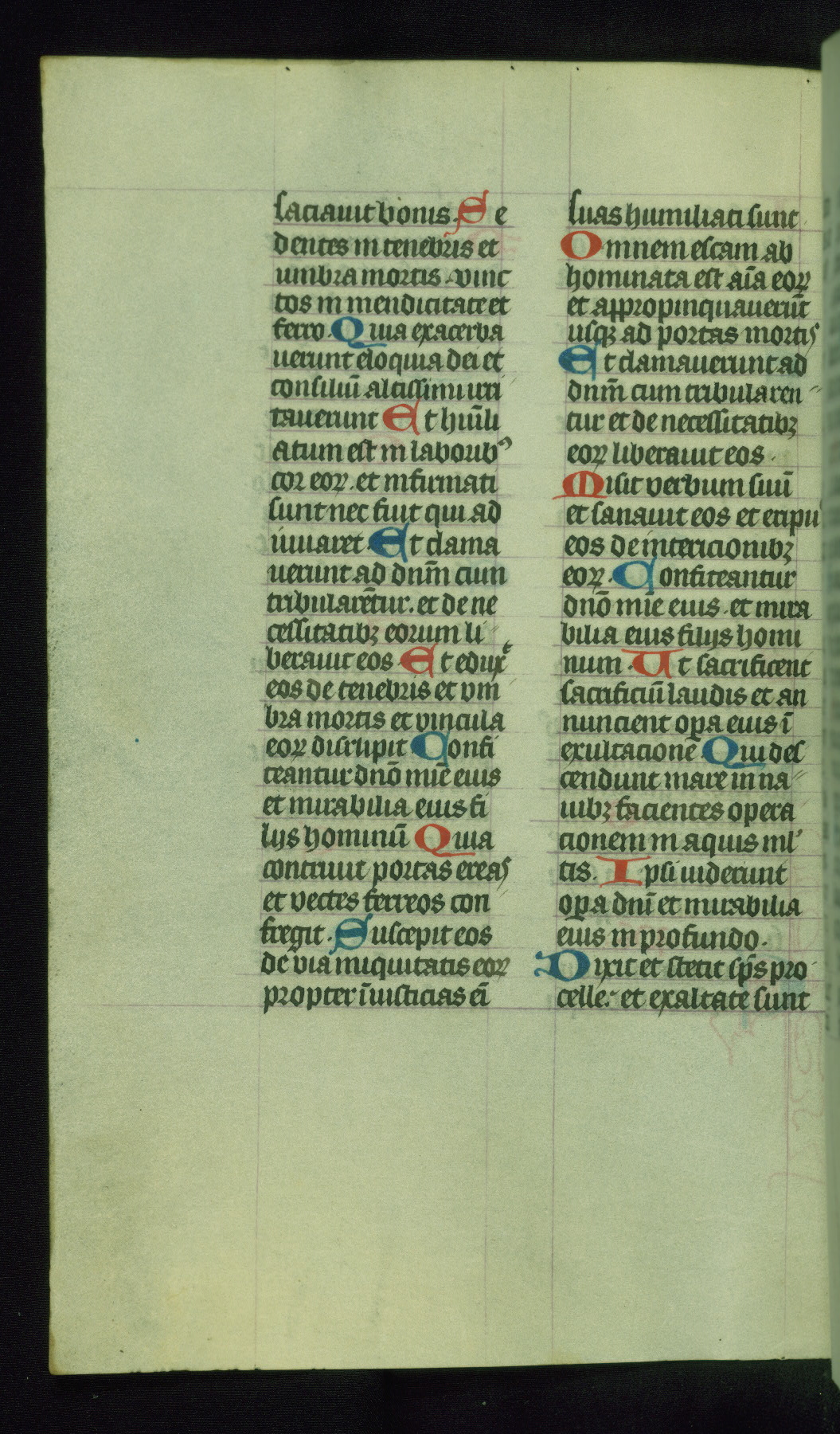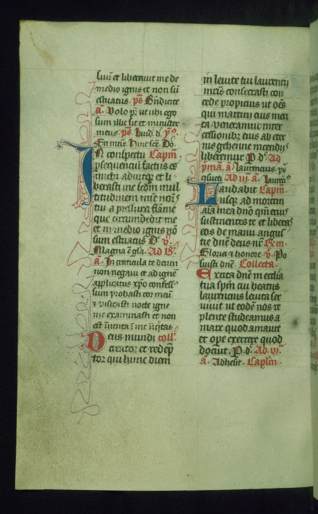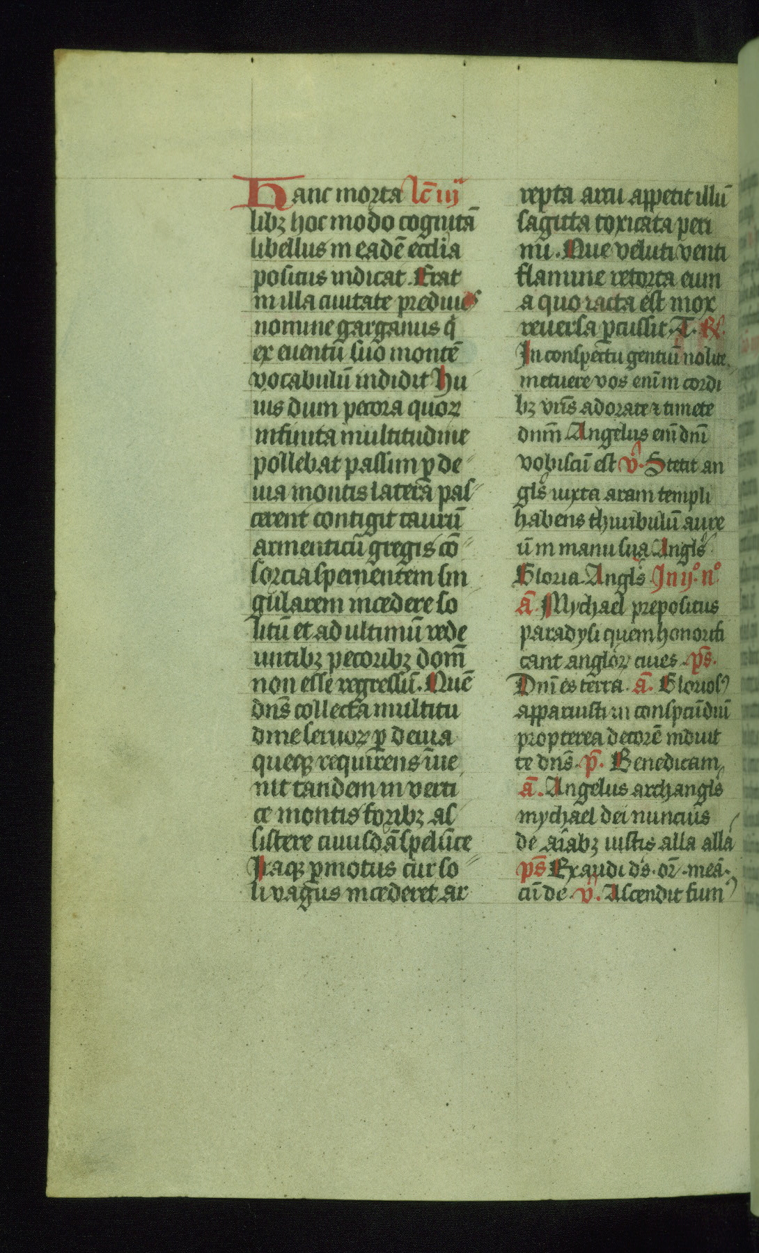 This small breviary, composed of more than 500 folios, is extraordinary for its length, considering it is the summer portion of a two-volume breviary for the use of Liège. The manuscript was completed for ecclesiastical use at the Cathedral of Notre-Dame and St.-Lambert in Liège ca. 1420. This attribution is suggested, for instance, by the petitions to the congregation of this cathedral (fols. 114v-117v), as well as the armorial shield of the family of Surlet de Chokier of Liège represented at the opening of the Psalms. The manuscript has modest, but interesting, decoration with historiated and decorated initials marking the liturgical texts, and occasional angels playing instruments in the margins. The most notable pictorial effect is found in the initials inhabited by transparent figures on rich blue ground. The technique is found, for instance, on fol. 156r with the gold monstrance held by translucent angels for the feast of the Corpus Christi.