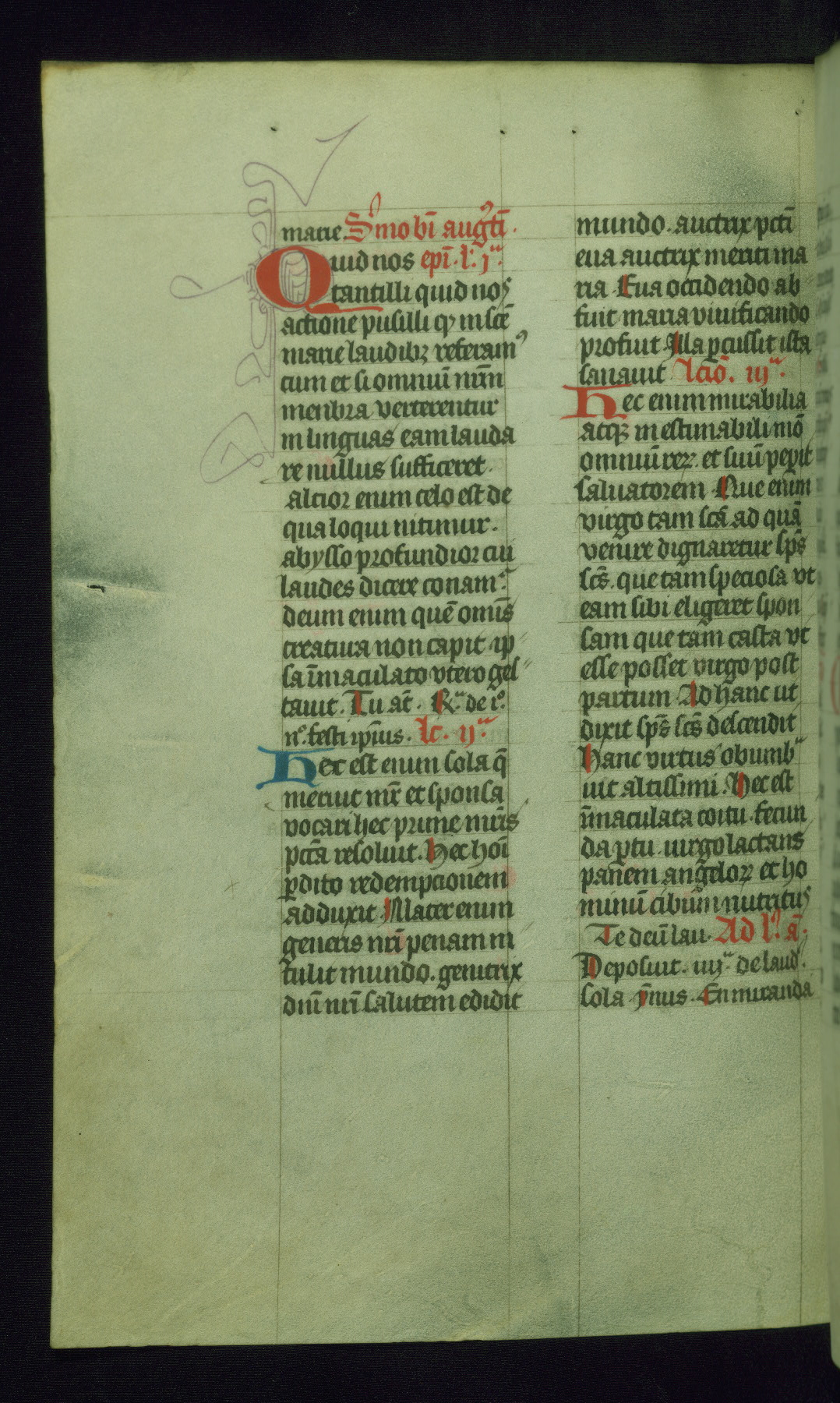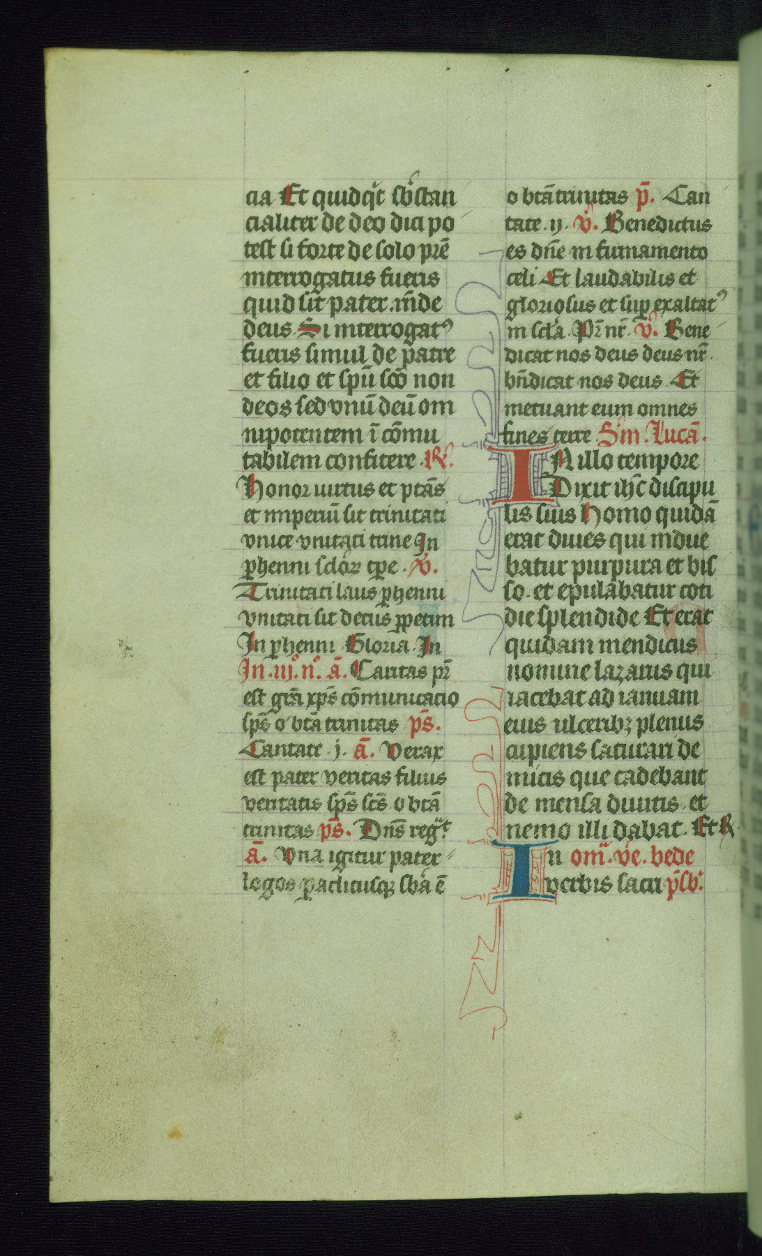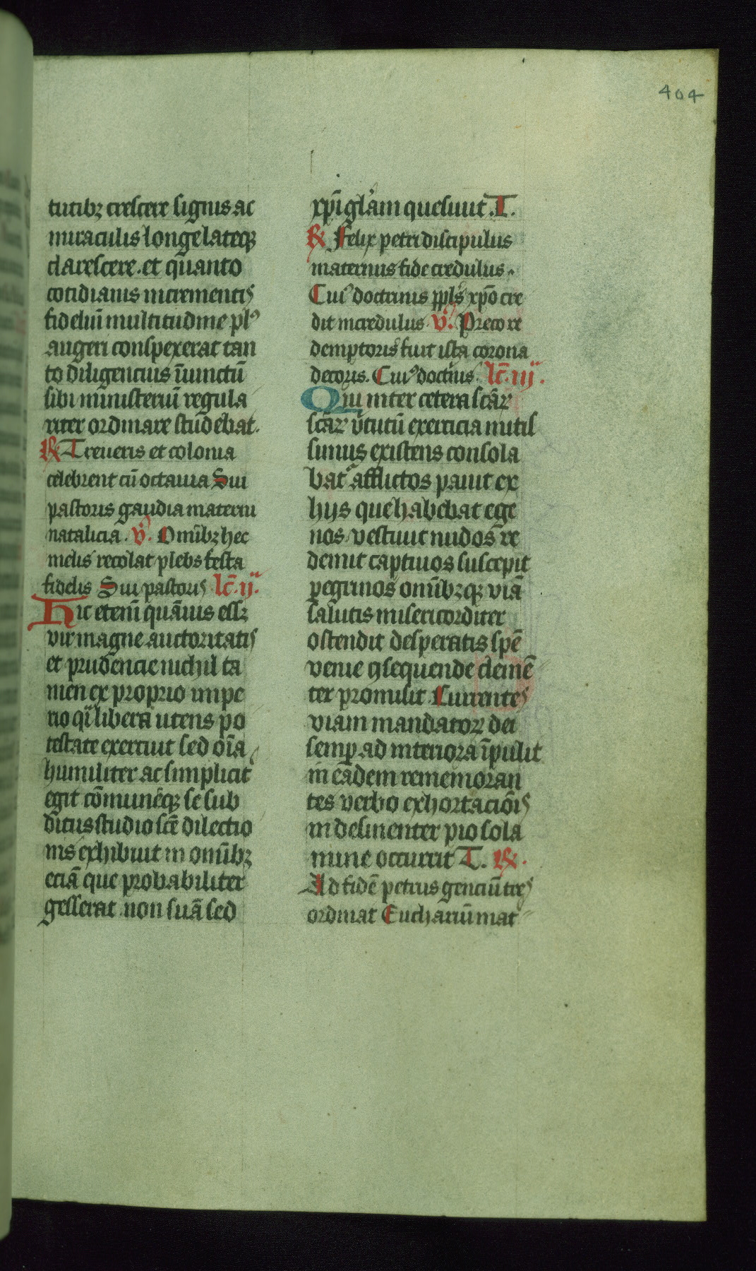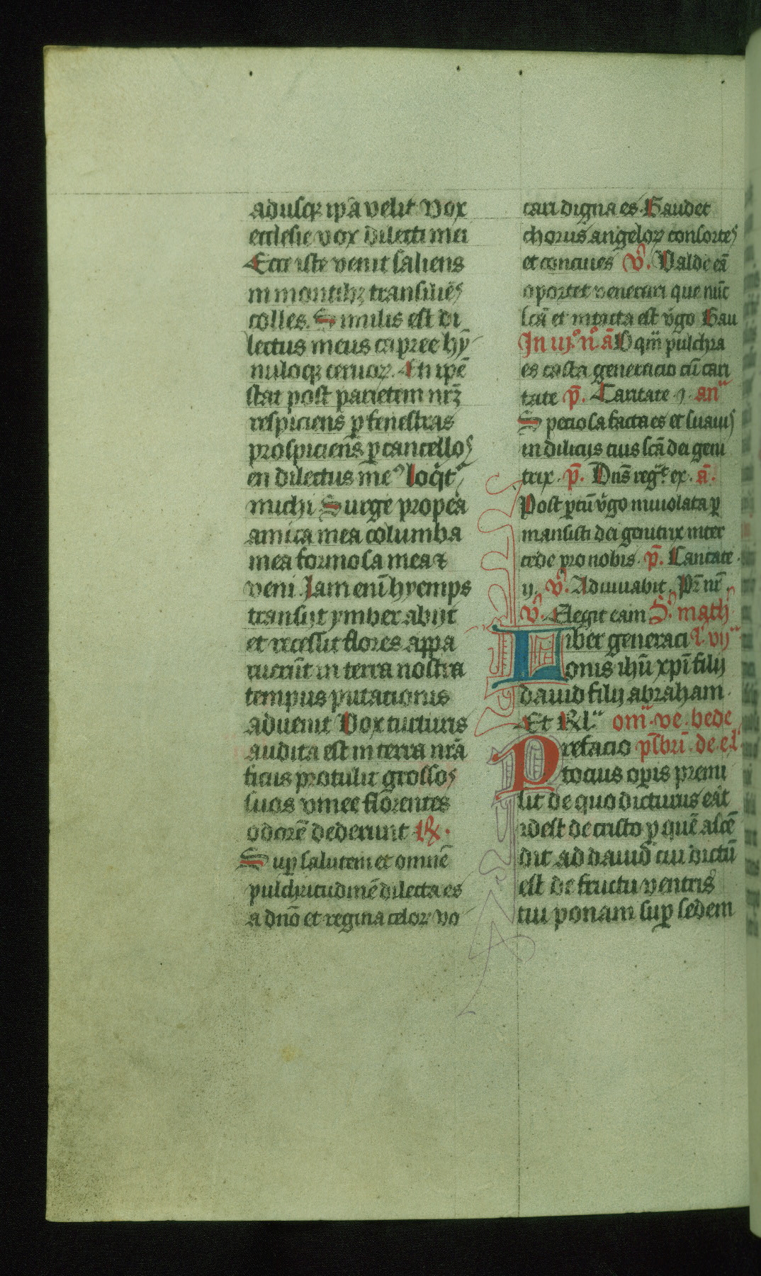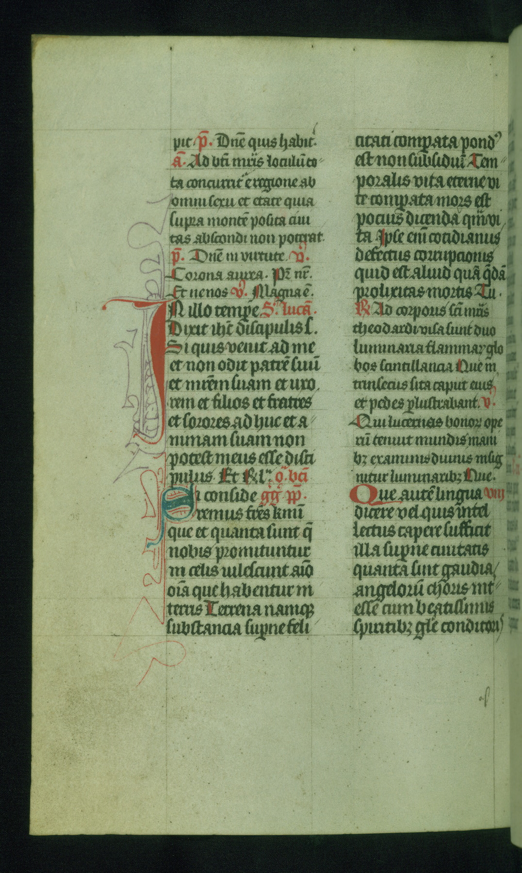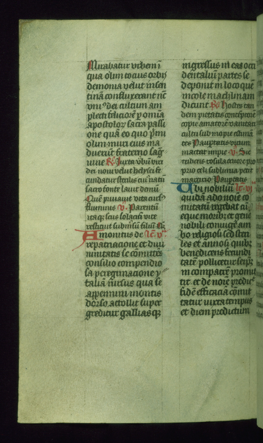 This small breviary, composed of more than 500 folios, is extraordinary for its length, considering it is the summer portion of a two-volume breviary for the use of Liège. The manuscript was completed for ecclesiastical use at the Cathedral of Notre-Dame and St.-Lambert in Liège ca. 1420. This attribution is suggested, for instance, by the petitions to the congregation of this cathedral (fols. 114v-117v), as well as the armorial shield of the family of Surlet de Chokier of Liège represented at the opening of the Psalms. The manuscript has modest, but interesting, decoration with historiated and decorated initials marking the liturgical texts, and occasional angels playing instruments in the margins. The most notable pictorial effect is found in the initials inhabited by transparent figures on rich blue ground. The technique is found, for instance, on fol. 156r with the gold monstrance held by translucent angels for the feast of the Corpus Christi.