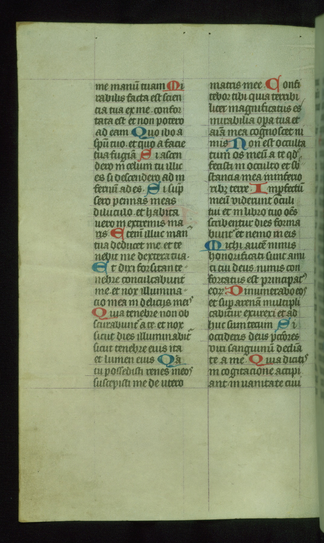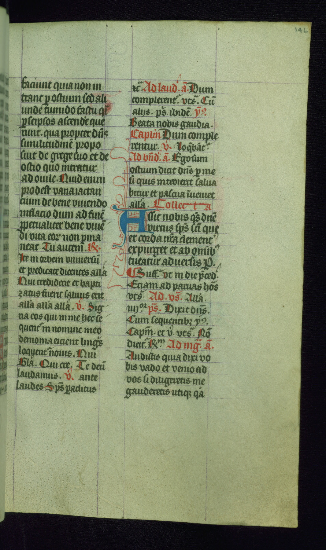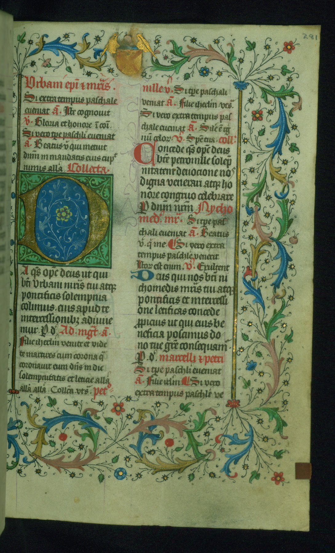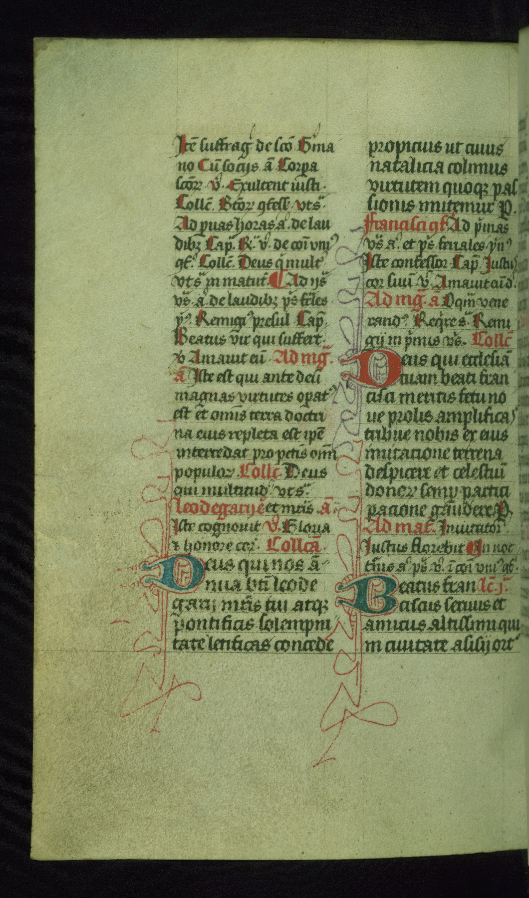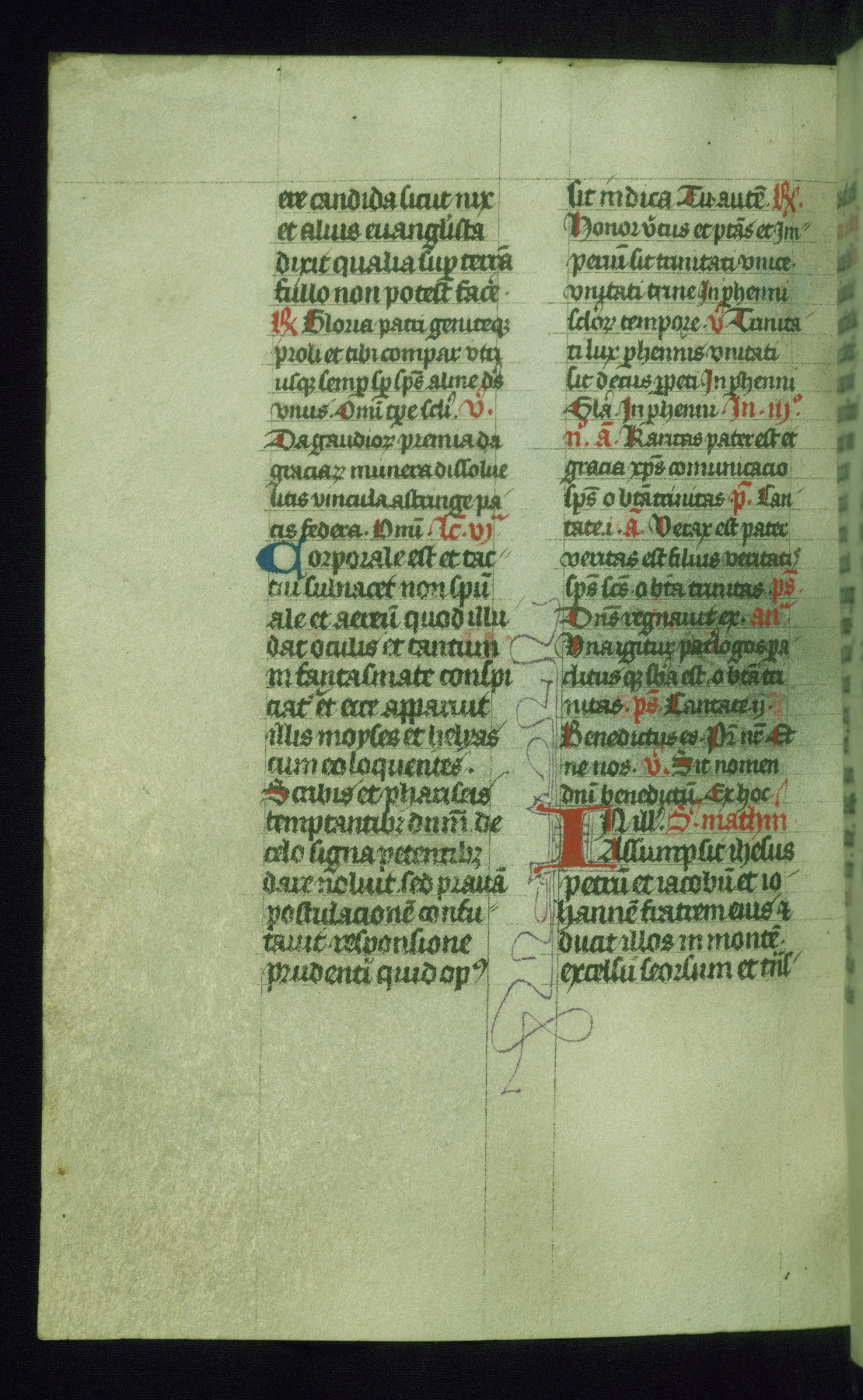 This small breviary, composed of more than 500 folios, is extraordinary for its length, considering it is the summer portion of a two-volume breviary for the use of Liège. The manuscript was completed for ecclesiastical use at the Cathedral of Notre-Dame and St.-Lambert in Liège ca. 1420. This attribution is suggested, for instance, by the petitions to the congregation of this cathedral (fols. 114v-117v), as well as the armorial shield of the family of Surlet de Chokier of Liège represented at the opening of the Psalms. The manuscript has modest, but interesting, decoration with historiated and decorated initials marking the liturgical texts, and occasional angels playing instruments in the margins. The most notable pictorial effect is found in the initials inhabited by transparent figures on rich blue ground. The technique is found, for instance, on fol. 156r with the gold monstrance held by translucent angels for the feast of the Corpus Christi.