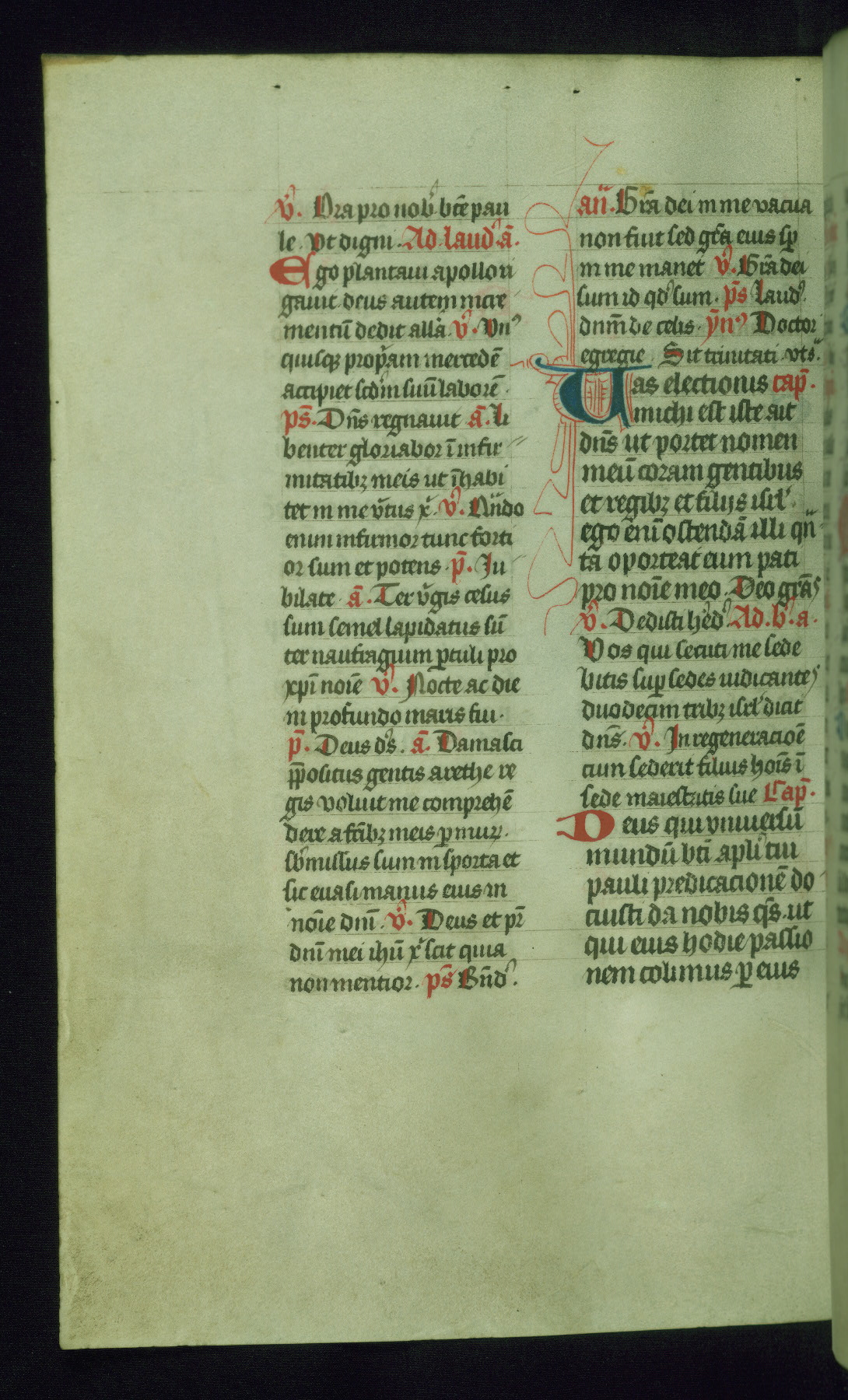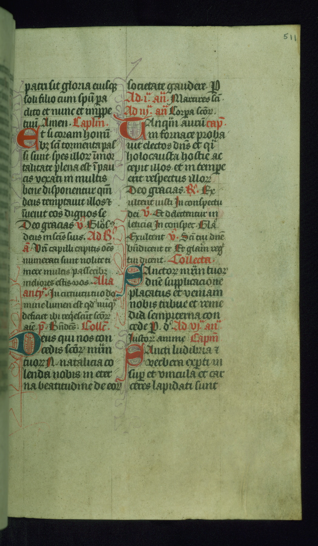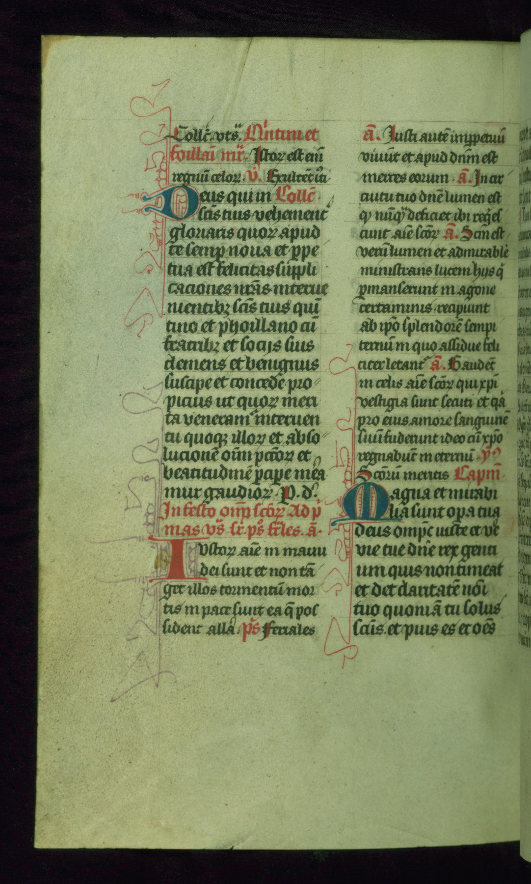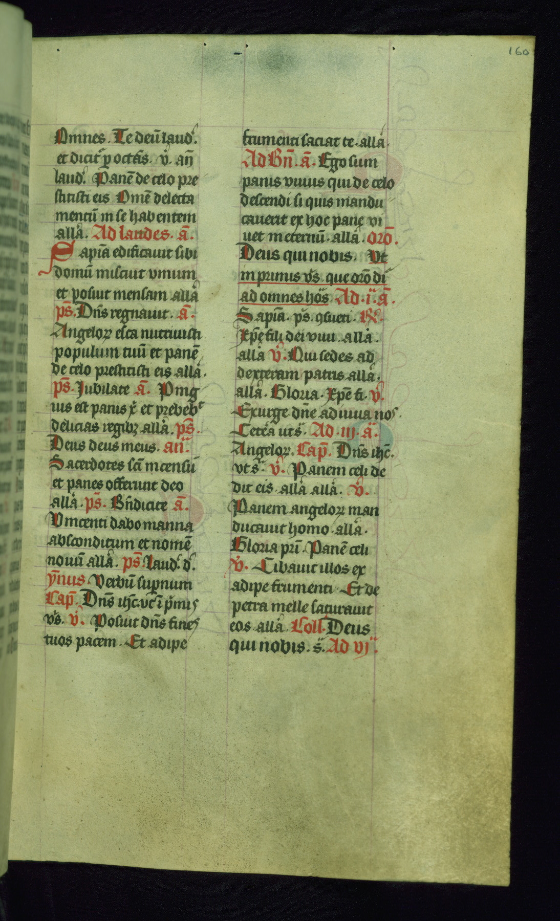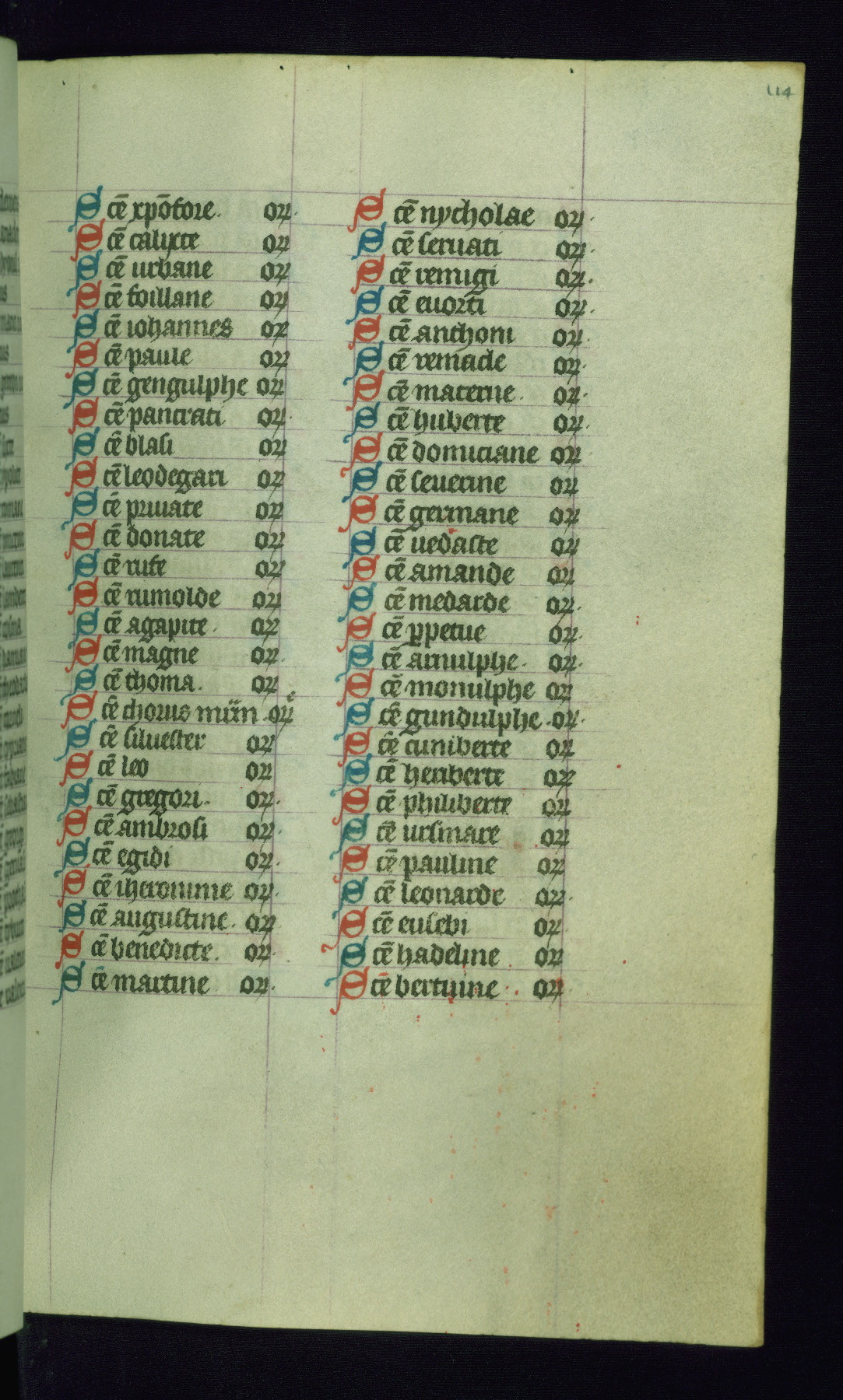 This small breviary, composed of more than 500 folios, is extraordinary for its length, considering it is the summer portion of a two-volume breviary for the use of Liège. The manuscript was completed for ecclesiastical use at the Cathedral of Notre-Dame and St.-Lambert in Liège ca. 1420. This attribution is suggested, for instance, by the petitions to the congregation of this cathedral (fols. 114v-117v), as well as the armorial shield of the family of Surlet de Chokier of Liège represented at the opening of the Psalms. The manuscript has modest, but interesting, decoration with historiated and decorated initials marking the liturgical texts, and occasional angels playing instruments in the margins. The most notable pictorial effect is found in the initials inhabited by transparent figures on rich blue ground. The technique is found, for instance, on fol. 156r with the gold monstrance held by translucent angels for the feast of the Corpus Christi.