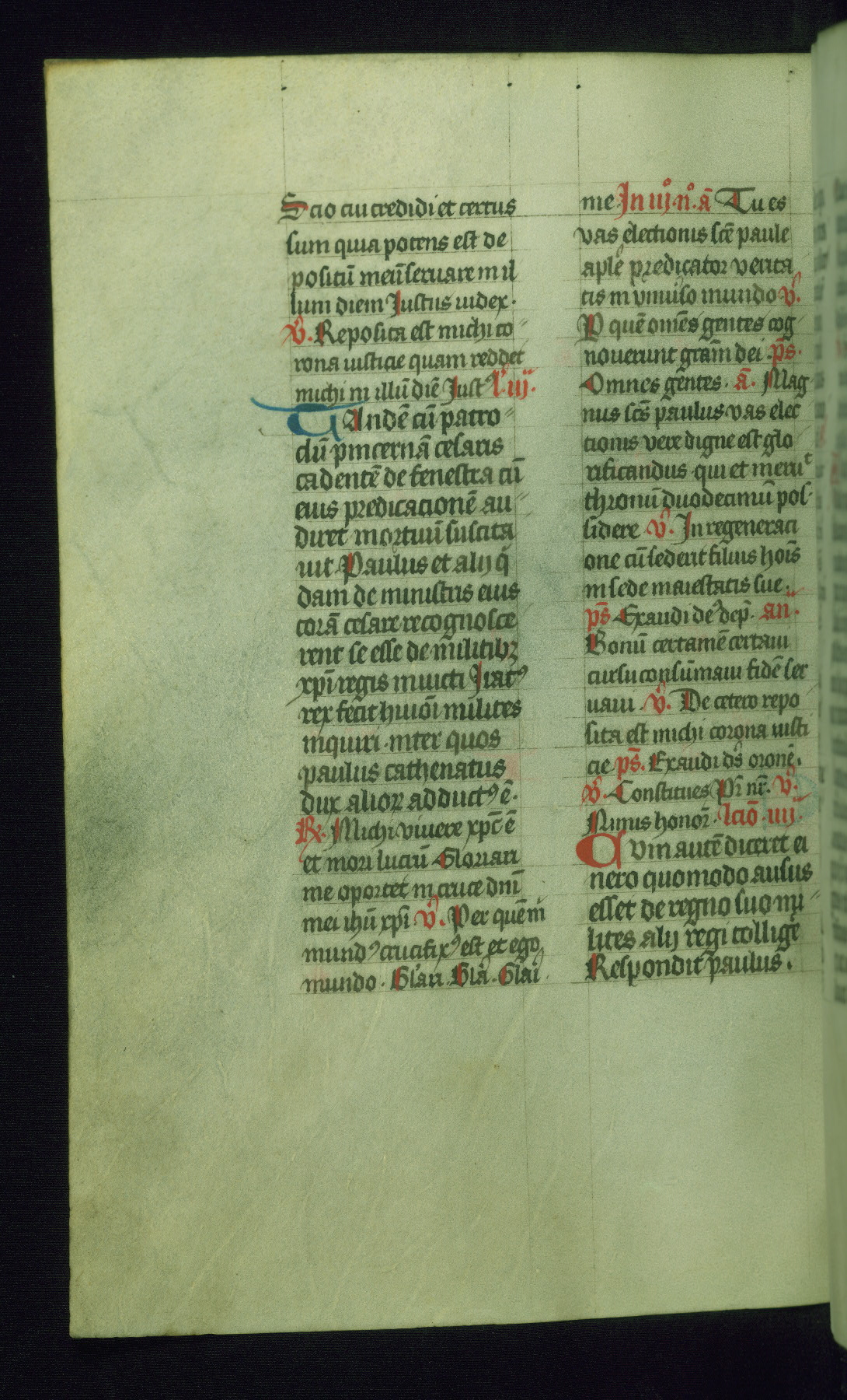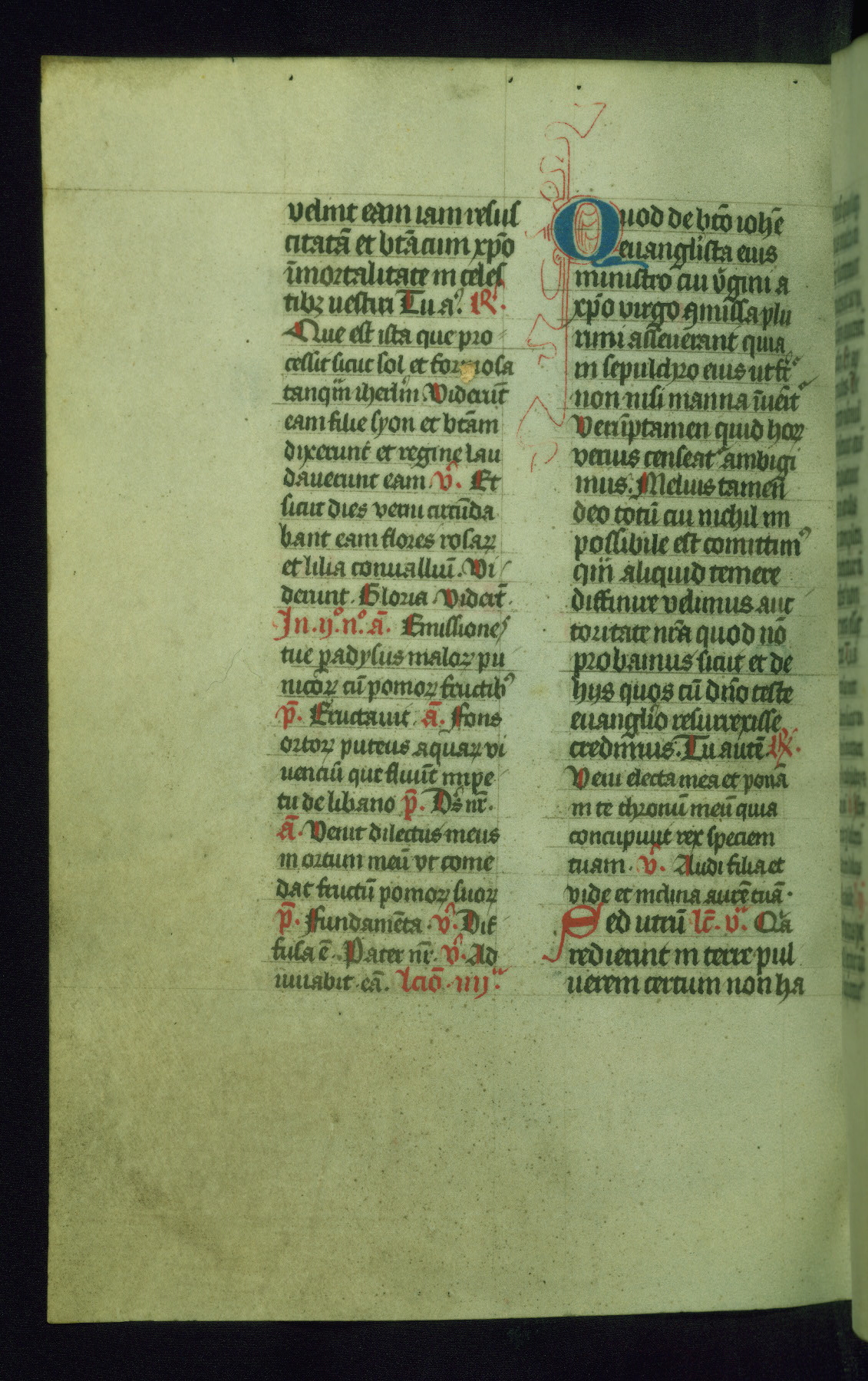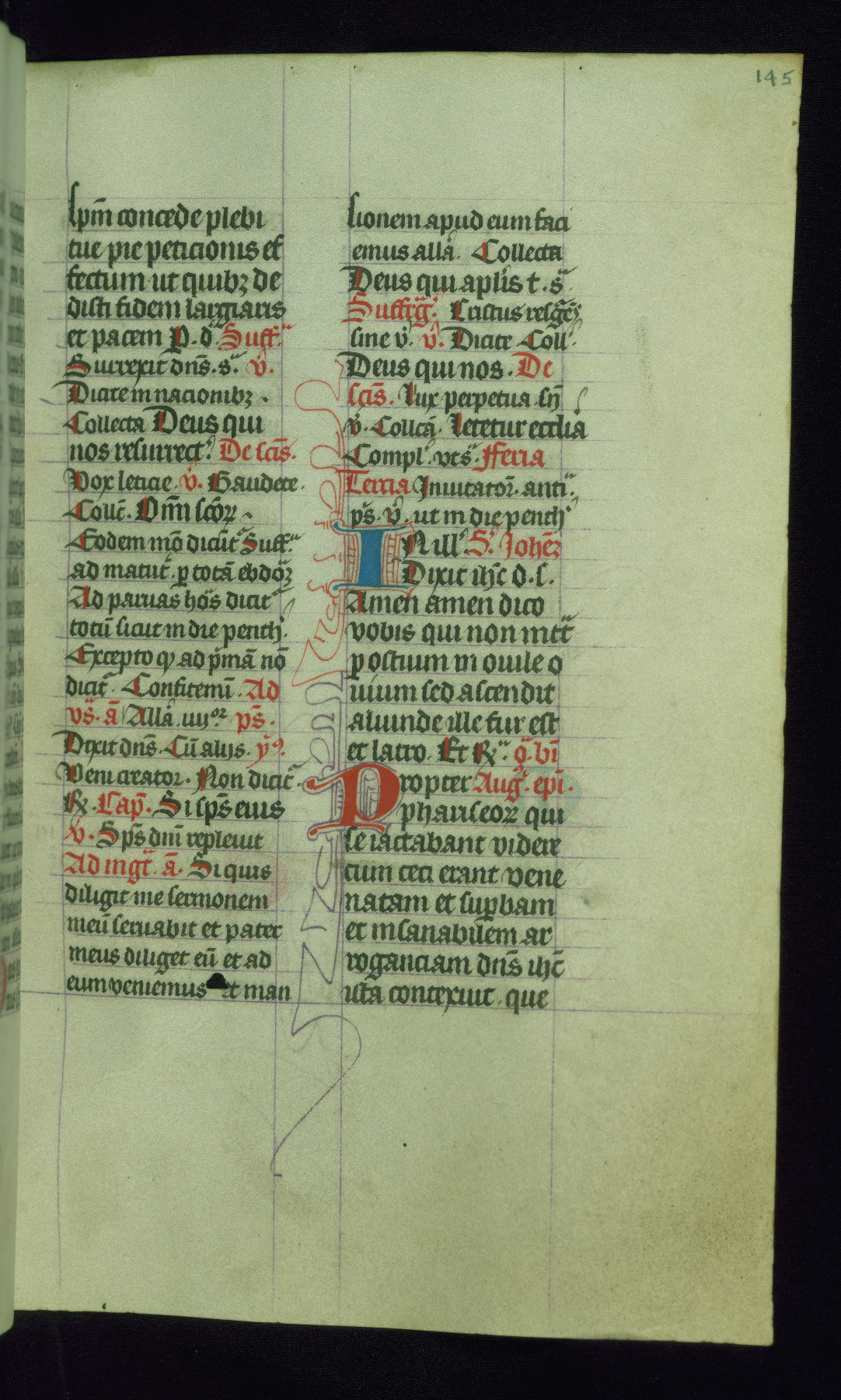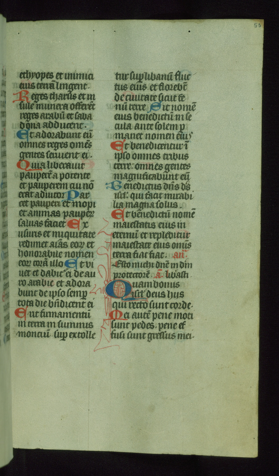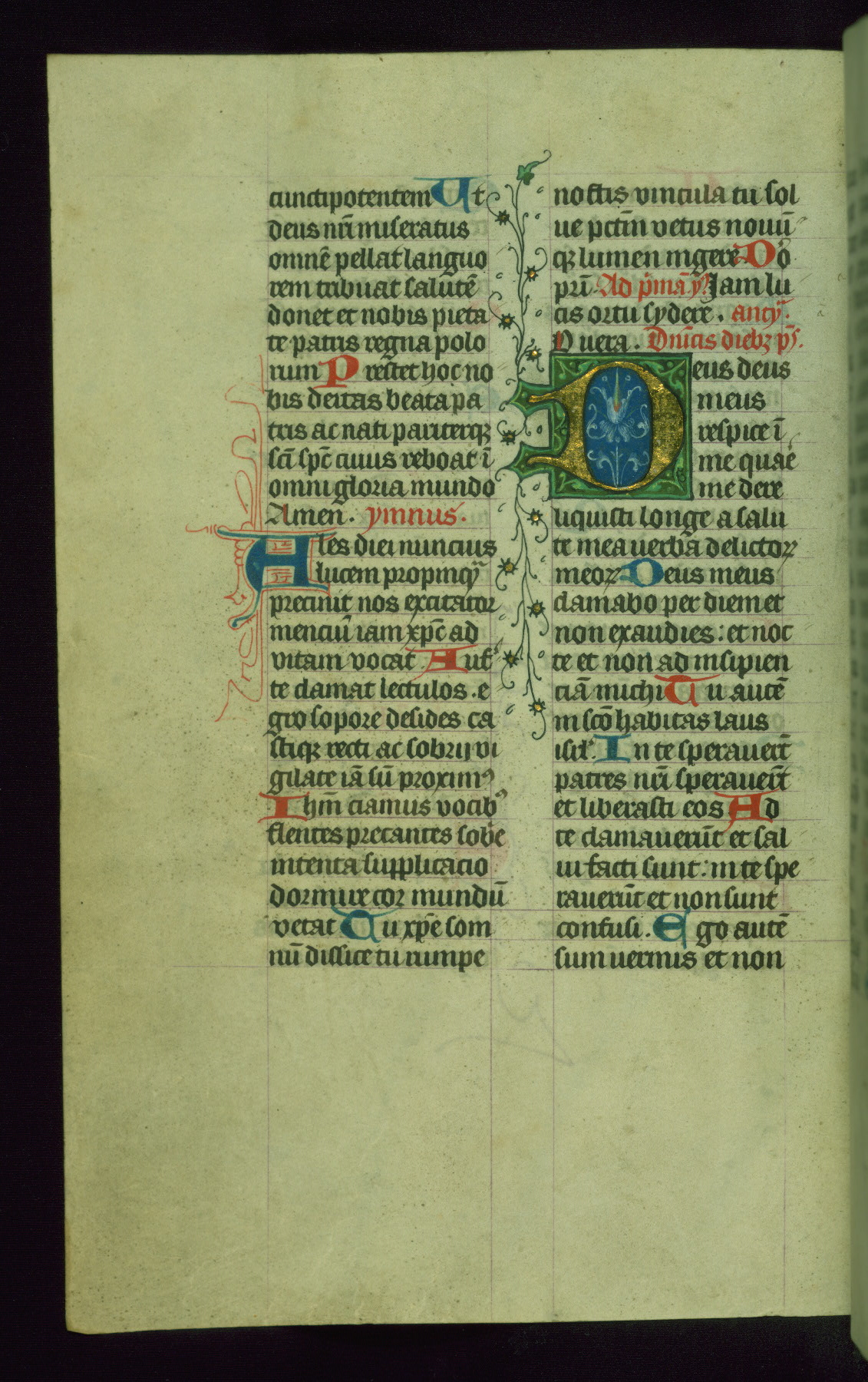 This small breviary, composed of more than 500 folios, is extraordinary for its length, considering it is the summer portion of a two-volume breviary for the use of Liège. The manuscript was completed for ecclesiastical use at the Cathedral of Notre-Dame and St.-Lambert in Liège ca. 1420. This attribution is suggested, for instance, by the petitions to the congregation of this cathedral (fols. 114v-117v), as well as the armorial shield of the family of Surlet de Chokier of Liège represented at the opening of the Psalms. The manuscript has modest, but interesting, decoration with historiated and decorated initials marking the liturgical texts, and occasional angels playing instruments in the margins. The most notable pictorial effect is found in the initials inhabited by transparent figures on rich blue ground. The technique is found, for instance, on fol. 156r with the gold monstrance held by translucent angels for the feast of the Corpus Christi.
