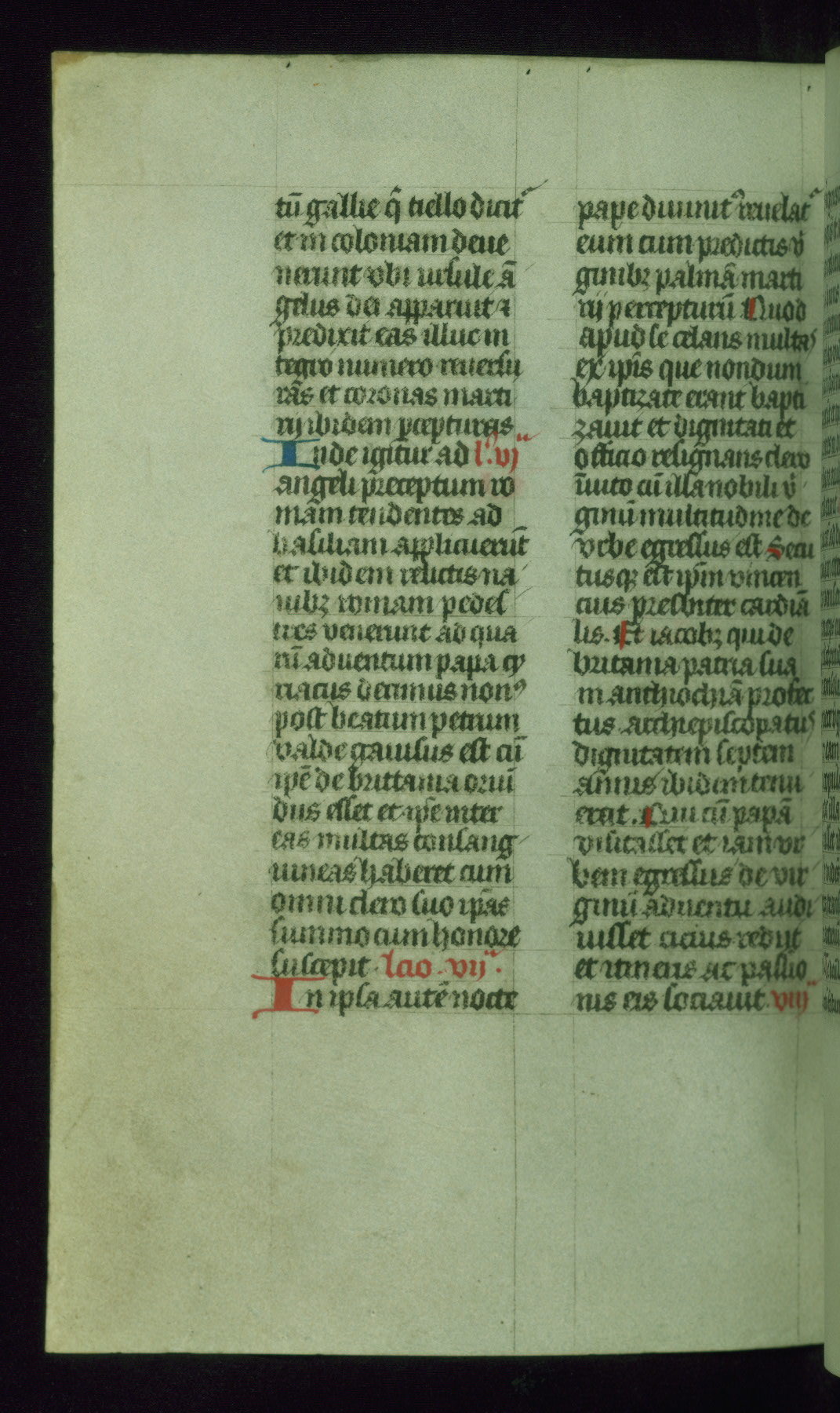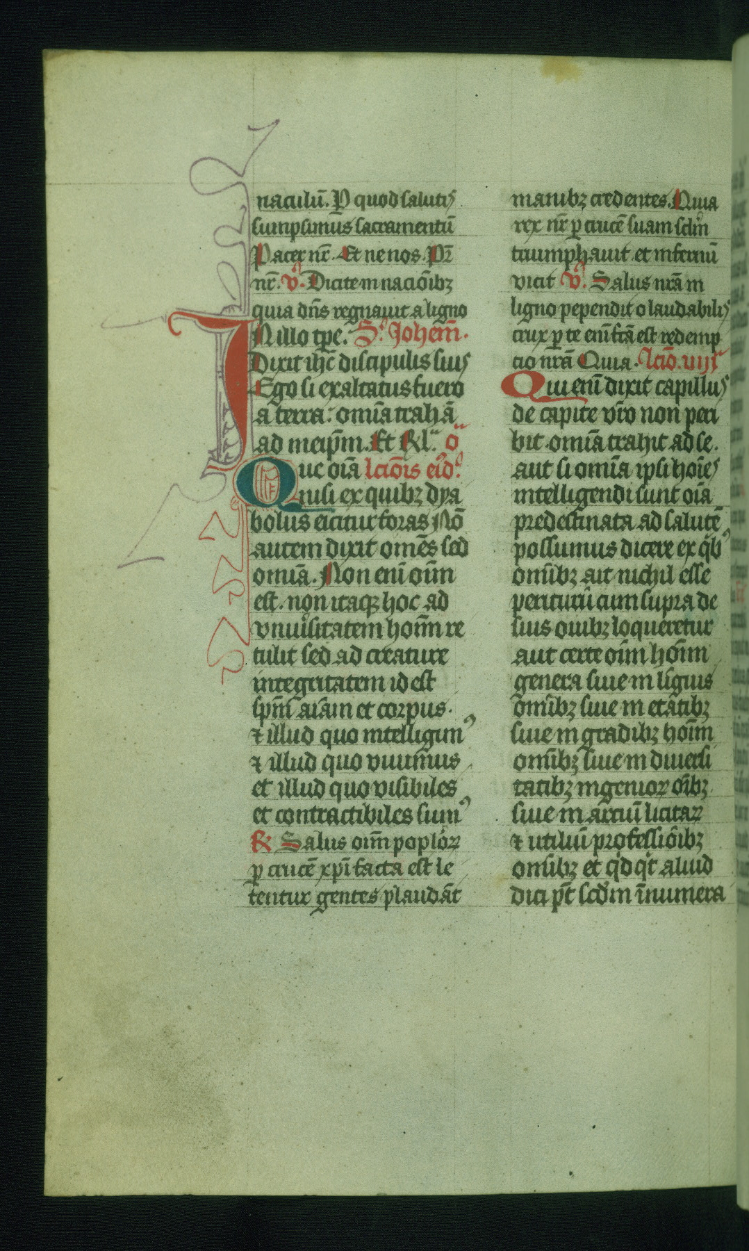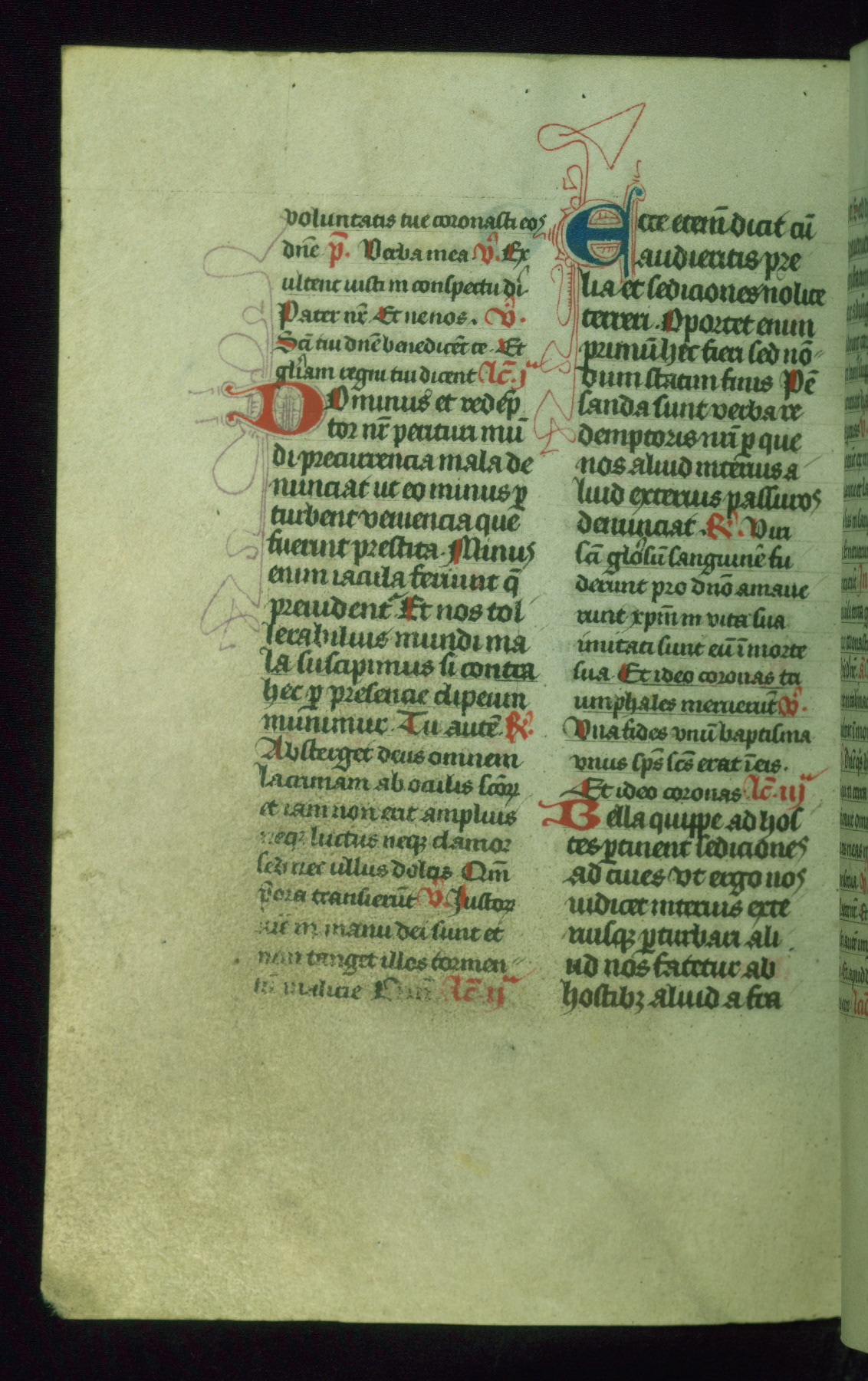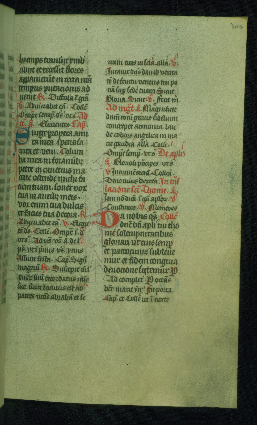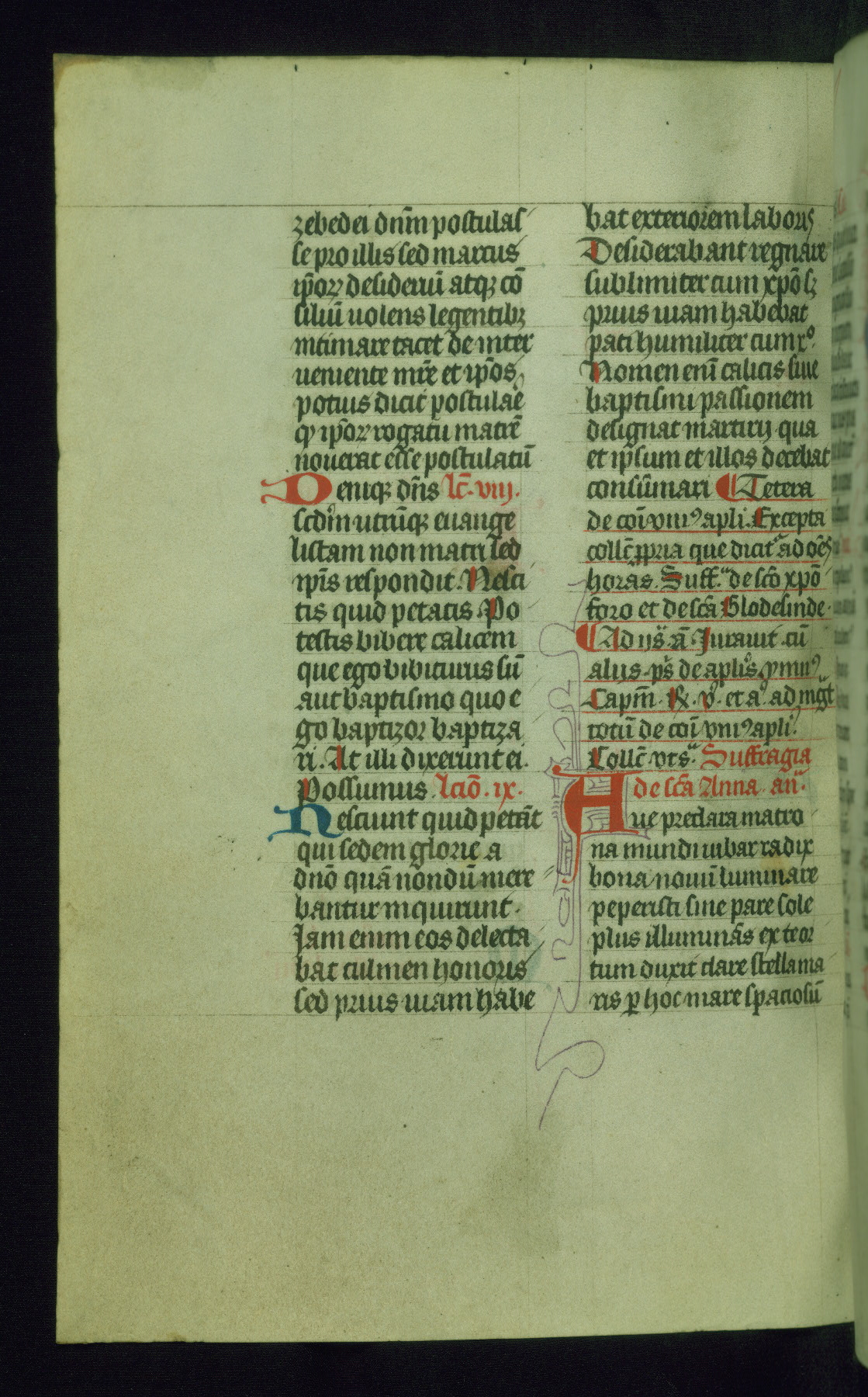 This small breviary, composed of more than 500 folios, is extraordinary for its length, considering it is the summer portion of a two-volume breviary for the use of Liège. The manuscript was completed for ecclesiastical use at the Cathedral of Notre-Dame and St.-Lambert in Liège ca. 1420. This attribution is suggested, for instance, by the petitions to the congregation of this cathedral (fols. 114v-117v), as well as the armorial shield of the family of Surlet de Chokier of Liège represented at the opening of the Psalms. The manuscript has modest, but interesting, decoration with historiated and decorated initials marking the liturgical texts, and occasional angels playing instruments in the margins. The most notable pictorial effect is found in the initials inhabited by transparent figures on rich blue ground. The technique is found, for instance, on fol. 156r with the gold monstrance held by translucent angels for the feast of the Corpus Christi.