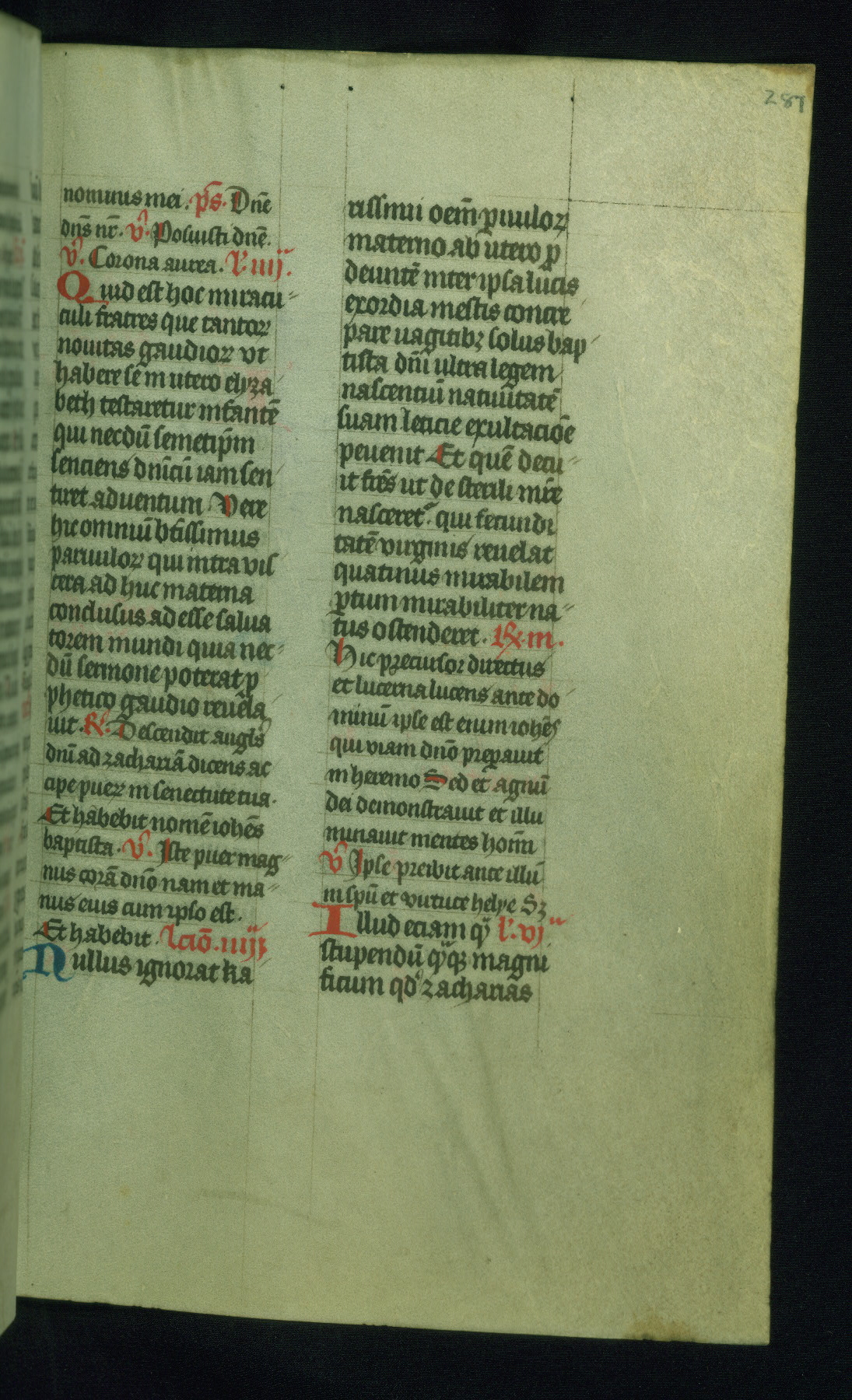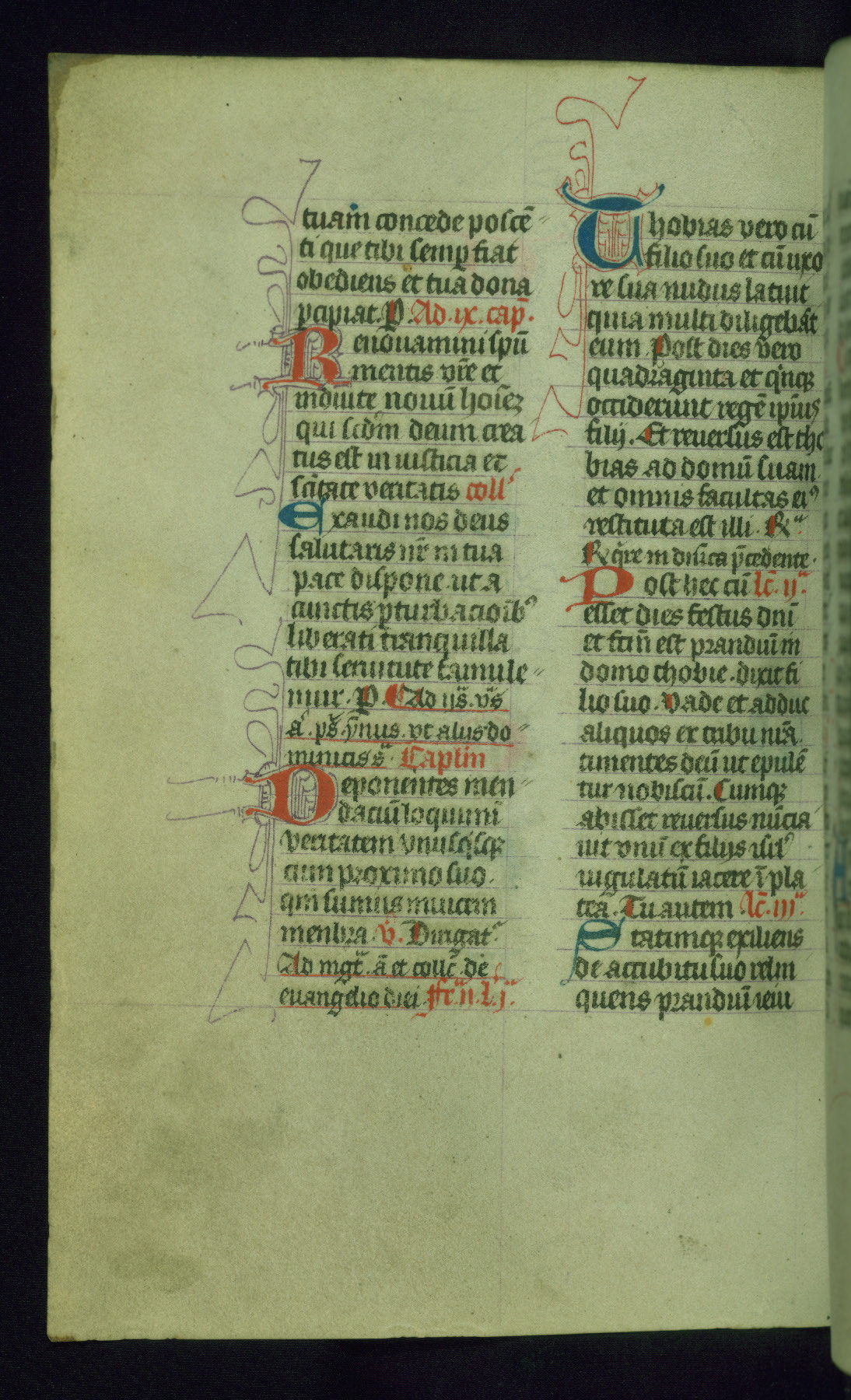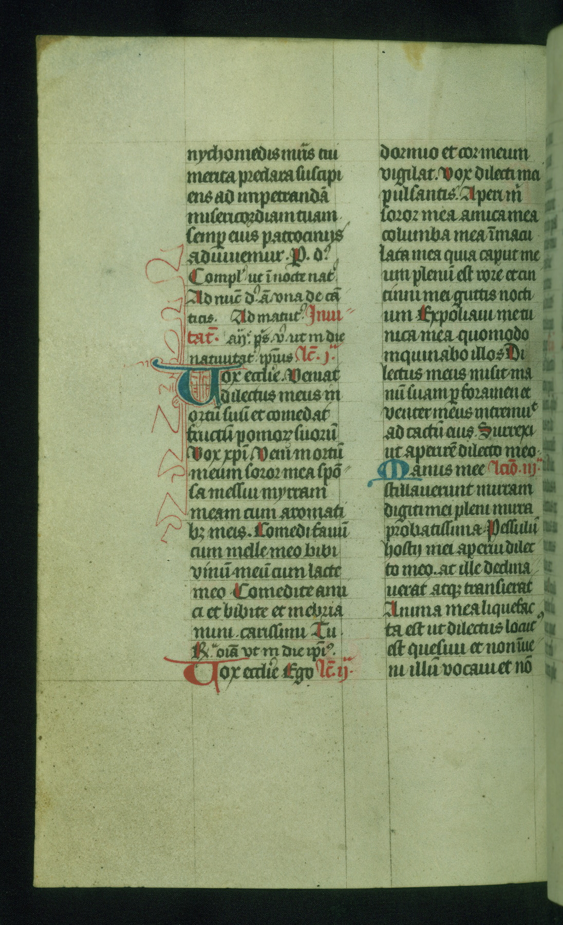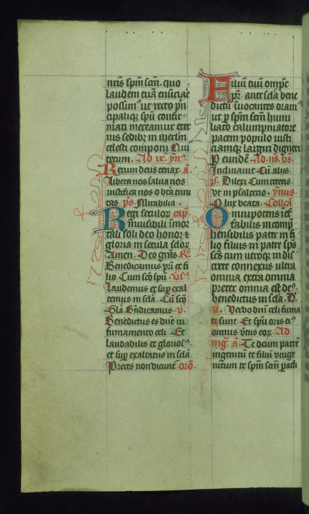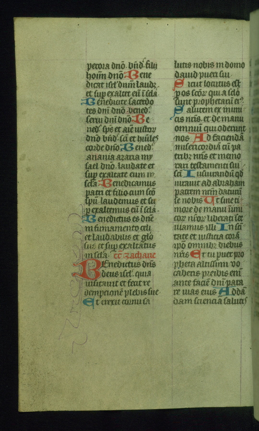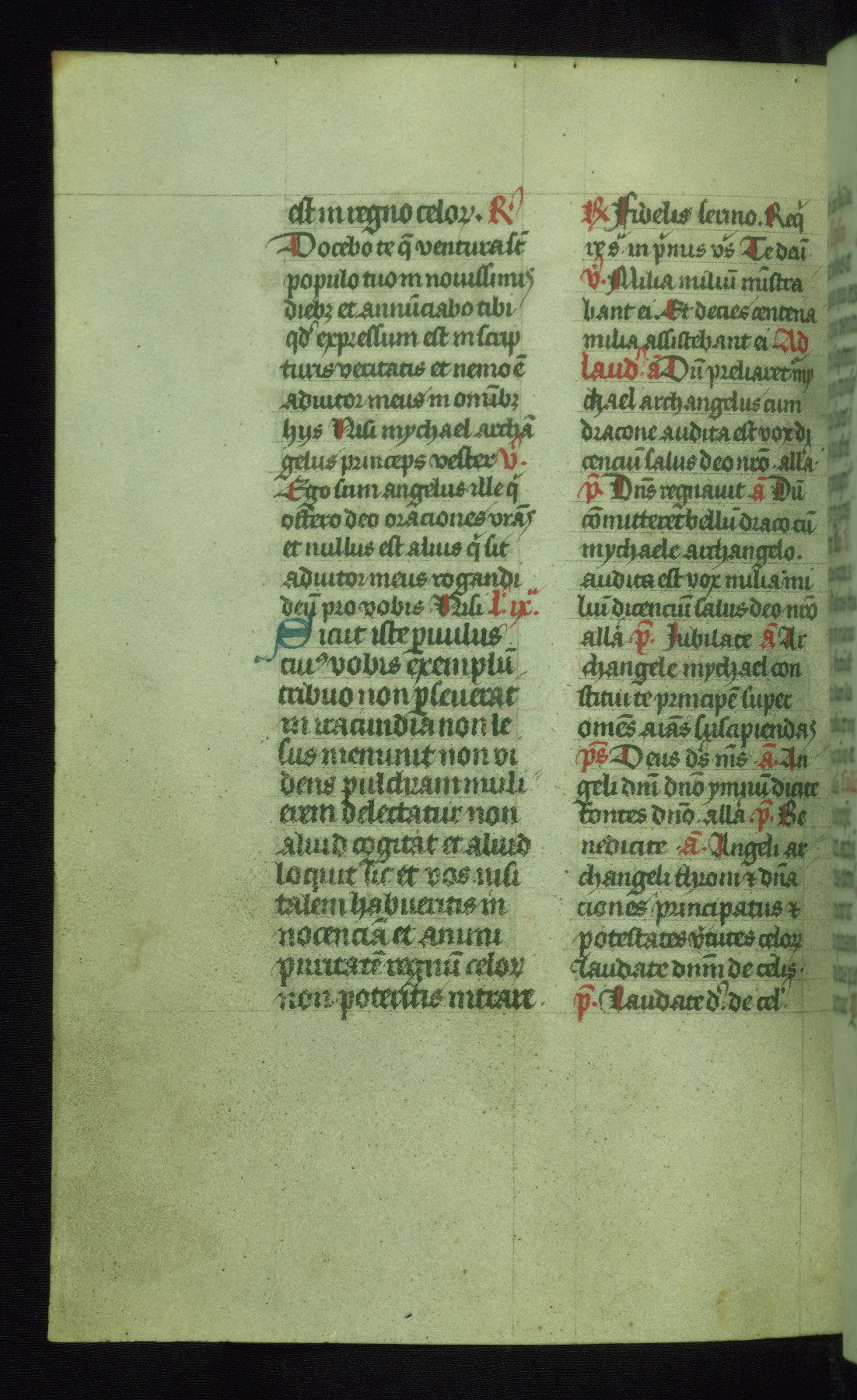 This small breviary, composed of more than 500 folios, is extraordinary for its length, considering it is the summer portion of a two-volume breviary for the use of Liège. The manuscript was completed for ecclesiastical use at the Cathedral of Notre-Dame and St.-Lambert in Liège ca. 1420. This attribution is suggested, for instance, by the petitions to the congregation of this cathedral (fols. 114v-117v), as well as the armorial shield of the family of Surlet de Chokier of Liège represented at the opening of the Psalms. The manuscript has modest, but interesting, decoration with historiated and decorated initials marking the liturgical texts, and occasional angels playing instruments in the margins. The most notable pictorial effect is found in the initials inhabited by transparent figures on rich blue ground. The technique is found, for instance, on fol. 156r with the gold monstrance held by translucent angels for the feast of the Corpus Christi.