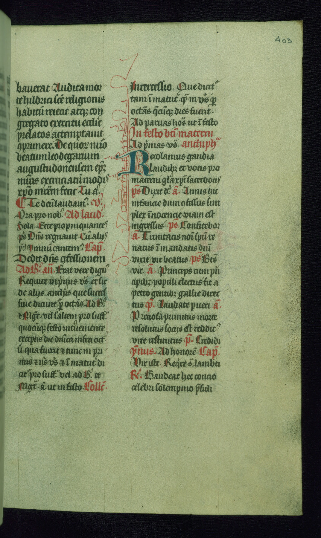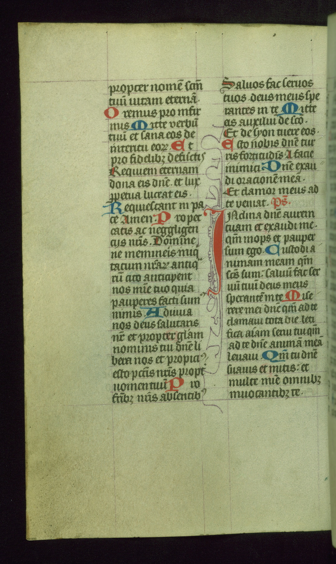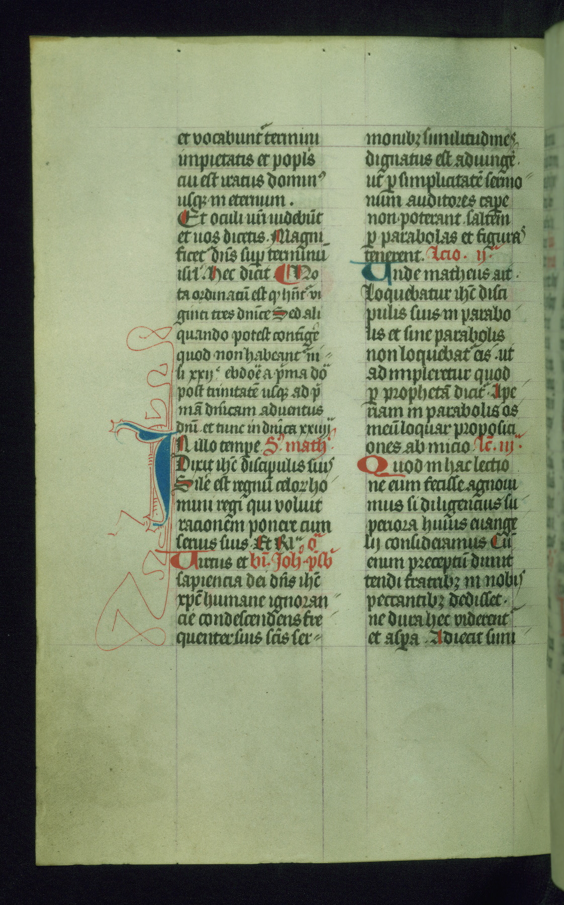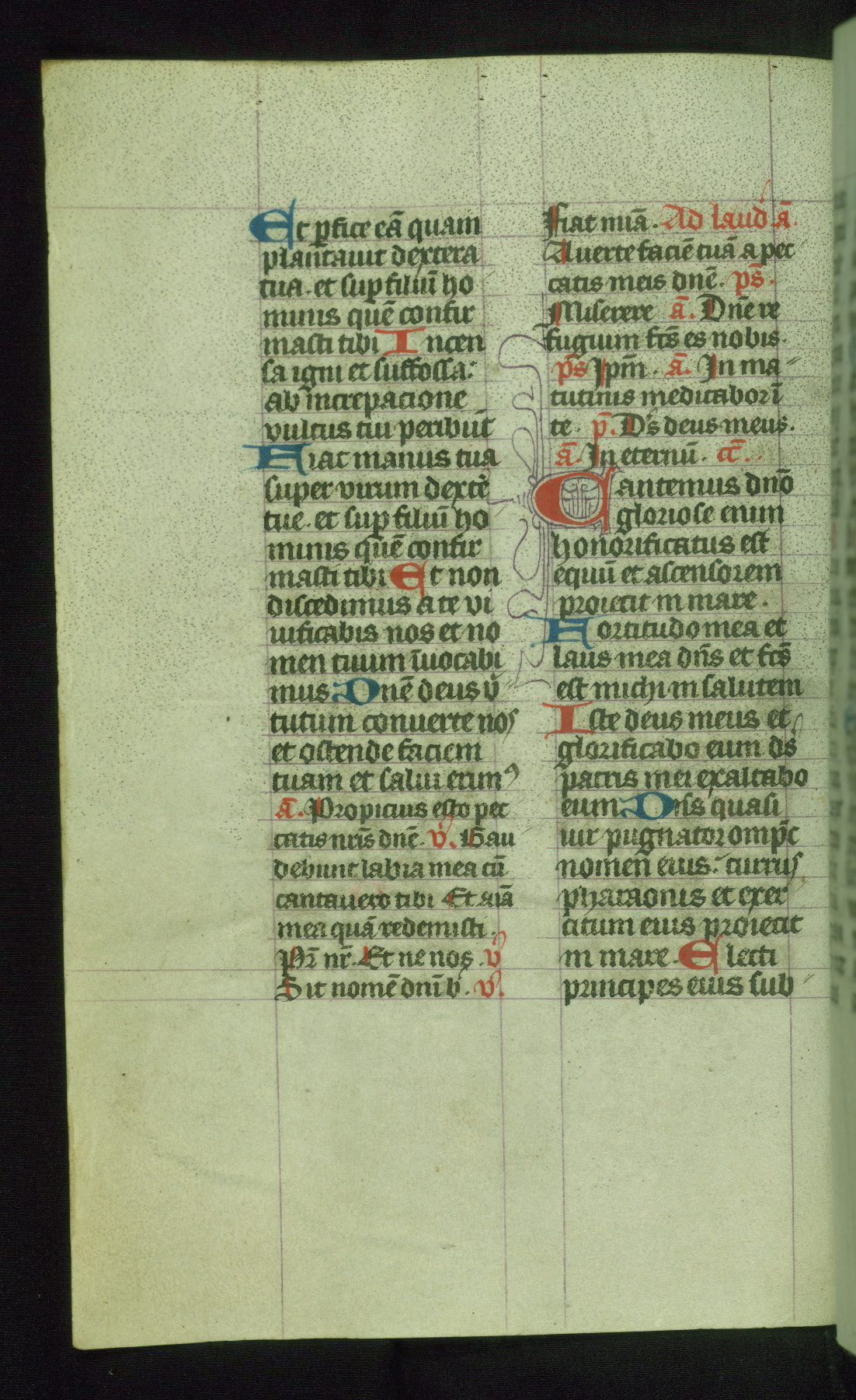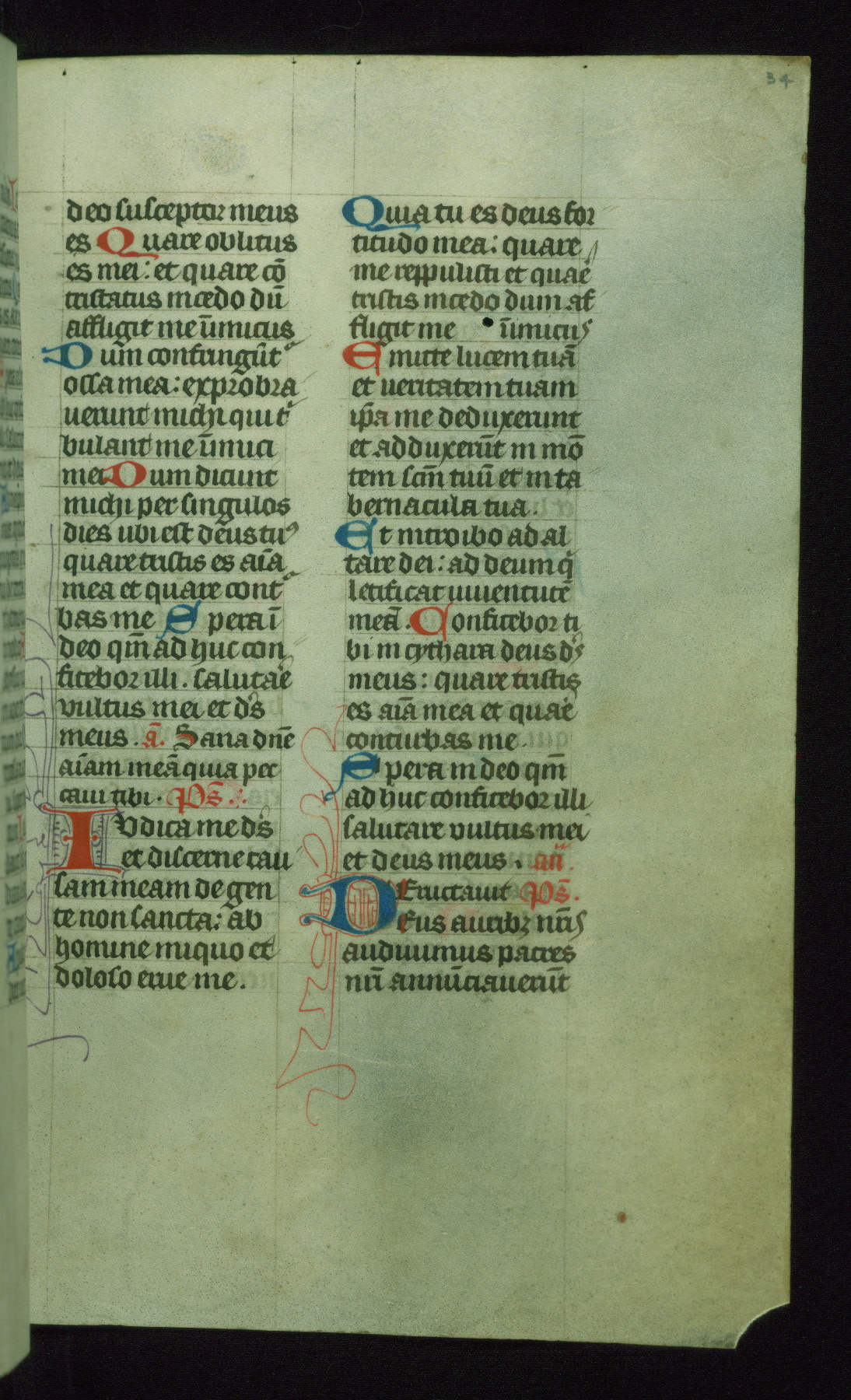 This small breviary, composed of more than 500 folios, is extraordinary for its length, considering it is the summer portion of a two-volume breviary for the use of Liège. The manuscript was completed for ecclesiastical use at the Cathedral of Notre-Dame and St.-Lambert in Liège ca. 1420. This attribution is suggested, for instance, by the petitions to the congregation of this cathedral (fols. 114v-117v), as well as the armorial shield of the family of Surlet de Chokier of Liège represented at the opening of the Psalms. The manuscript has modest, but interesting, decoration with historiated and decorated initials marking the liturgical texts, and occasional angels playing instruments in the margins. The most notable pictorial effect is found in the initials inhabited by transparent figures on rich blue ground. The technique is found, for instance, on fol. 156r with the gold monstrance held by translucent angels for the feast of the Corpus Christi.