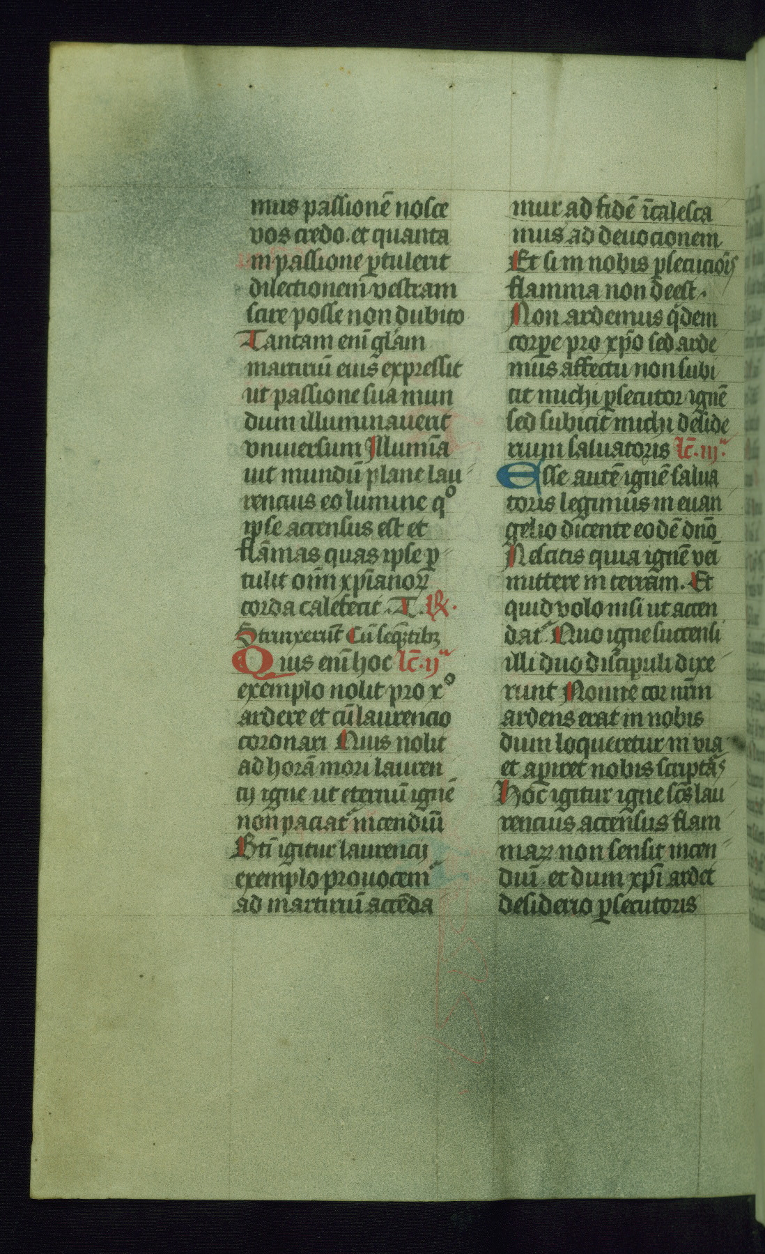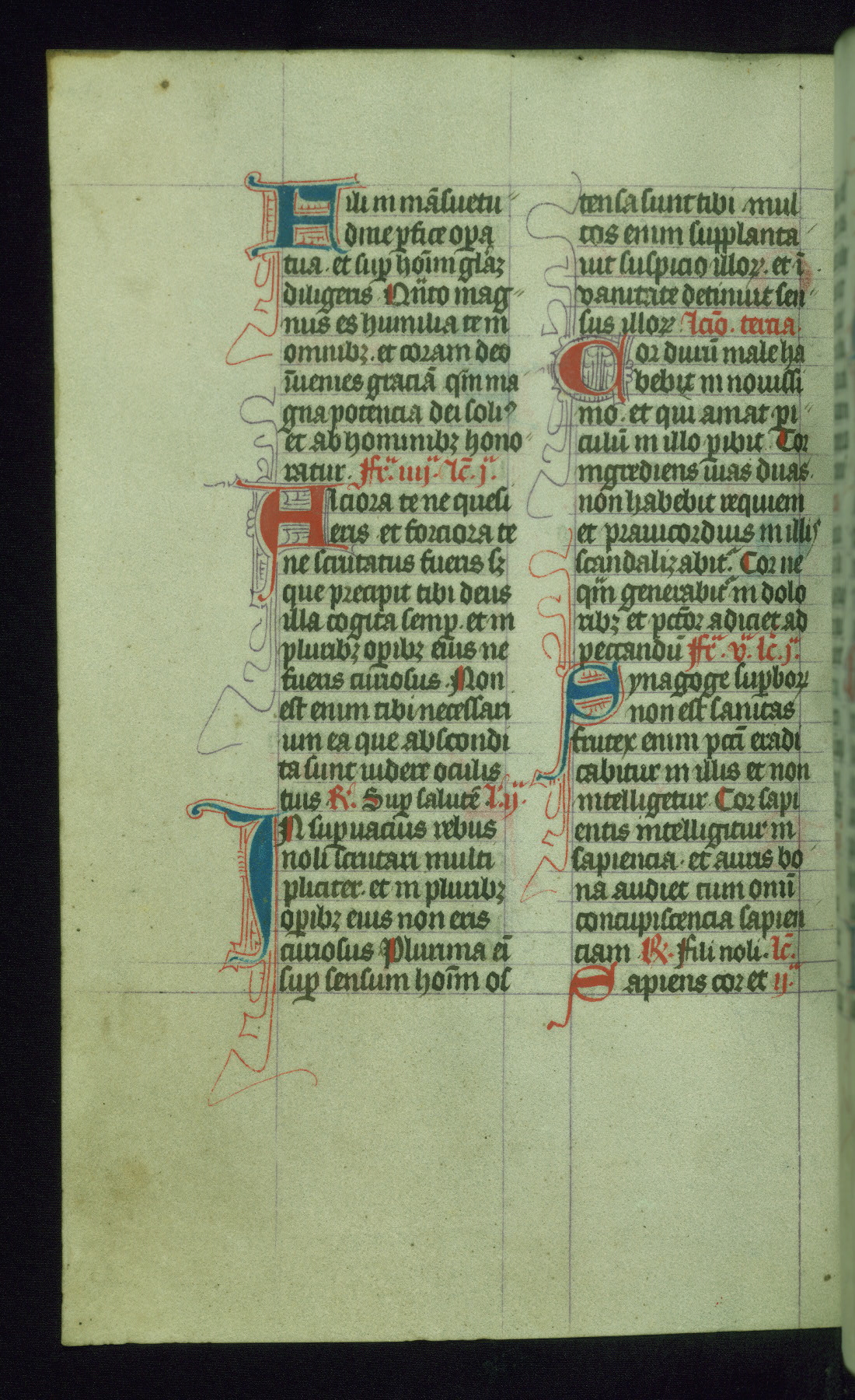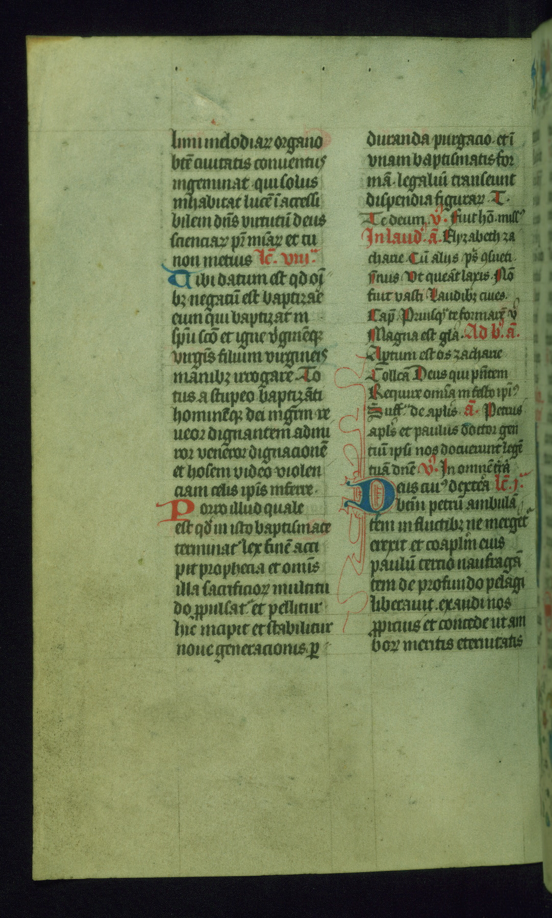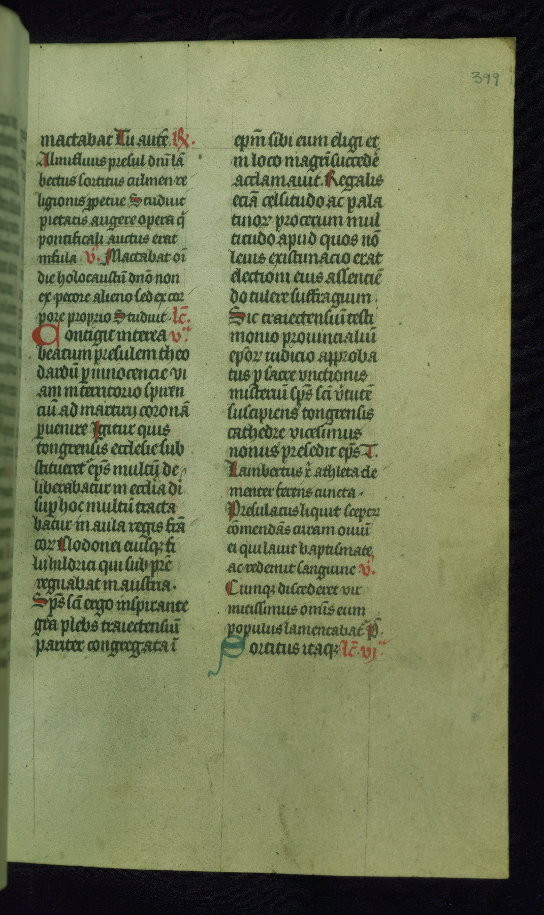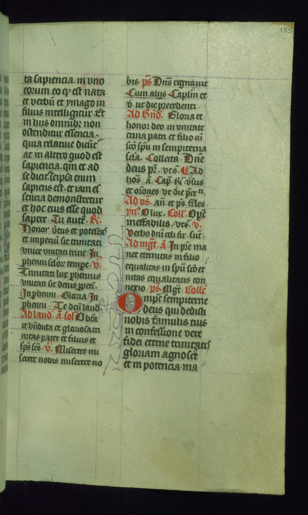 This small breviary, composed of more than 500 folios, is extraordinary for its length, considering it is the summer portion of a two-volume breviary for the use of Liège. The manuscript was completed for ecclesiastical use at the Cathedral of Notre-Dame and St.-Lambert in Liège ca. 1420. This attribution is suggested, for instance, by the petitions to the congregation of this cathedral (fols. 114v-117v), as well as the armorial shield of the family of Surlet de Chokier of Liège represented at the opening of the Psalms. The manuscript has modest, but interesting, decoration with historiated and decorated initials marking the liturgical texts, and occasional angels playing instruments in the margins. The most notable pictorial effect is found in the initials inhabited by transparent figures on rich blue ground. The technique is found, for instance, on fol. 156r with the gold monstrance held by translucent angels for the feast of the Corpus Christi.