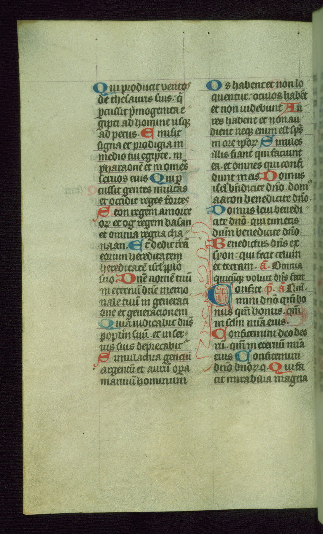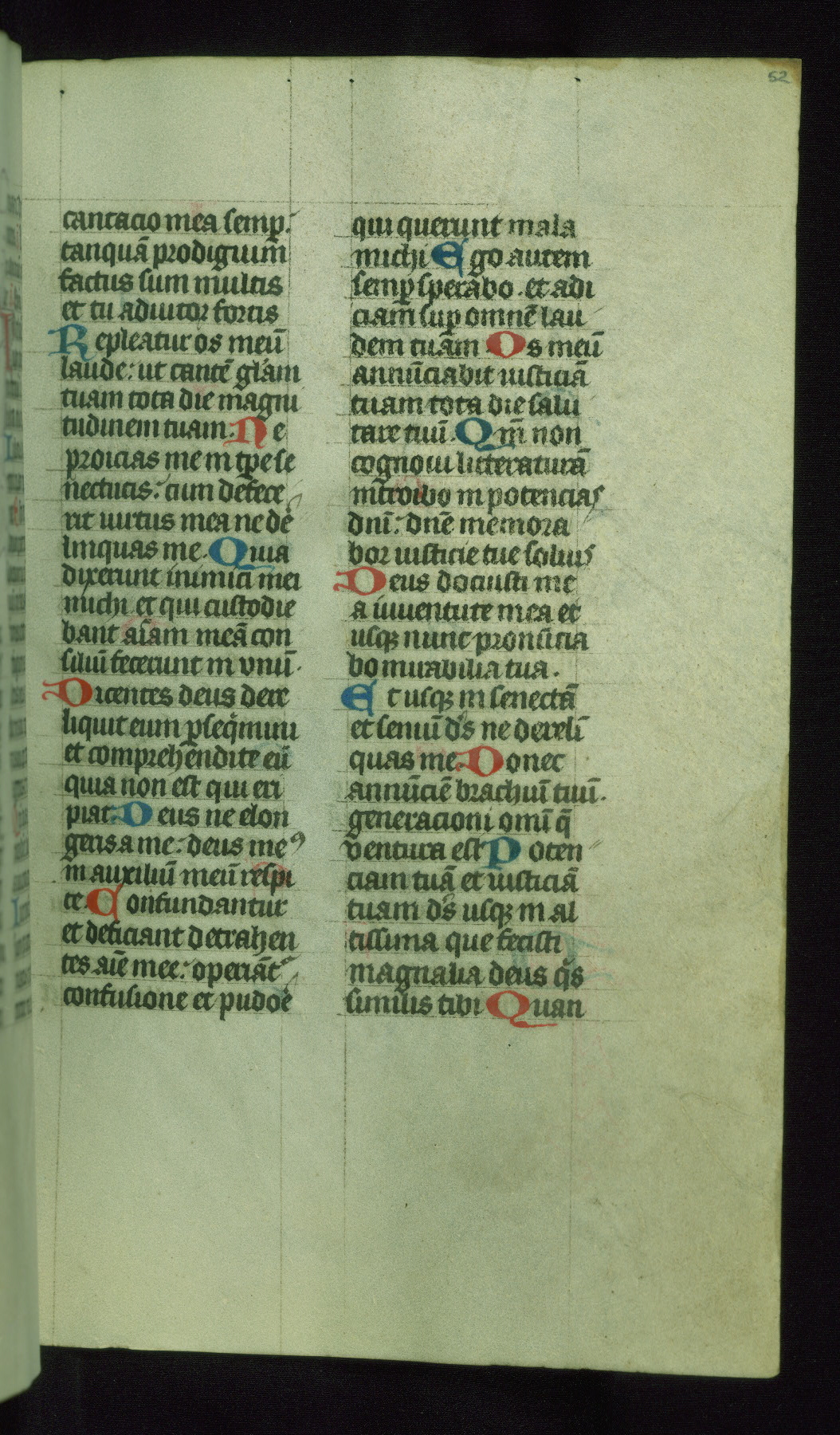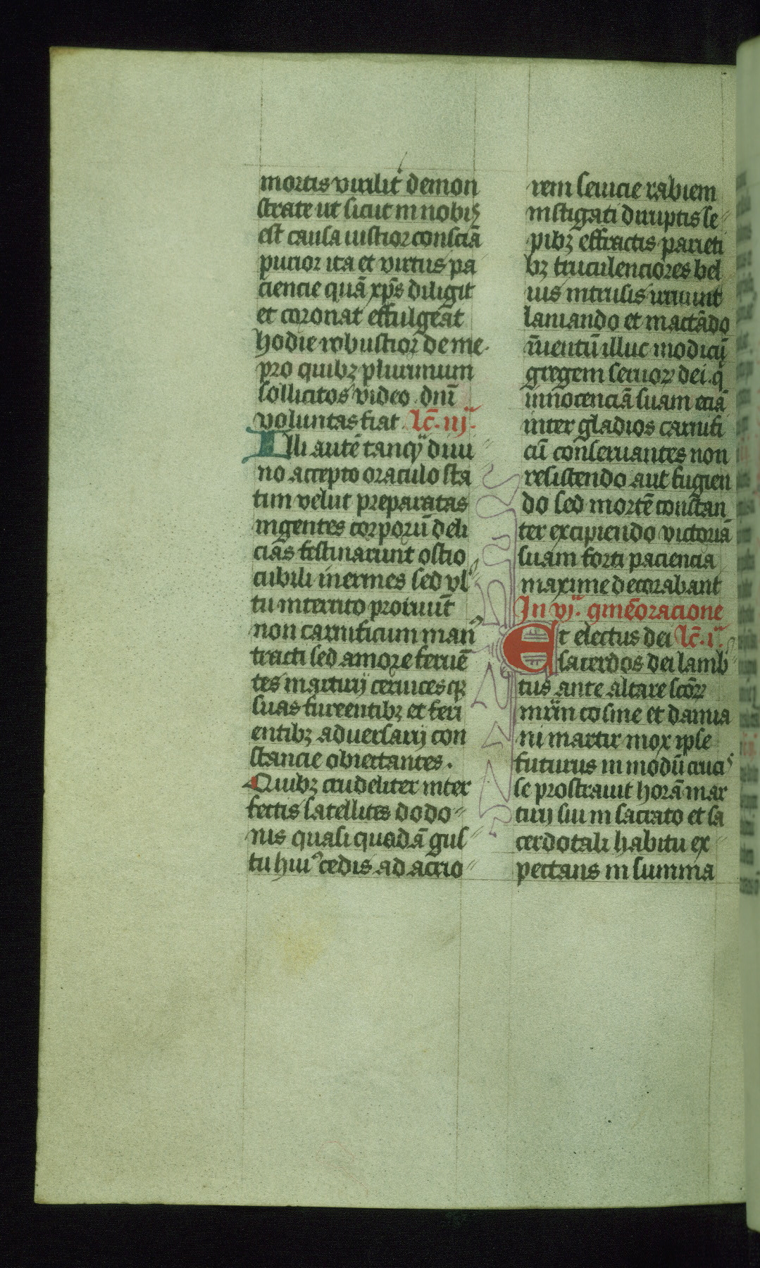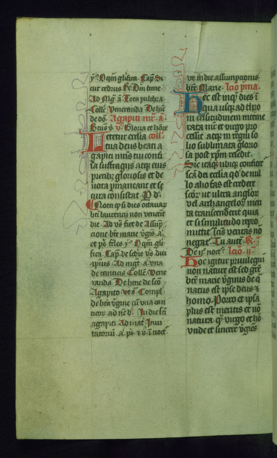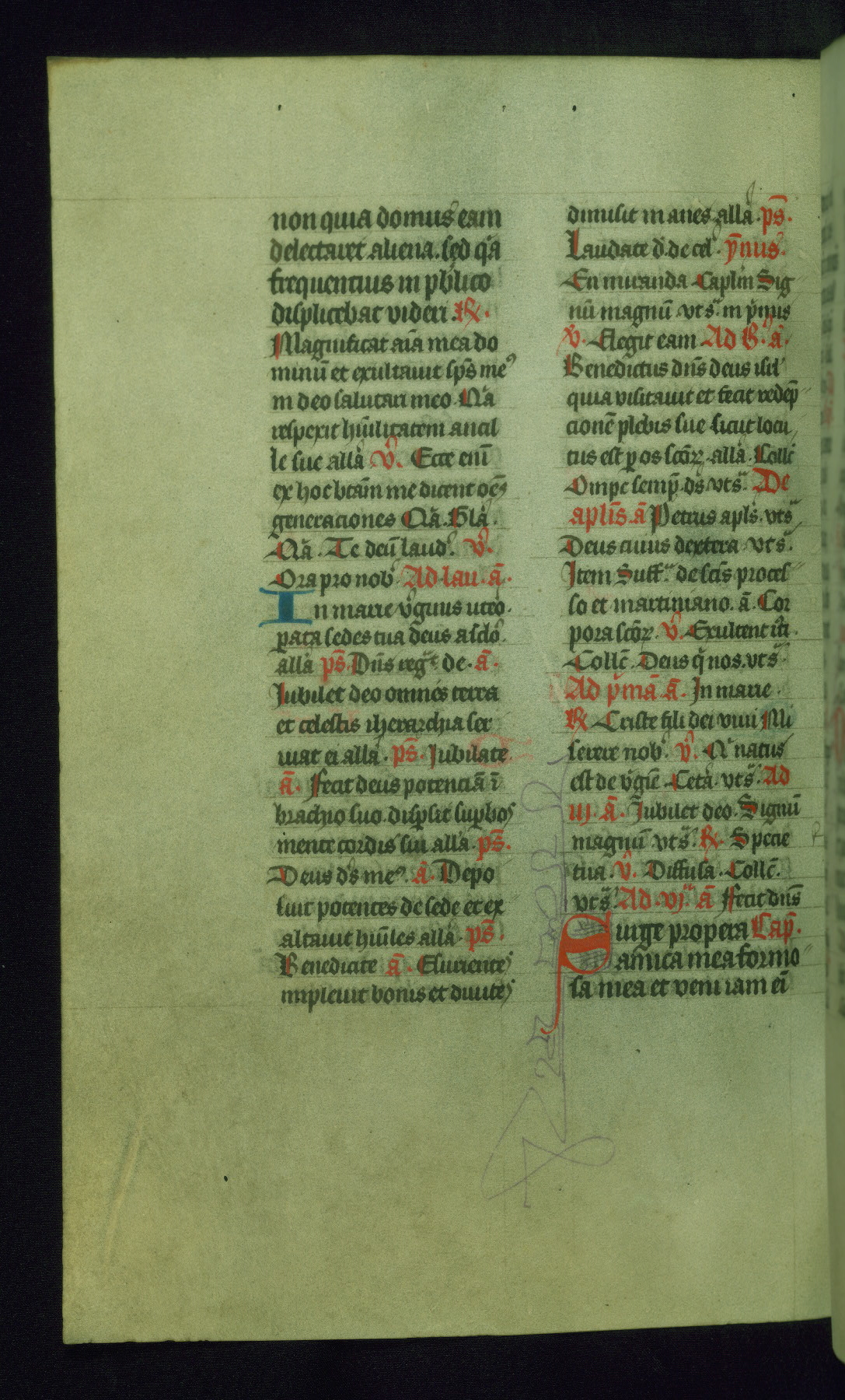 This small breviary, composed of more than 500 folios, is extraordinary for its length, considering it is the summer portion of a two-volume breviary for the use of Liège. The manuscript was completed for ecclesiastical use at the Cathedral of Notre-Dame and St.-Lambert in Liège ca. 1420. This attribution is suggested, for instance, by the petitions to the congregation of this cathedral (fols. 114v-117v), as well as the armorial shield of the family of Surlet de Chokier of Liège represented at the opening of the Psalms. The manuscript has modest, but interesting, decoration with historiated and decorated initials marking the liturgical texts, and occasional angels playing instruments in the margins. The most notable pictorial effect is found in the initials inhabited by transparent figures on rich blue ground. The technique is found, for instance, on fol. 156r with the gold monstrance held by translucent angels for the feast of the Corpus Christi.