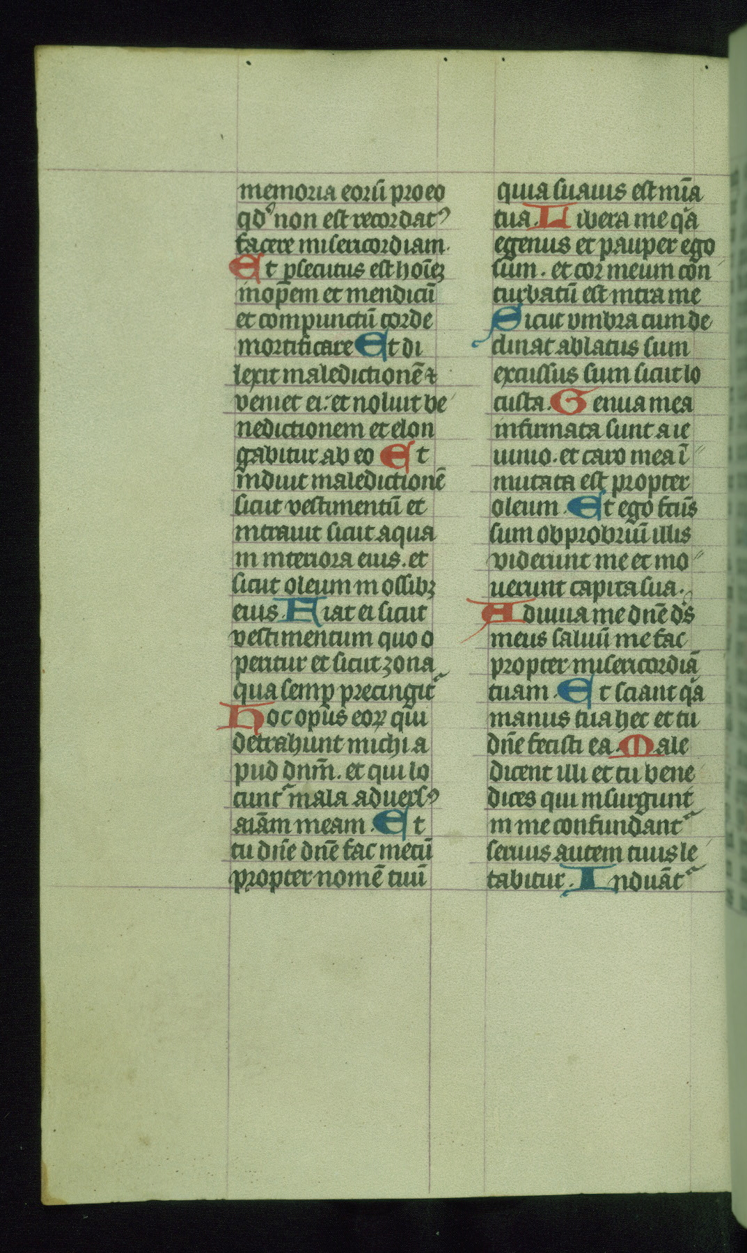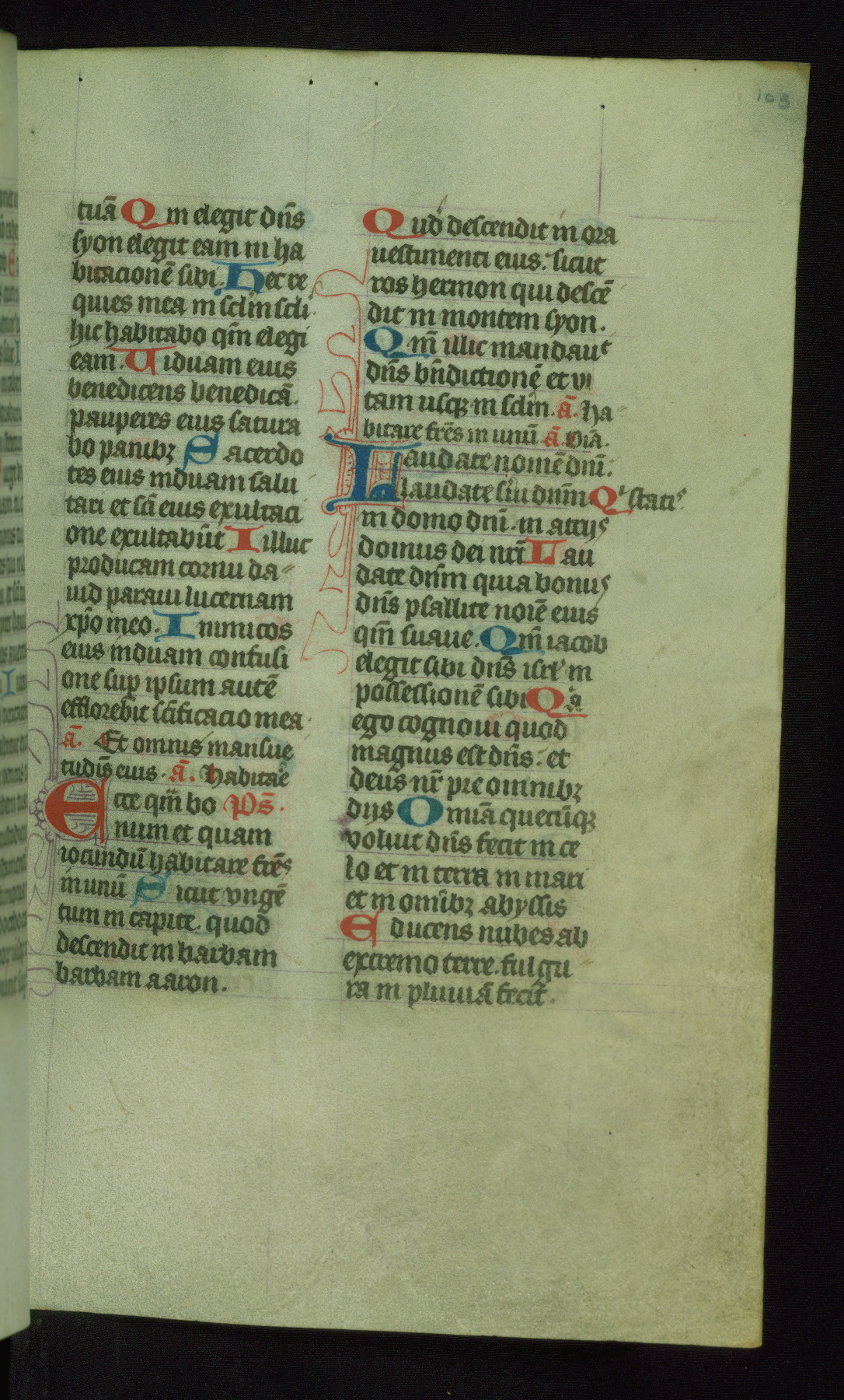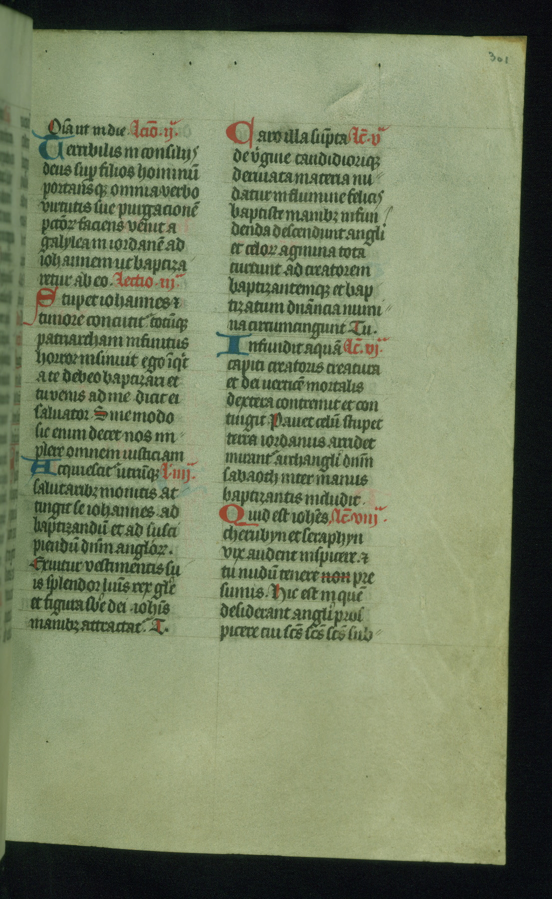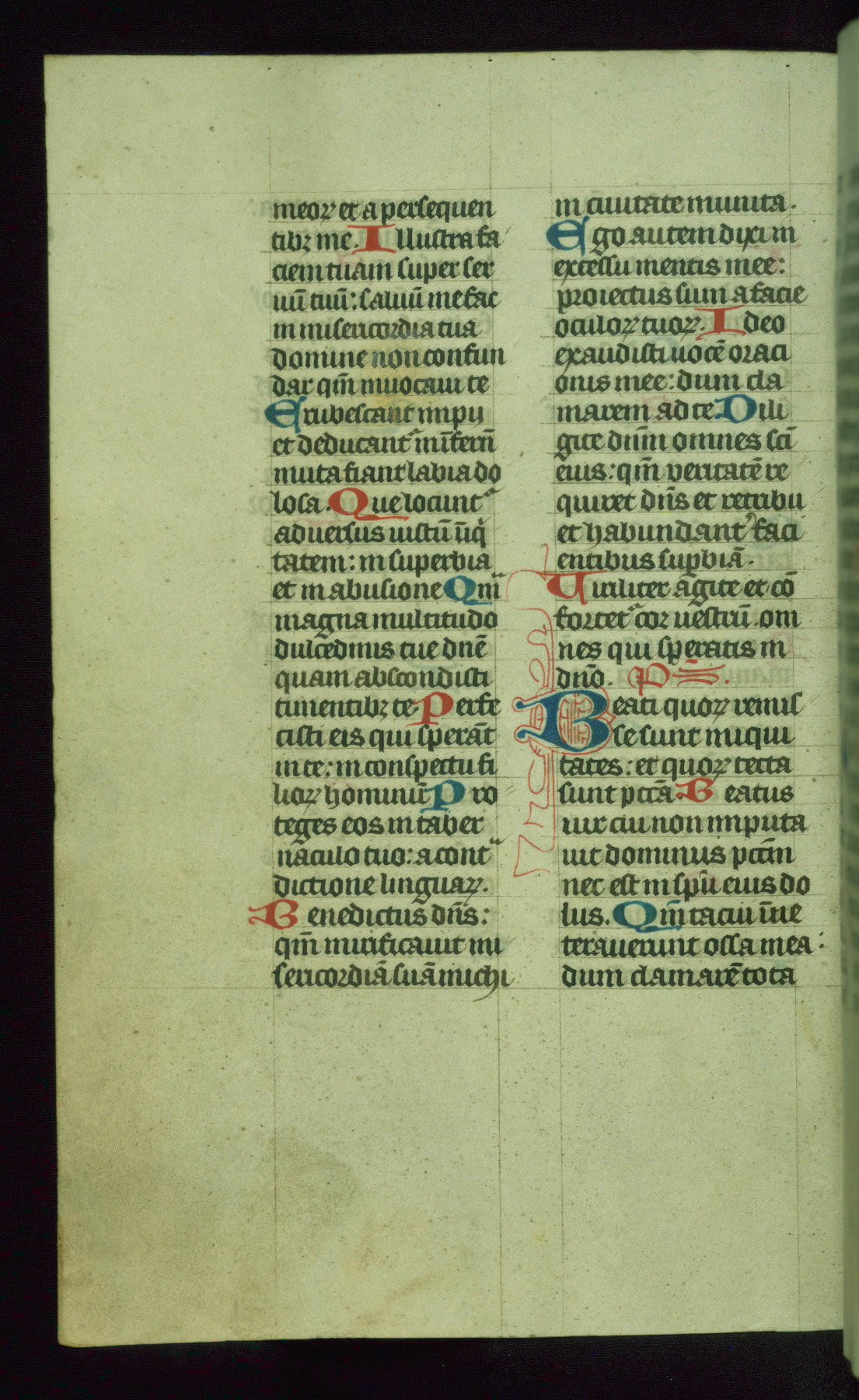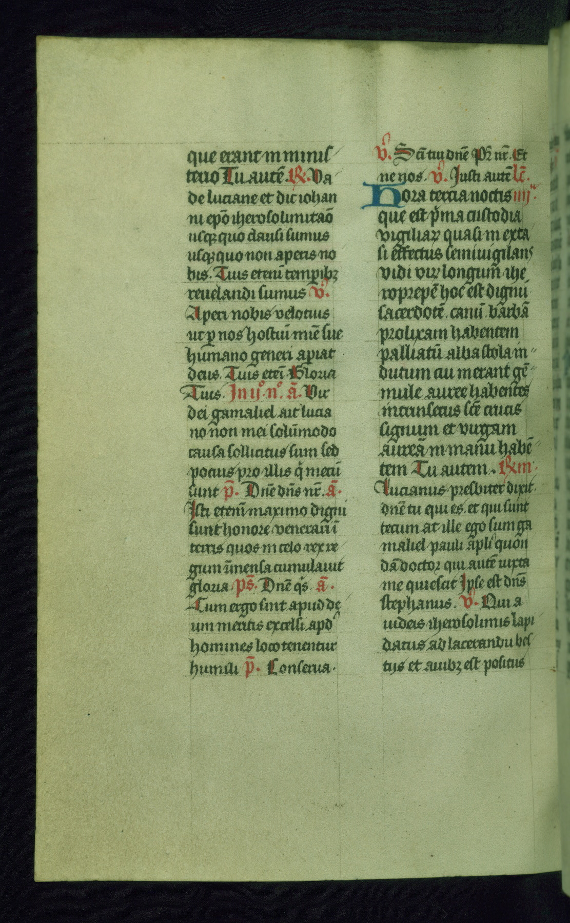 This small breviary, composed of more than 500 folios, is extraordinary for its length, considering it is the summer portion of a two-volume breviary for the use of Liège. The manuscript was completed for ecclesiastical use at the Cathedral of Notre-Dame and St.-Lambert in Liège ca. 1420. This attribution is suggested, for instance, by the petitions to the congregation of this cathedral (fols. 114v-117v), as well as the armorial shield of the family of Surlet de Chokier of Liège represented at the opening of the Psalms. The manuscript has modest, but interesting, decoration with historiated and decorated initials marking the liturgical texts, and occasional angels playing instruments in the margins. The most notable pictorial effect is found in the initials inhabited by transparent figures on rich blue ground. The technique is found, for instance, on fol. 156r with the gold monstrance held by translucent angels for the feast of the Corpus Christi.