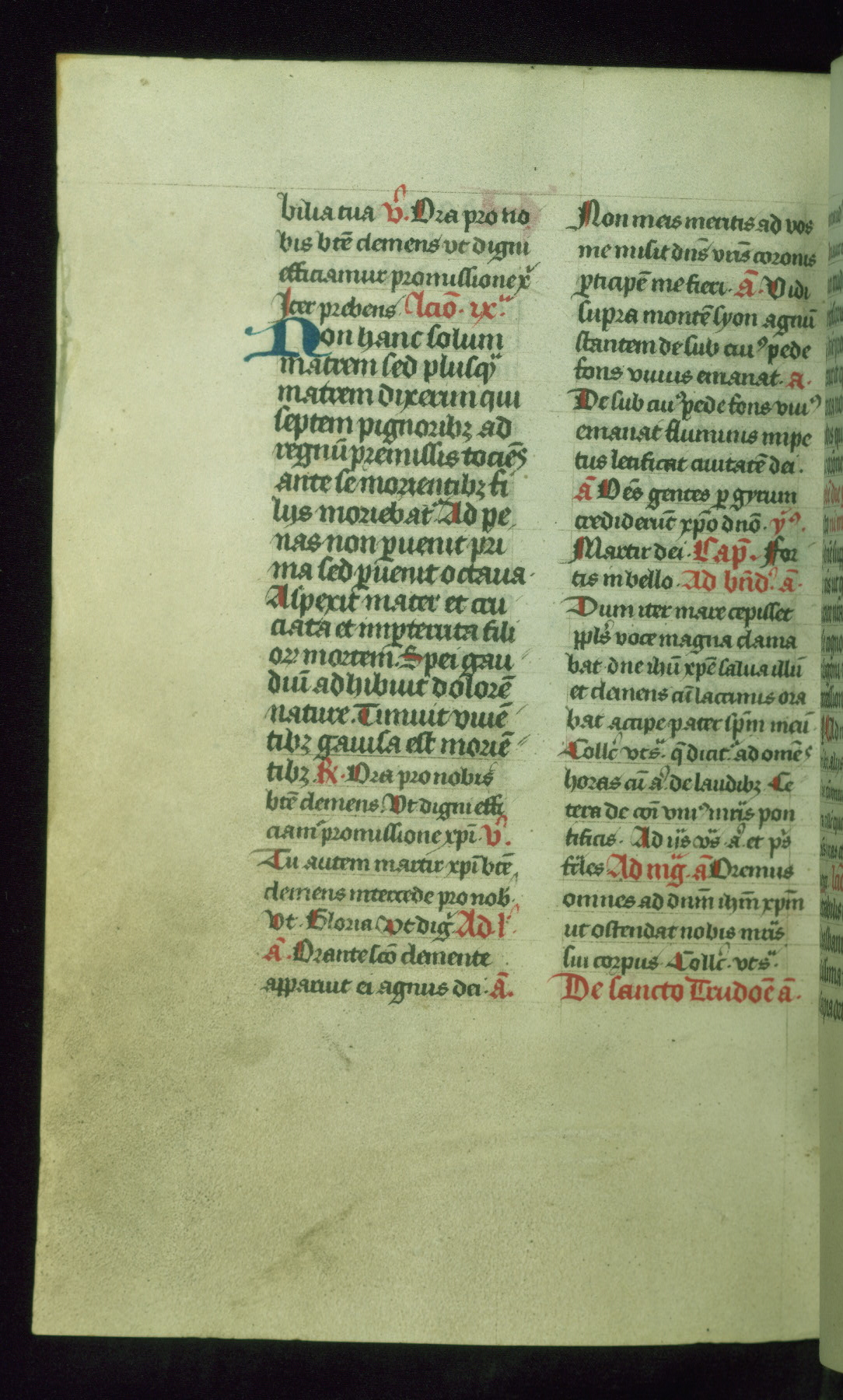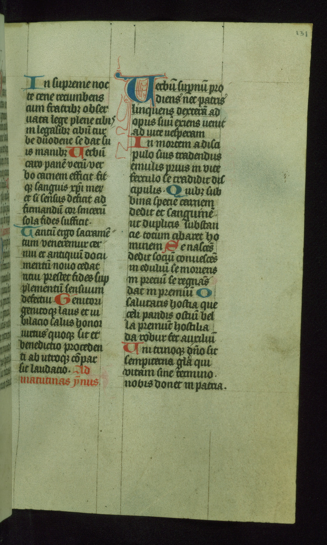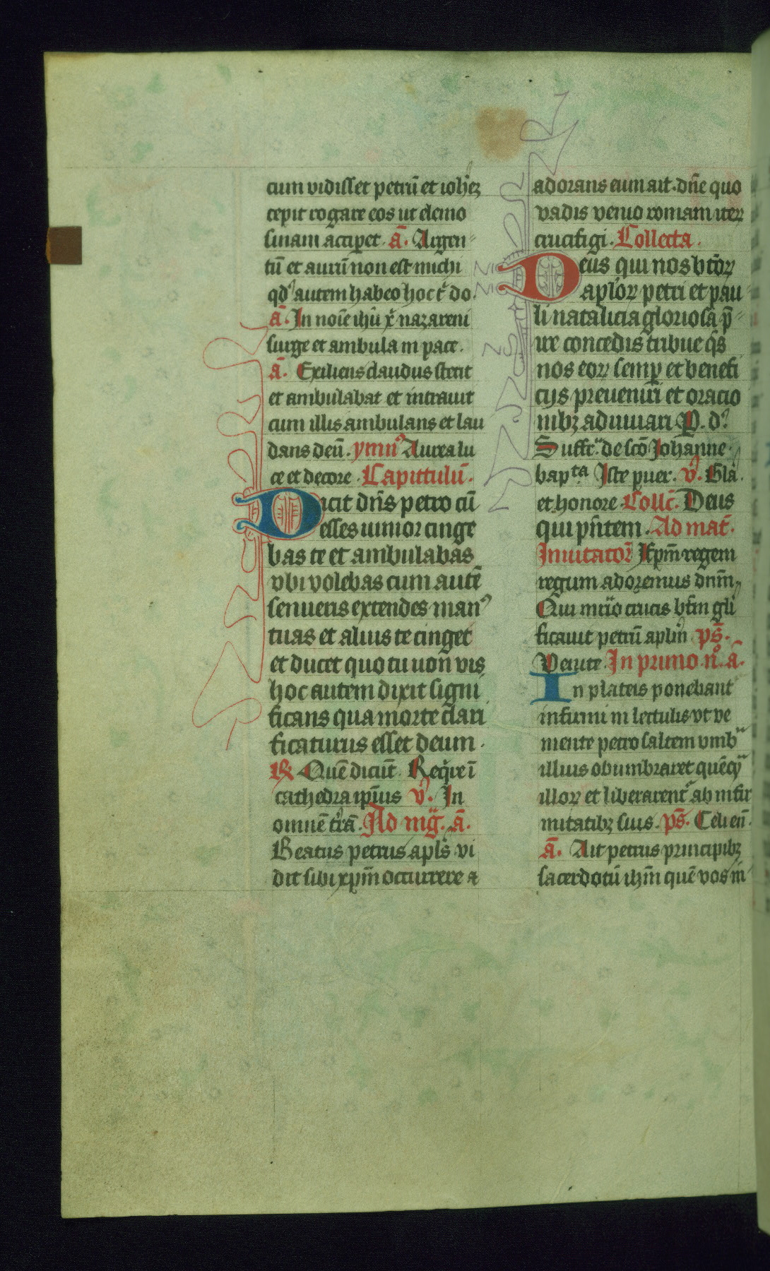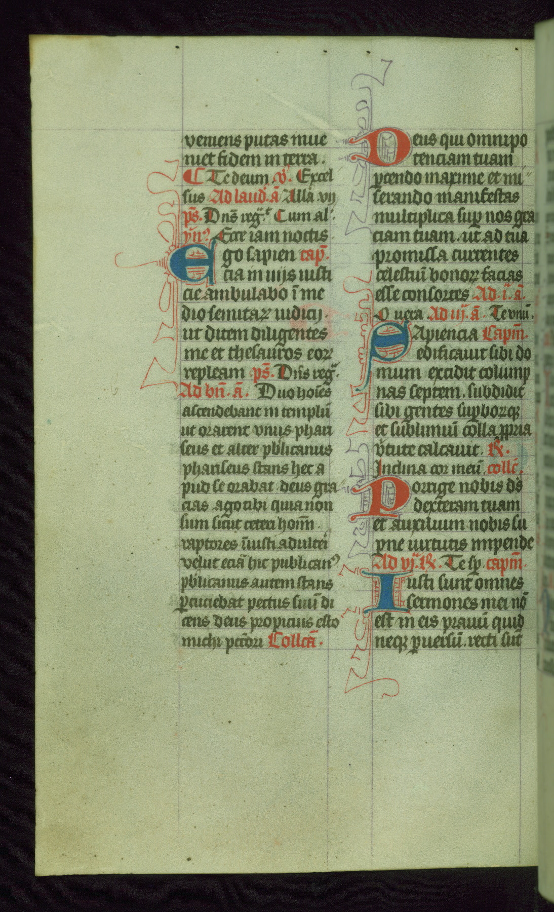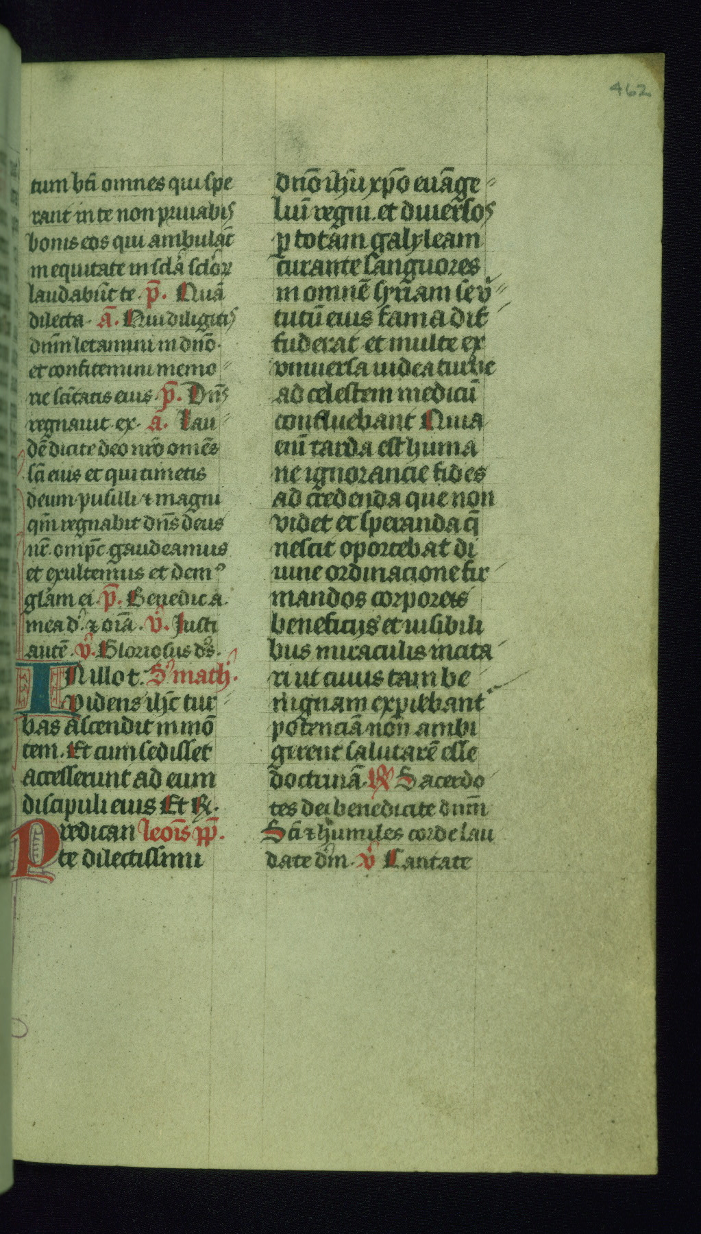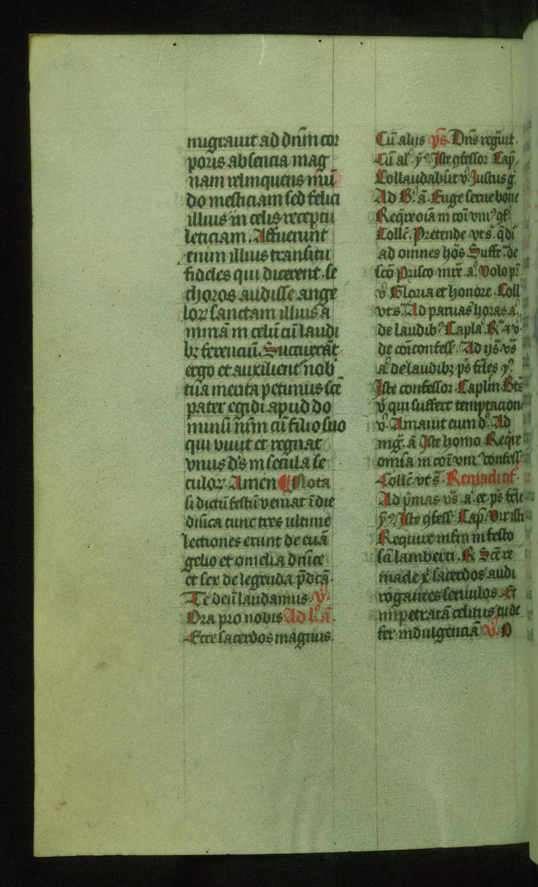 This small breviary, composed of more than 500 folios, is extraordinary for its length, considering it is the summer portion of a two-volume breviary for the use of Liège. The manuscript was completed for ecclesiastical use at the Cathedral of Notre-Dame and St.-Lambert in Liège ca. 1420. This attribution is suggested, for instance, by the petitions to the congregation of this cathedral (fols. 114v-117v), as well as the armorial shield of the family of Surlet de Chokier of Liège represented at the opening of the Psalms. The manuscript has modest, but interesting, decoration with historiated and decorated initials marking the liturgical texts, and occasional angels playing instruments in the margins. The most notable pictorial effect is found in the initials inhabited by transparent figures on rich blue ground. The technique is found, for instance, on fol. 156r with the gold monstrance held by translucent angels for the feast of the Corpus Christi.