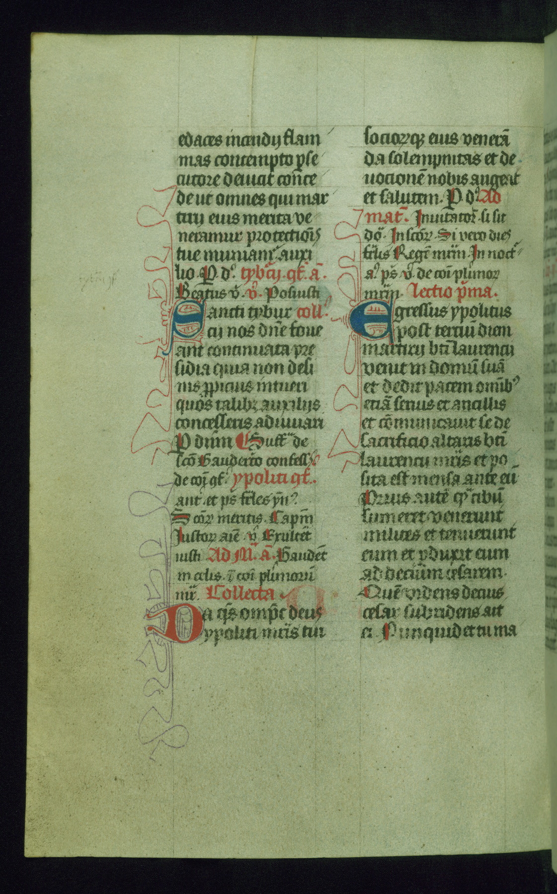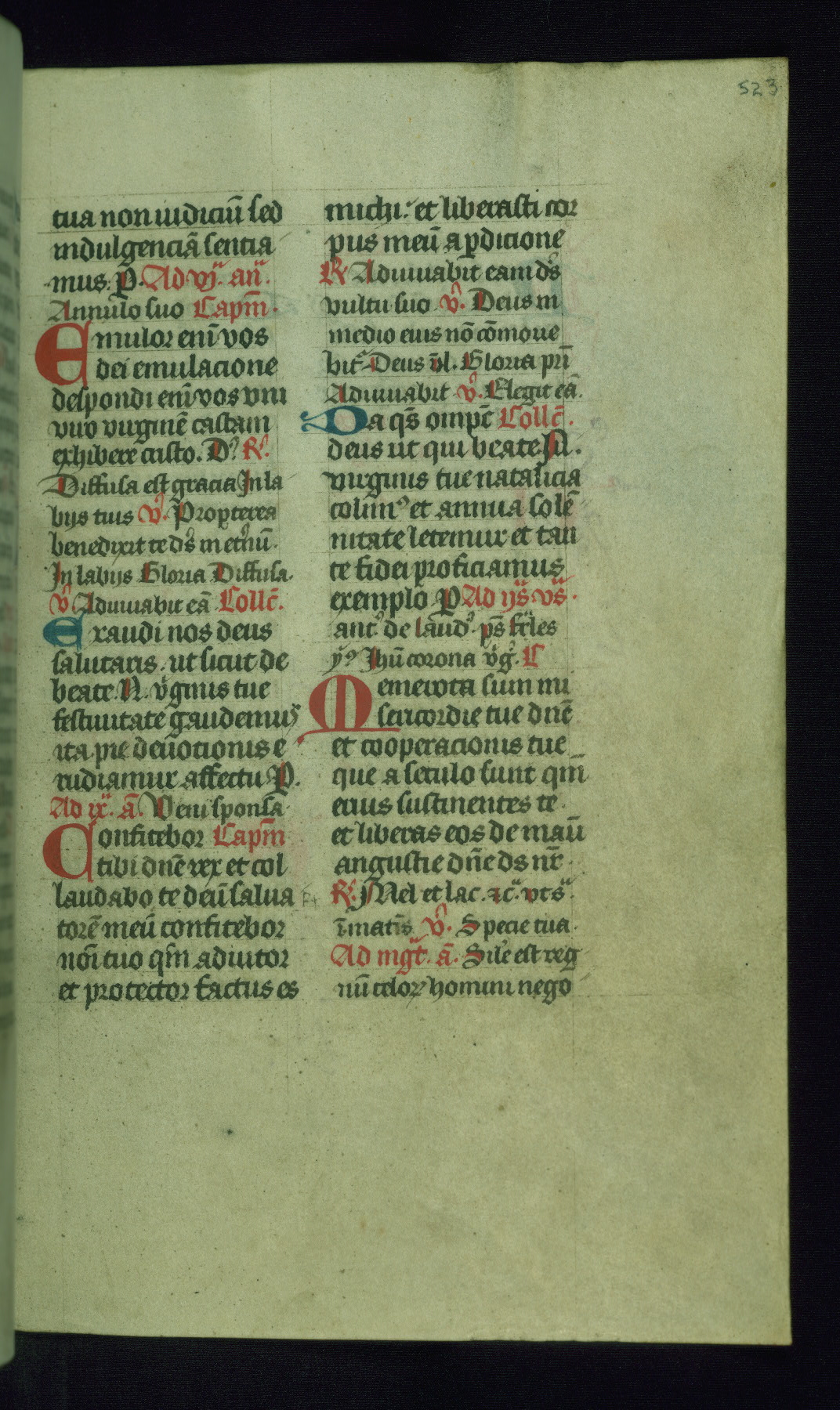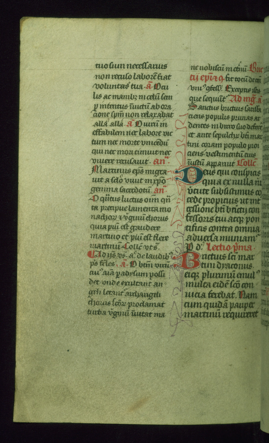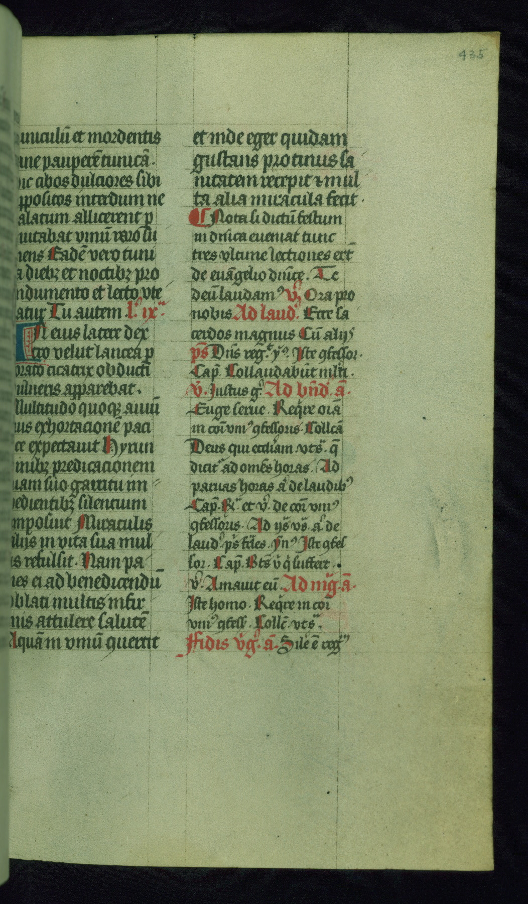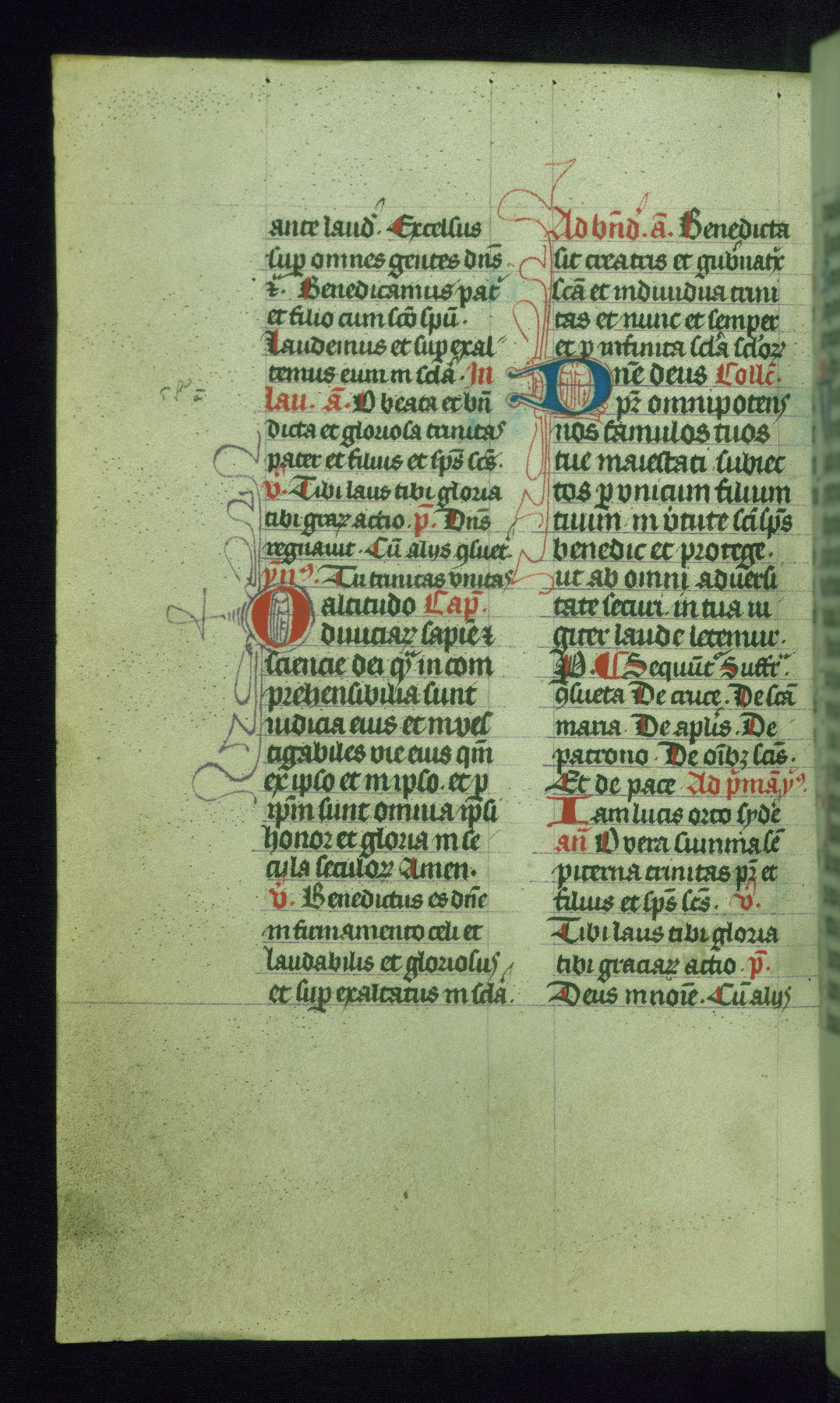 This small breviary, composed of more than 500 folios, is extraordinary for its length, considering it is the summer portion of a two-volume breviary for the use of Liège. The manuscript was completed for ecclesiastical use at the Cathedral of Notre-Dame and St.-Lambert in Liège ca. 1420. This attribution is suggested, for instance, by the petitions to the congregation of this cathedral (fols. 114v-117v), as well as the armorial shield of the family of Surlet de Chokier of Liège represented at the opening of the Psalms. The manuscript has modest, but interesting, decoration with historiated and decorated initials marking the liturgical texts, and occasional angels playing instruments in the margins. The most notable pictorial effect is found in the initials inhabited by transparent figures on rich blue ground. The technique is found, for instance, on fol. 156r with the gold monstrance held by translucent angels for the feast of the Corpus Christi.