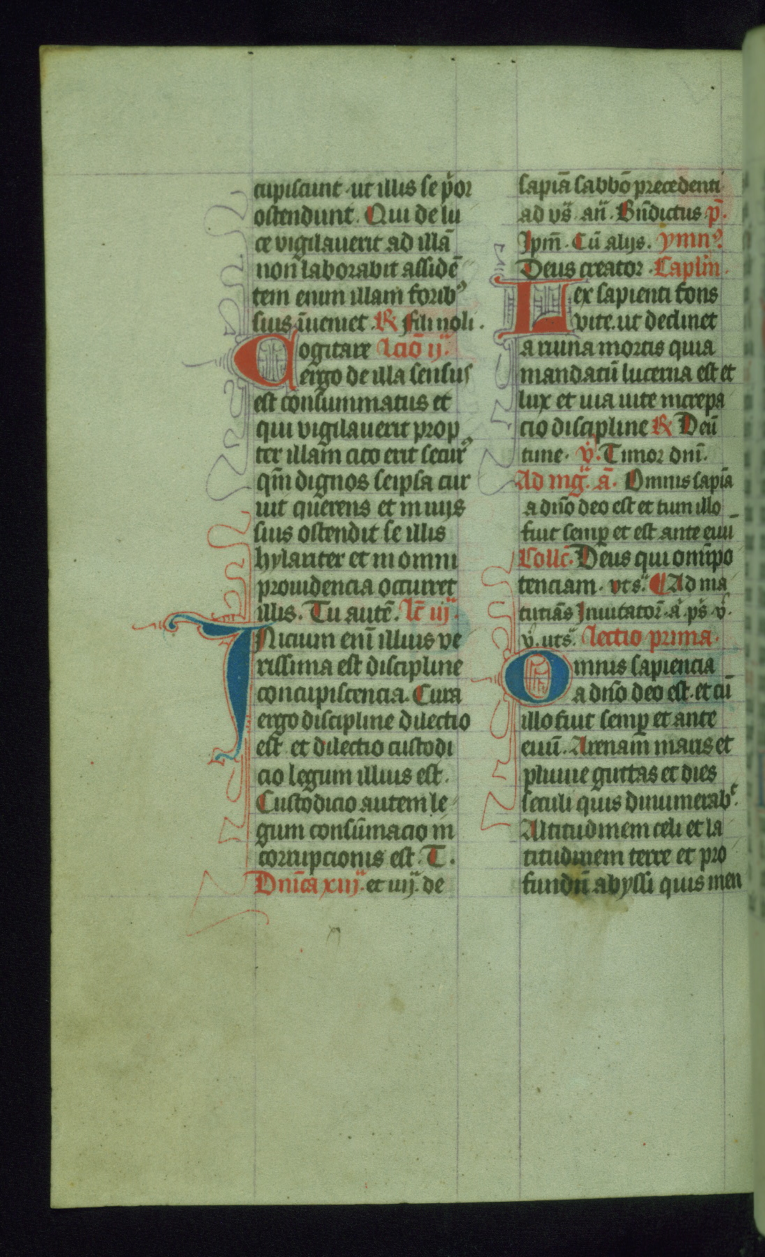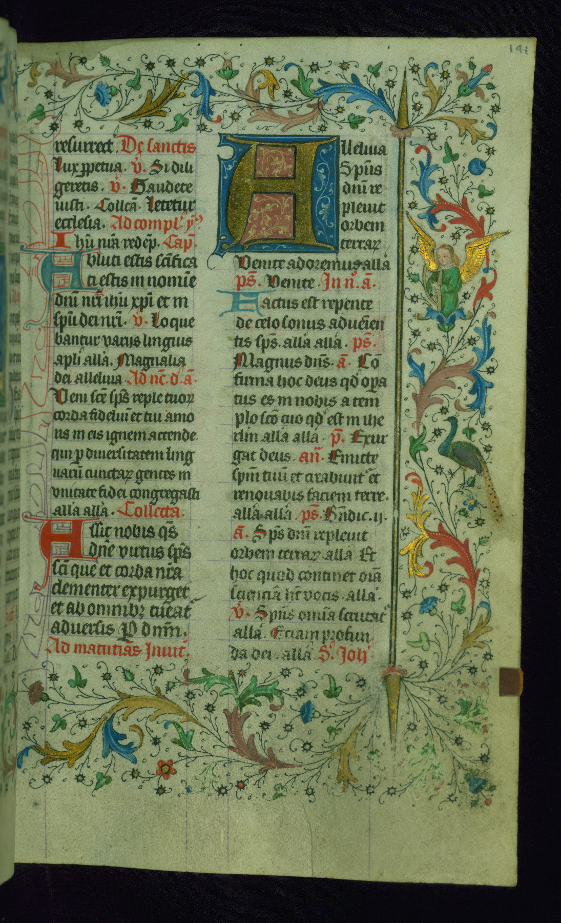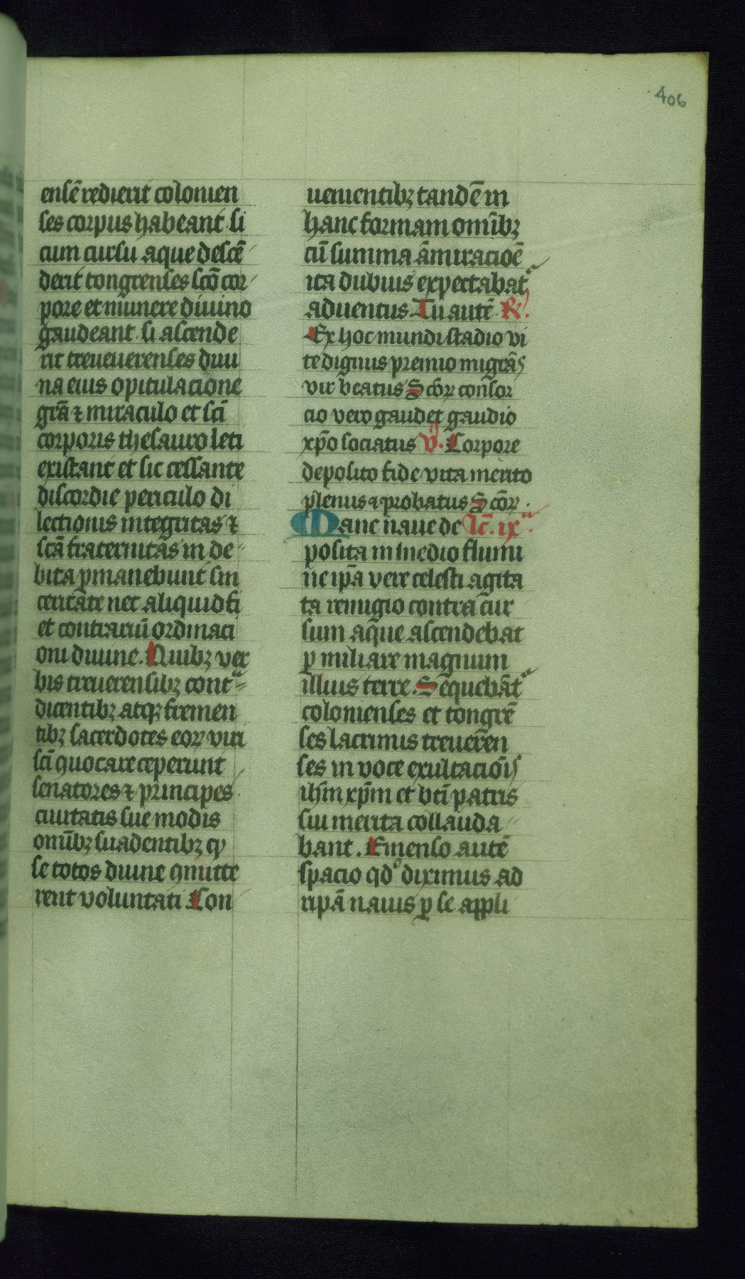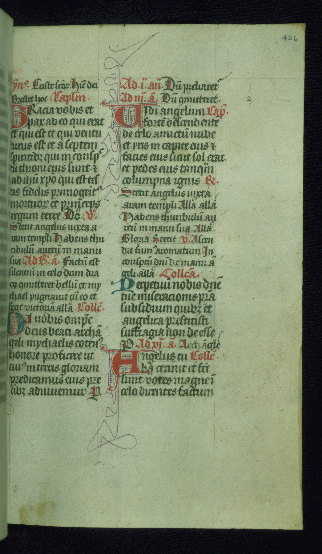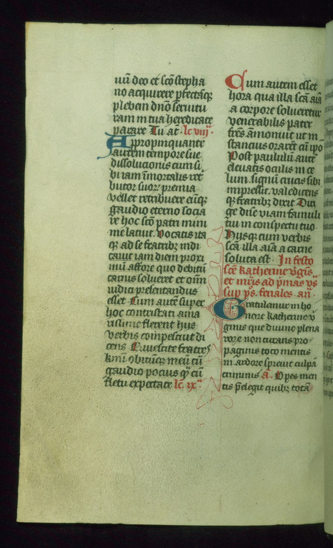 This small breviary, composed of more than 500 folios, is extraordinary for its length, considering it is the summer portion of a two-volume breviary for the use of Liège. The manuscript was completed for ecclesiastical use at the Cathedral of Notre-Dame and St.-Lambert in Liège ca. 1420. This attribution is suggested, for instance, by the petitions to the congregation of this cathedral (fols. 114v-117v), as well as the armorial shield of the family of Surlet de Chokier of Liège represented at the opening of the Psalms. The manuscript has modest, but interesting, decoration with historiated and decorated initials marking the liturgical texts, and occasional angels playing instruments in the margins. The most notable pictorial effect is found in the initials inhabited by transparent figures on rich blue ground. The technique is found, for instance, on fol. 156r with the gold monstrance held by translucent angels for the feast of the Corpus Christi.