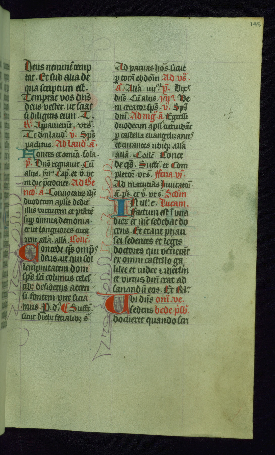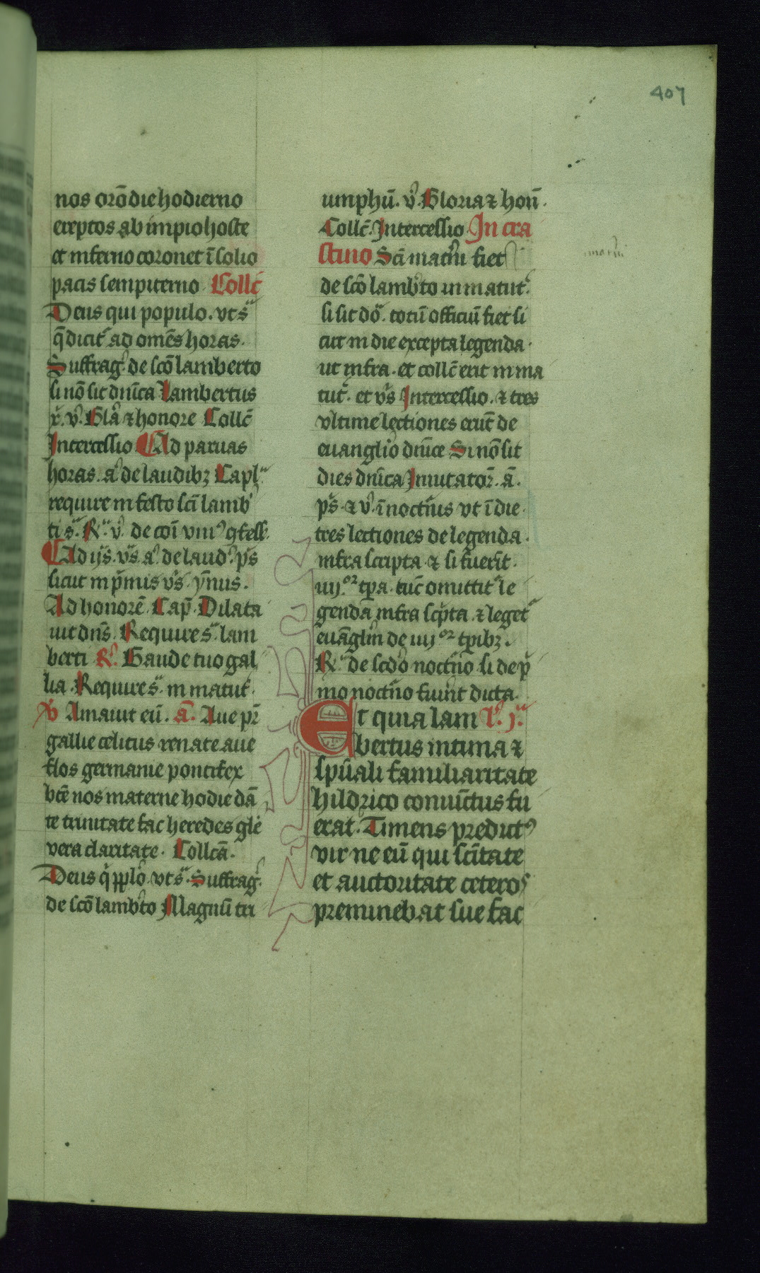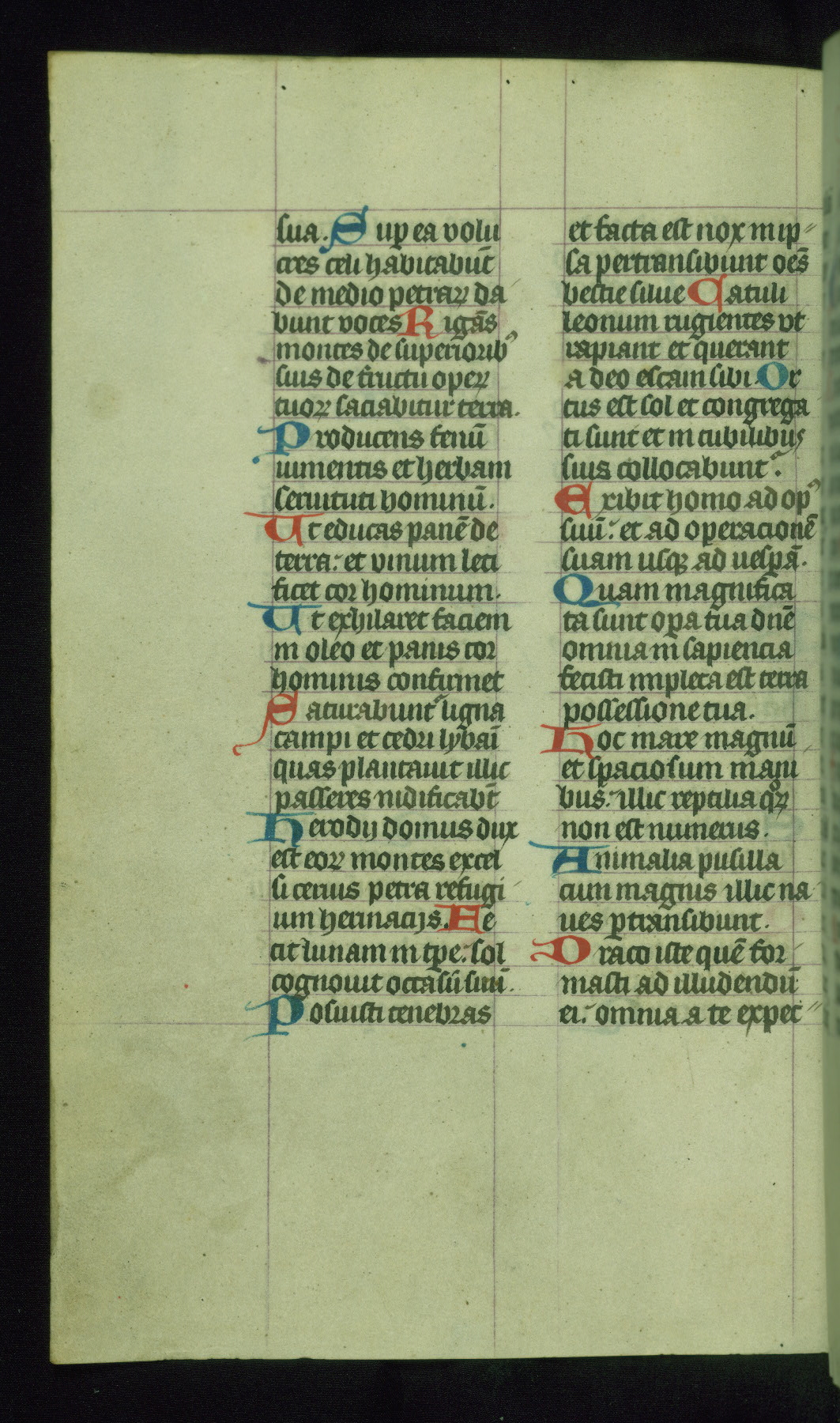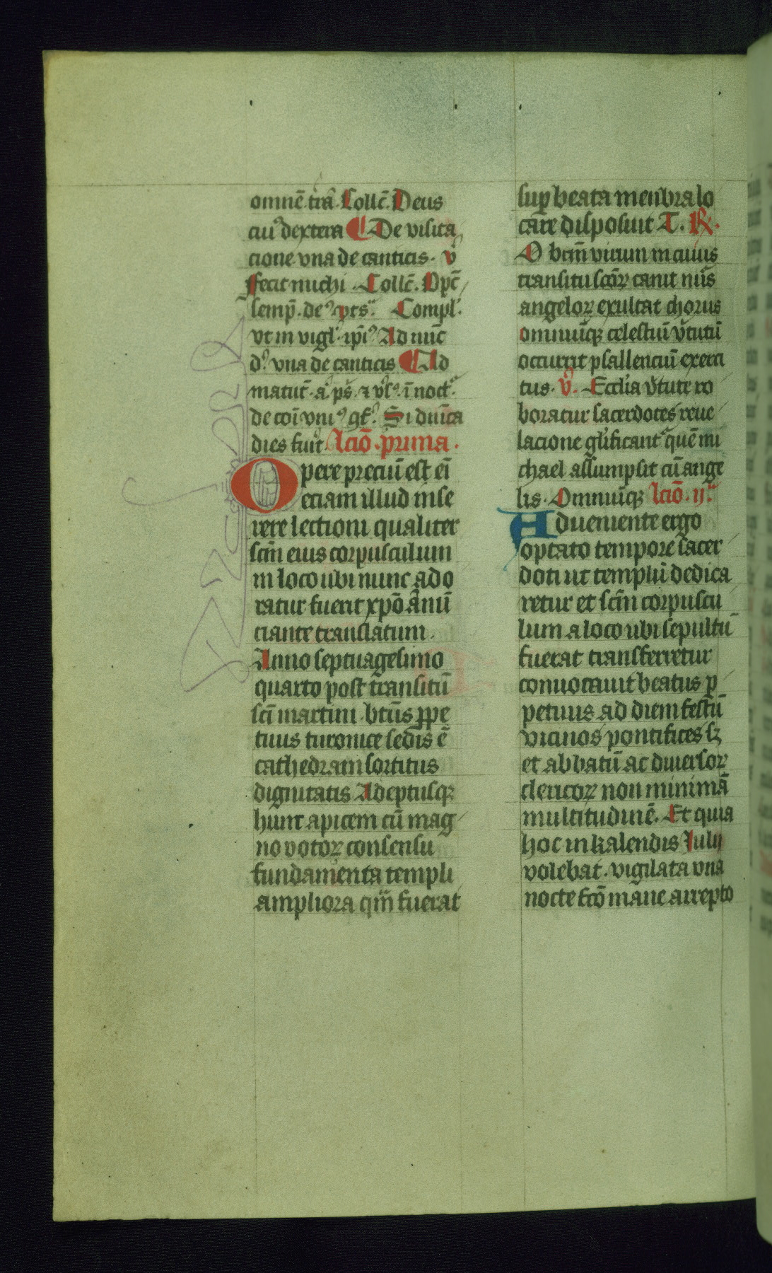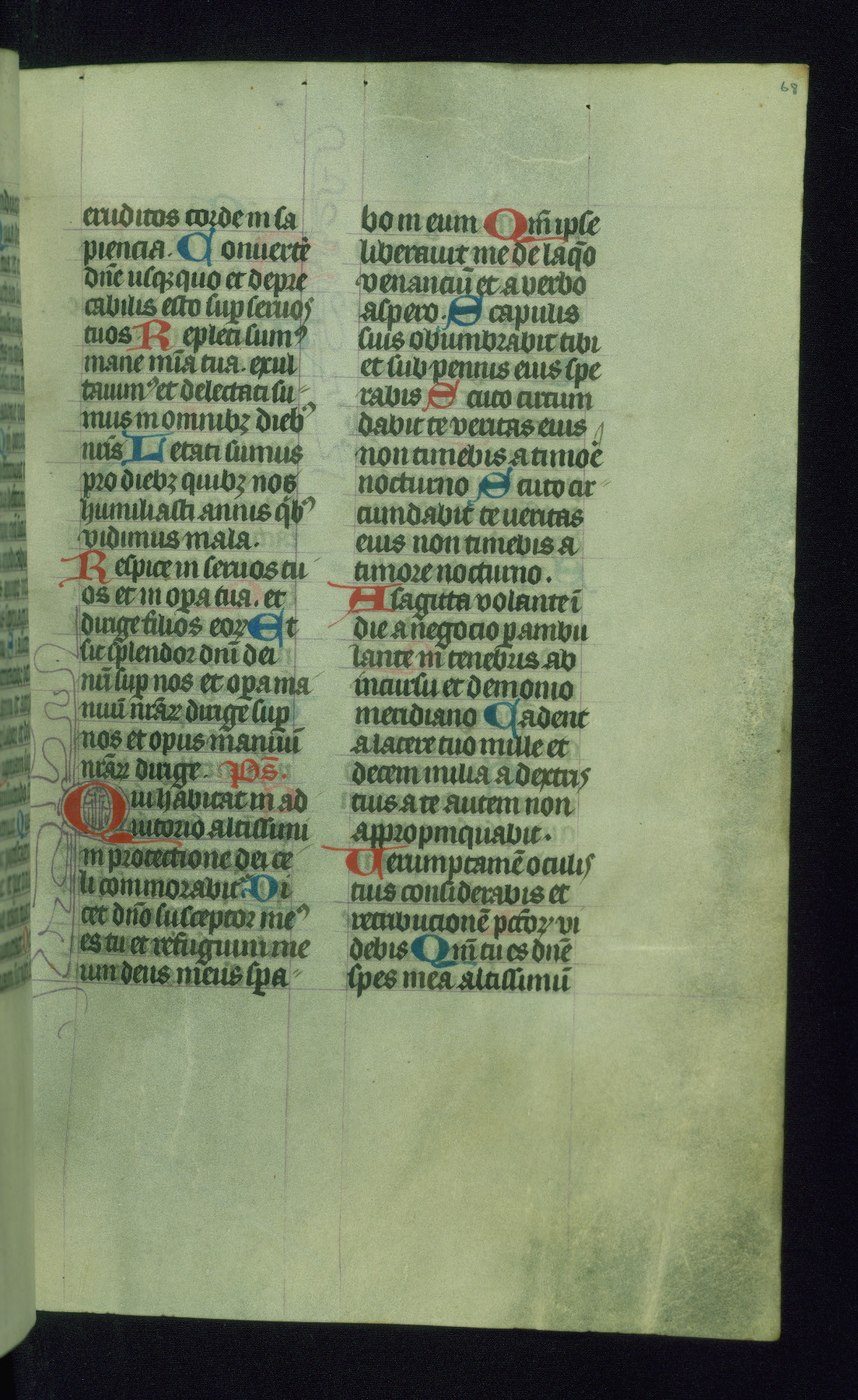 This small breviary, composed of more than 500 folios, is extraordinary for its length, considering it is the summer portion of a two-volume breviary for the use of Liège. The manuscript was completed for ecclesiastical use at the Cathedral of Notre-Dame and St.-Lambert in Liège ca. 1420. This attribution is suggested, for instance, by the petitions to the congregation of this cathedral (fols. 114v-117v), as well as the armorial shield of the family of Surlet de Chokier of Liège represented at the opening of the Psalms. The manuscript has modest, but interesting, decoration with historiated and decorated initials marking the liturgical texts, and occasional angels playing instruments in the margins. The most notable pictorial effect is found in the initials inhabited by transparent figures on rich blue ground. The technique is found, for instance, on fol. 156r with the gold monstrance held by translucent angels for the feast of the Corpus Christi.