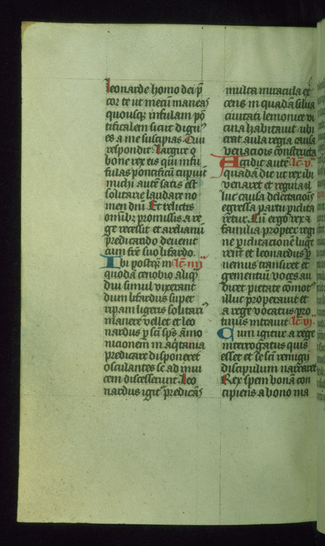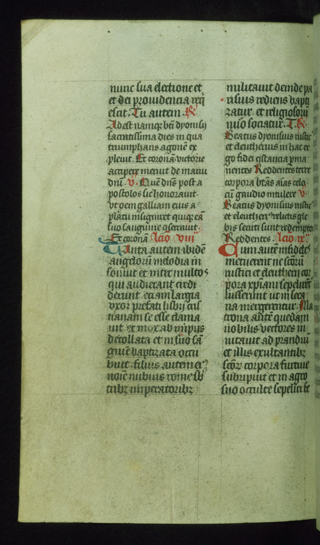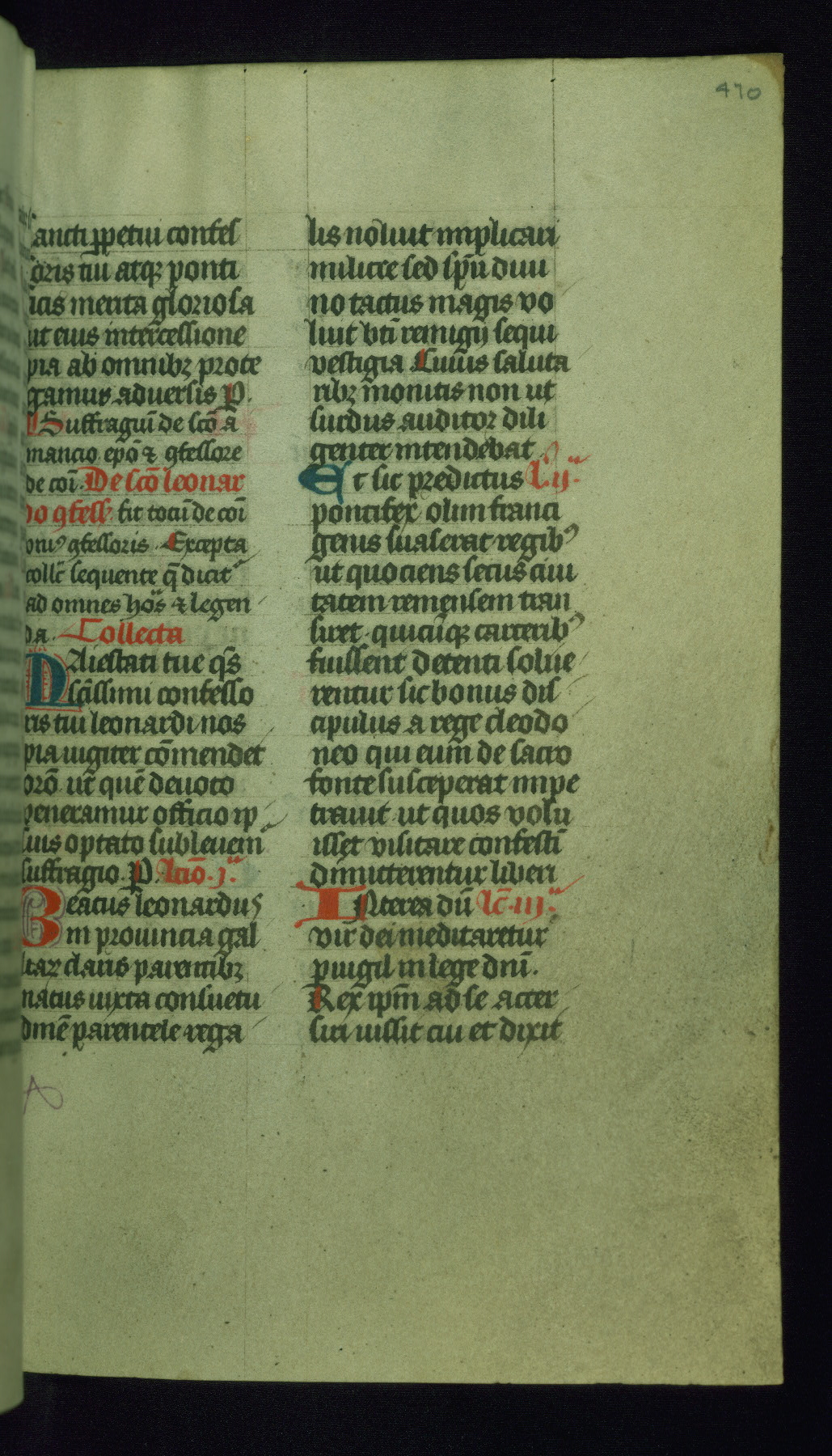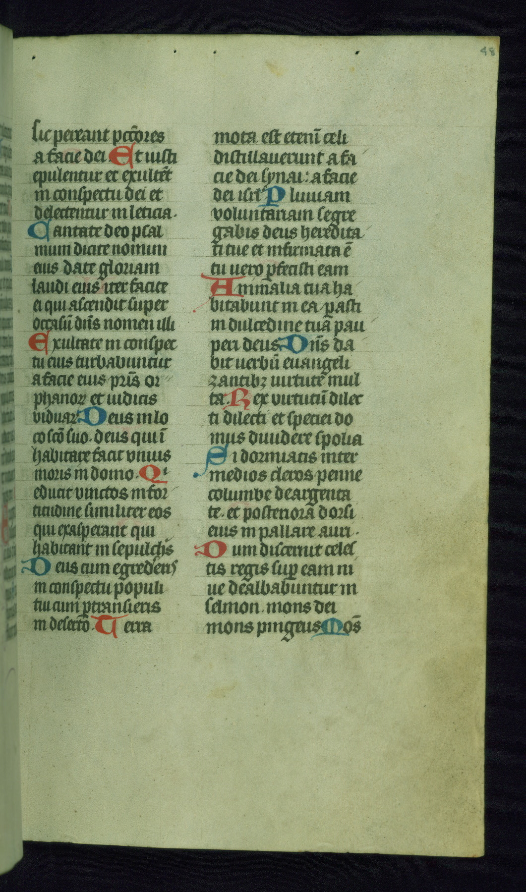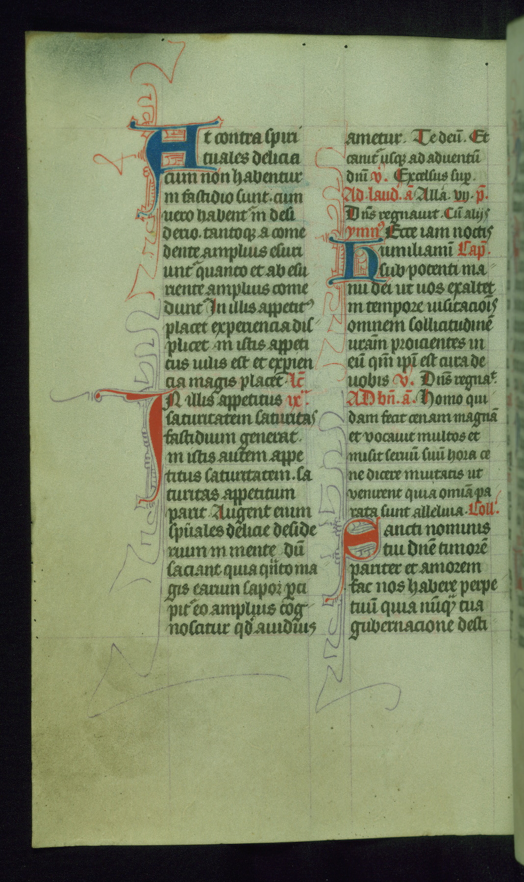 This small breviary, composed of more than 500 folios, is extraordinary for its length, considering it is the summer portion of a two-volume breviary for the use of Liège. The manuscript was completed for ecclesiastical use at the Cathedral of Notre-Dame and St.-Lambert in Liège ca. 1420. This attribution is suggested, for instance, by the petitions to the congregation of this cathedral (fols. 114v-117v), as well as the armorial shield of the family of Surlet de Chokier of Liège represented at the opening of the Psalms. The manuscript has modest, but interesting, decoration with historiated and decorated initials marking the liturgical texts, and occasional angels playing instruments in the margins. The most notable pictorial effect is found in the initials inhabited by transparent figures on rich blue ground. The technique is found, for instance, on fol. 156r with the gold monstrance held by translucent angels for the feast of the Corpus Christi.