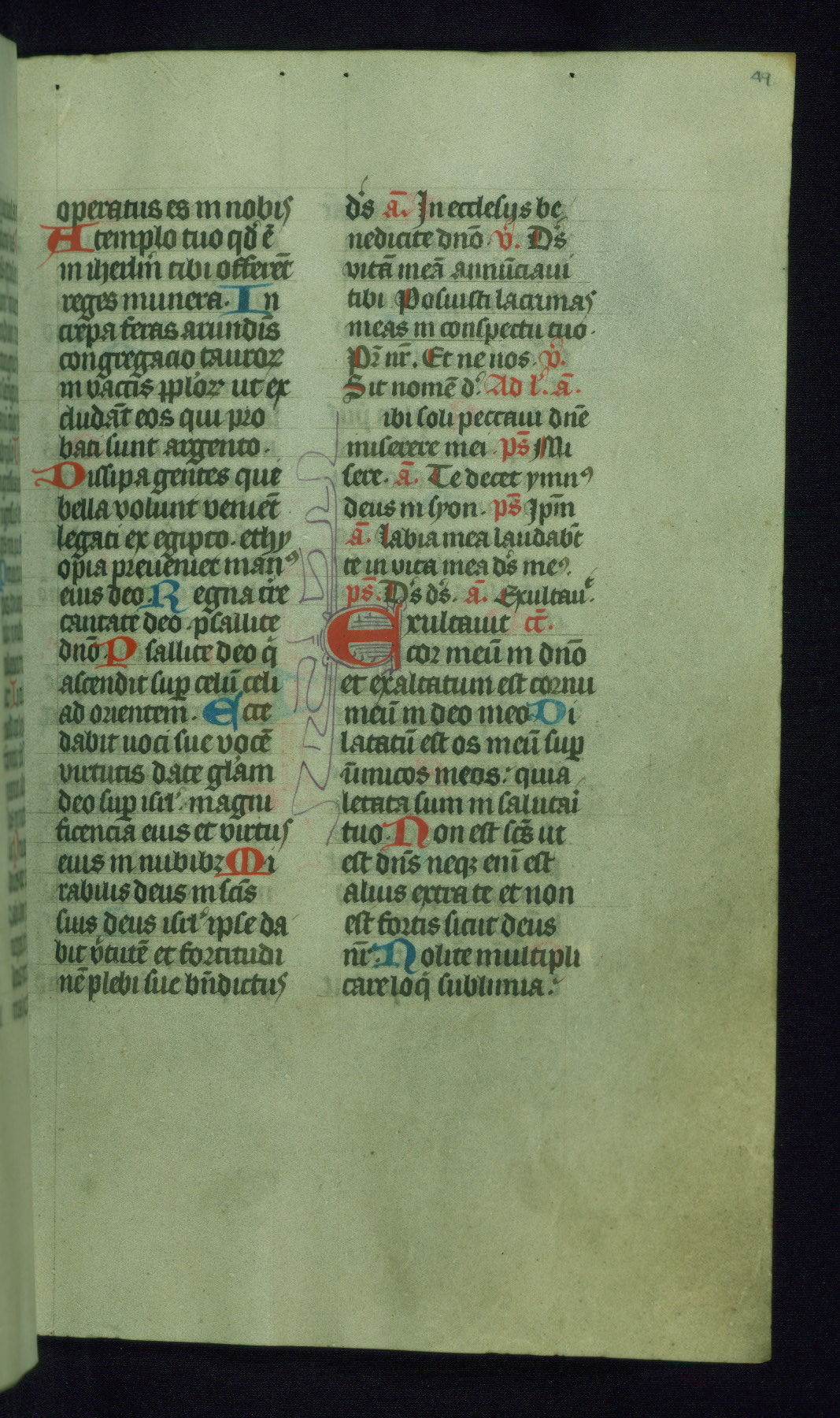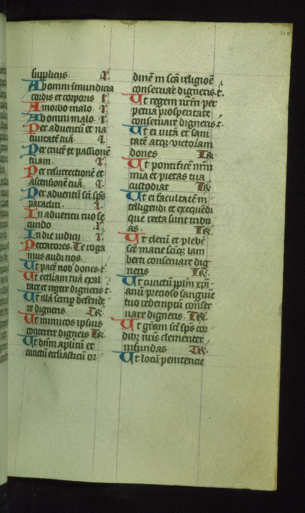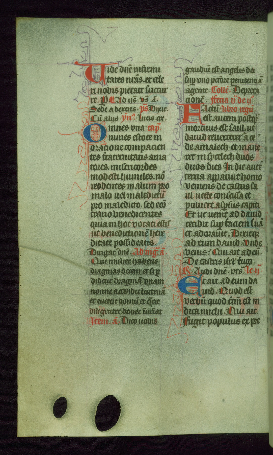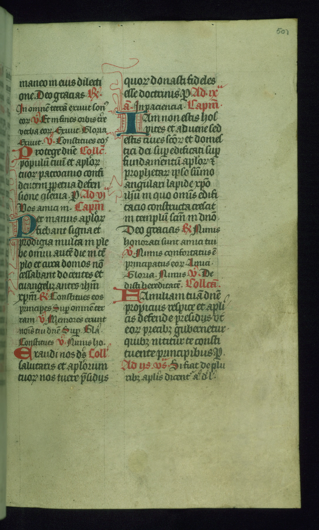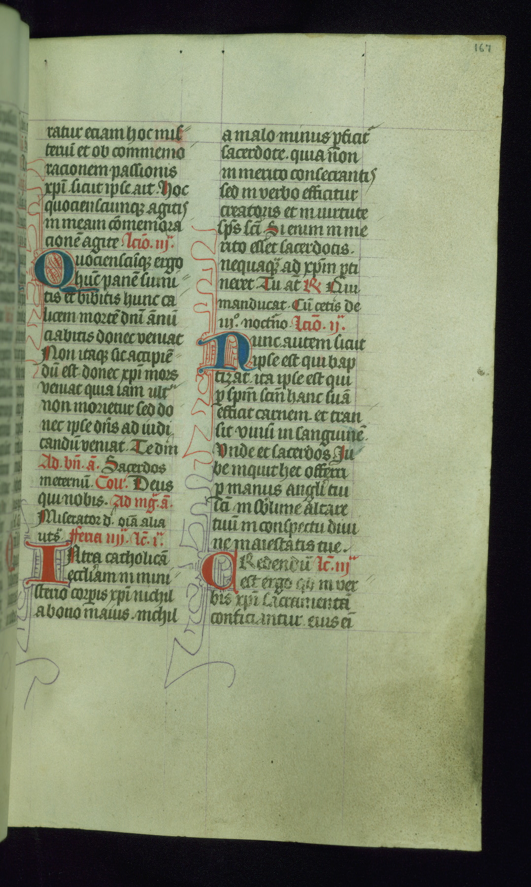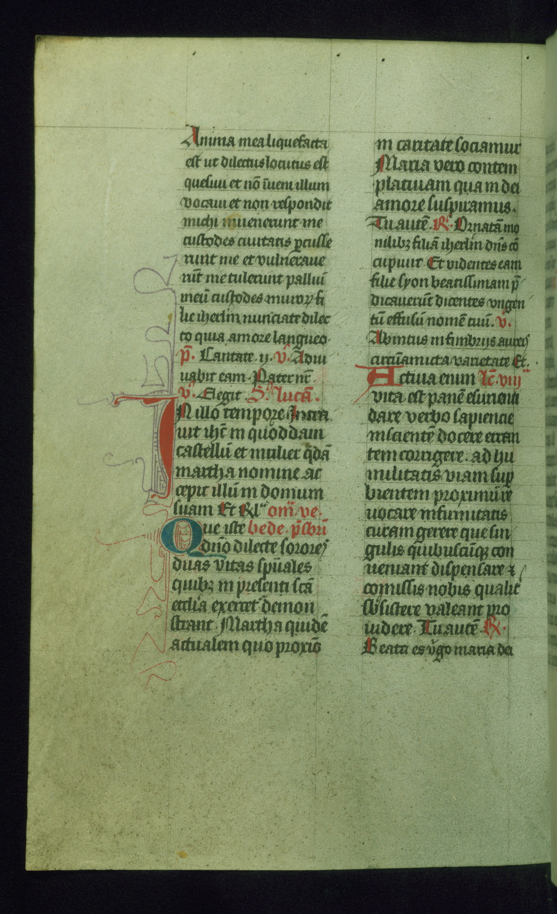 This small breviary, composed of more than 500 folios, is extraordinary for its length, considering it is the summer portion of a two-volume breviary for the use of Liège. The manuscript was completed for ecclesiastical use at the Cathedral of Notre-Dame and St.-Lambert in Liège ca. 1420. This attribution is suggested, for instance, by the petitions to the congregation of this cathedral (fols. 114v-117v), as well as the armorial shield of the family of Surlet de Chokier of Liège represented at the opening of the Psalms. The manuscript has modest, but interesting, decoration with historiated and decorated initials marking the liturgical texts, and occasional angels playing instruments in the margins. The most notable pictorial effect is found in the initials inhabited by transparent figures on rich blue ground. The technique is found, for instance, on fol. 156r with the gold monstrance held by translucent angels for the feast of the Corpus Christi.