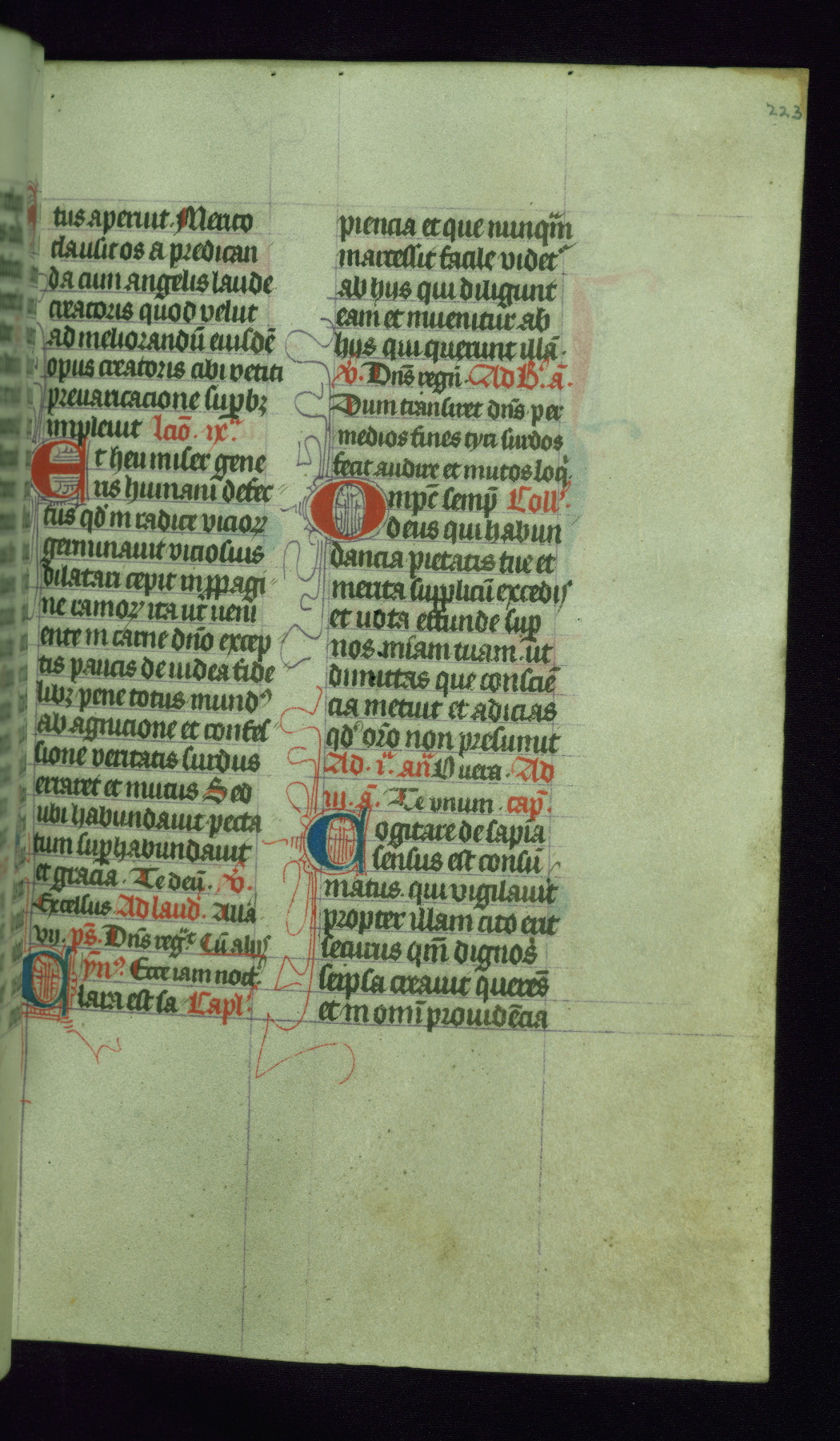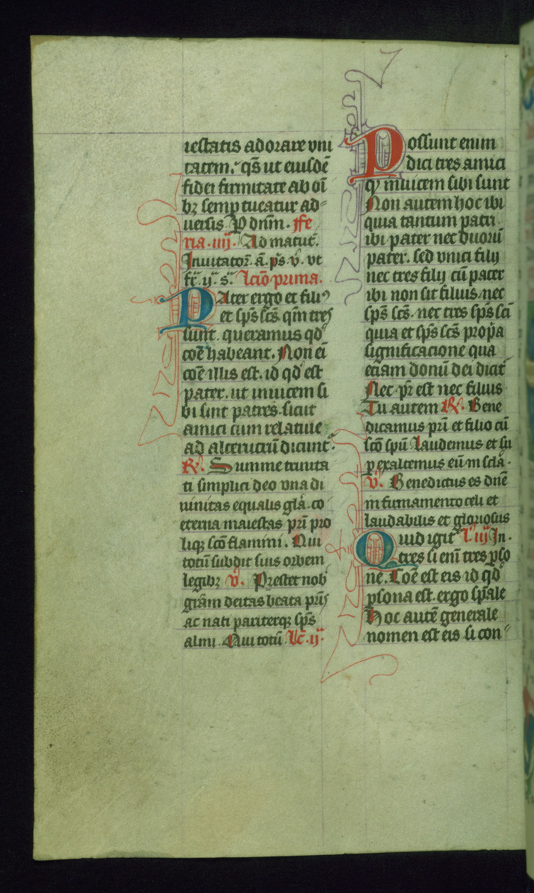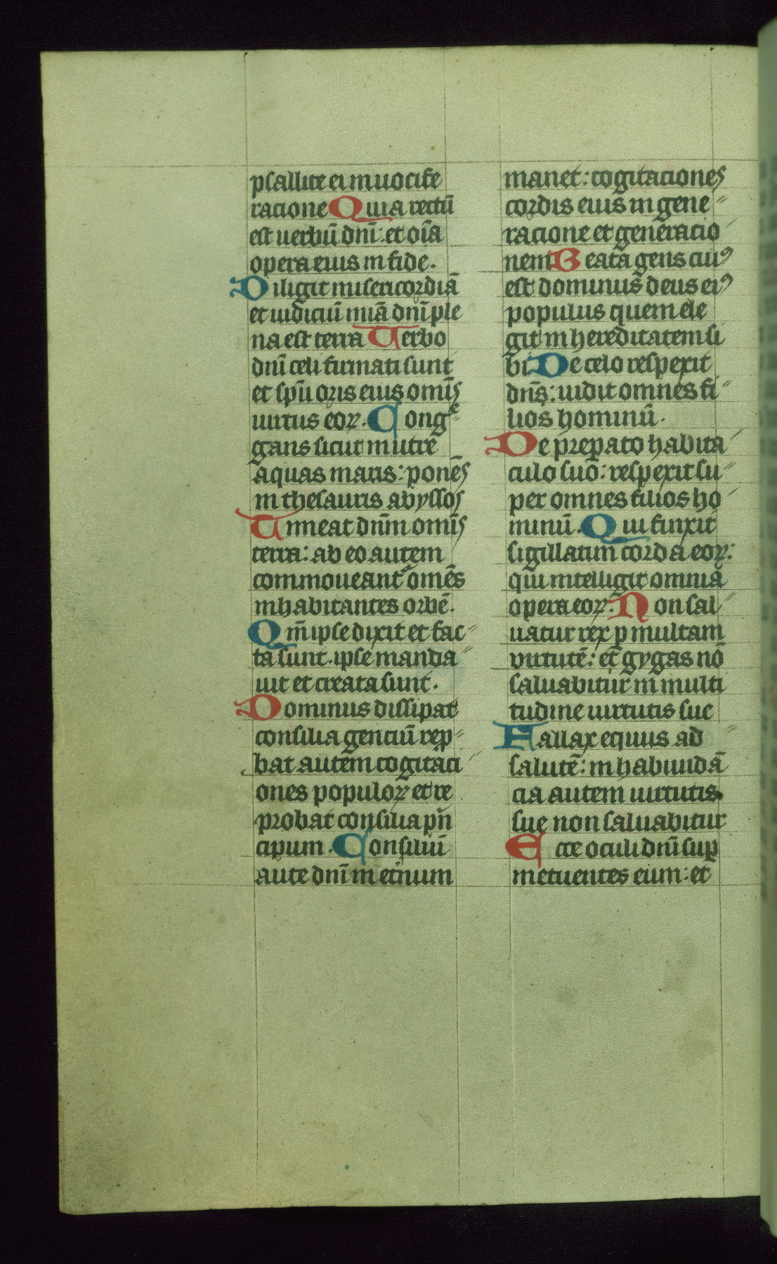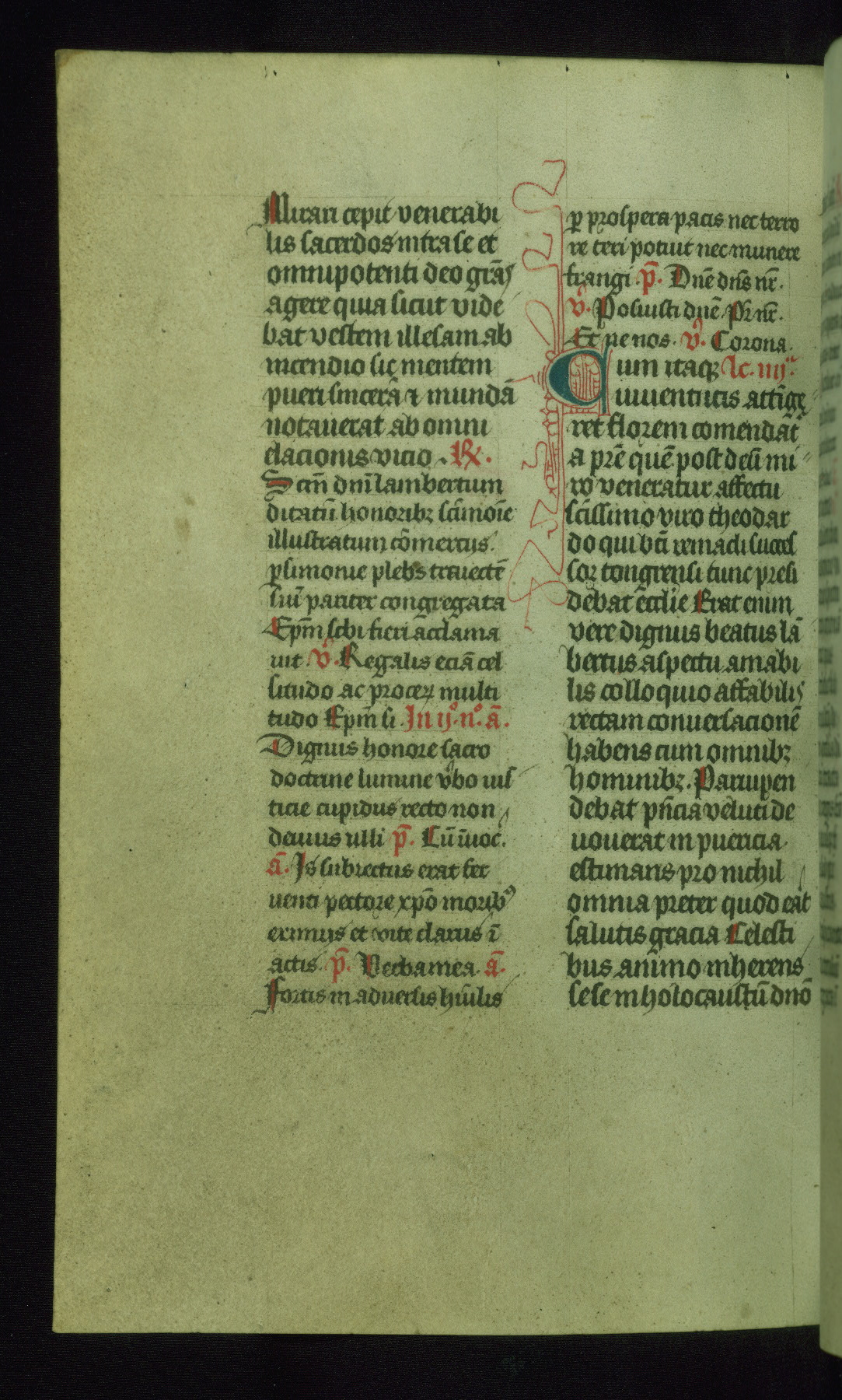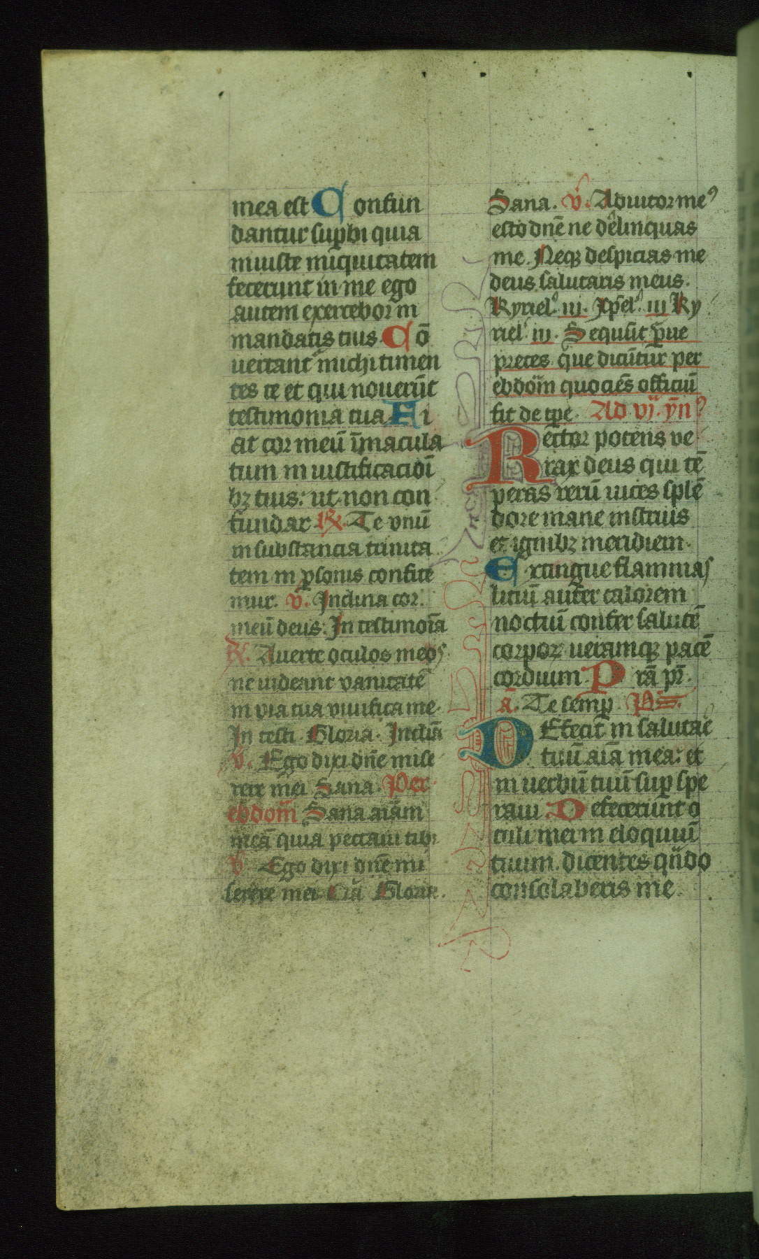 This small breviary, composed of more than 500 folios, is extraordinary for its length, considering it is the summer portion of a two-volume breviary for the use of Liège. The manuscript was completed for ecclesiastical use at the Cathedral of Notre-Dame and St.-Lambert in Liège ca. 1420. This attribution is suggested, for instance, by the petitions to the congregation of this cathedral (fols. 114v-117v), as well as the armorial shield of the family of Surlet de Chokier of Liège represented at the opening of the Psalms. The manuscript has modest, but interesting, decoration with historiated and decorated initials marking the liturgical texts, and occasional angels playing instruments in the margins. The most notable pictorial effect is found in the initials inhabited by transparent figures on rich blue ground. The technique is found, for instance, on fol. 156r with the gold monstrance held by translucent angels for the feast of the Corpus Christi.