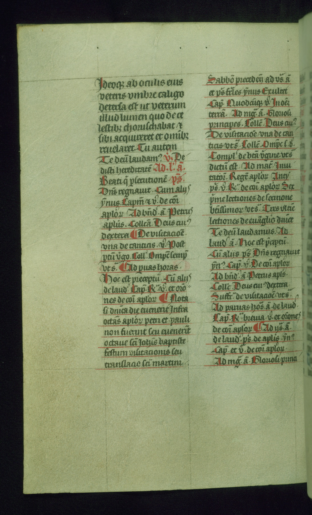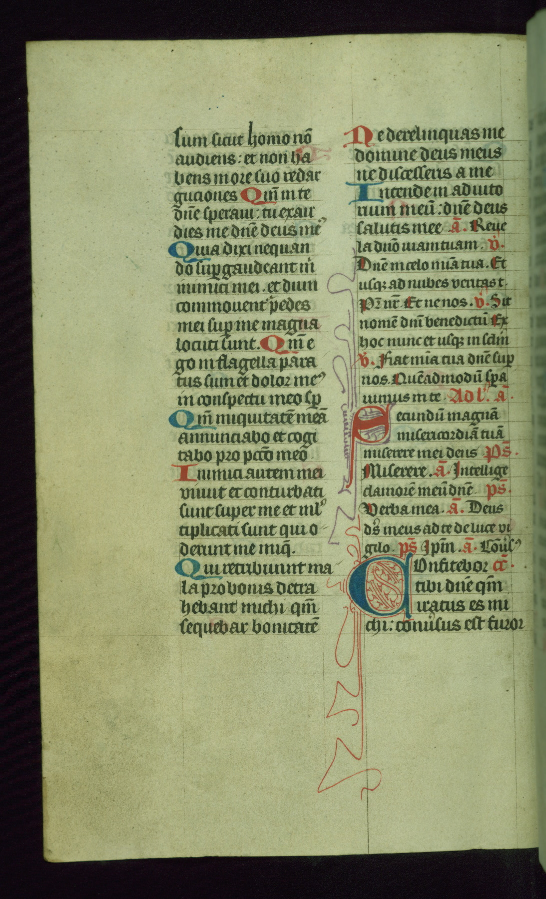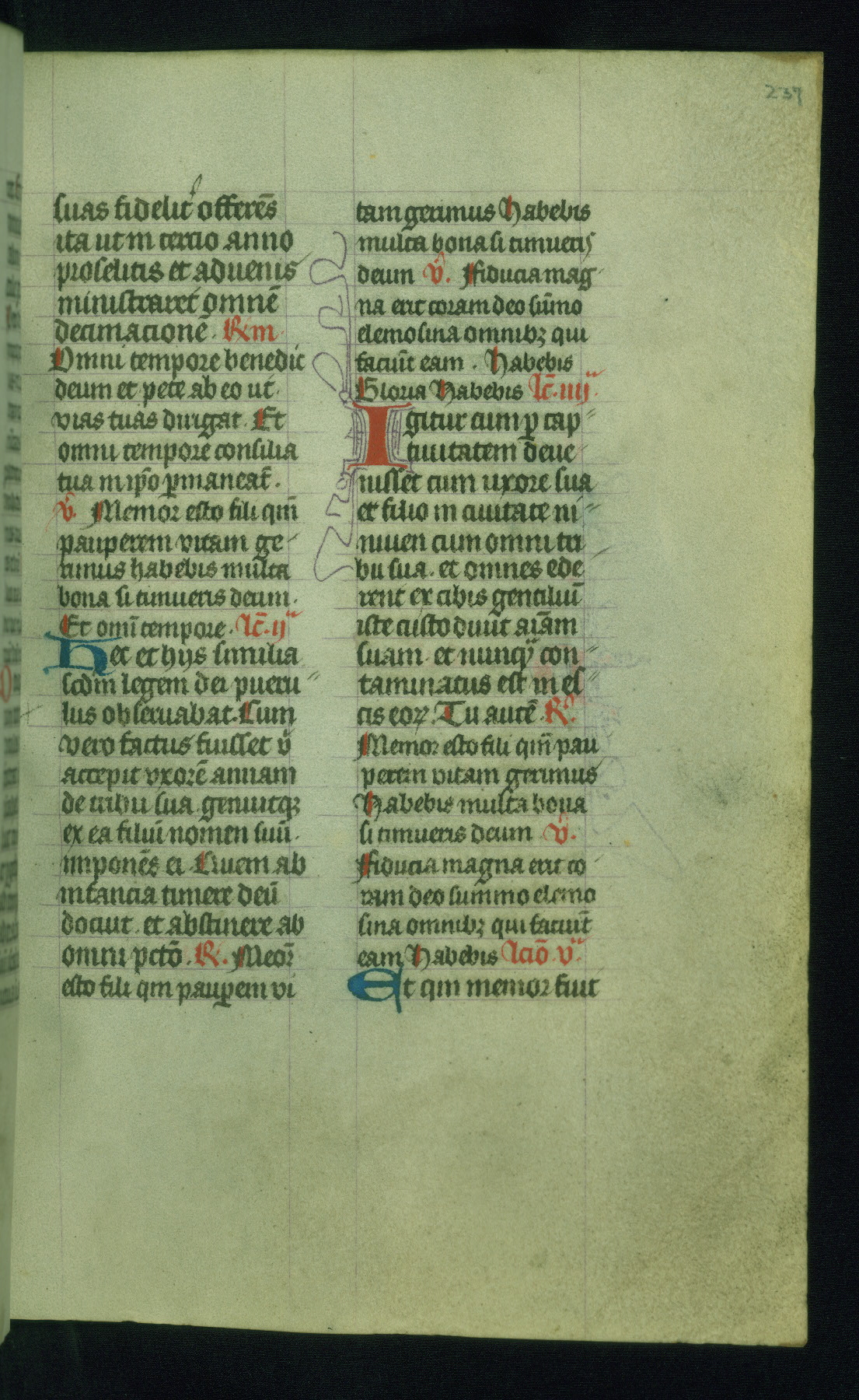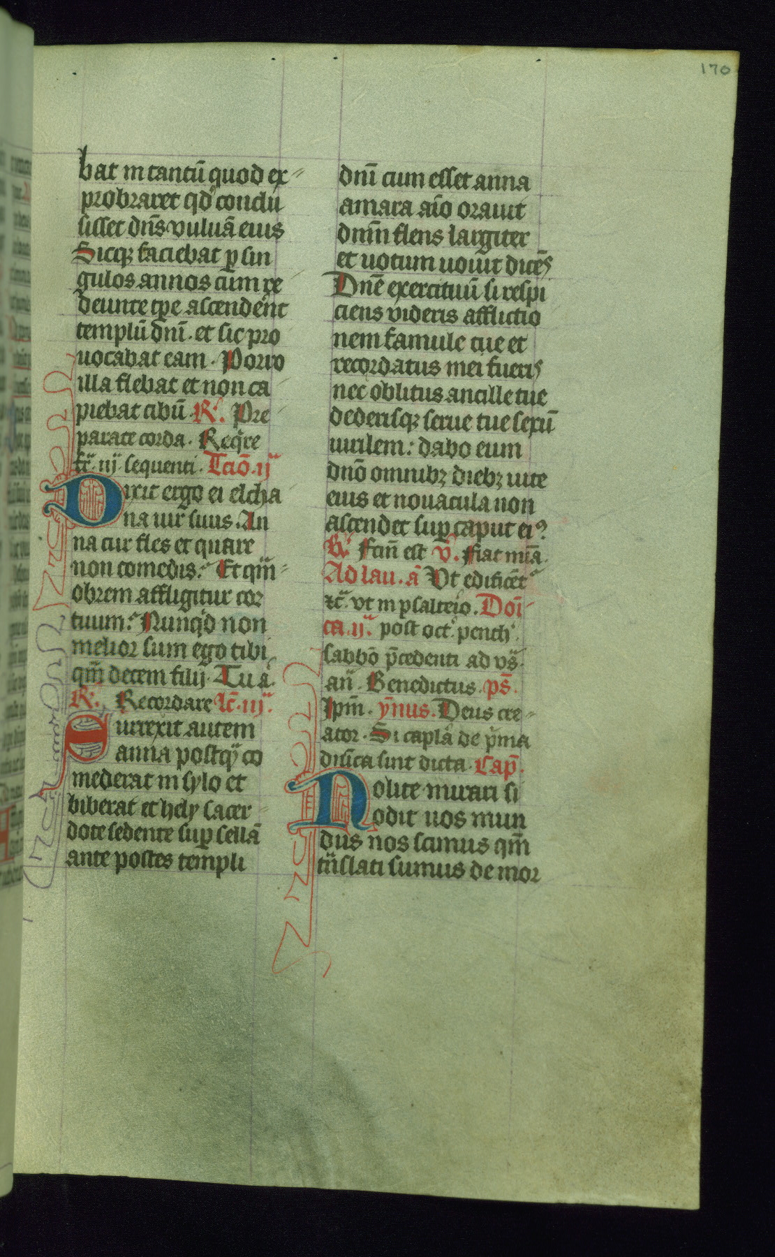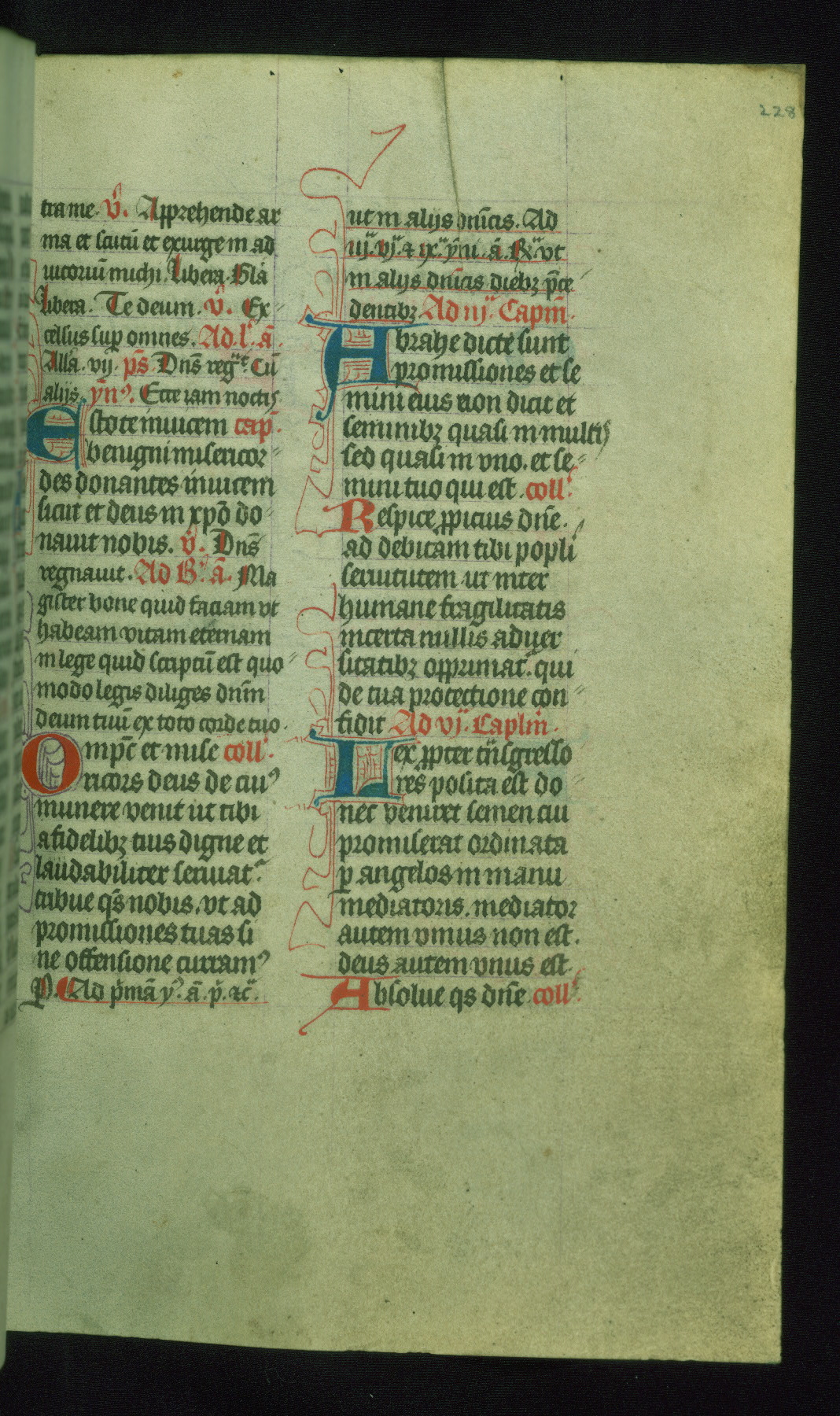 This small breviary, composed of more than 500 folios, is extraordinary for its length, considering it is the summer portion of a two-volume breviary for the use of Liège. The manuscript was completed for ecclesiastical use at the Cathedral of Notre-Dame and St.-Lambert in Liège ca. 1420. This attribution is suggested, for instance, by the petitions to the congregation of this cathedral (fols. 114v-117v), as well as the armorial shield of the family of Surlet de Chokier of Liège represented at the opening of the Psalms. The manuscript has modest, but interesting, decoration with historiated and decorated initials marking the liturgical texts, and occasional angels playing instruments in the margins. The most notable pictorial effect is found in the initials inhabited by transparent figures on rich blue ground. The technique is found, for instance, on fol. 156r with the gold monstrance held by translucent angels for the feast of the Corpus Christi.