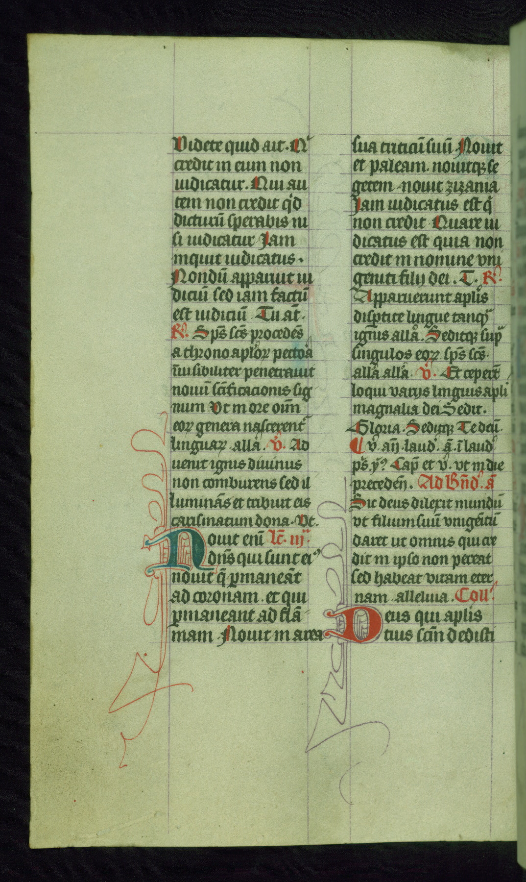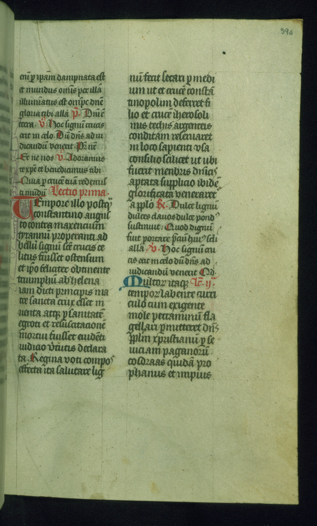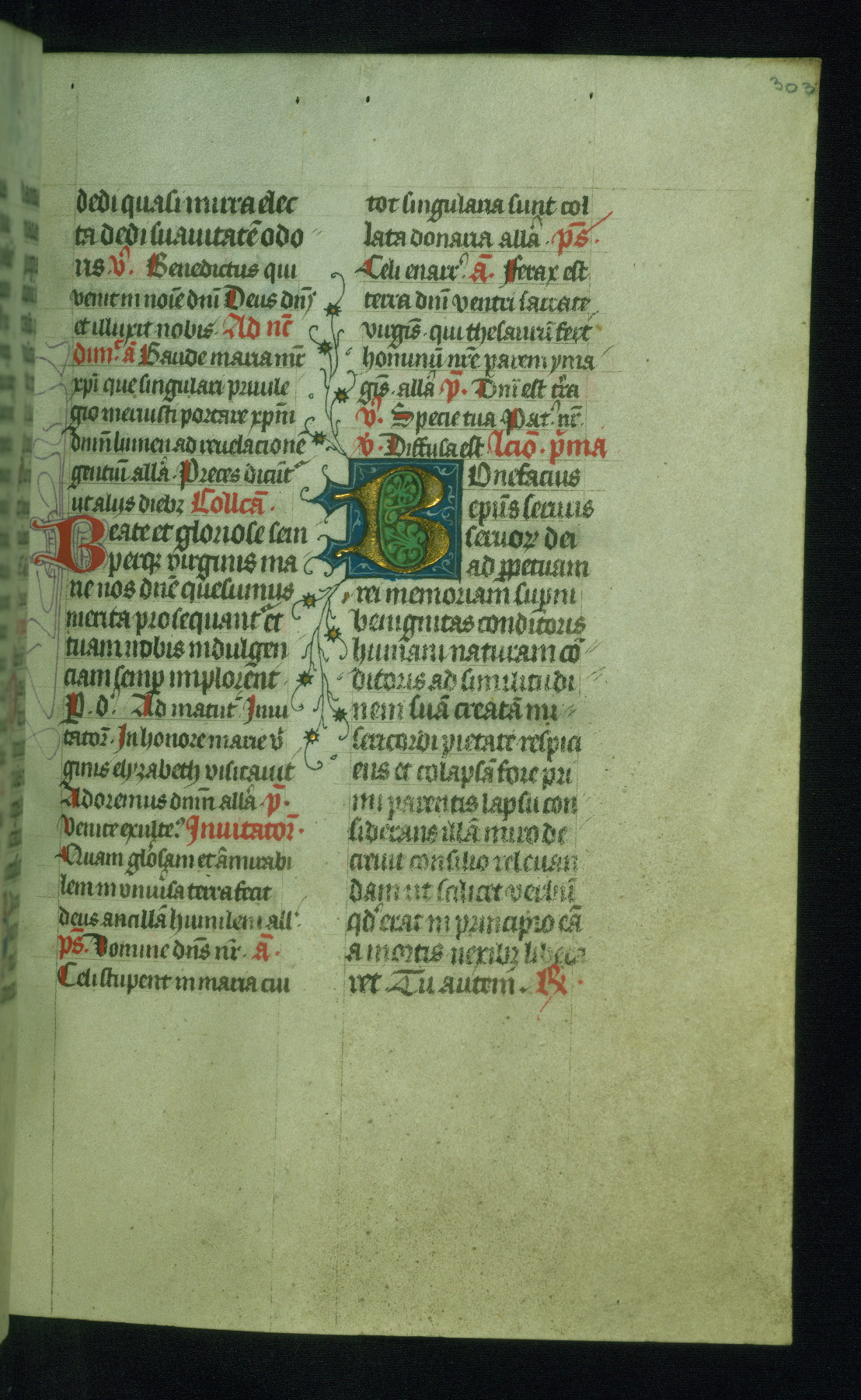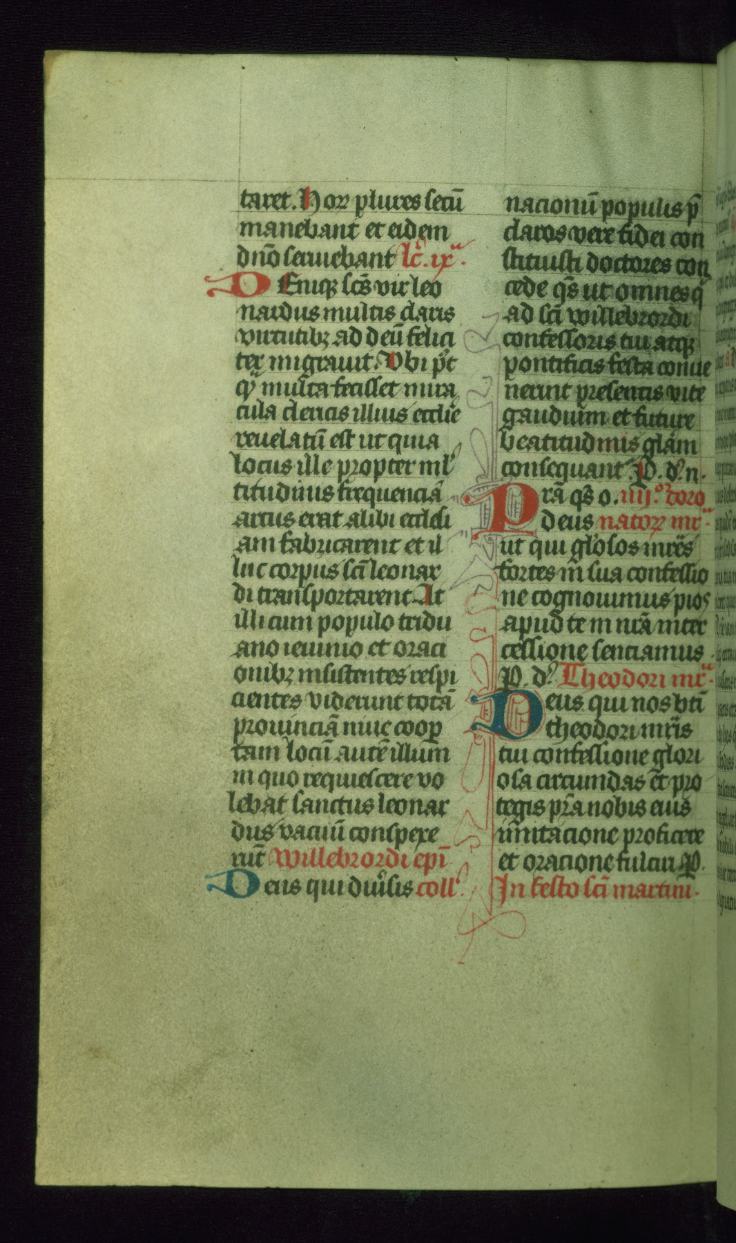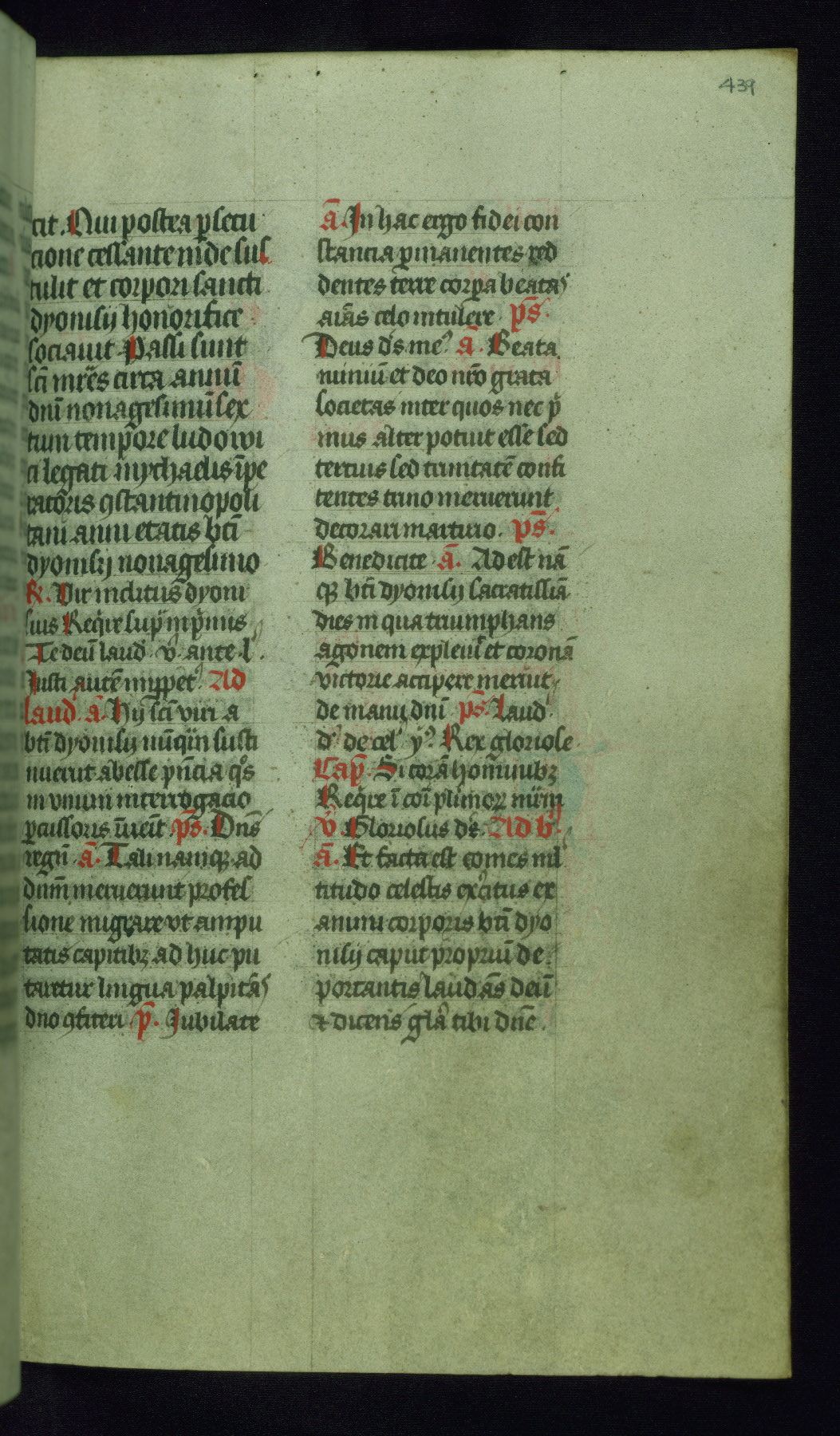 This small breviary, composed of more than 500 folios, is extraordinary for its length, considering it is the summer portion of a two-volume breviary for the use of Liège. The manuscript was completed for ecclesiastical use at the Cathedral of Notre-Dame and St.-Lambert in Liège ca. 1420. This attribution is suggested, for instance, by the petitions to the congregation of this cathedral (fols. 114v-117v), as well as the armorial shield of the family of Surlet de Chokier of Liège represented at the opening of the Psalms. The manuscript has modest, but interesting, decoration with historiated and decorated initials marking the liturgical texts, and occasional angels playing instruments in the margins. The most notable pictorial effect is found in the initials inhabited by transparent figures on rich blue ground. The technique is found, for instance, on fol. 156r with the gold monstrance held by translucent angels for the feast of the Corpus Christi.