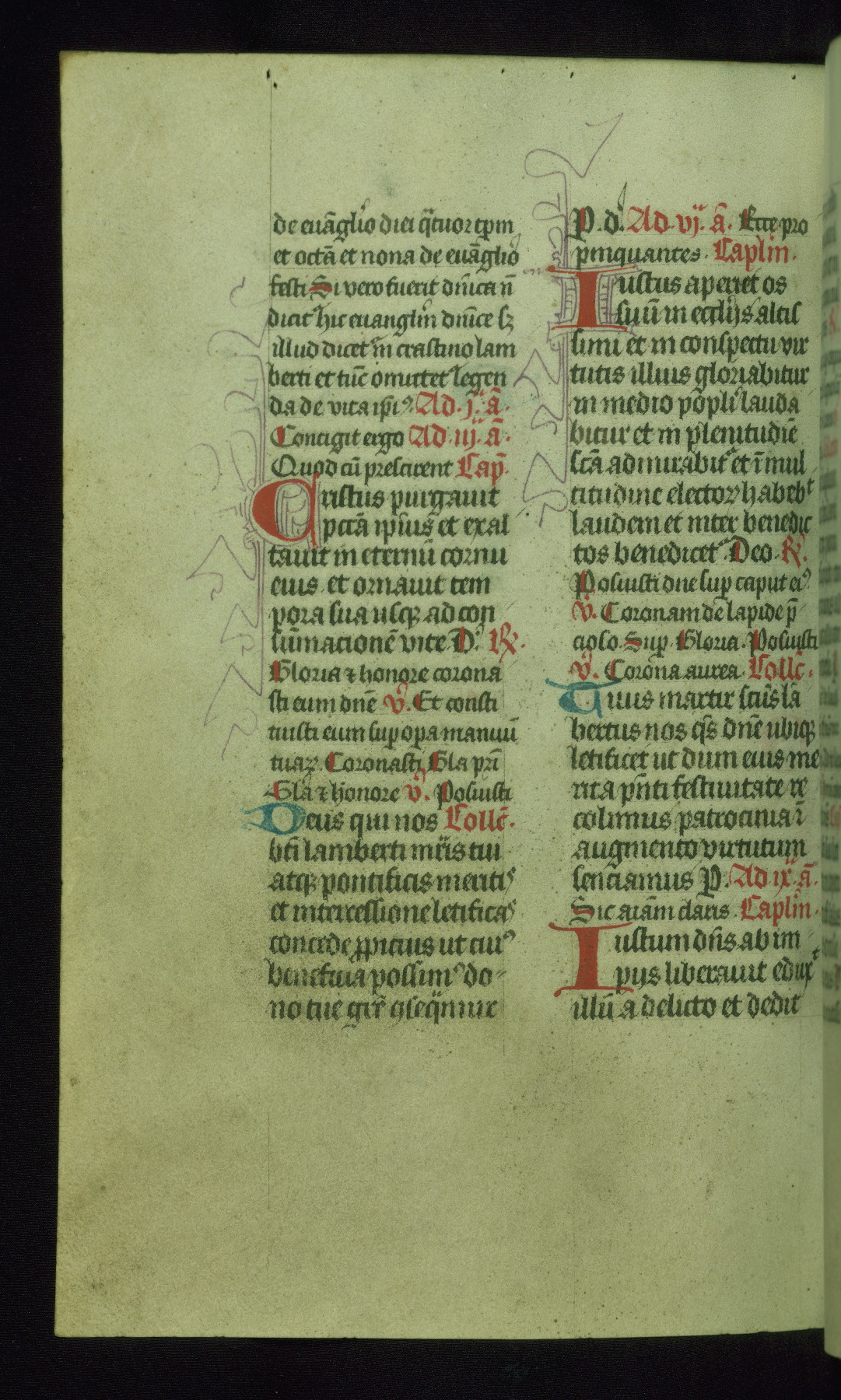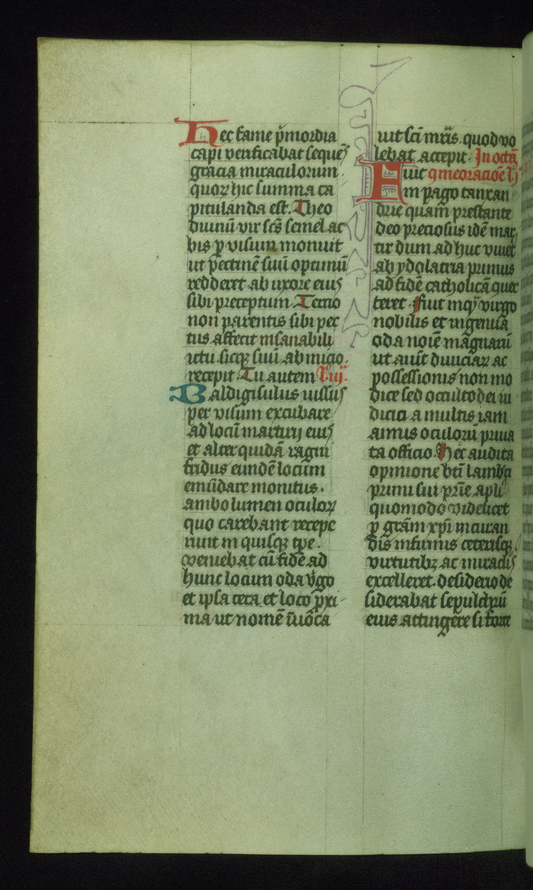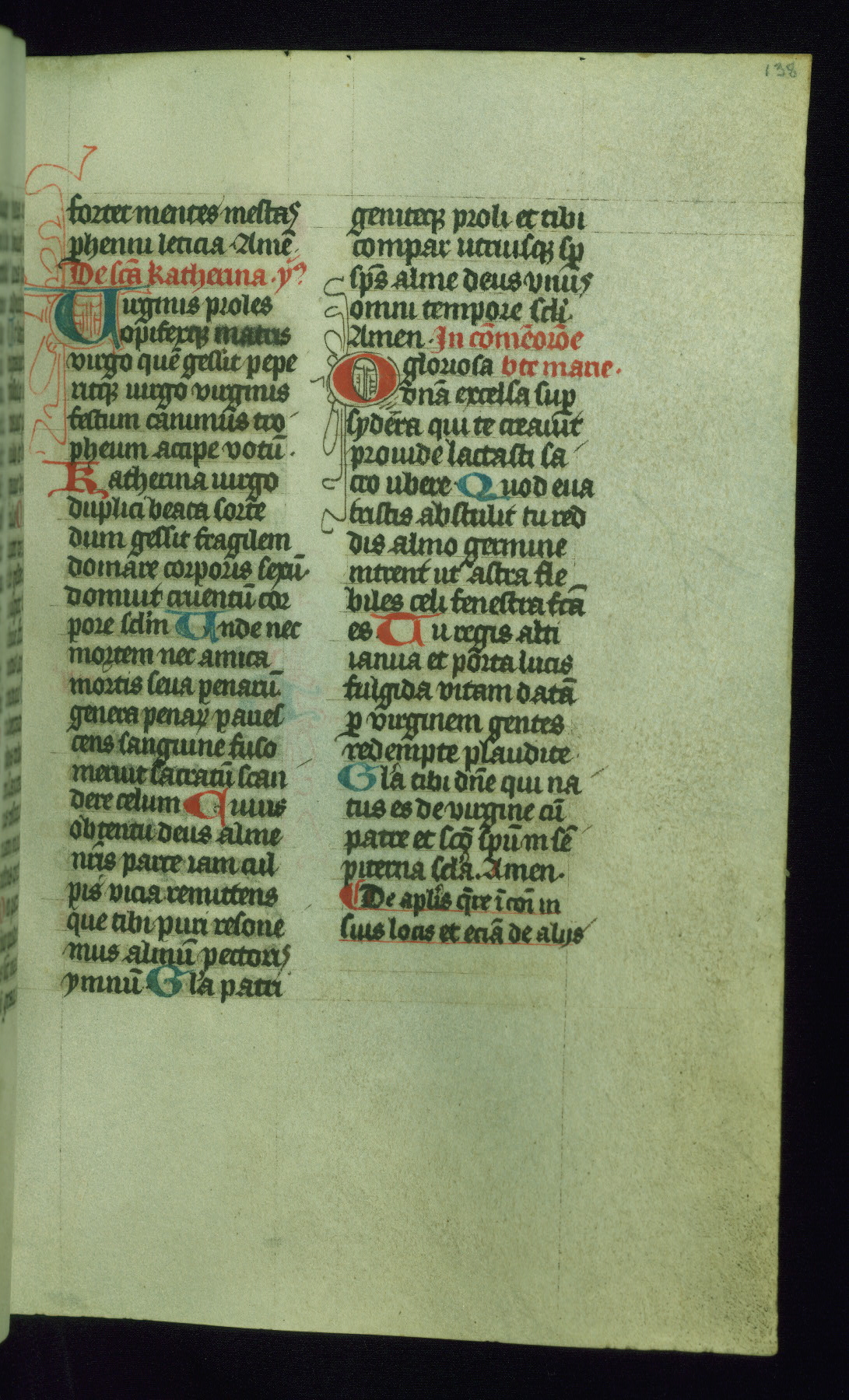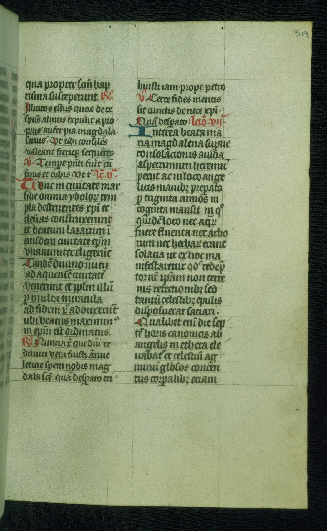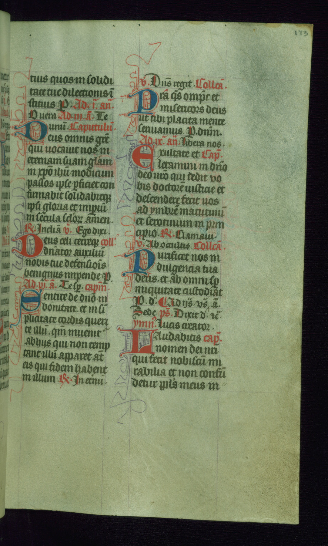 This small breviary, composed of more than 500 folios, is extraordinary for its length, considering it is the summer portion of a two-volume breviary for the use of Liège. The manuscript was completed for ecclesiastical use at the Cathedral of Notre-Dame and St.-Lambert in Liège ca. 1420. This attribution is suggested, for instance, by the petitions to the congregation of this cathedral (fols. 114v-117v), as well as the armorial shield of the family of Surlet de Chokier of Liège represented at the opening of the Psalms. The manuscript has modest, but interesting, decoration with historiated and decorated initials marking the liturgical texts, and occasional angels playing instruments in the margins. The most notable pictorial effect is found in the initials inhabited by transparent figures on rich blue ground. The technique is found, for instance, on fol. 156r with the gold monstrance held by translucent angels for the feast of the Corpus Christi.