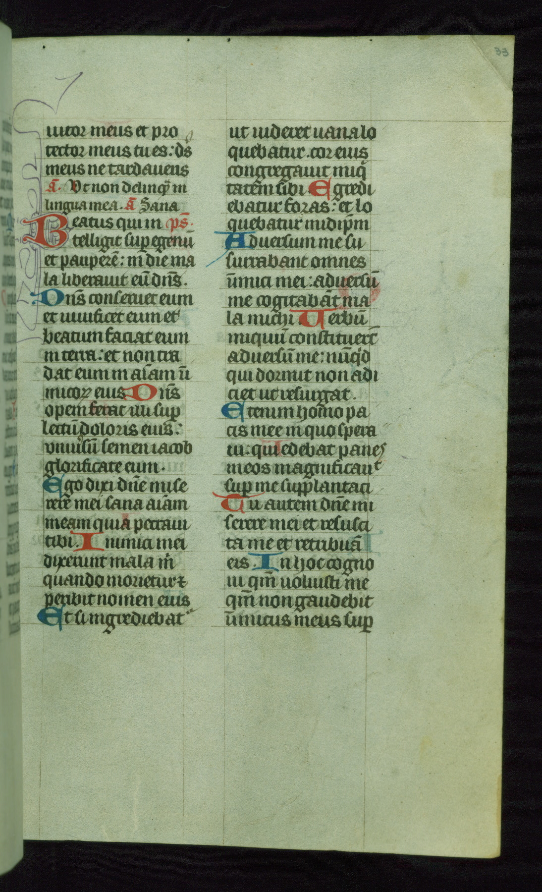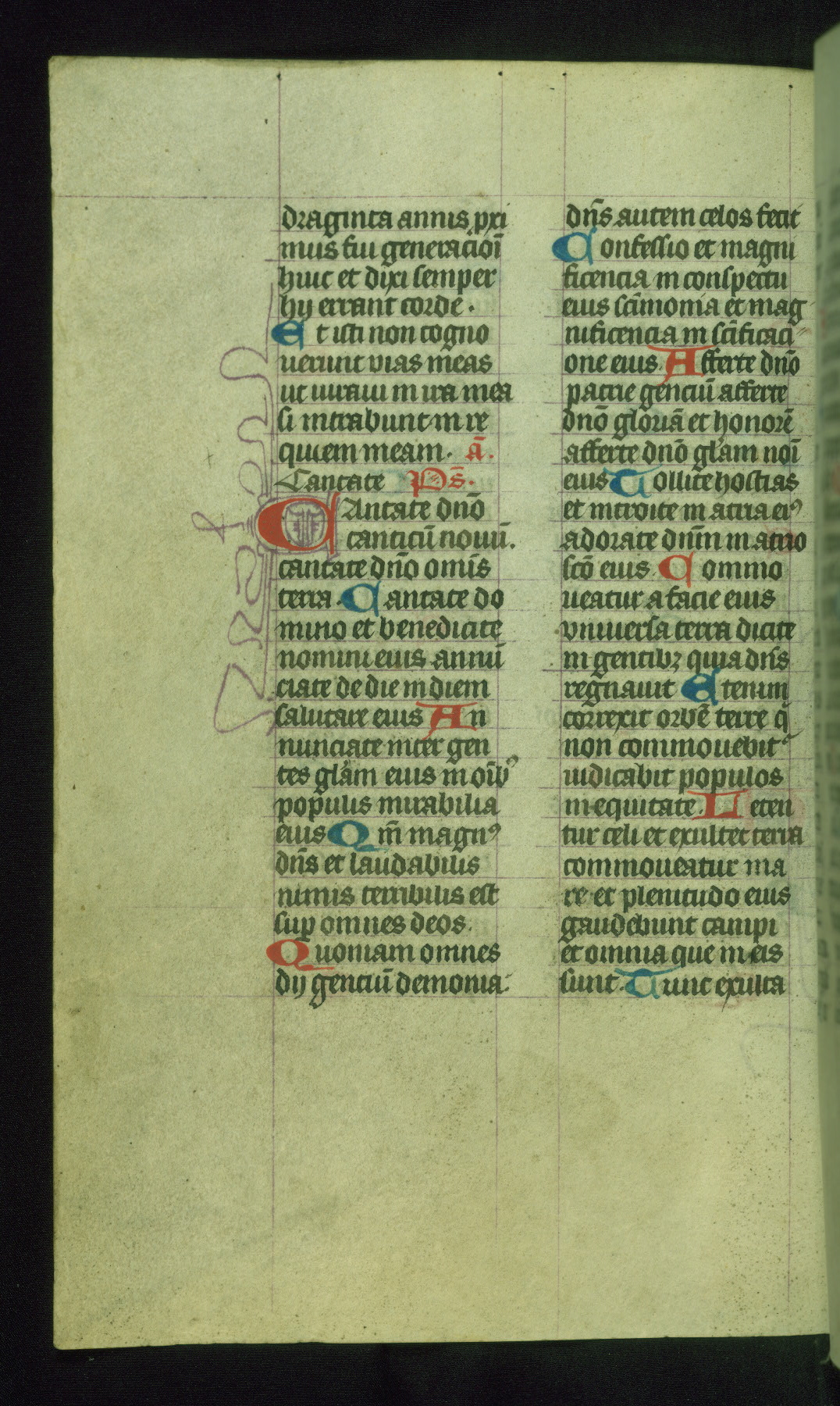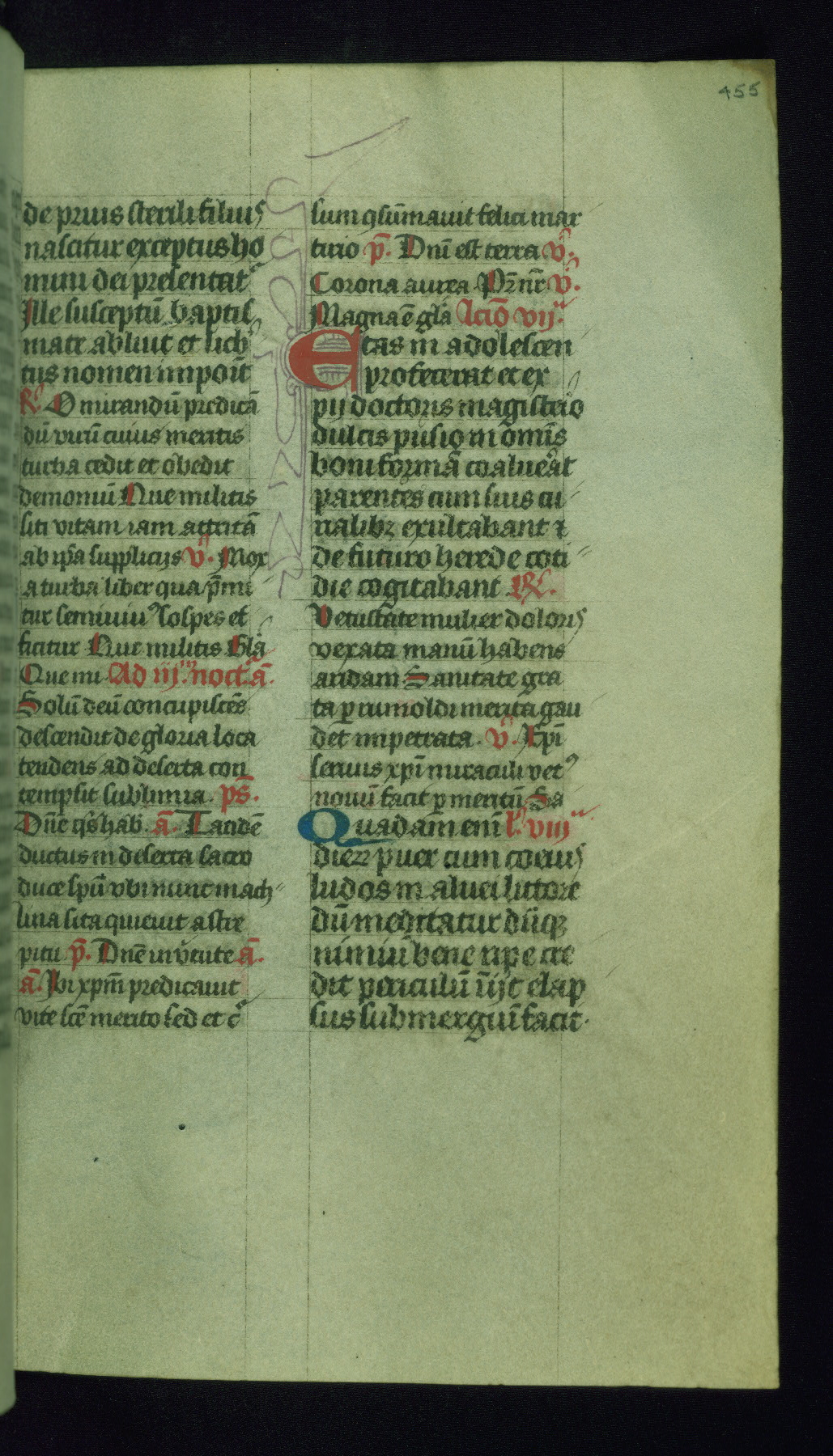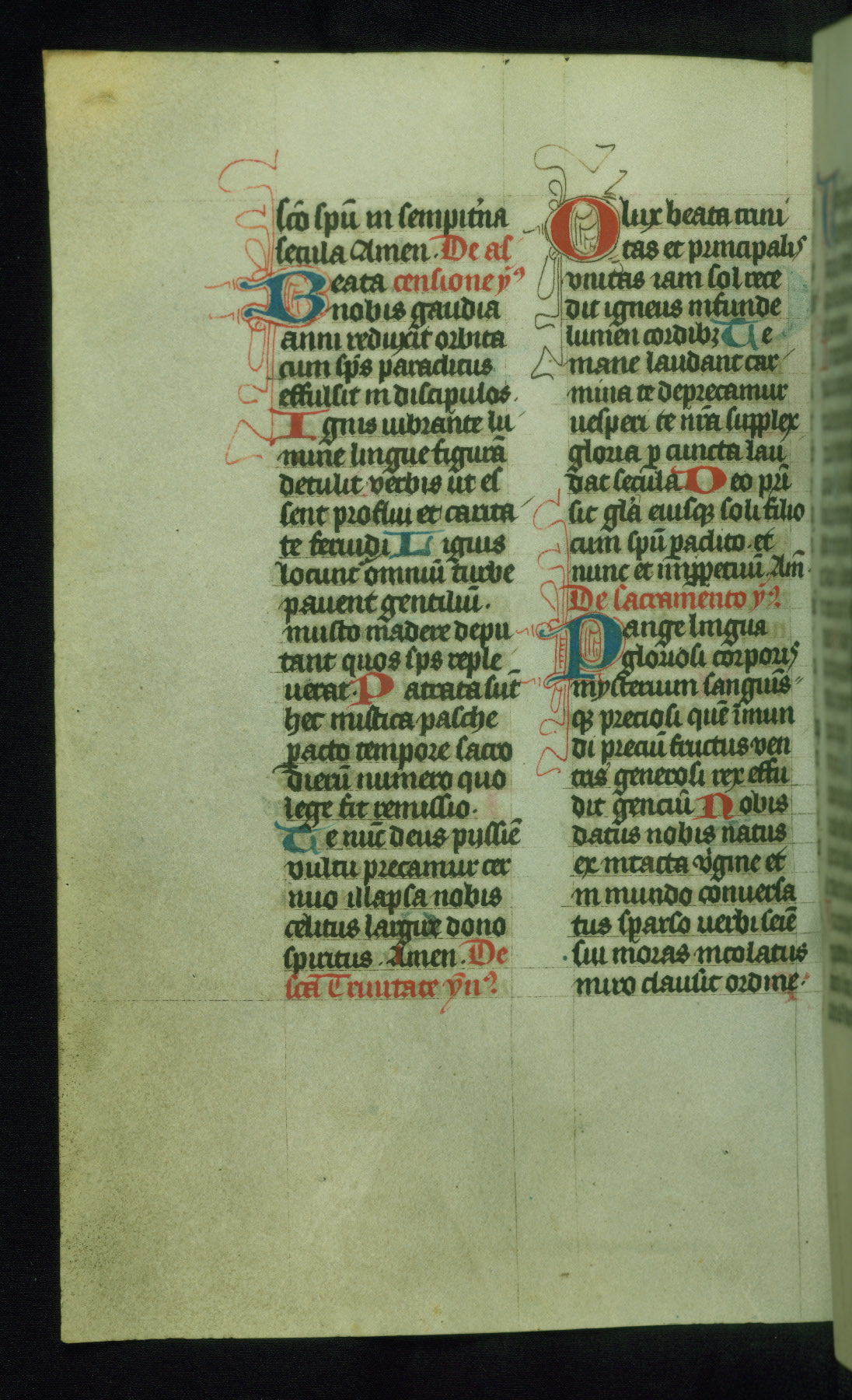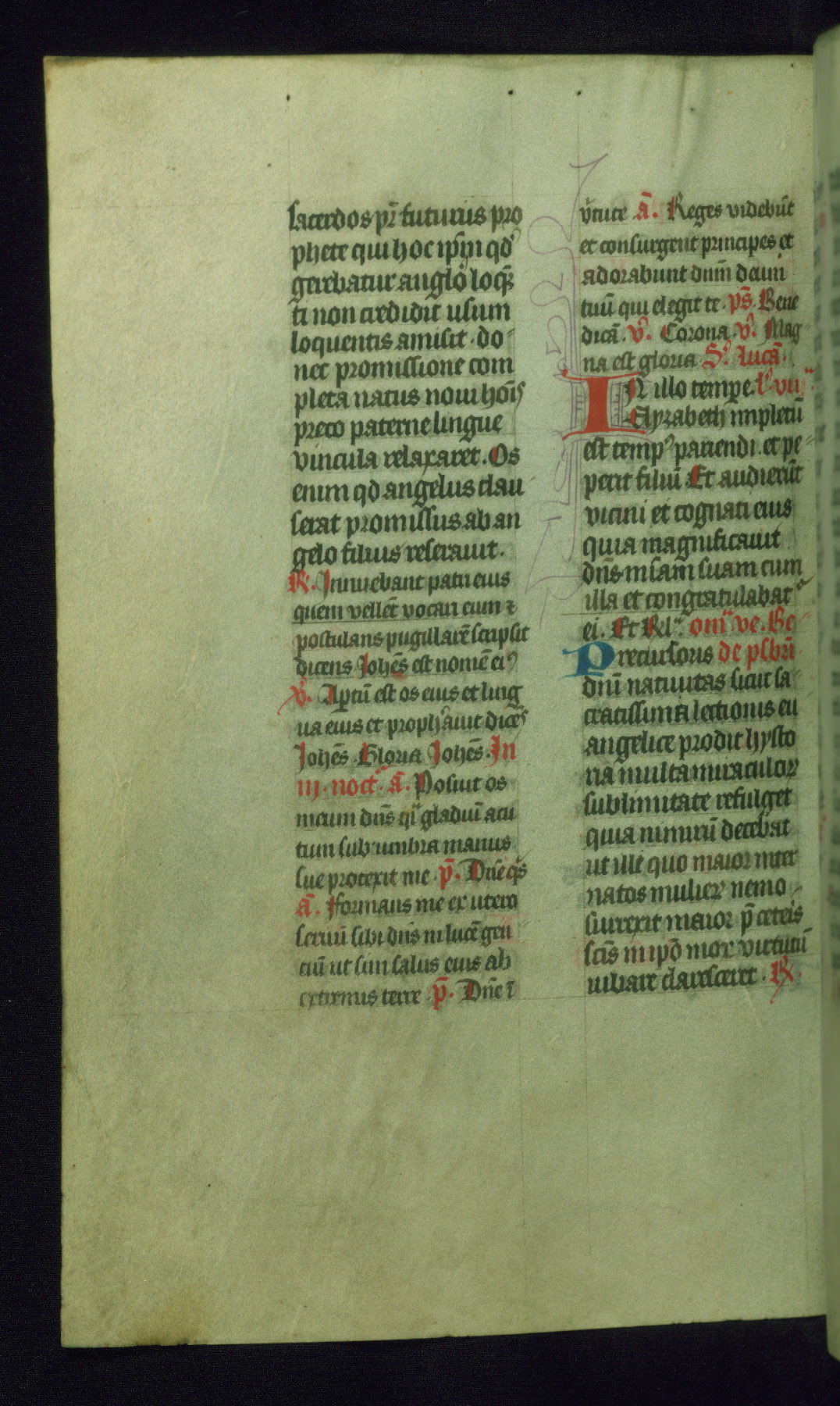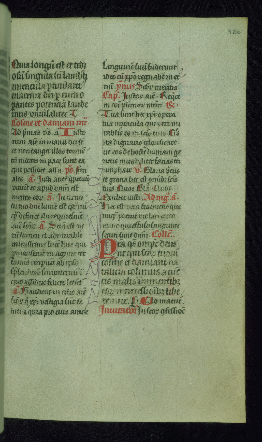 This small breviary, composed of more than 500 folios, is extraordinary for its length, considering it is the summer portion of a two-volume breviary for the use of Liège. The manuscript was completed for ecclesiastical use at the Cathedral of Notre-Dame and St.-Lambert in Liège ca. 1420. This attribution is suggested, for instance, by the petitions to the congregation of this cathedral (fols. 114v-117v), as well as the armorial shield of the family of Surlet de Chokier of Liège represented at the opening of the Psalms. The manuscript has modest, but interesting, decoration with historiated and decorated initials marking the liturgical texts, and occasional angels playing instruments in the margins. The most notable pictorial effect is found in the initials inhabited by transparent figures on rich blue ground. The technique is found, for instance, on fol. 156r with the gold monstrance held by translucent angels for the feast of the Corpus Christi.