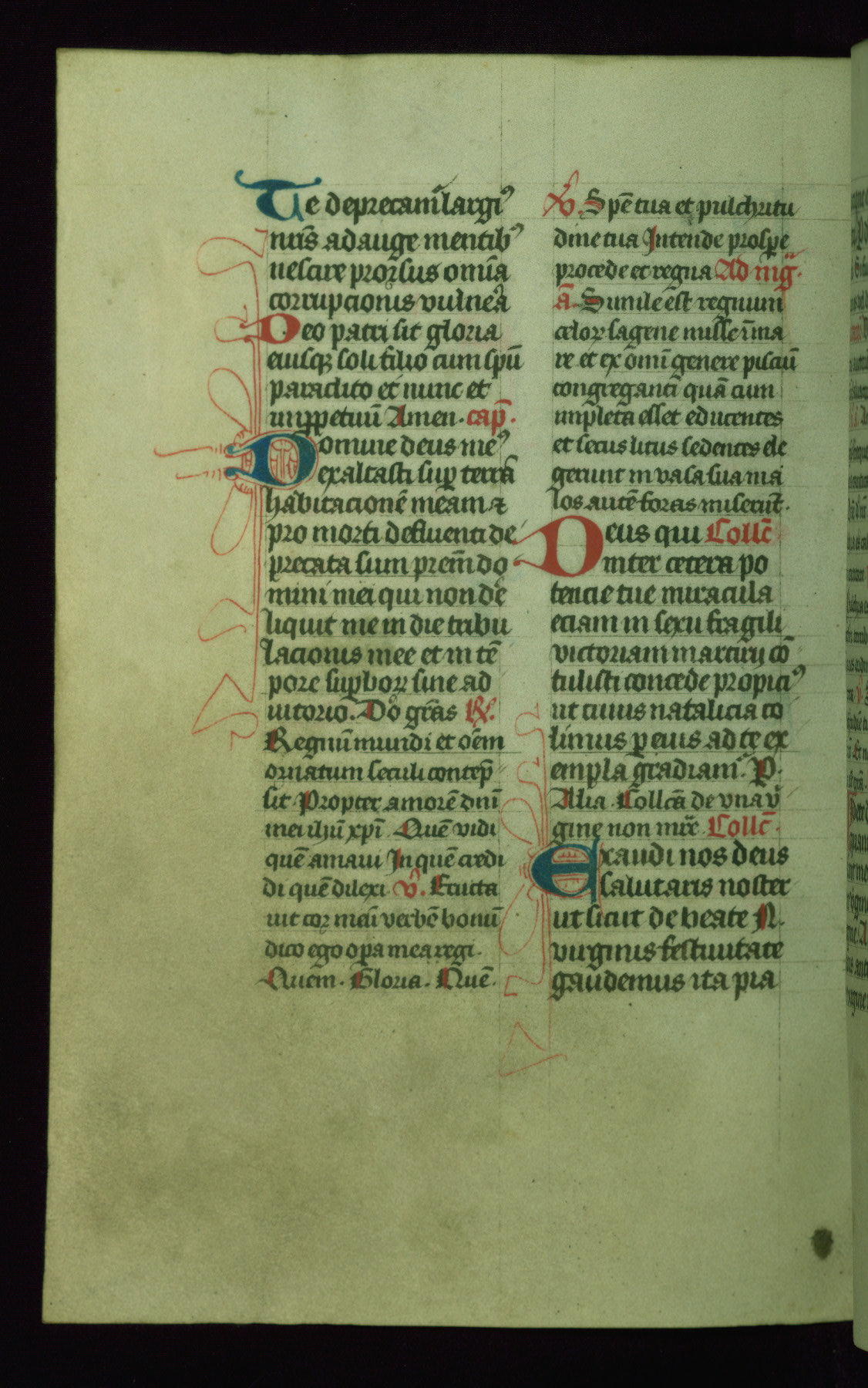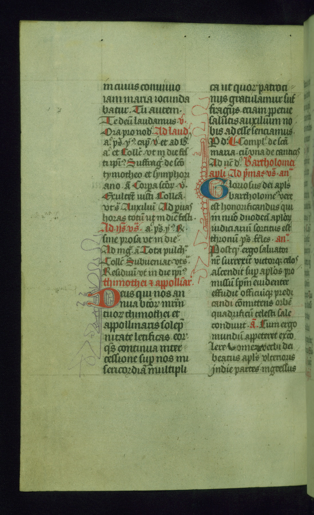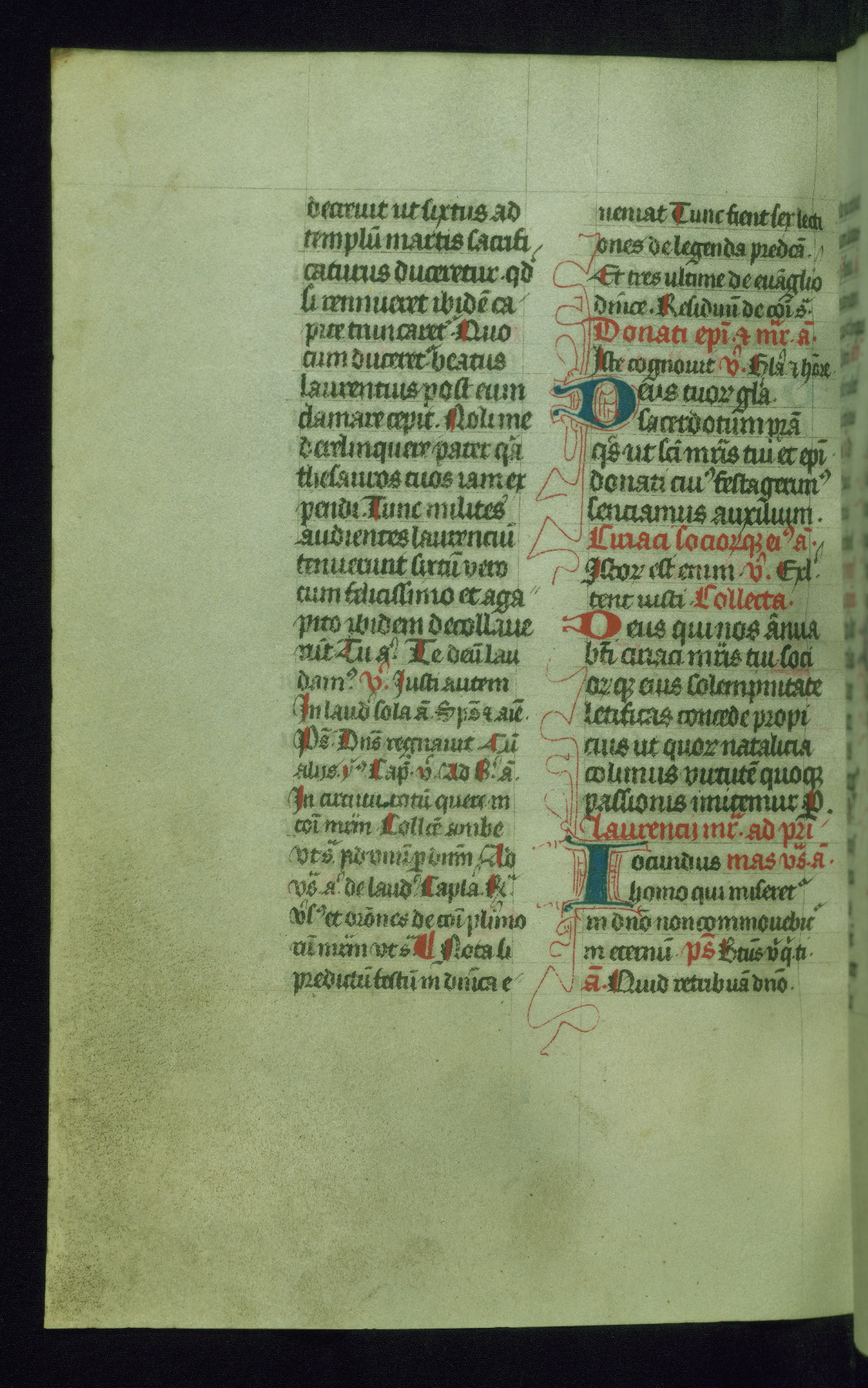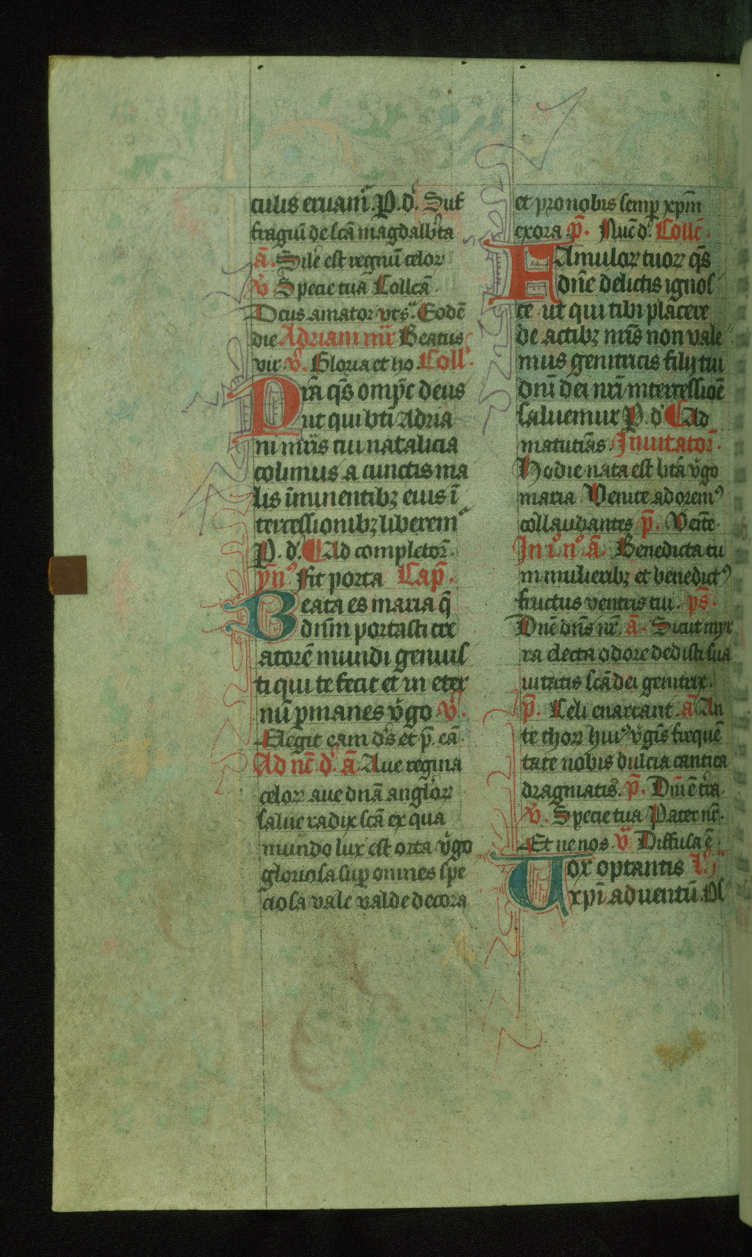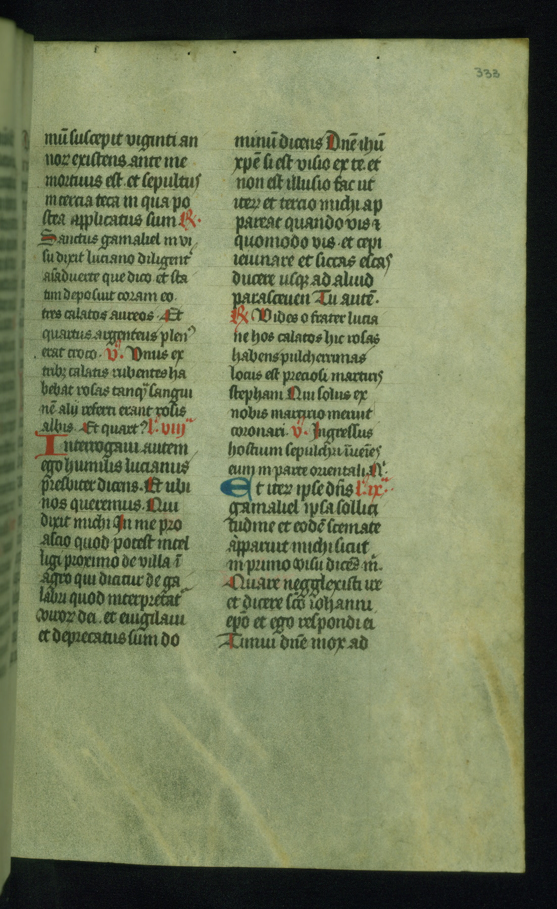 This small breviary, composed of more than 500 folios, is extraordinary for its length, considering it is the summer portion of a two-volume breviary for the use of Liège. The manuscript was completed for ecclesiastical use at the Cathedral of Notre-Dame and St.-Lambert in Liège ca. 1420. This attribution is suggested, for instance, by the petitions to the congregation of this cathedral (fols. 114v-117v), as well as the armorial shield of the family of Surlet de Chokier of Liège represented at the opening of the Psalms. The manuscript has modest, but interesting, decoration with historiated and decorated initials marking the liturgical texts, and occasional angels playing instruments in the margins. The most notable pictorial effect is found in the initials inhabited by transparent figures on rich blue ground. The technique is found, for instance, on fol. 156r with the gold monstrance held by translucent angels for the feast of the Corpus Christi.