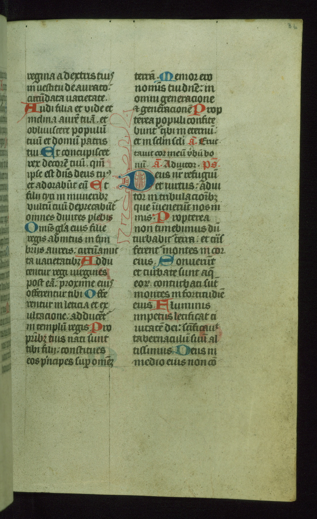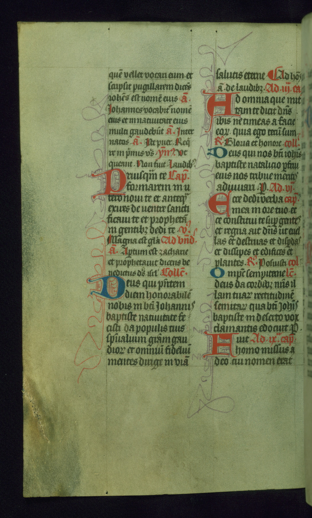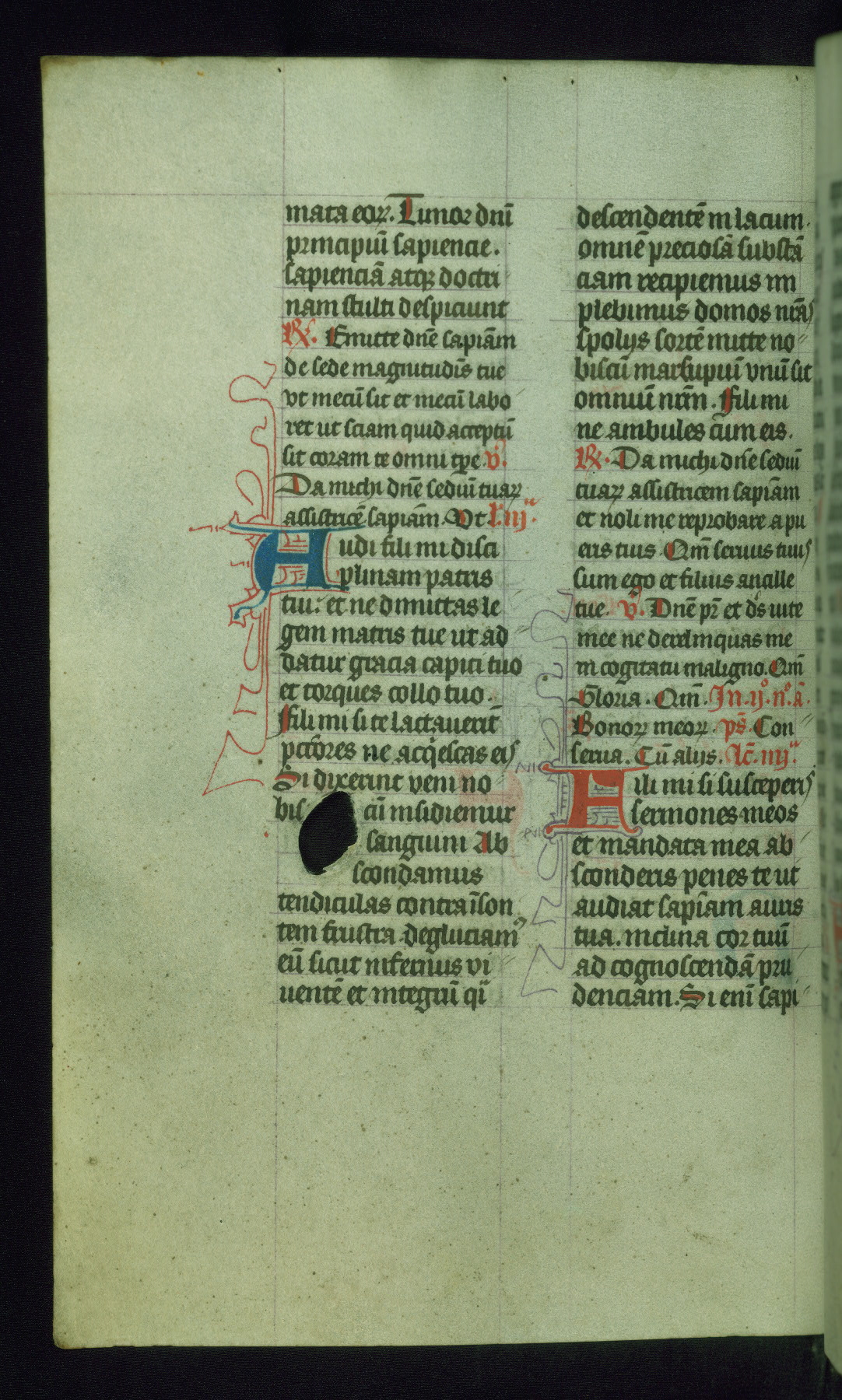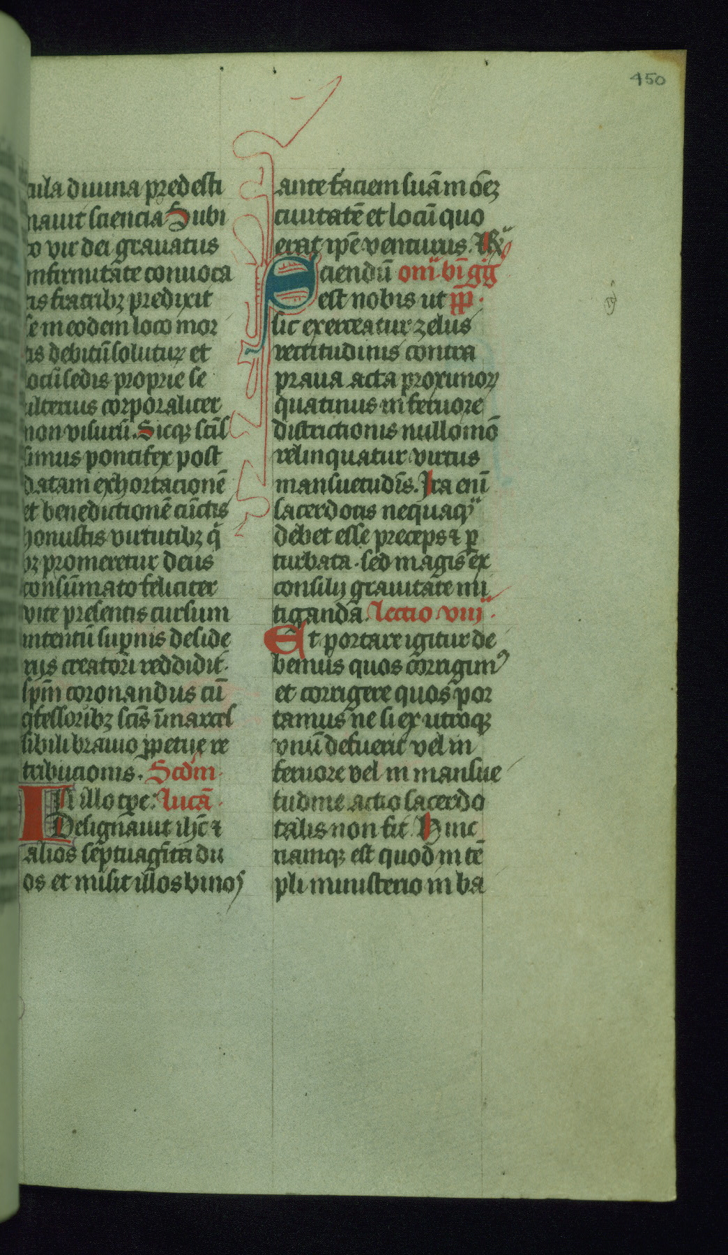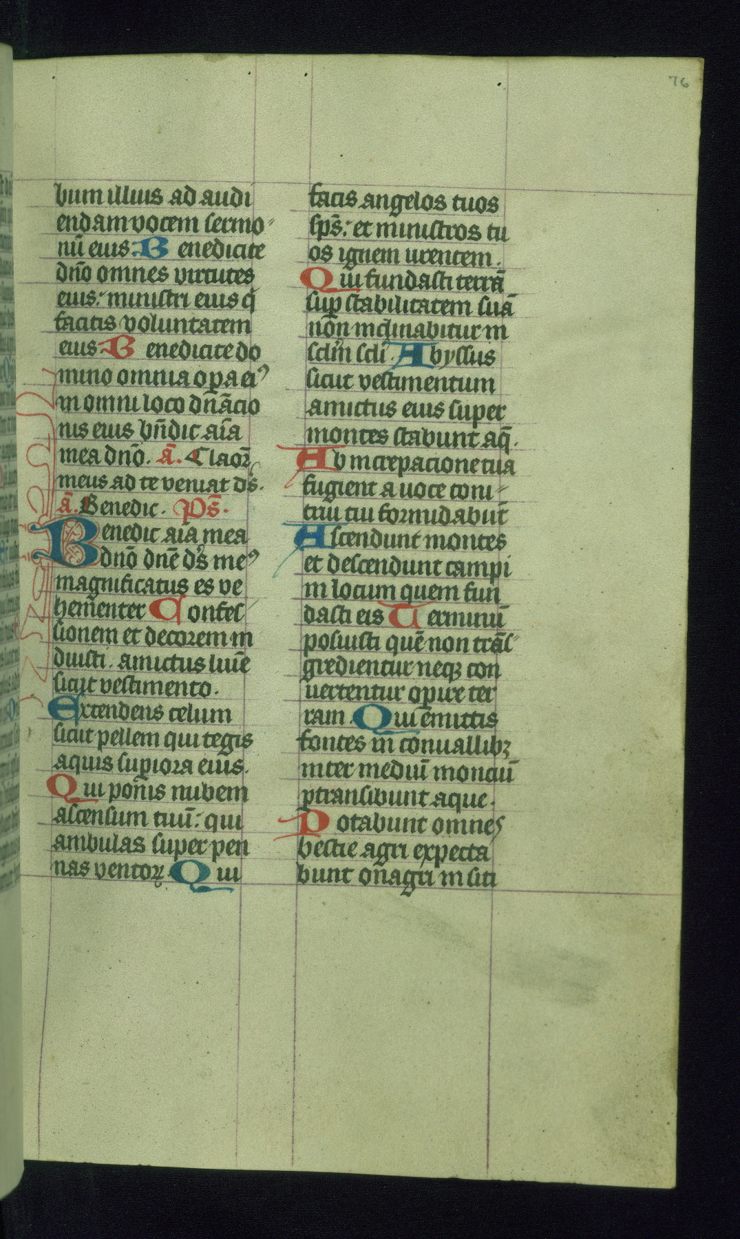 This small breviary, composed of more than 500 folios, is extraordinary for its length, considering it is the summer portion of a two-volume breviary for the use of Liège. The manuscript was completed for ecclesiastical use at the Cathedral of Notre-Dame and St.-Lambert in Liège ca. 1420. This attribution is suggested, for instance, by the petitions to the congregation of this cathedral (fols. 114v-117v), as well as the armorial shield of the family of Surlet de Chokier of Liège represented at the opening of the Psalms. The manuscript has modest, but interesting, decoration with historiated and decorated initials marking the liturgical texts, and occasional angels playing instruments in the margins. The most notable pictorial effect is found in the initials inhabited by transparent figures on rich blue ground. The technique is found, for instance, on fol. 156r with the gold monstrance held by translucent angels for the feast of the Corpus Christi.