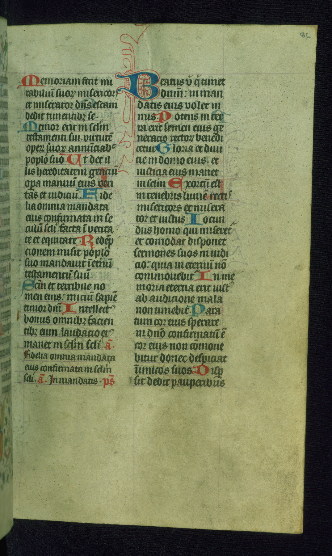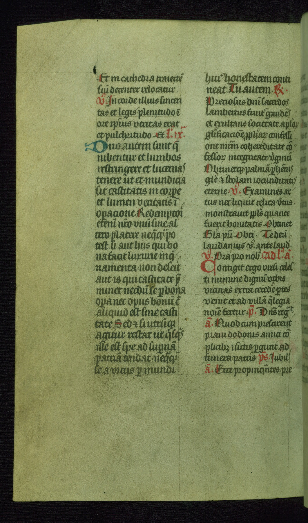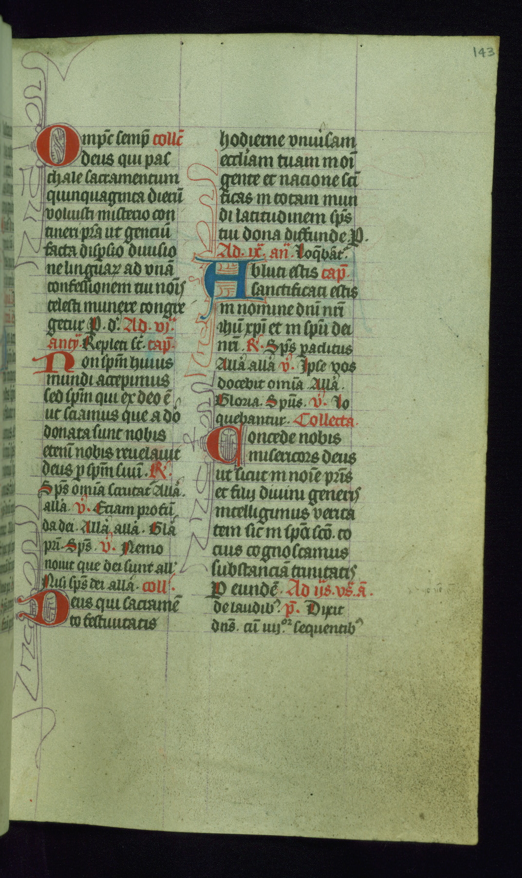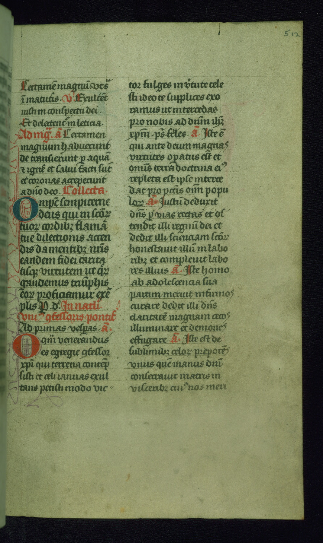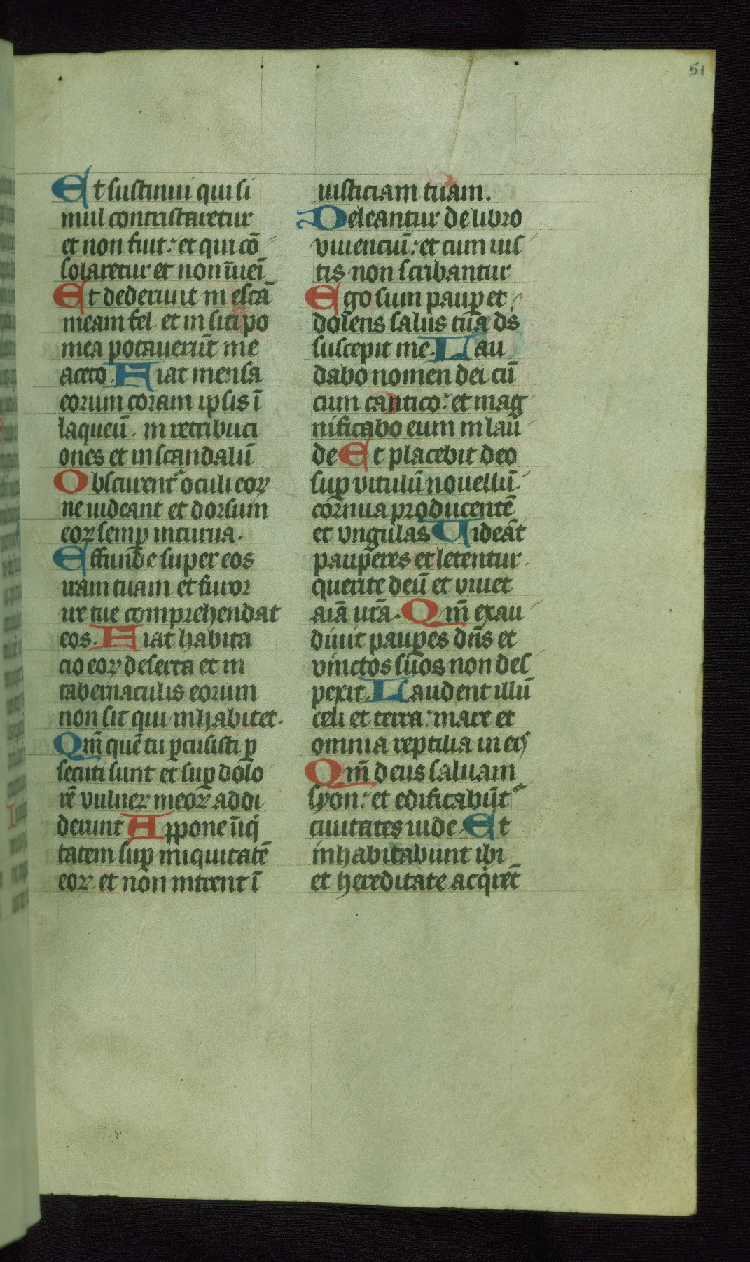 This small breviary, composed of more than 500 folios, is extraordinary for its length, considering it is the summer portion of a two-volume breviary for the use of Liège. The manuscript was completed for ecclesiastical use at the Cathedral of Notre-Dame and St.-Lambert in Liège ca. 1420. This attribution is suggested, for instance, by the petitions to the congregation of this cathedral (fols. 114v-117v), as well as the armorial shield of the family of Surlet de Chokier of Liège represented at the opening of the Psalms. The manuscript has modest, but interesting, decoration with historiated and decorated initials marking the liturgical texts, and occasional angels playing instruments in the margins. The most notable pictorial effect is found in the initials inhabited by transparent figures on rich blue ground. The technique is found, for instance, on fol. 156r with the gold monstrance held by translucent angels for the feast of the Corpus Christi.
