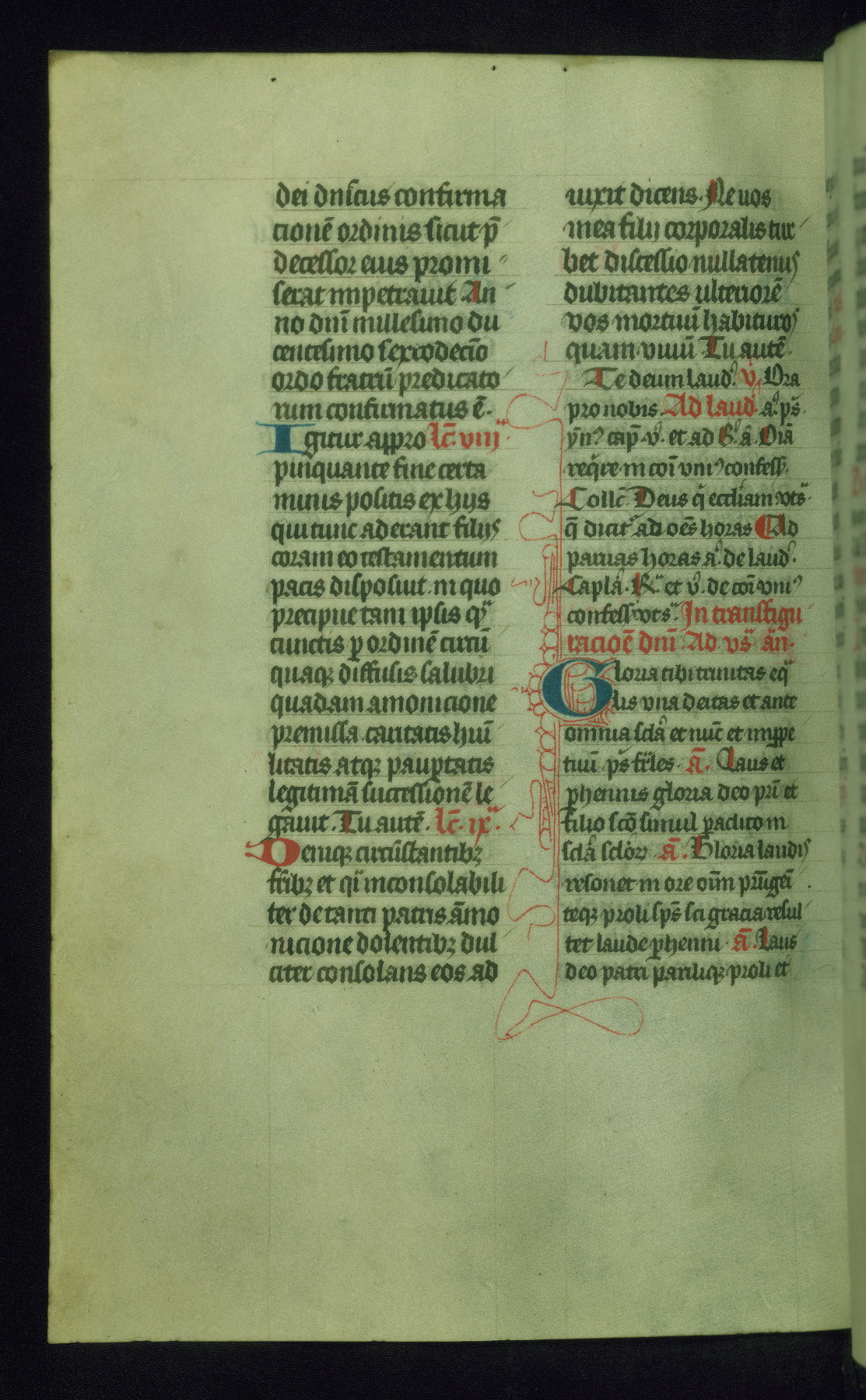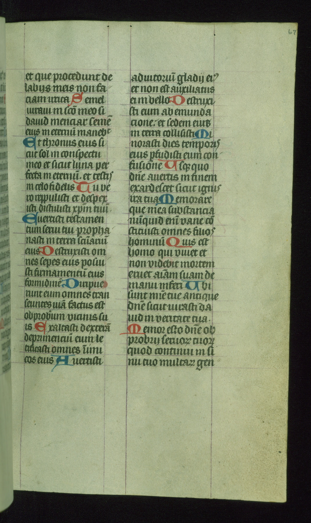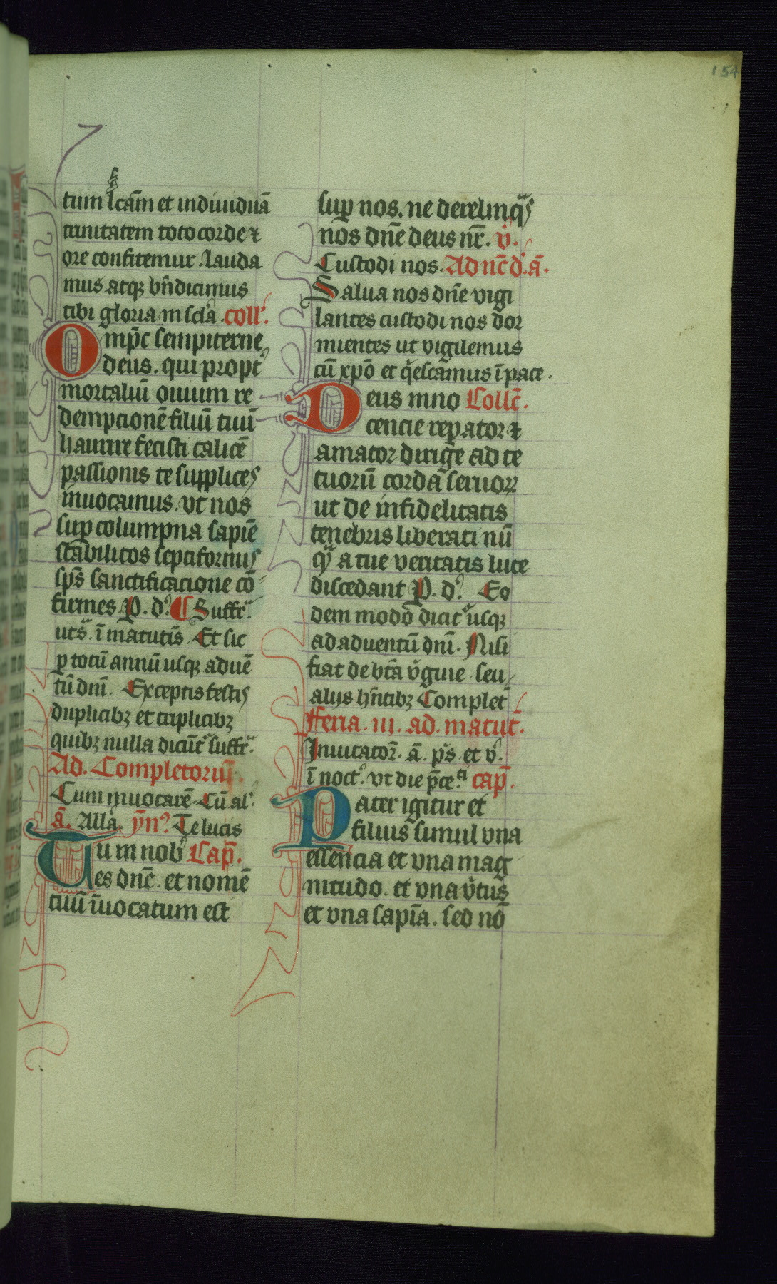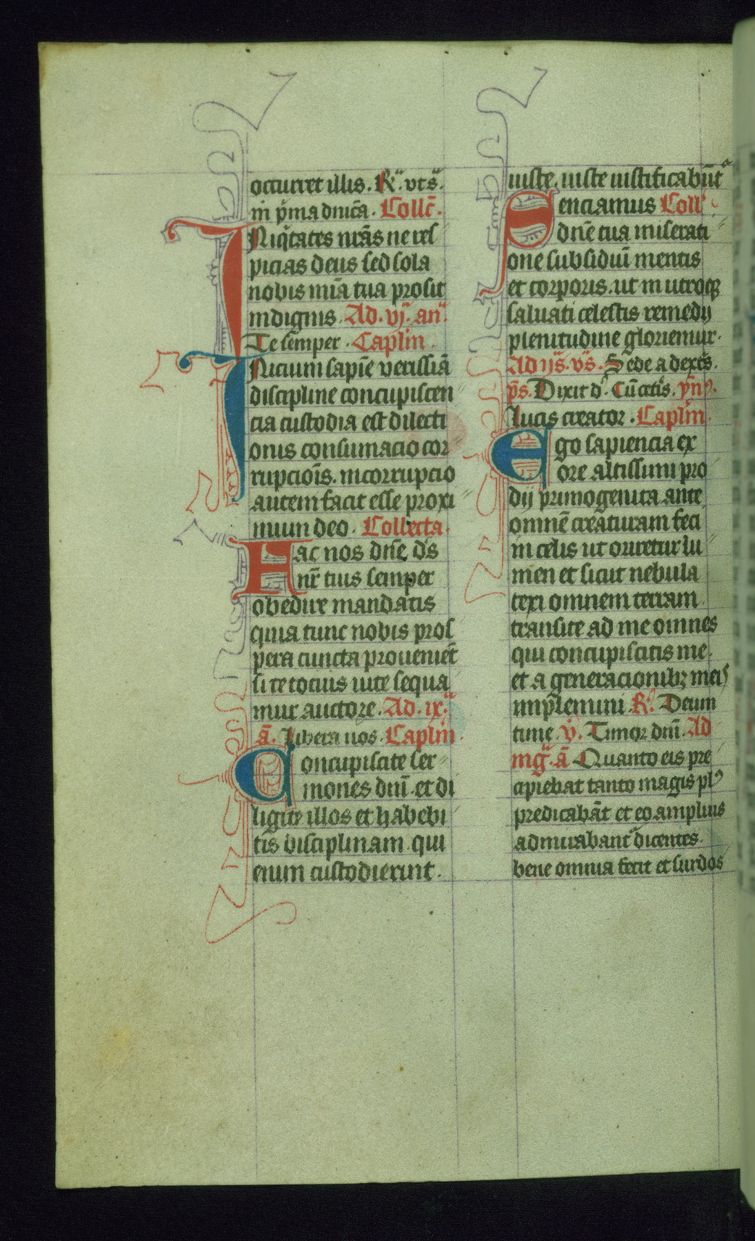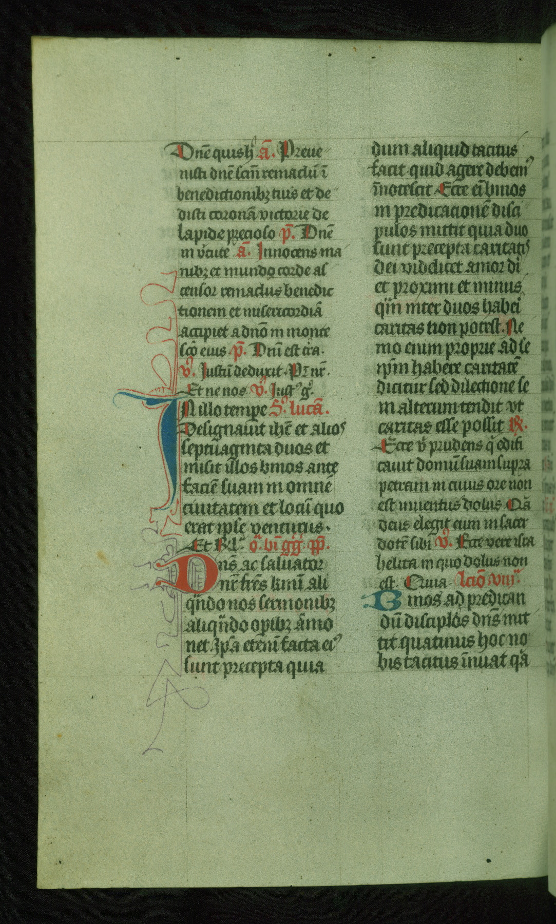 This small breviary, composed of more than 500 folios, is extraordinary for its length, considering it is the summer portion of a two-volume breviary for the use of Liège. The manuscript was completed for ecclesiastical use at the Cathedral of Notre-Dame and St.-Lambert in Liège ca. 1420. This attribution is suggested, for instance, by the petitions to the congregation of this cathedral (fols. 114v-117v), as well as the armorial shield of the family of Surlet de Chokier of Liège represented at the opening of the Psalms. The manuscript has modest, but interesting, decoration with historiated and decorated initials marking the liturgical texts, and occasional angels playing instruments in the margins. The most notable pictorial effect is found in the initials inhabited by transparent figures on rich blue ground. The technique is found, for instance, on fol. 156r with the gold monstrance held by translucent angels for the feast of the Corpus Christi.