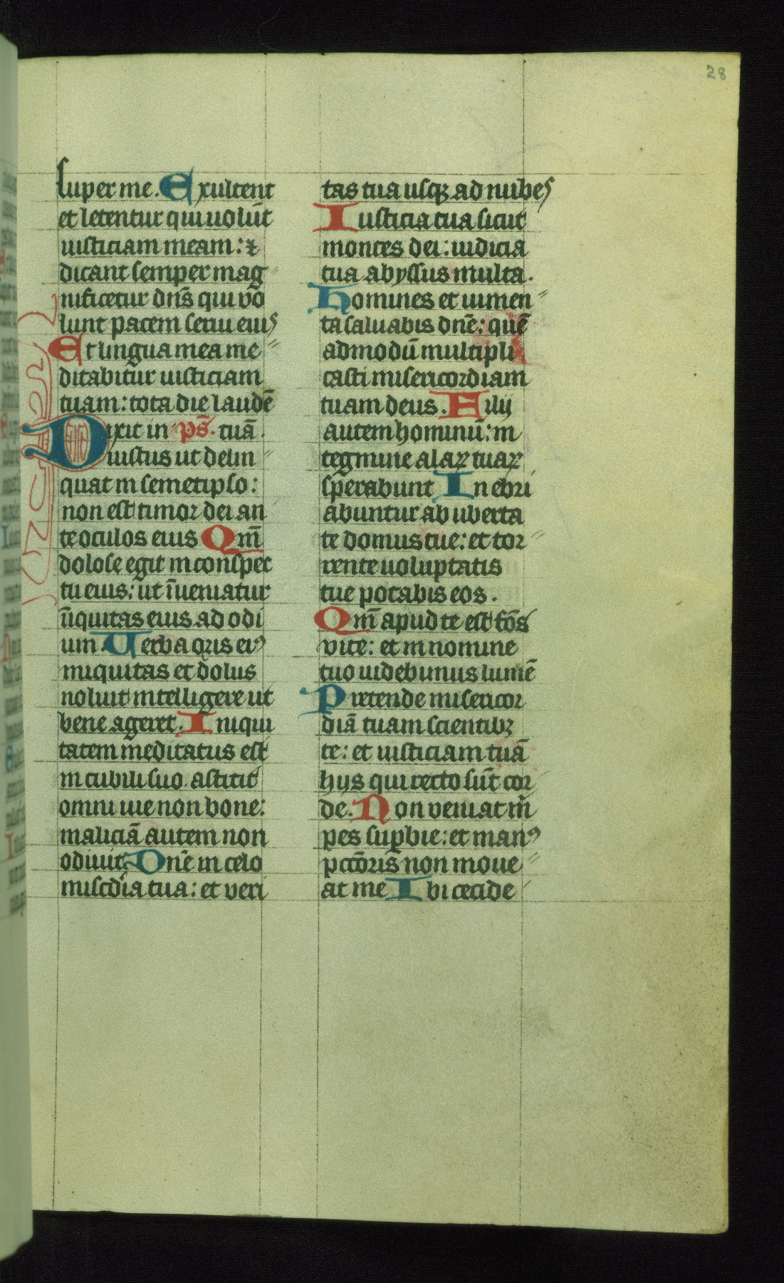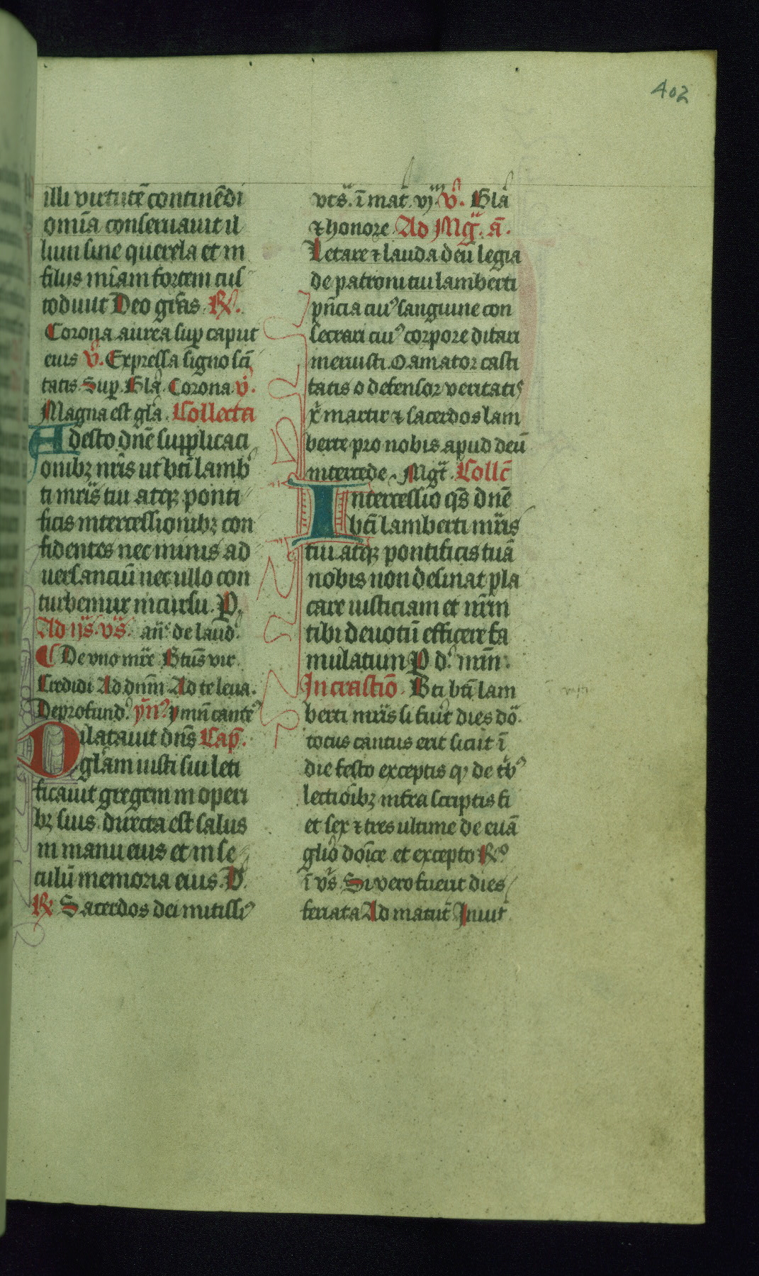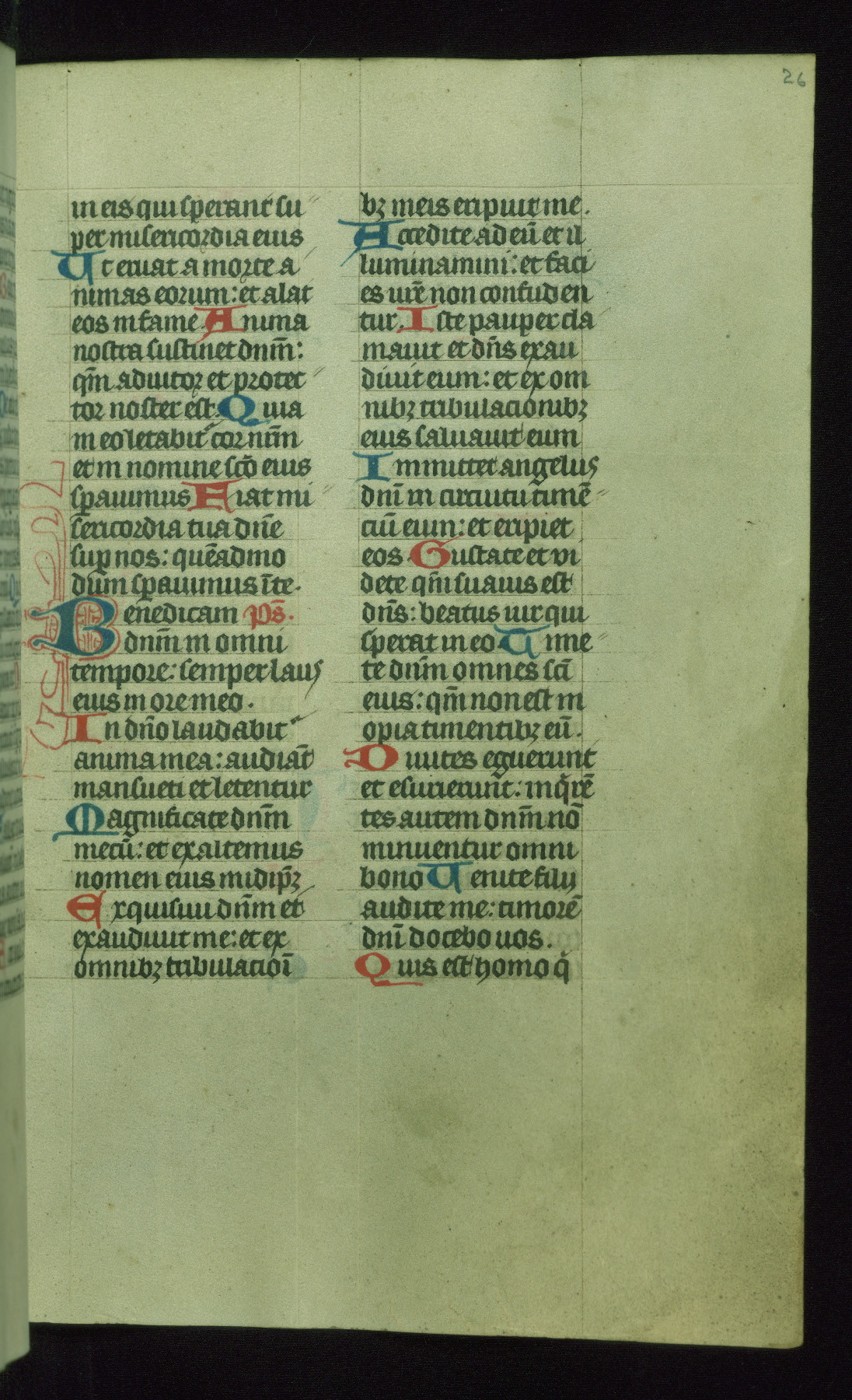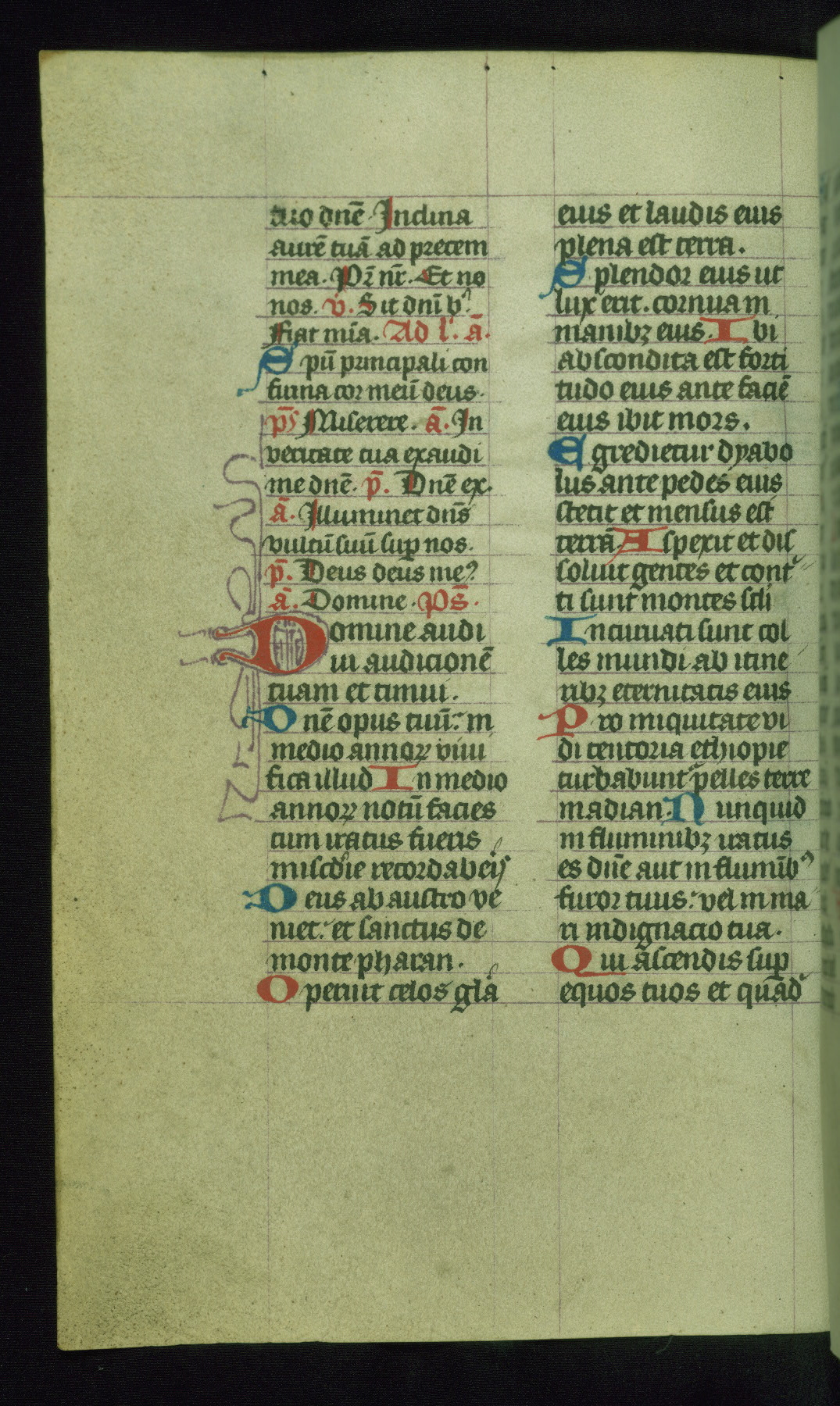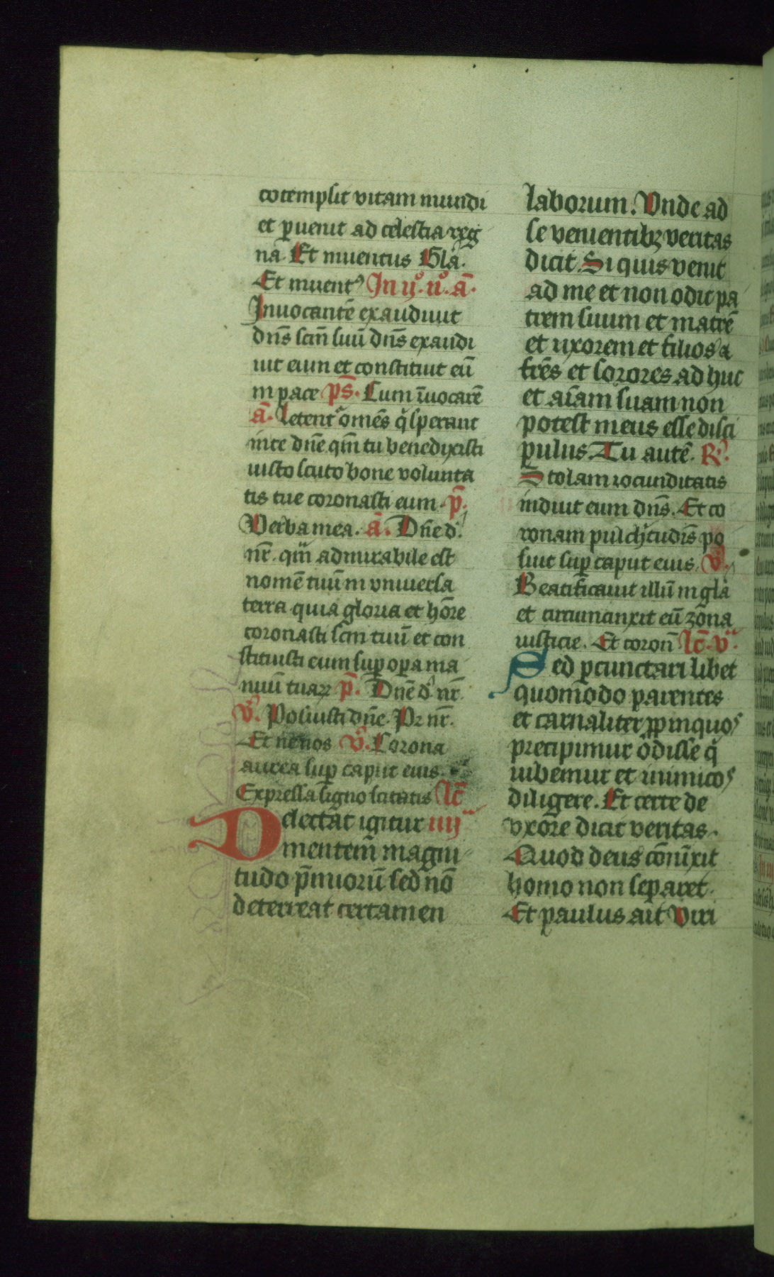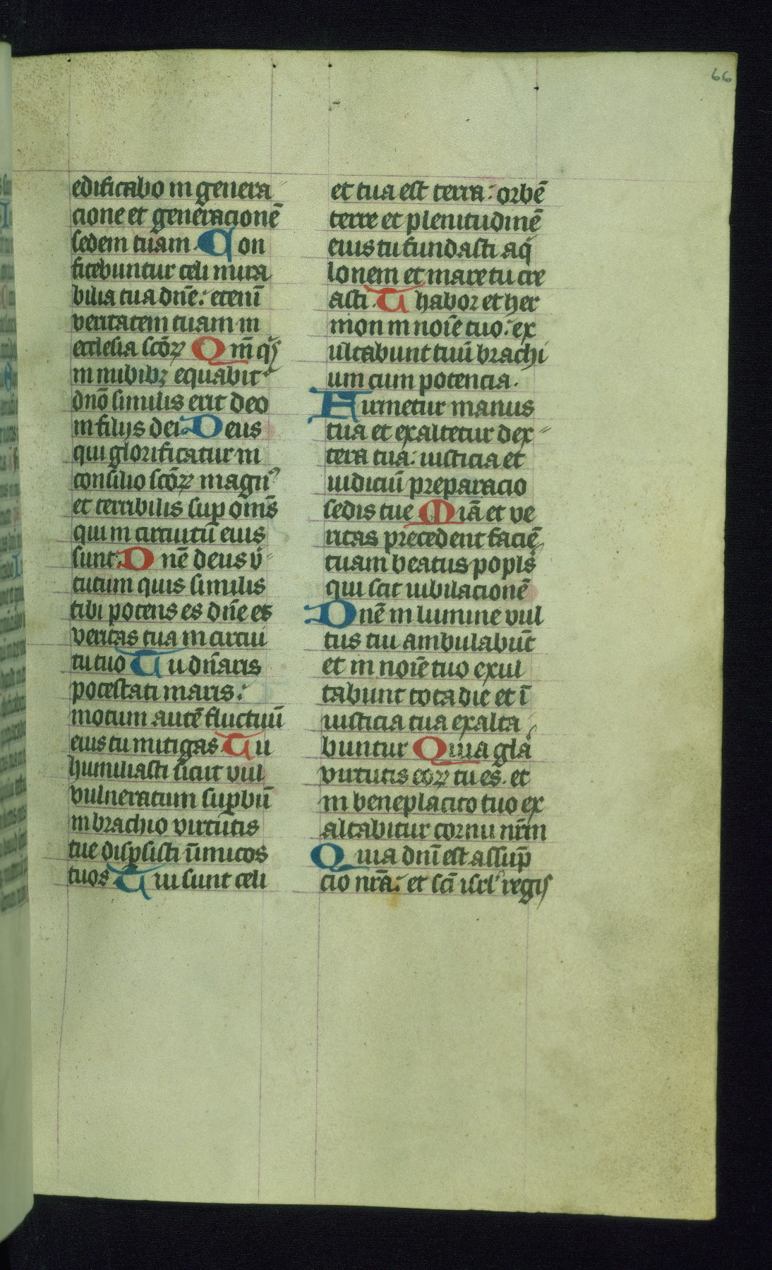 This small breviary, composed of more than 500 folios, is extraordinary for its length, considering it is the summer portion of a two-volume breviary for the use of Liège. The manuscript was completed for ecclesiastical use at the Cathedral of Notre-Dame and St.-Lambert in Liège ca. 1420. This attribution is suggested, for instance, by the petitions to the congregation of this cathedral (fols. 114v-117v), as well as the armorial shield of the family of Surlet de Chokier of Liège represented at the opening of the Psalms. The manuscript has modest, but interesting, decoration with historiated and decorated initials marking the liturgical texts, and occasional angels playing instruments in the margins. The most notable pictorial effect is found in the initials inhabited by transparent figures on rich blue ground. The technique is found, for instance, on fol. 156r with the gold monstrance held by translucent angels for the feast of the Corpus Christi.