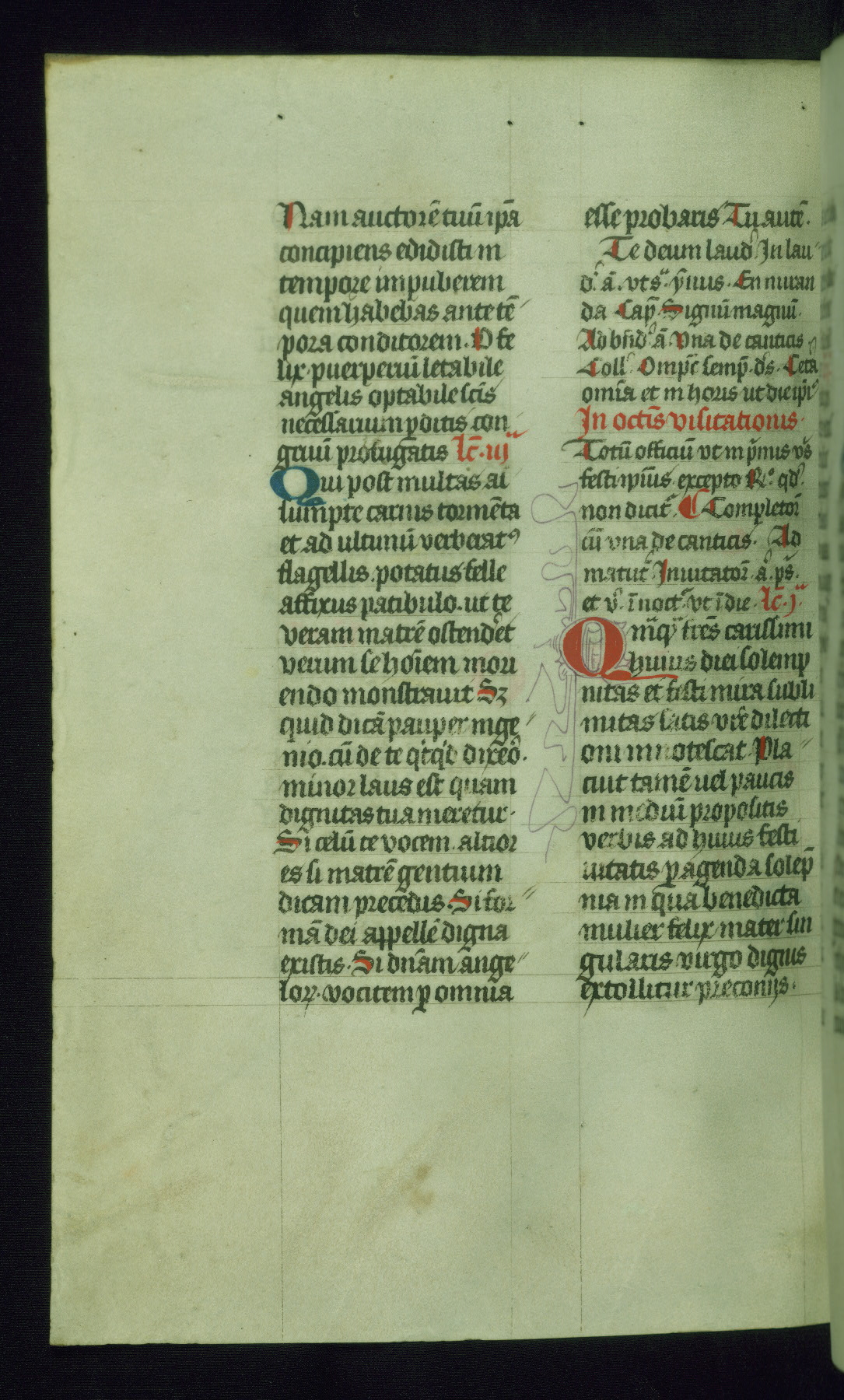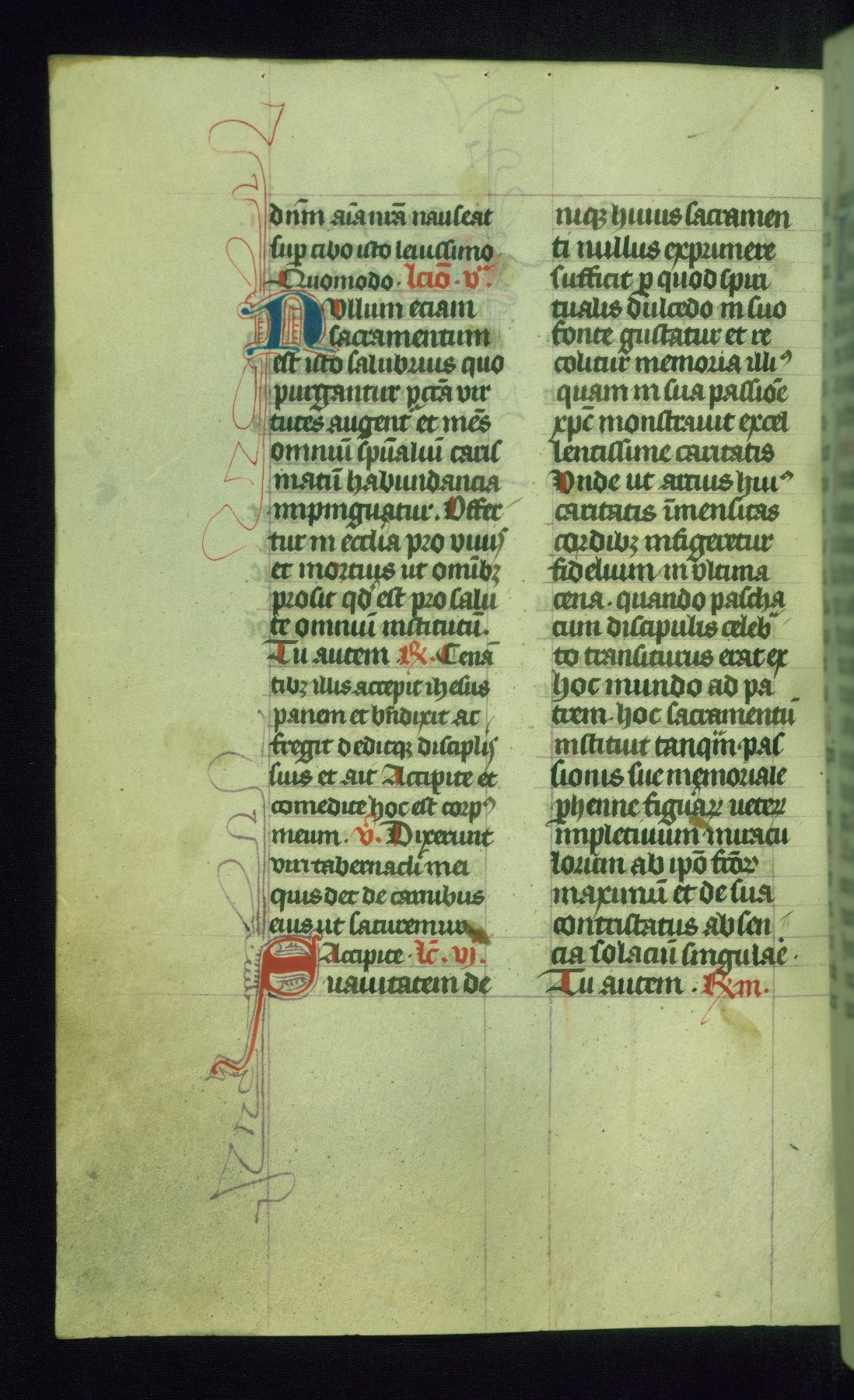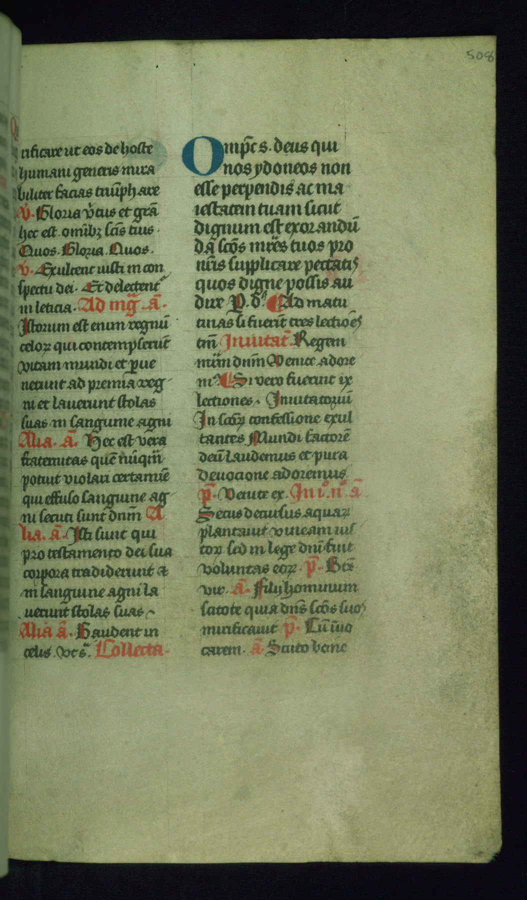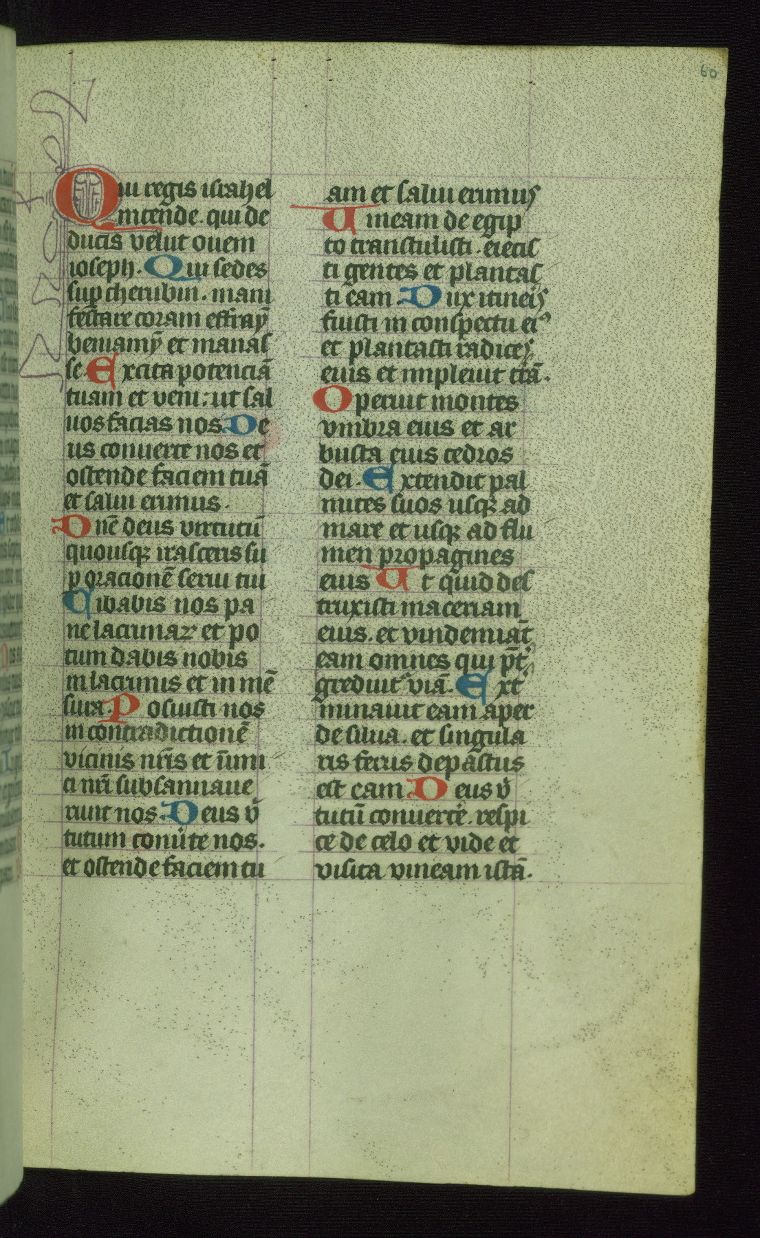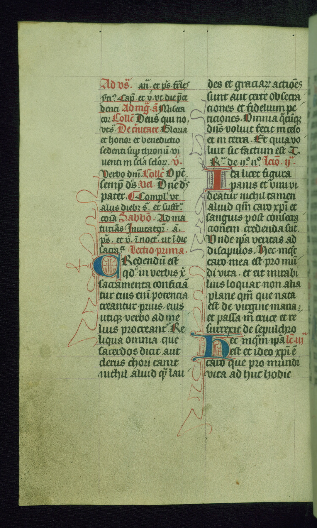 This small breviary, composed of more than 500 folios, is extraordinary for its length, considering it is the summer portion of a two-volume breviary for the use of Liège. The manuscript was completed for ecclesiastical use at the Cathedral of Notre-Dame and St.-Lambert in Liège ca. 1420. This attribution is suggested, for instance, by the petitions to the congregation of this cathedral (fols. 114v-117v), as well as the armorial shield of the family of Surlet de Chokier of Liège represented at the opening of the Psalms. The manuscript has modest, but interesting, decoration with historiated and decorated initials marking the liturgical texts, and occasional angels playing instruments in the margins. The most notable pictorial effect is found in the initials inhabited by transparent figures on rich blue ground. The technique is found, for instance, on fol. 156r with the gold monstrance held by translucent angels for the feast of the Corpus Christi.
