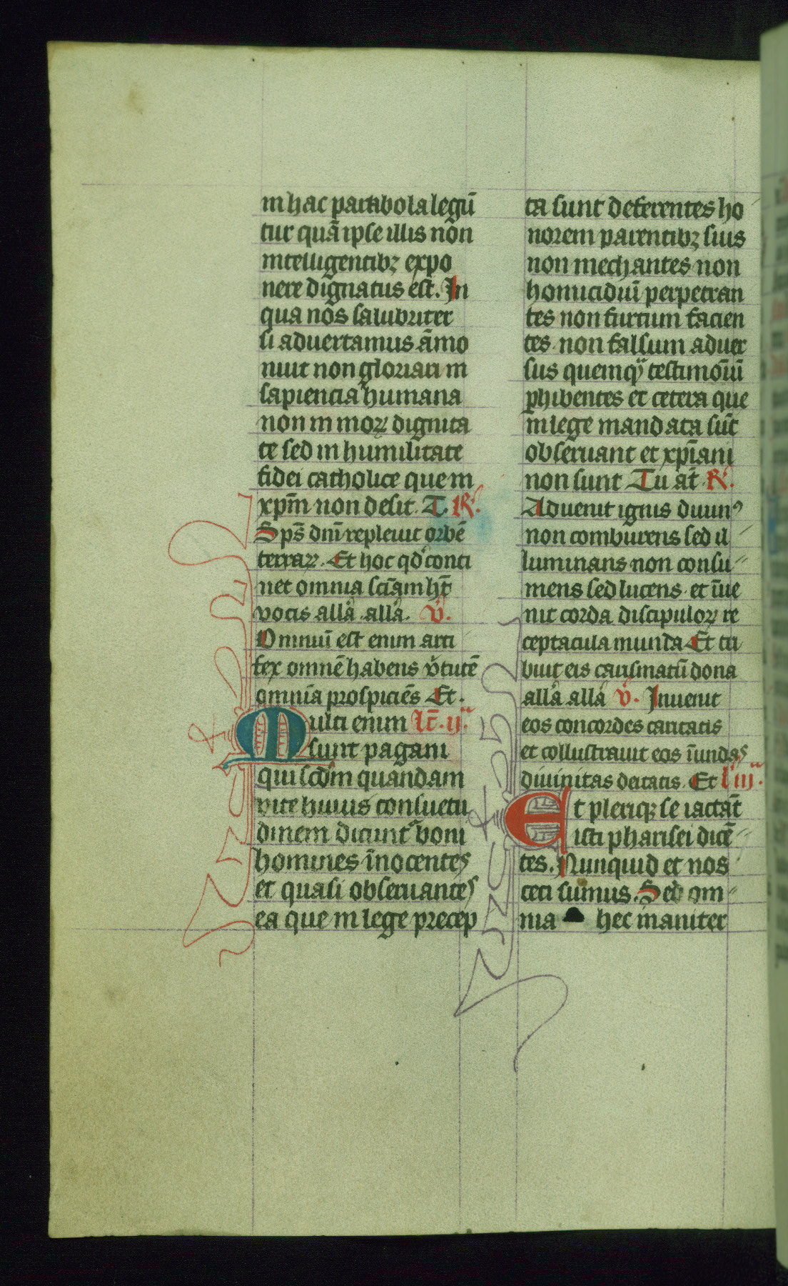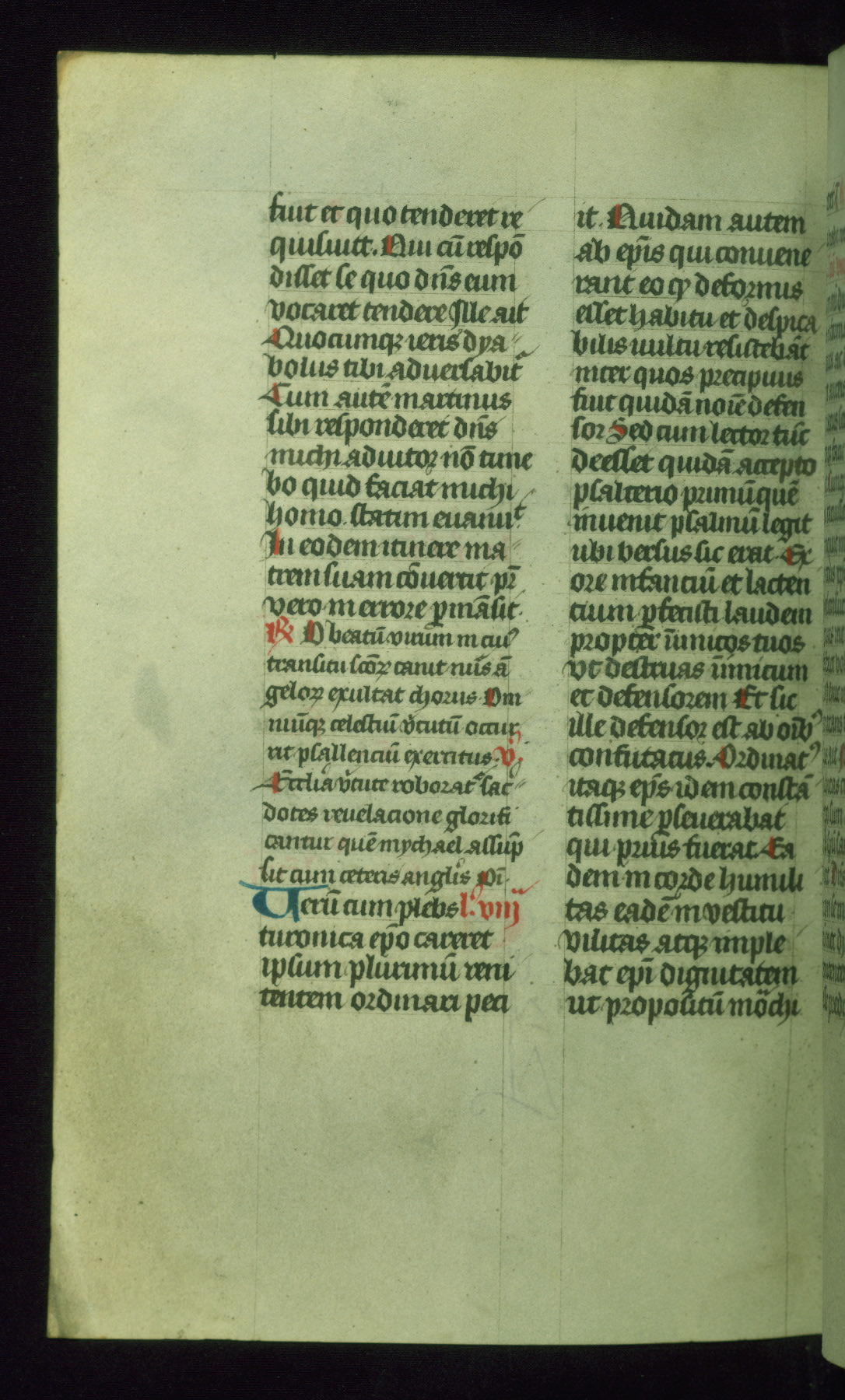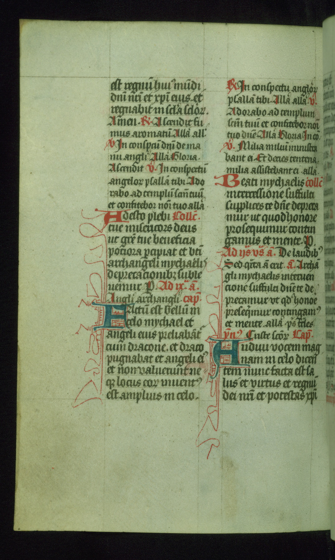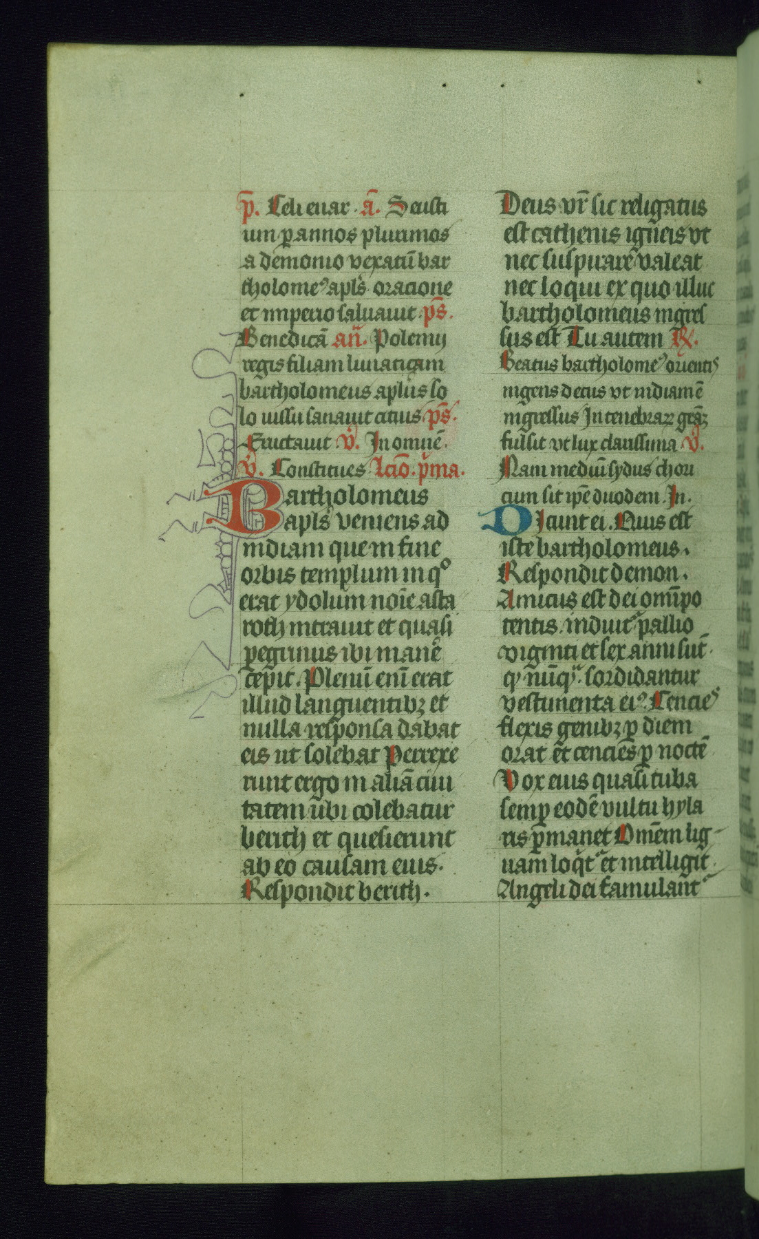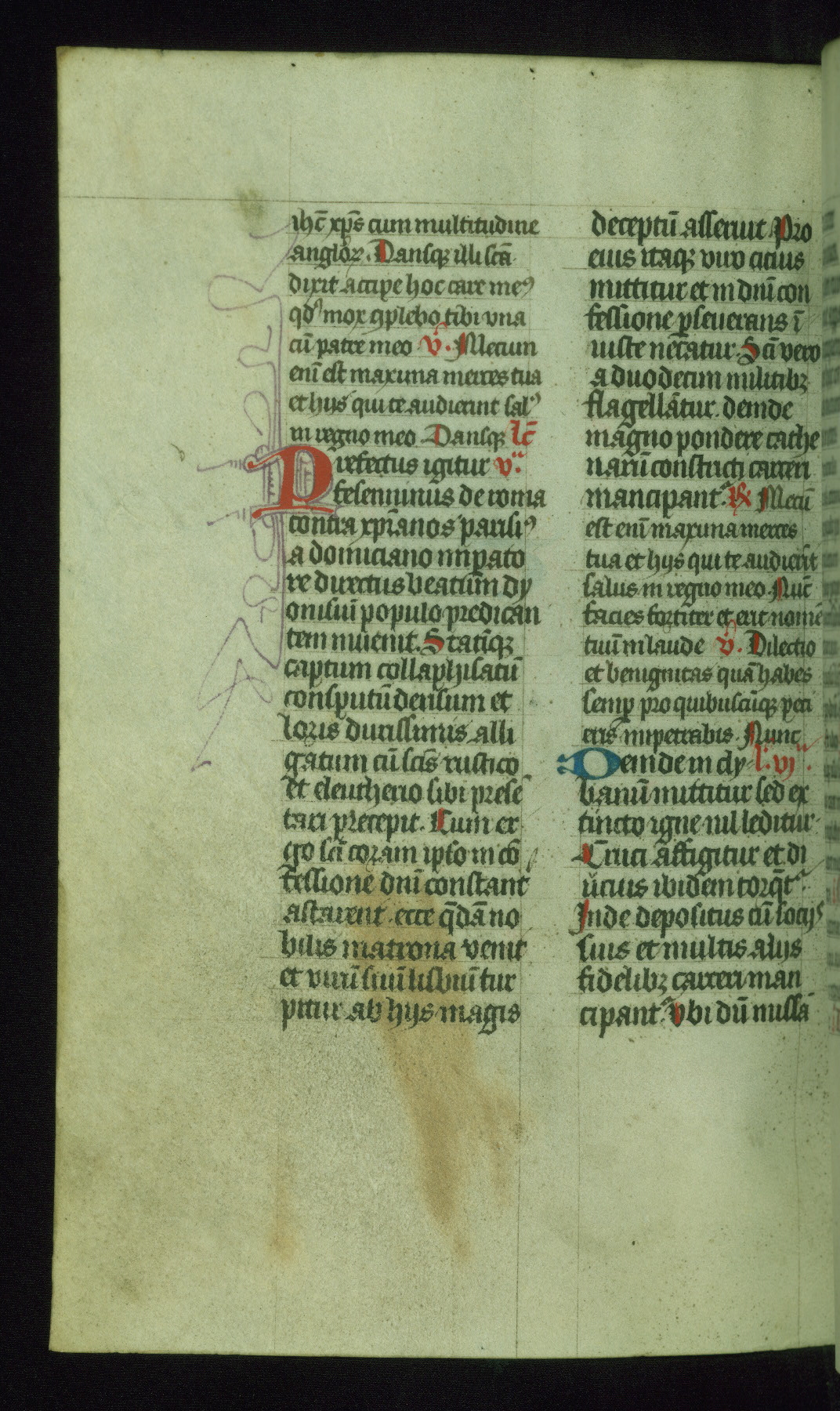 This small breviary, composed of more than 500 folios, is extraordinary for its length, considering it is the summer portion of a two-volume breviary for the use of Liège. The manuscript was completed for ecclesiastical use at the Cathedral of Notre-Dame and St.-Lambert in Liège ca. 1420. This attribution is suggested, for instance, by the petitions to the congregation of this cathedral (fols. 114v-117v), as well as the armorial shield of the family of Surlet de Chokier of Liège represented at the opening of the Psalms. The manuscript has modest, but interesting, decoration with historiated and decorated initials marking the liturgical texts, and occasional angels playing instruments in the margins. The most notable pictorial effect is found in the initials inhabited by transparent figures on rich blue ground. The technique is found, for instance, on fol. 156r with the gold monstrance held by translucent angels for the feast of the Corpus Christi.
