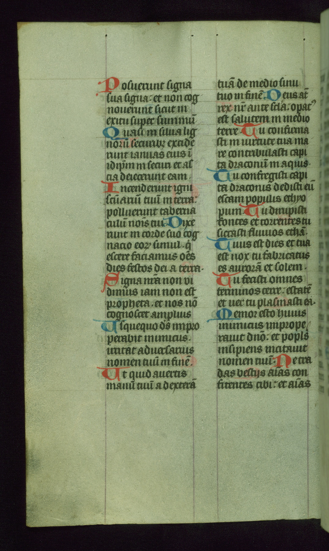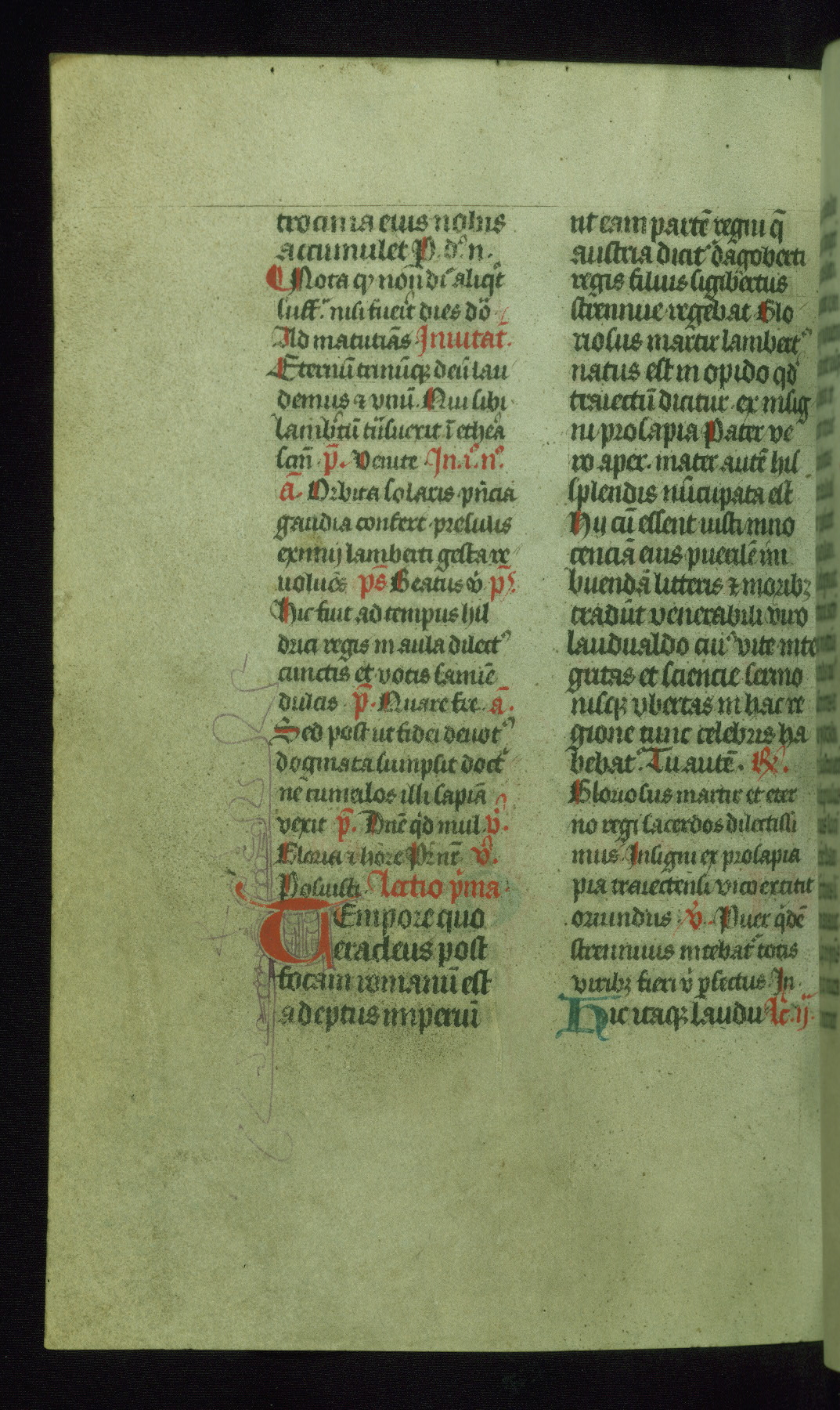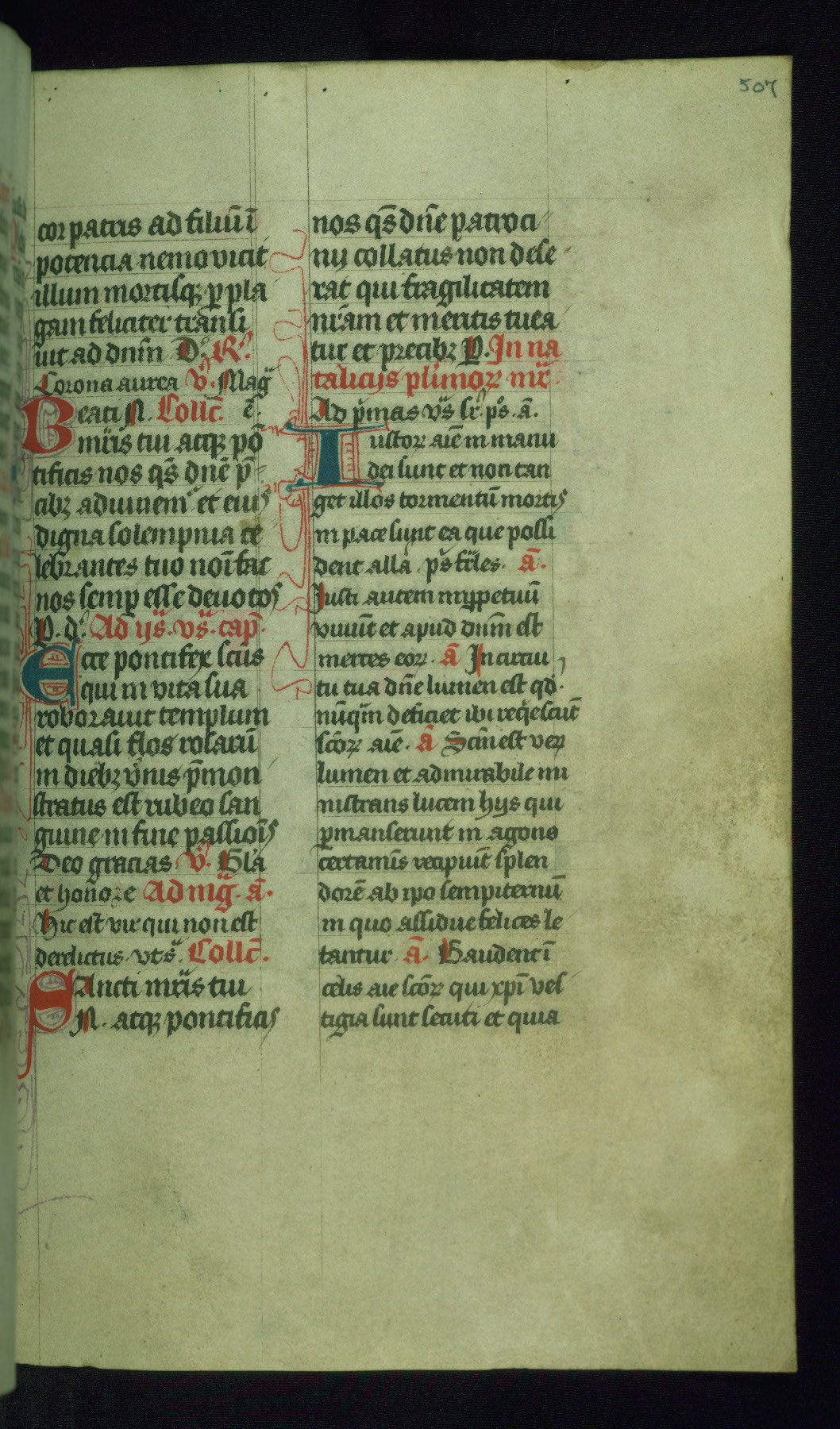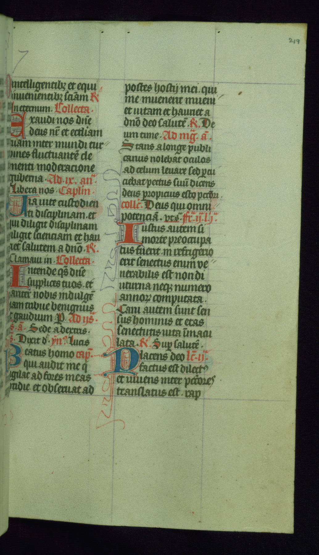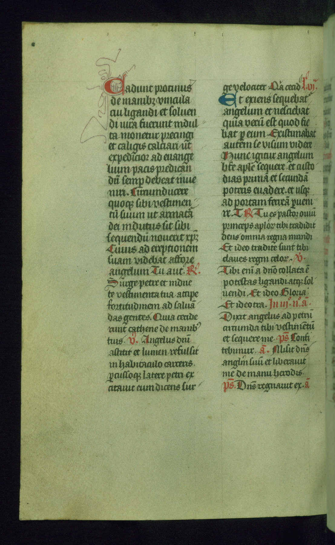 This small breviary, composed of more than 500 folios, is extraordinary for its length, considering it is the summer portion of a two-volume breviary for the use of Liège. The manuscript was completed for ecclesiastical use at the Cathedral of Notre-Dame and St.-Lambert in Liège ca. 1420. This attribution is suggested, for instance, by the petitions to the congregation of this cathedral (fols. 114v-117v), as well as the armorial shield of the family of Surlet de Chokier of Liège represented at the opening of the Psalms. The manuscript has modest, but interesting, decoration with historiated and decorated initials marking the liturgical texts, and occasional angels playing instruments in the margins. The most notable pictorial effect is found in the initials inhabited by transparent figures on rich blue ground. The technique is found, for instance, on fol. 156r with the gold monstrance held by translucent angels for the feast of the Corpus Christi.