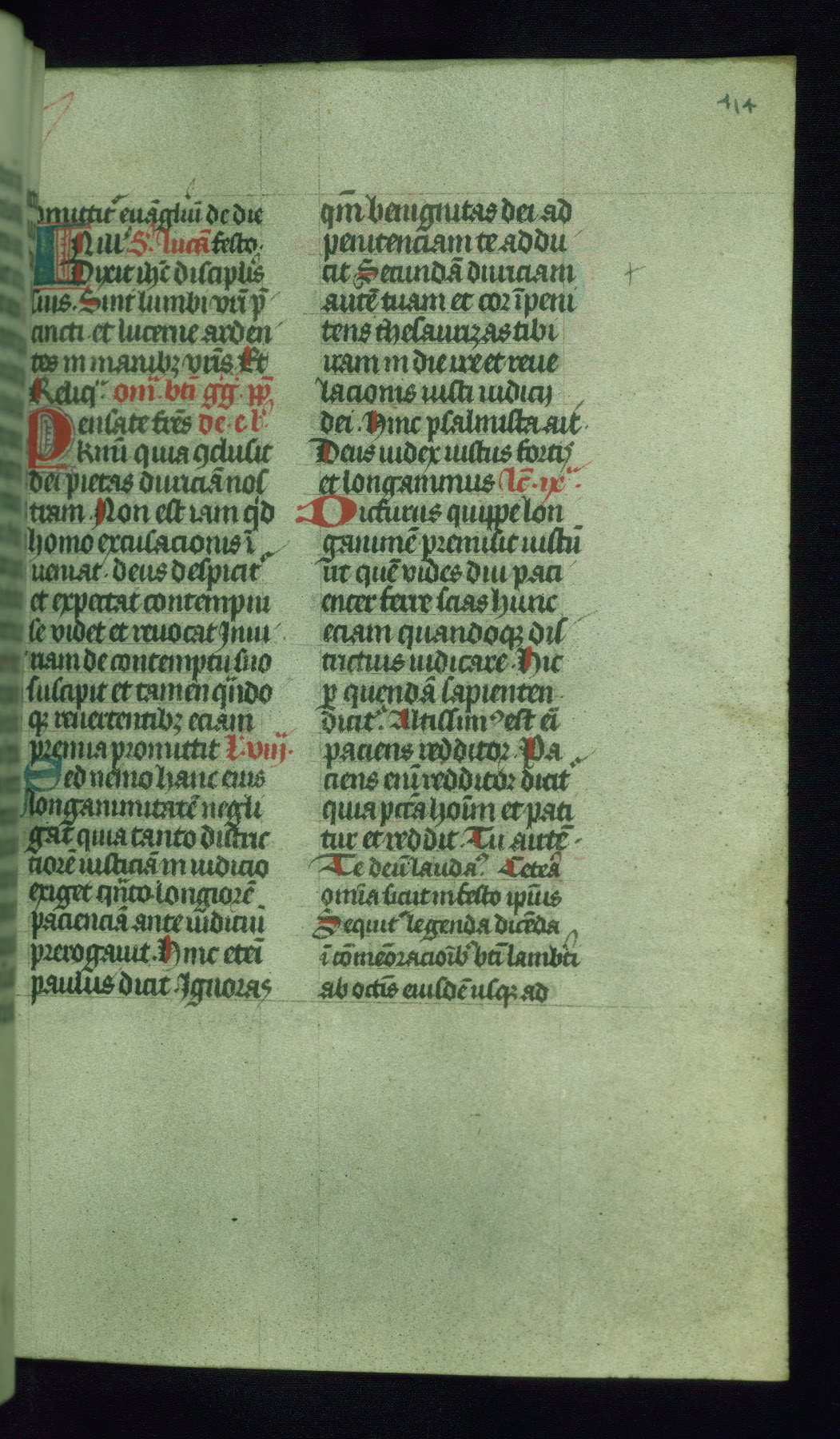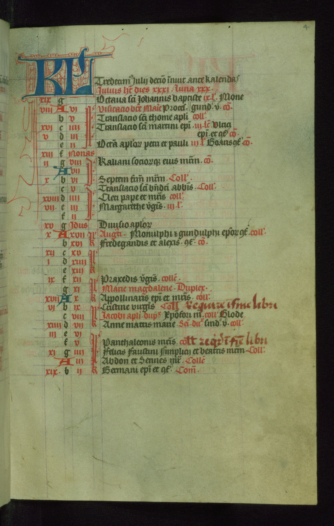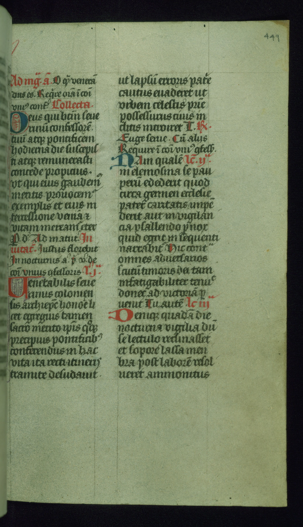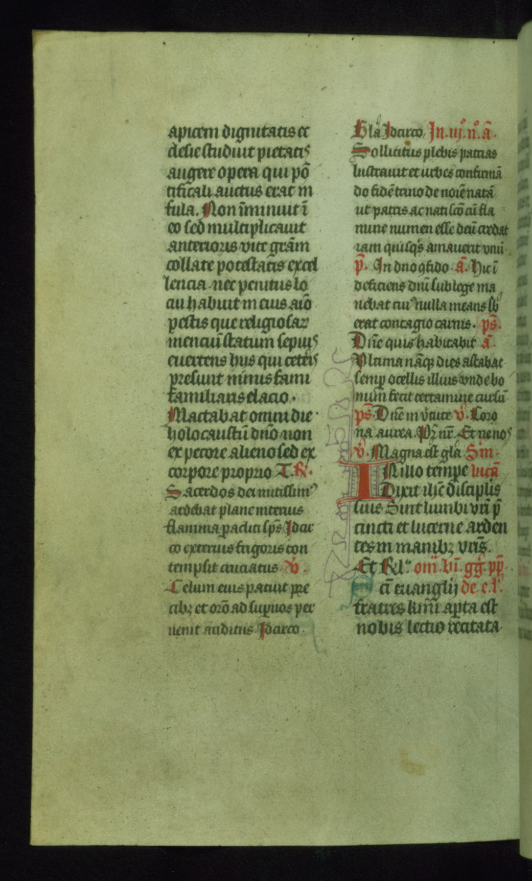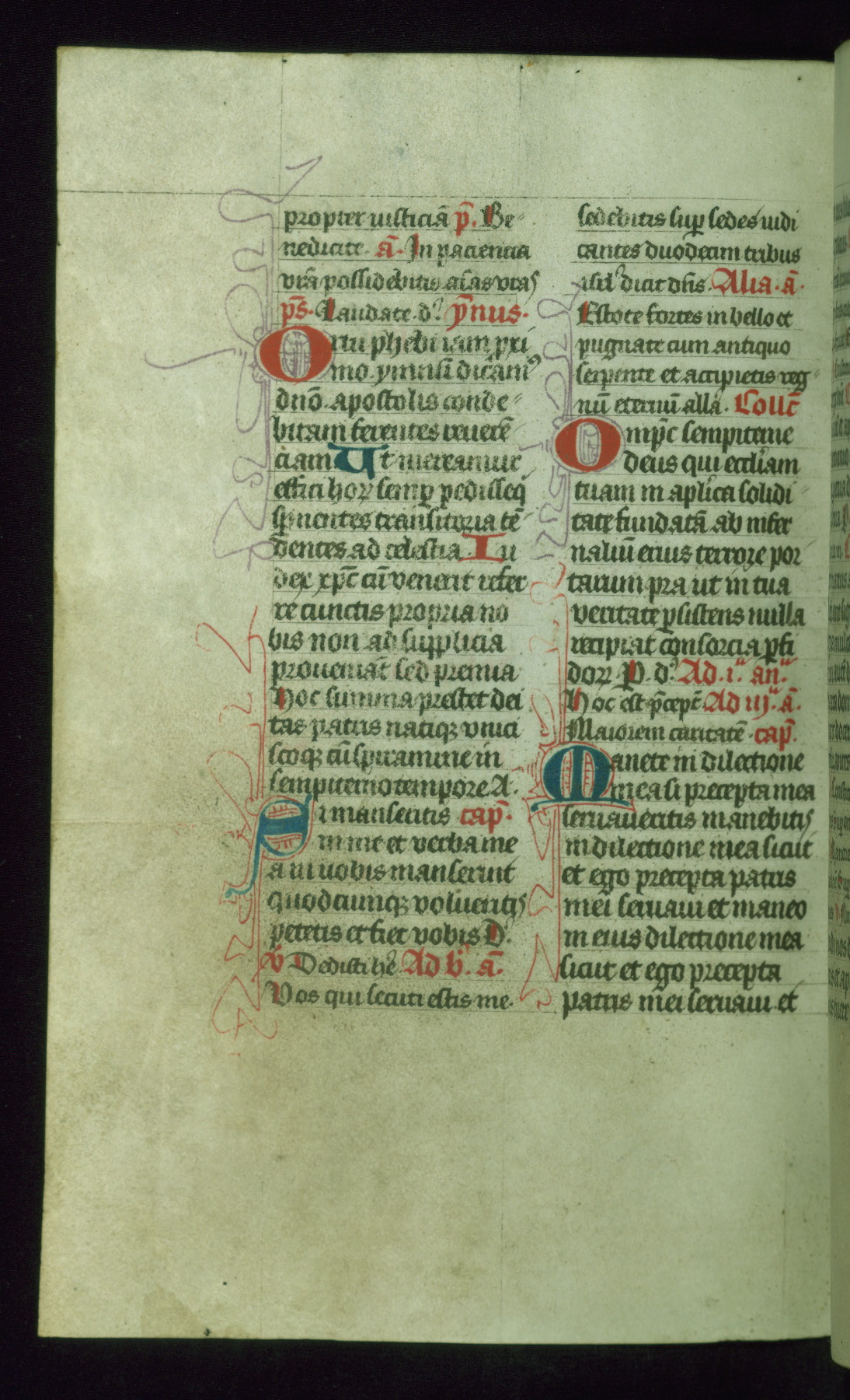 This small breviary, composed of more than 500 folios, is extraordinary for its length, considering it is the summer portion of a two-volume breviary for the use of Liège. The manuscript was completed for ecclesiastical use at the Cathedral of Notre-Dame and St.-Lambert in Liège ca. 1420. This attribution is suggested, for instance, by the petitions to the congregation of this cathedral (fols. 114v-117v), as well as the armorial shield of the family of Surlet de Chokier of Liège represented at the opening of the Psalms. The manuscript has modest, but interesting, decoration with historiated and decorated initials marking the liturgical texts, and occasional angels playing instruments in the margins. The most notable pictorial effect is found in the initials inhabited by transparent figures on rich blue ground. The technique is found, for instance, on fol. 156r with the gold monstrance held by translucent angels for the feast of the Corpus Christi.