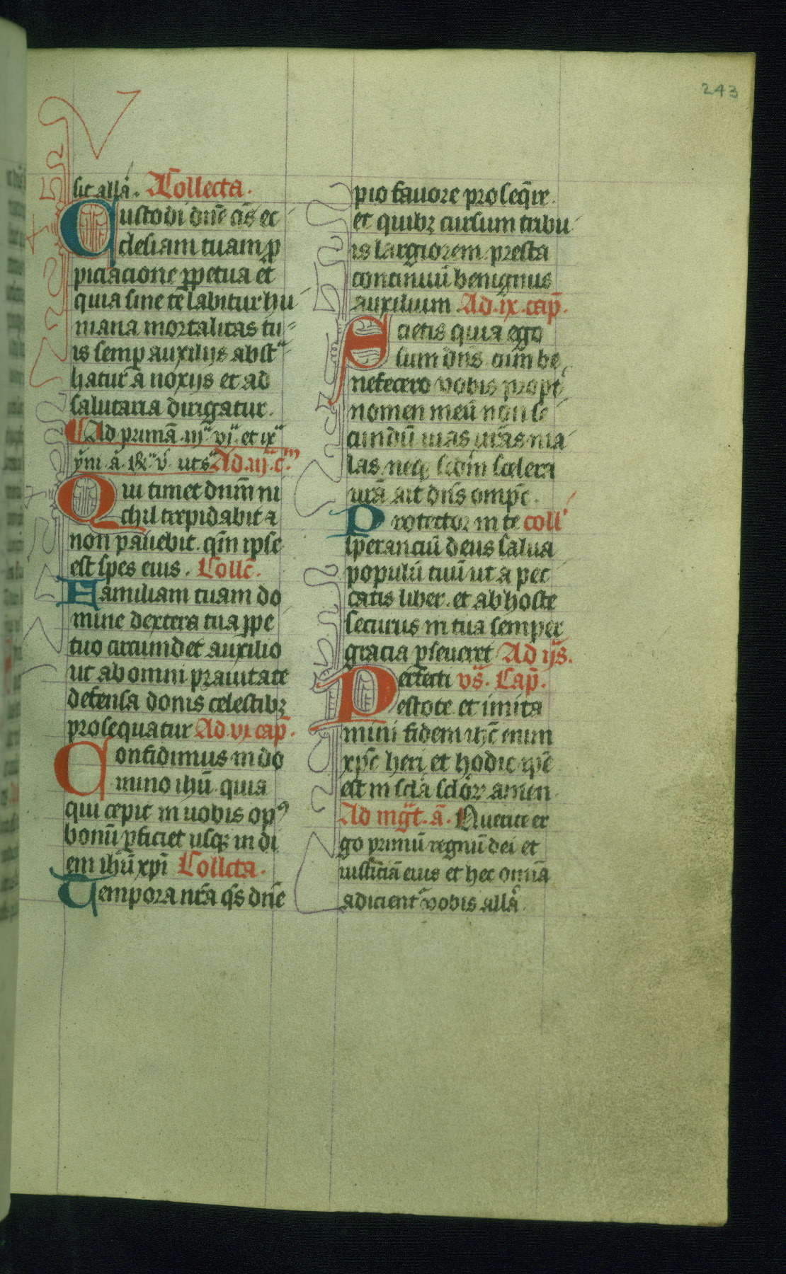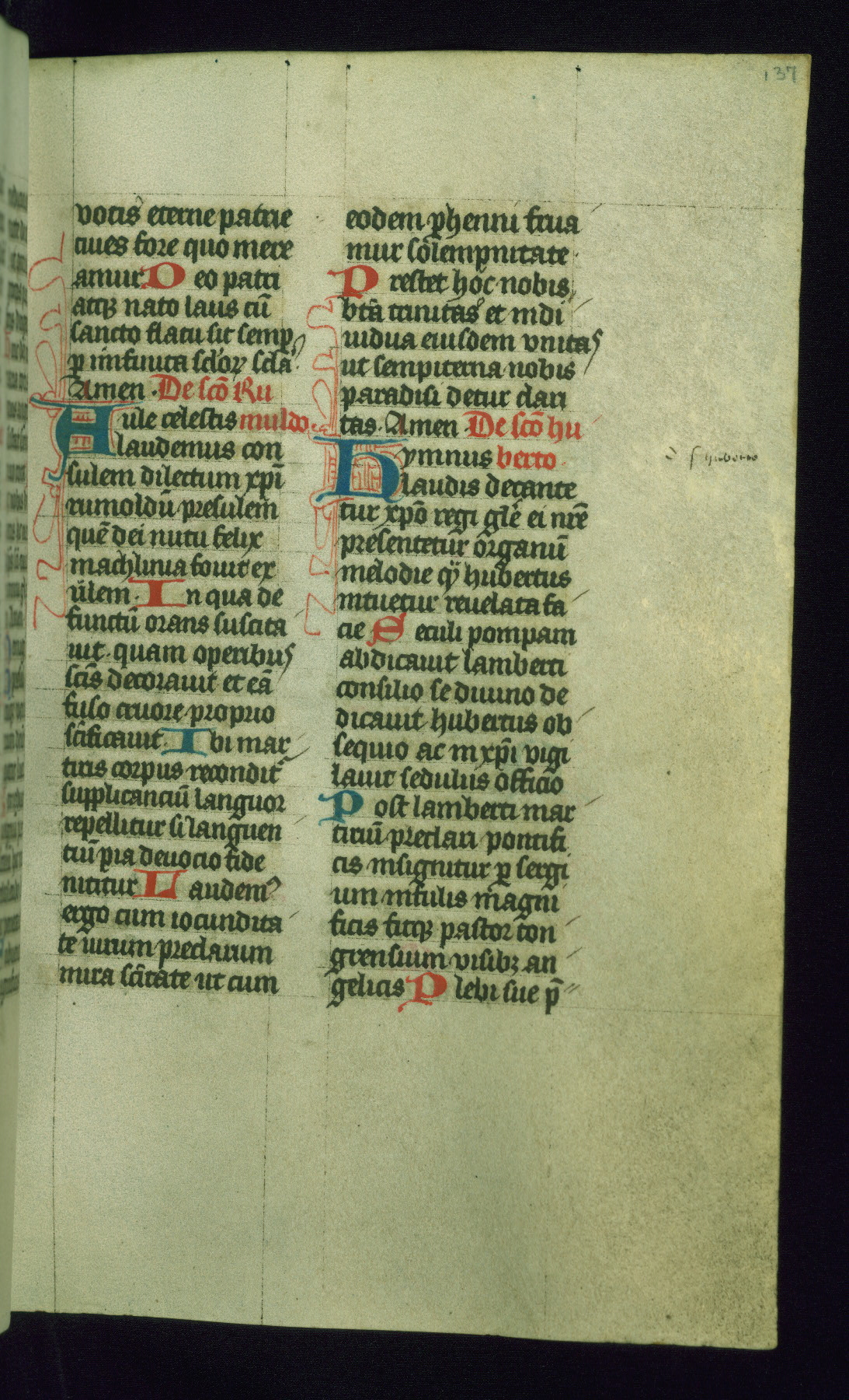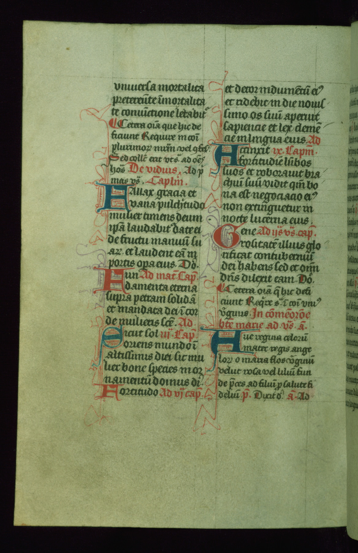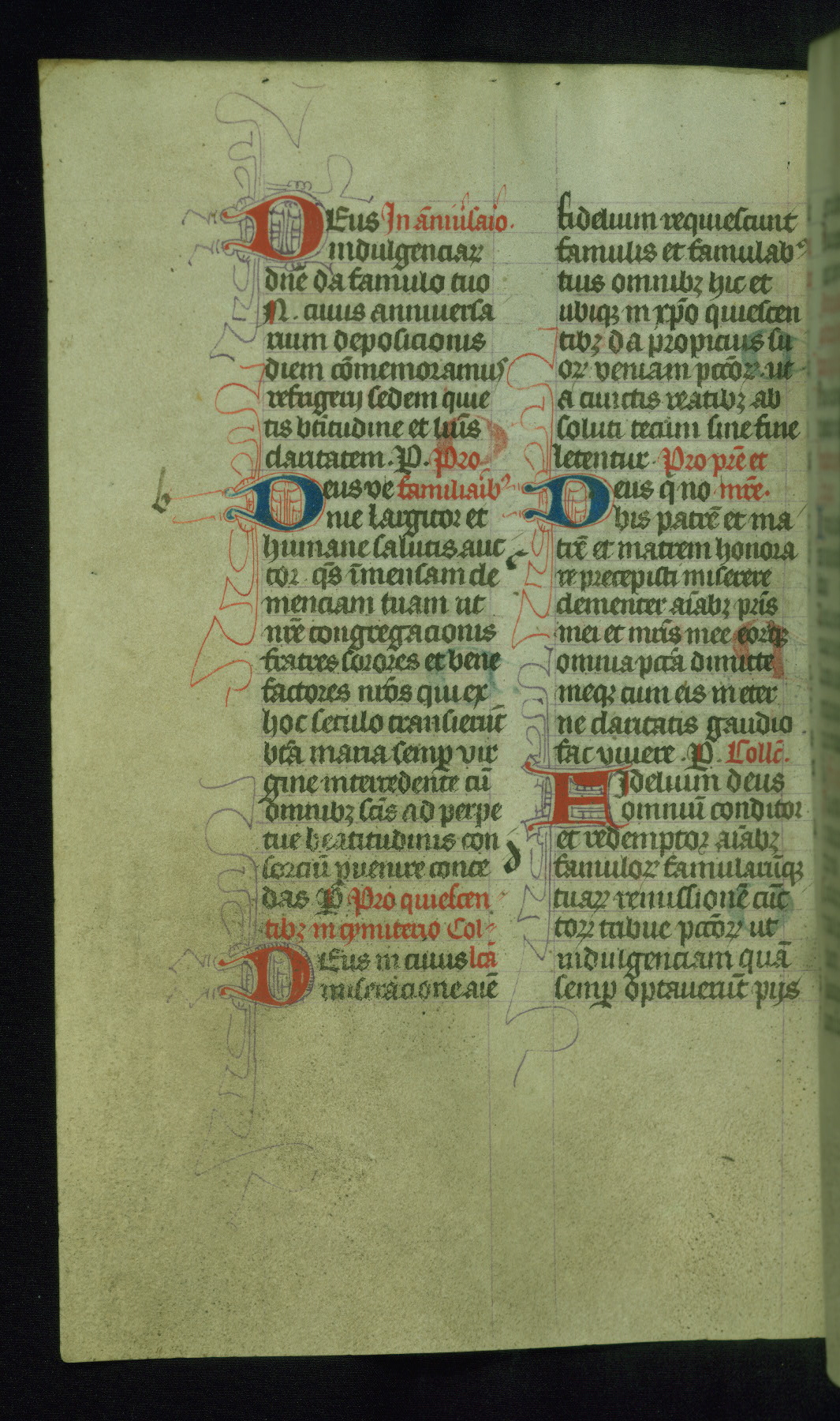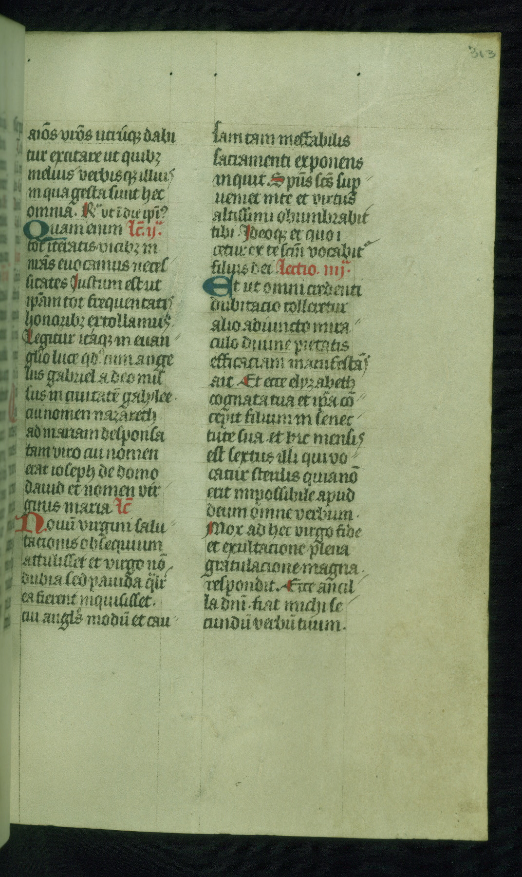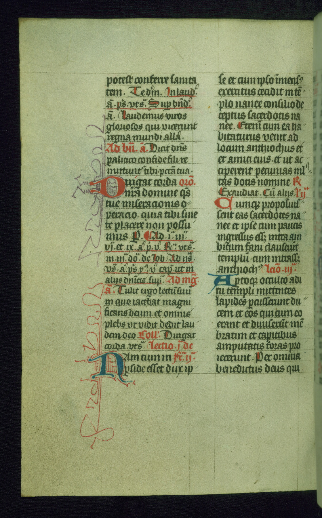 This small breviary, composed of more than 500 folios, is extraordinary for its length, considering it is the summer portion of a two-volume breviary for the use of Liège. The manuscript was completed for ecclesiastical use at the Cathedral of Notre-Dame and St.-Lambert in Liège ca. 1420. This attribution is suggested, for instance, by the petitions to the congregation of this cathedral (fols. 114v-117v), as well as the armorial shield of the family of Surlet de Chokier of Liège represented at the opening of the Psalms. The manuscript has modest, but interesting, decoration with historiated and decorated initials marking the liturgical texts, and occasional angels playing instruments in the margins. The most notable pictorial effect is found in the initials inhabited by transparent figures on rich blue ground. The technique is found, for instance, on fol. 156r with the gold monstrance held by translucent angels for the feast of the Corpus Christi.
