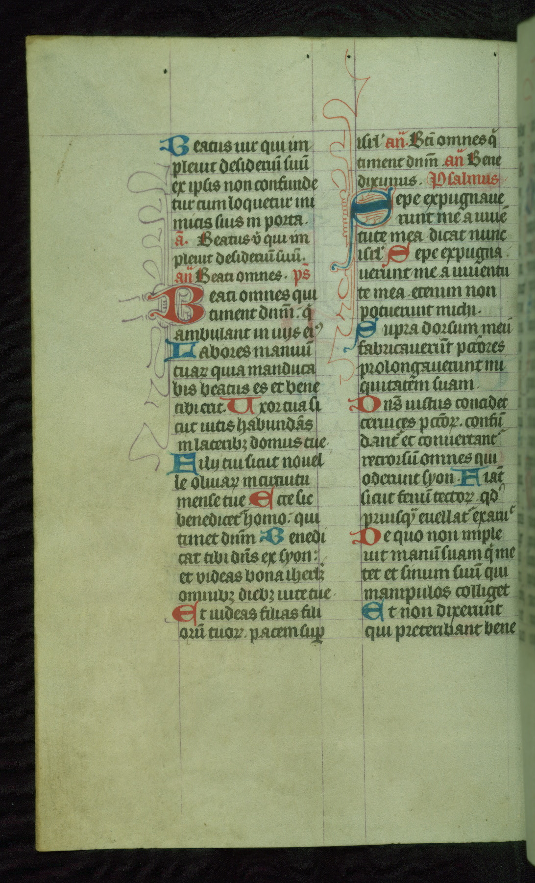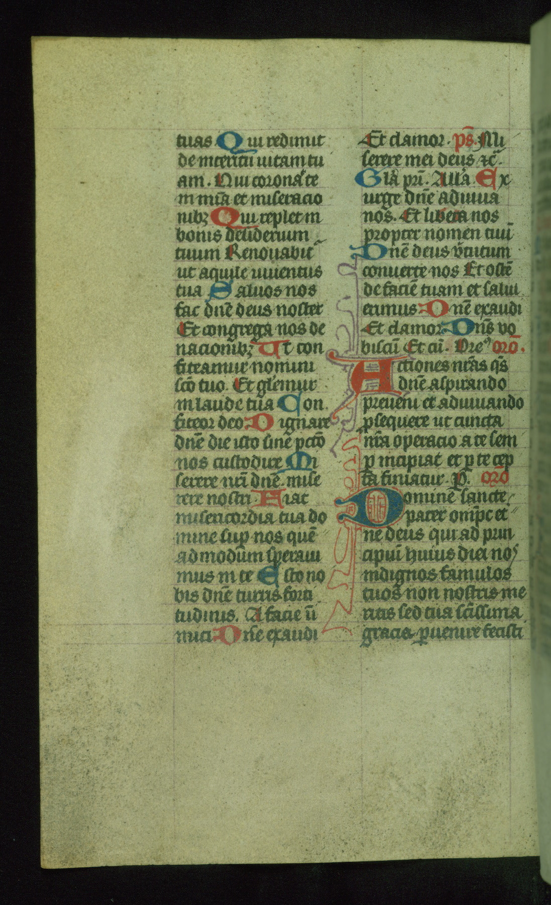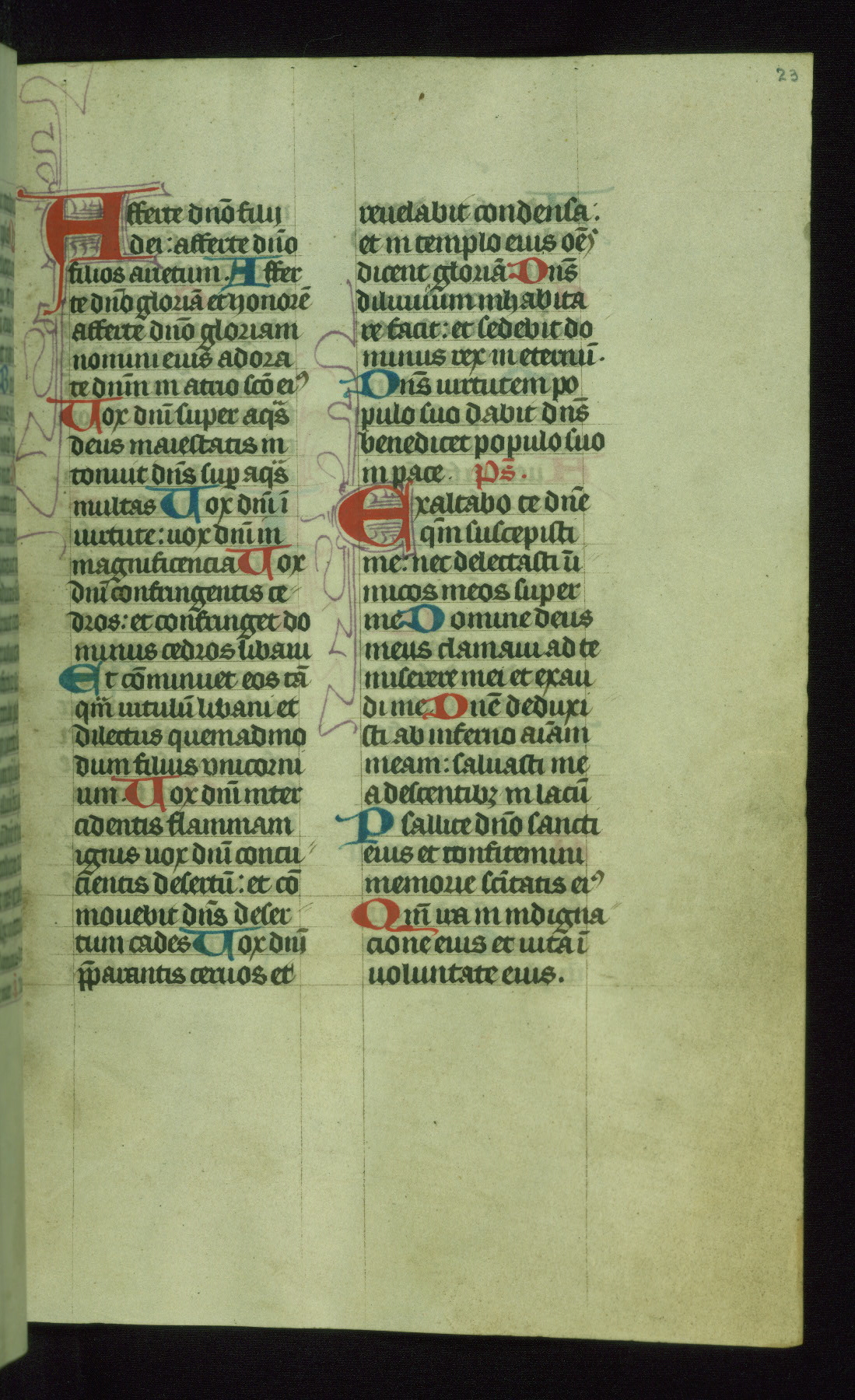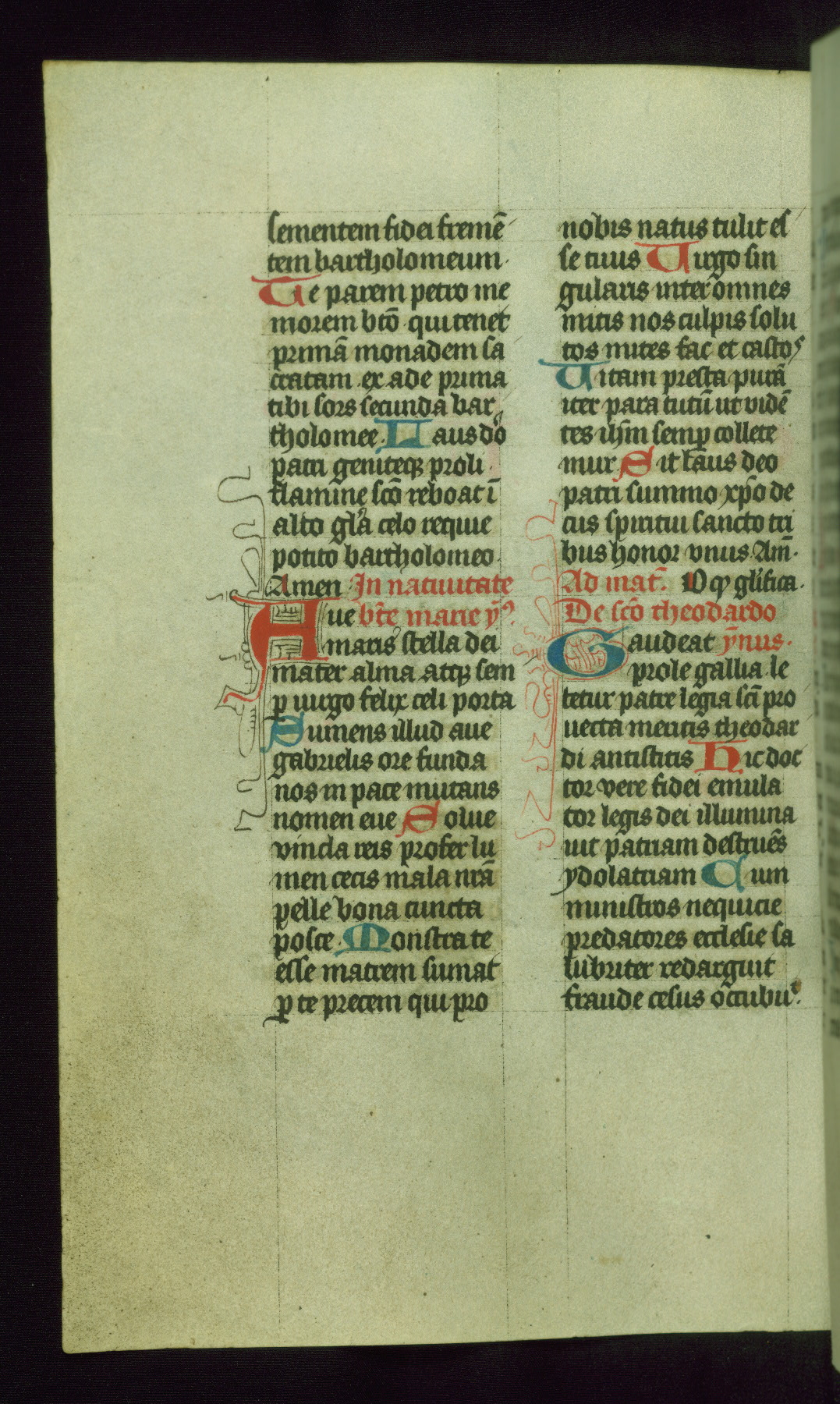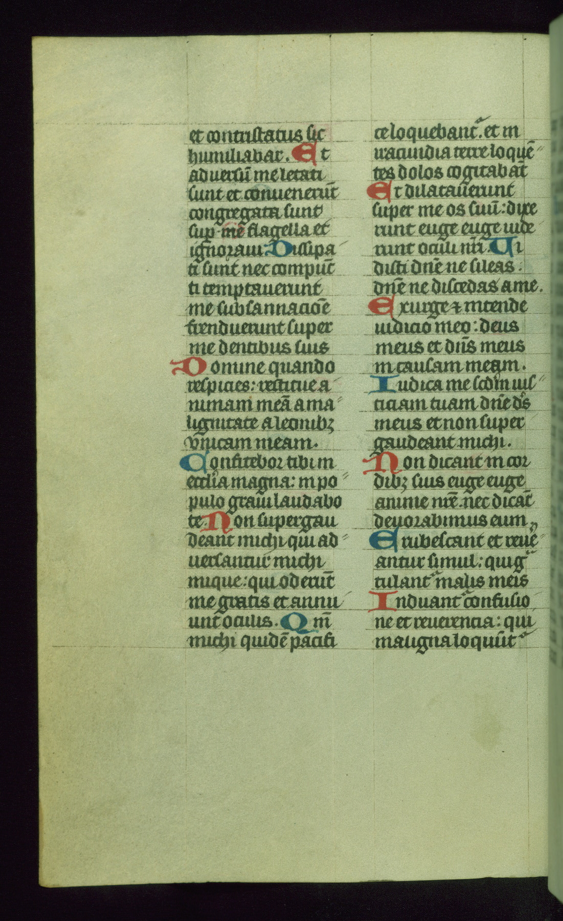 This small breviary, composed of more than 500 folios, is extraordinary for its length, considering it is the summer portion of a two-volume breviary for the use of Liège. The manuscript was completed for ecclesiastical use at the Cathedral of Notre-Dame and St.-Lambert in Liège ca. 1420. This attribution is suggested, for instance, by the petitions to the congregation of this cathedral (fols. 114v-117v), as well as the armorial shield of the family of Surlet de Chokier of Liège represented at the opening of the Psalms. The manuscript has modest, but interesting, decoration with historiated and decorated initials marking the liturgical texts, and occasional angels playing instruments in the margins. The most notable pictorial effect is found in the initials inhabited by transparent figures on rich blue ground. The technique is found, for instance, on fol. 156r with the gold monstrance held by translucent angels for the feast of the Corpus Christi.