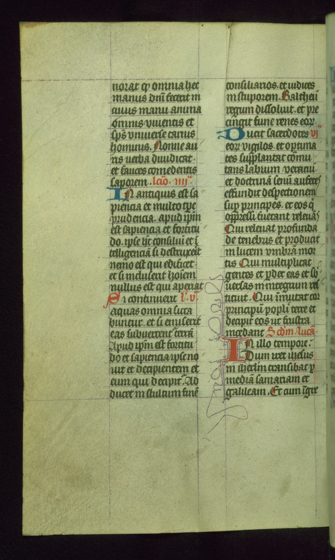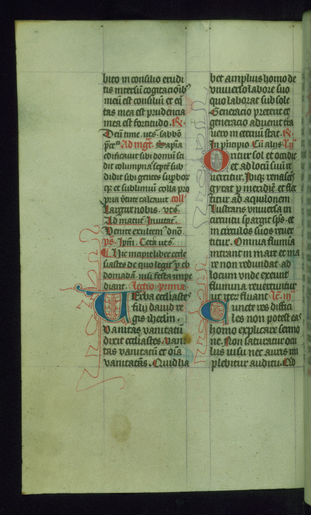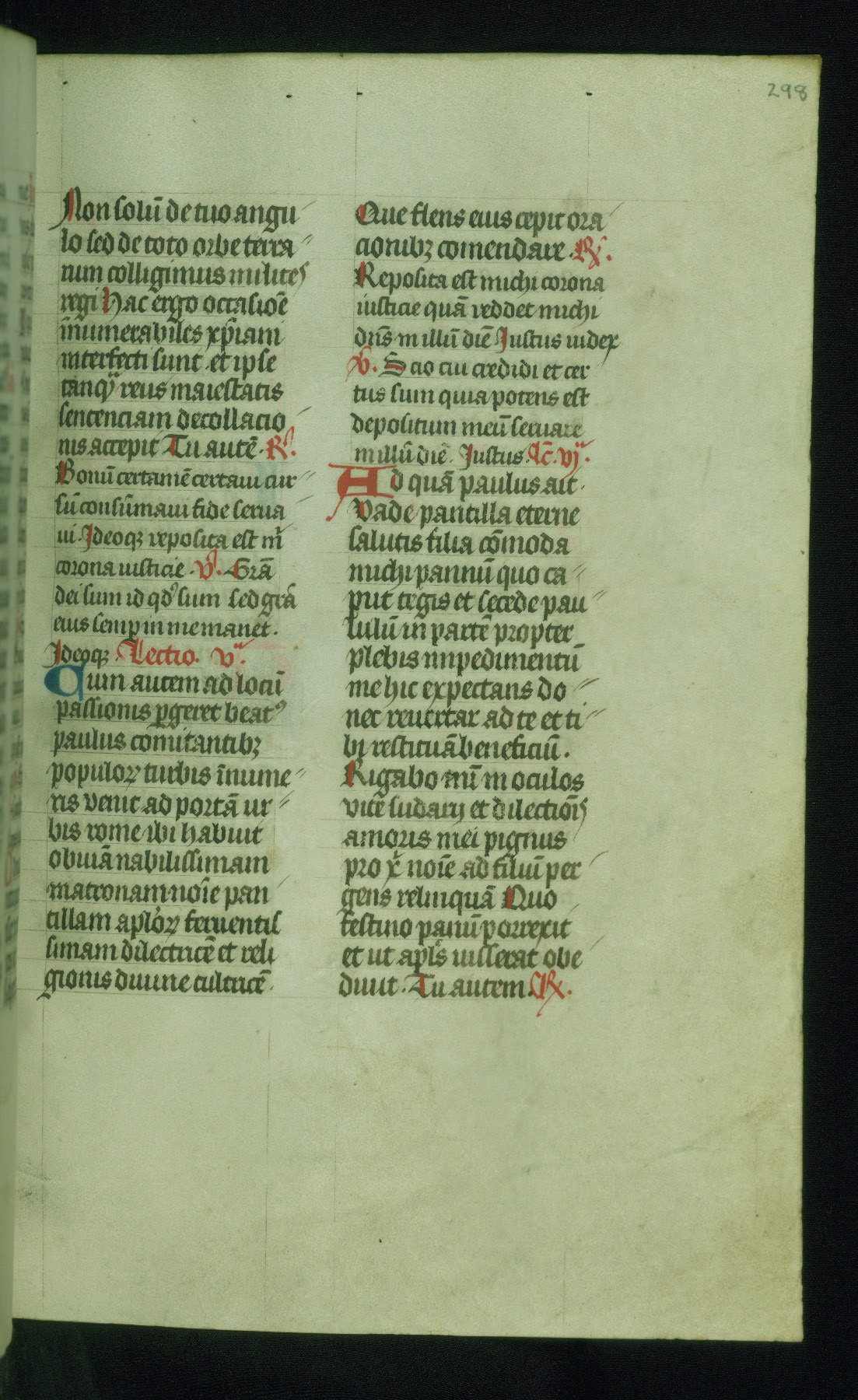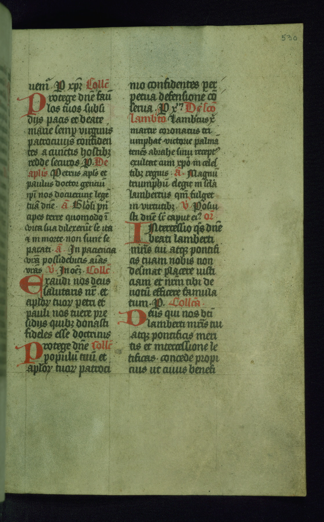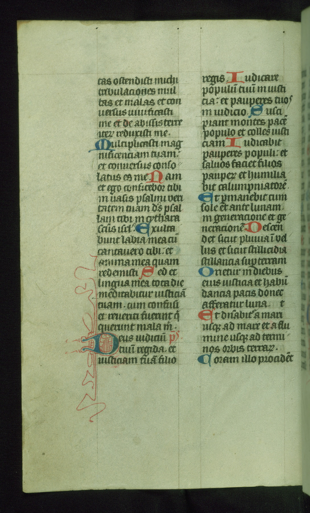 This small breviary, composed of more than 500 folios, is extraordinary for its length, considering it is the summer portion of a two-volume breviary for the use of Liège. The manuscript was completed for ecclesiastical use at the Cathedral of Notre-Dame and St.-Lambert in Liège ca. 1420. This attribution is suggested, for instance, by the petitions to the congregation of this cathedral (fols. 114v-117v), as well as the armorial shield of the family of Surlet de Chokier of Liège represented at the opening of the Psalms. The manuscript has modest, but interesting, decoration with historiated and decorated initials marking the liturgical texts, and occasional angels playing instruments in the margins. The most notable pictorial effect is found in the initials inhabited by transparent figures on rich blue ground. The technique is found, for instance, on fol. 156r with the gold monstrance held by translucent angels for the feast of the Corpus Christi.