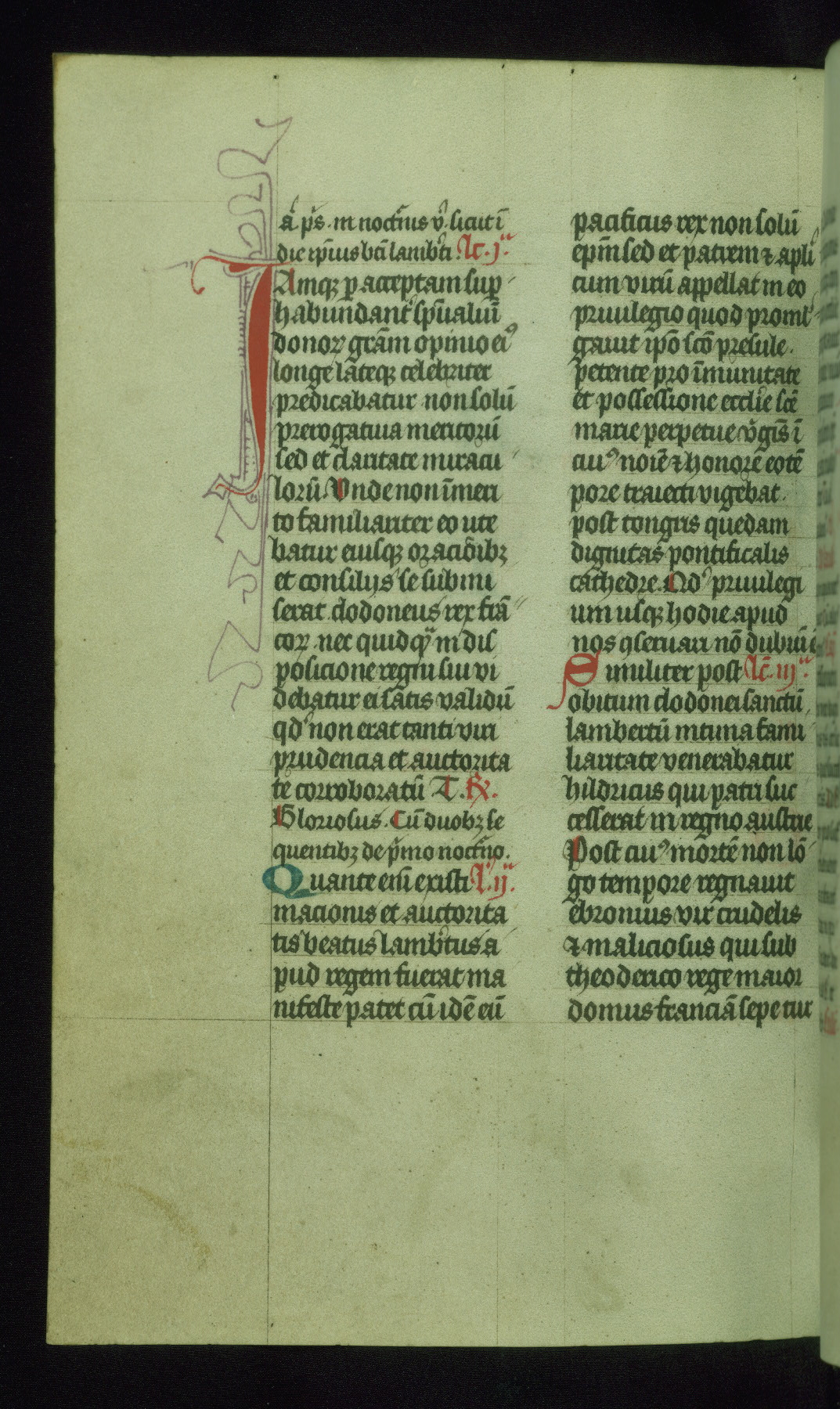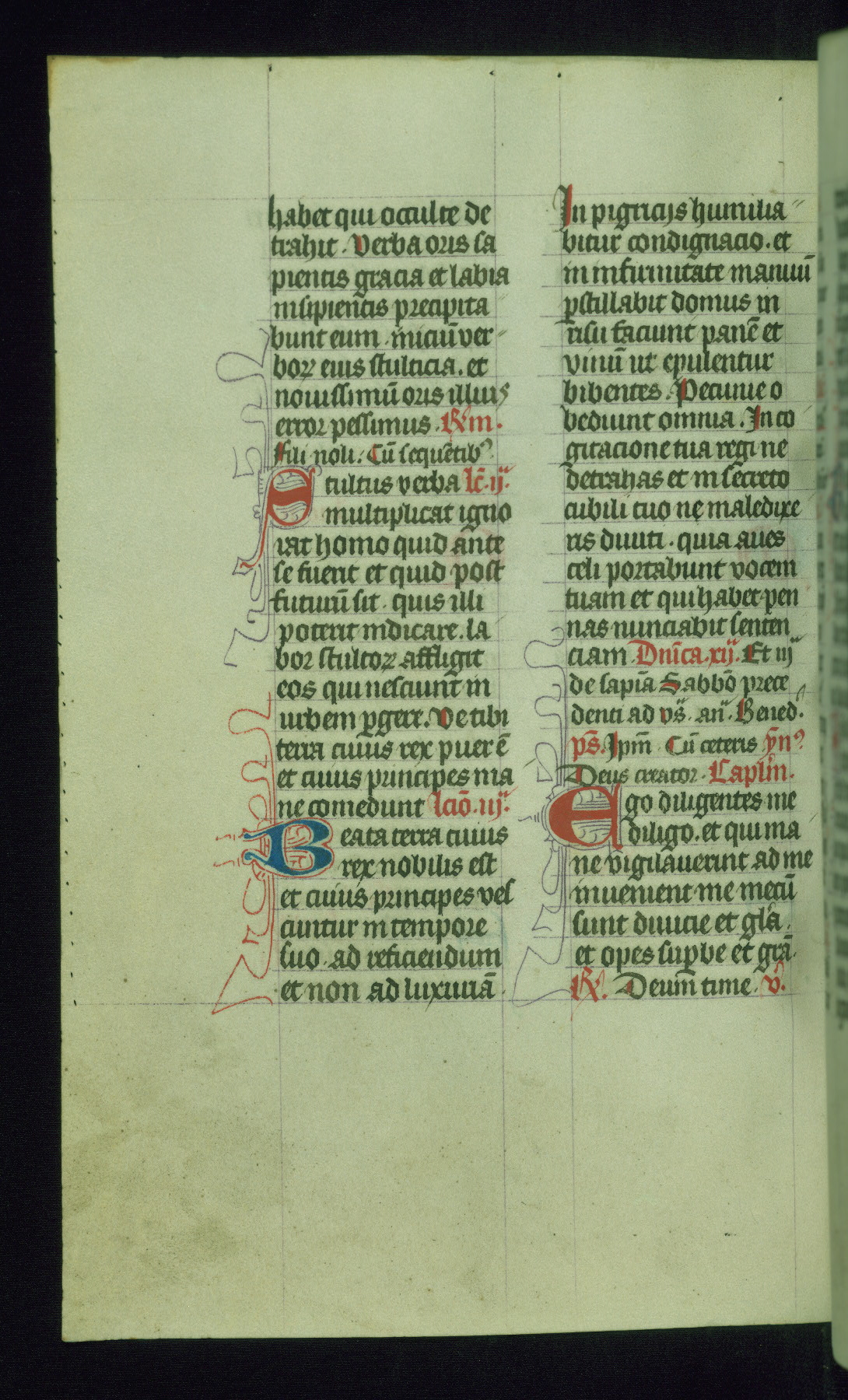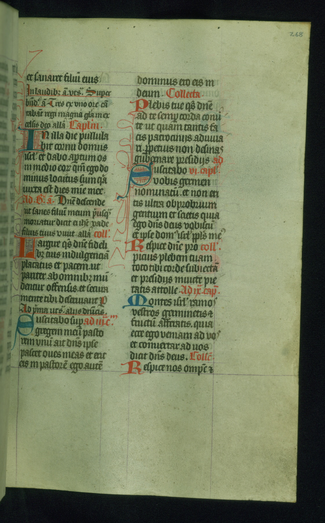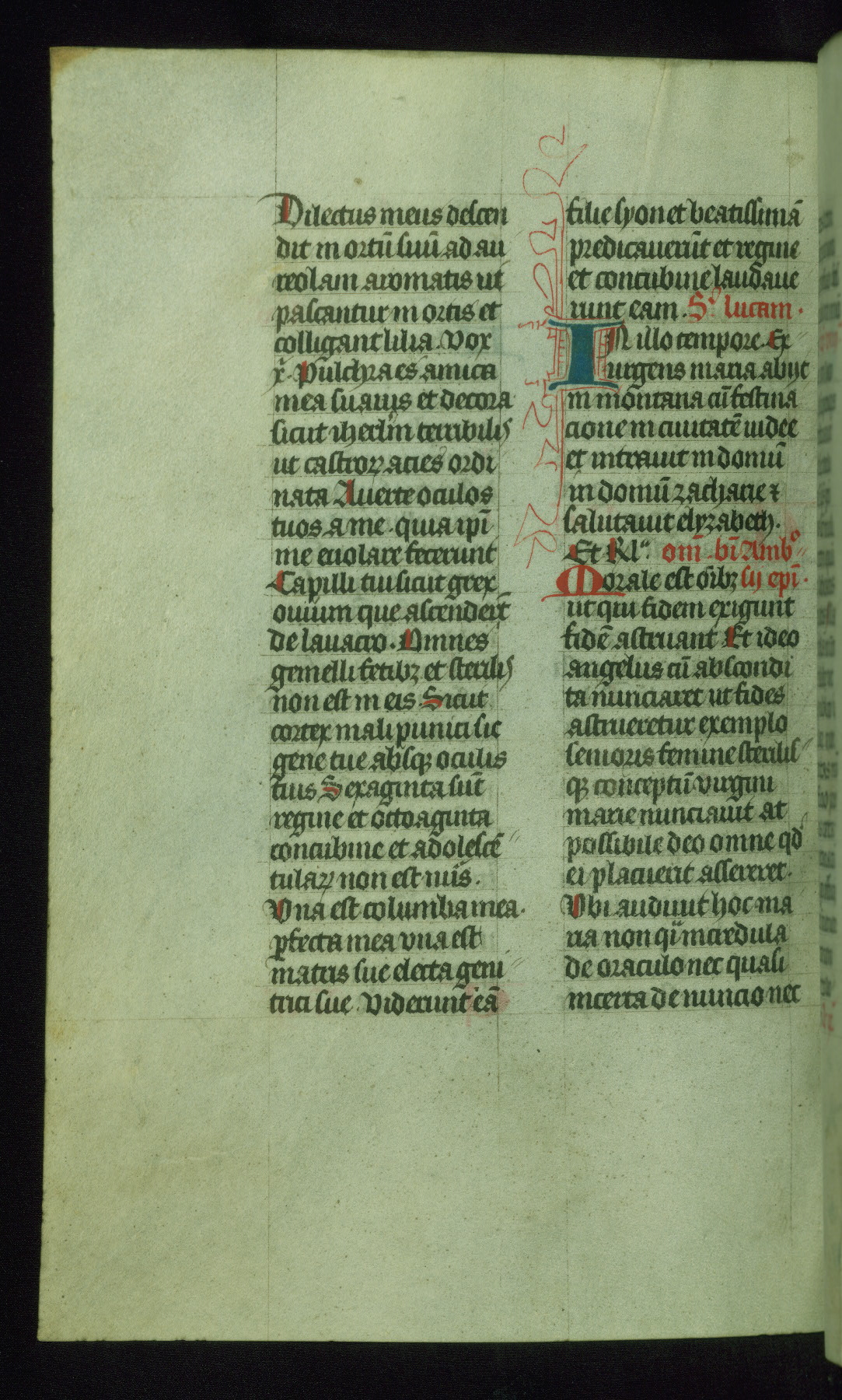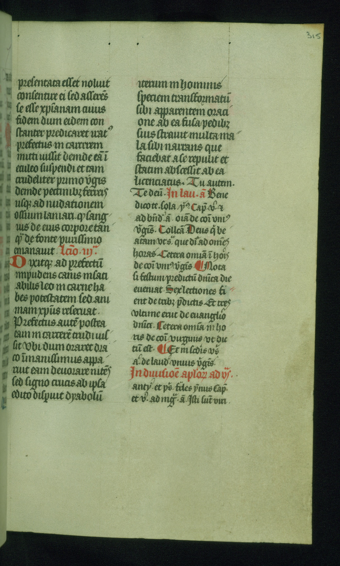 This small breviary, composed of more than 500 folios, is extraordinary for its length, considering it is the summer portion of a two-volume breviary for the use of Liège. The manuscript was completed for ecclesiastical use at the Cathedral of Notre-Dame and St.-Lambert in Liège ca. 1420. This attribution is suggested, for instance, by the petitions to the congregation of this cathedral (fols. 114v-117v), as well as the armorial shield of the family of Surlet de Chokier of Liège represented at the opening of the Psalms. The manuscript has modest, but interesting, decoration with historiated and decorated initials marking the liturgical texts, and occasional angels playing instruments in the margins. The most notable pictorial effect is found in the initials inhabited by transparent figures on rich blue ground. The technique is found, for instance, on fol. 156r with the gold monstrance held by translucent angels for the feast of the Corpus Christi.