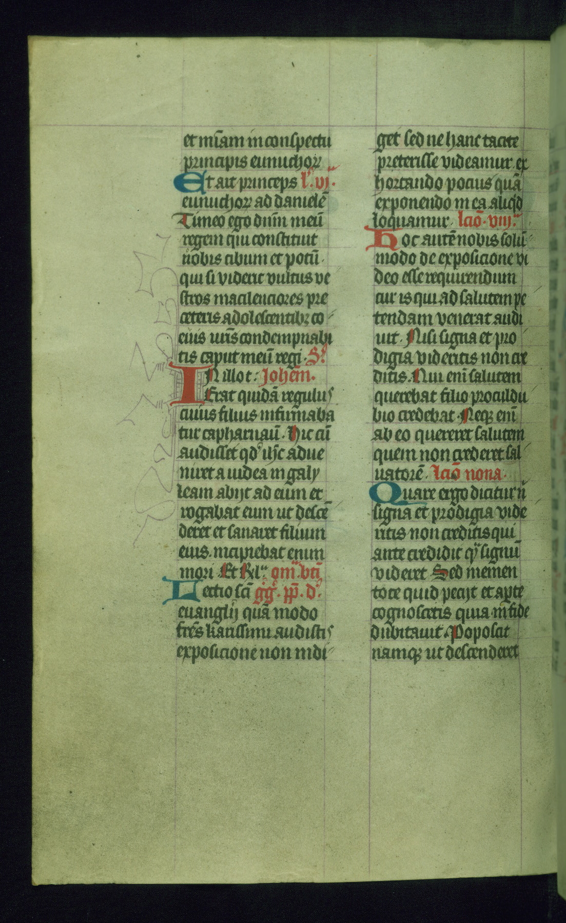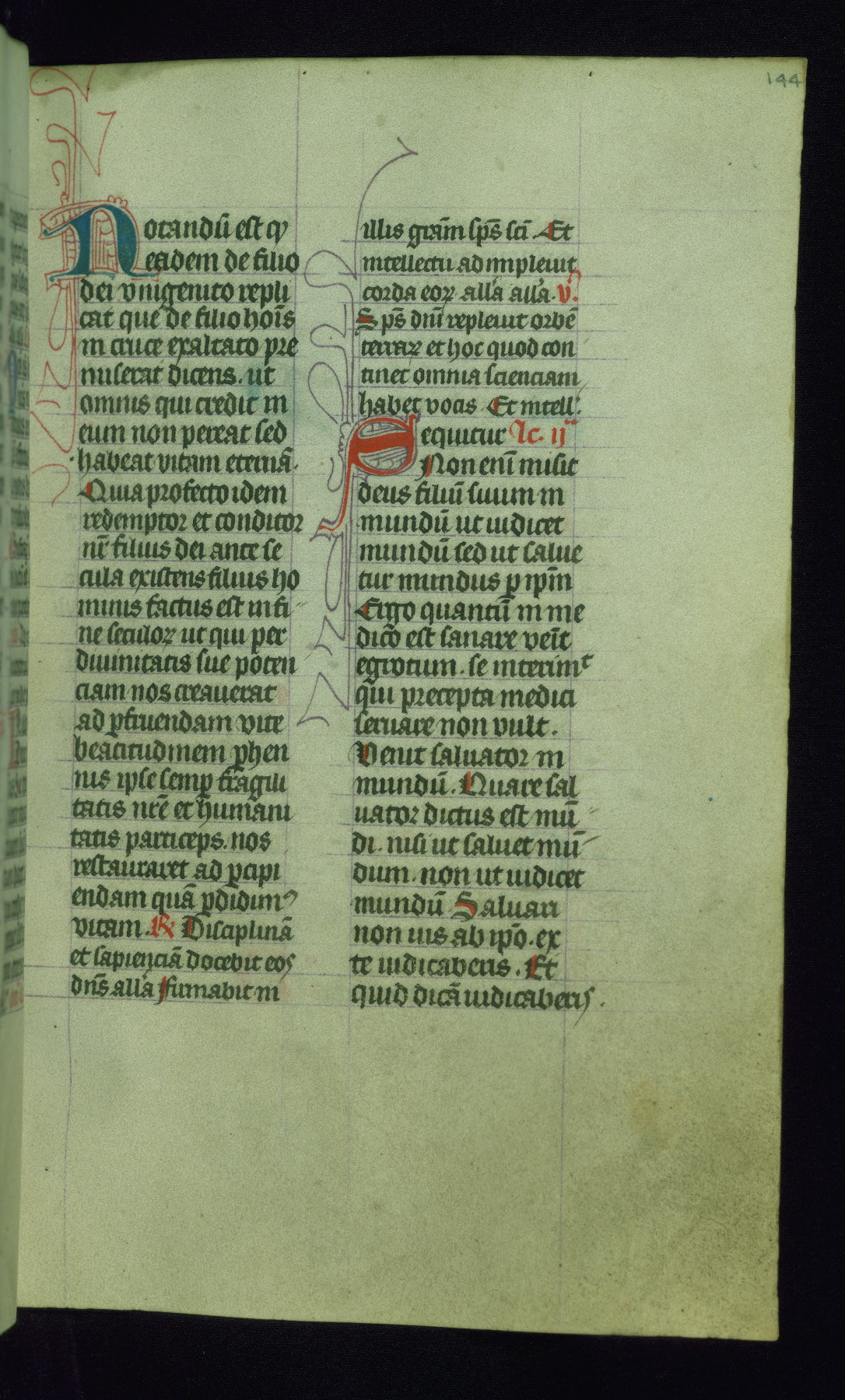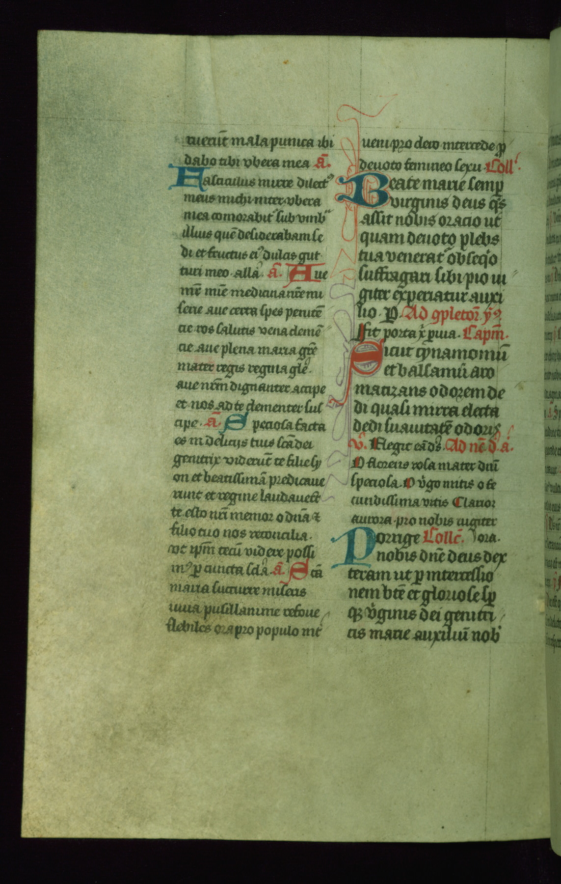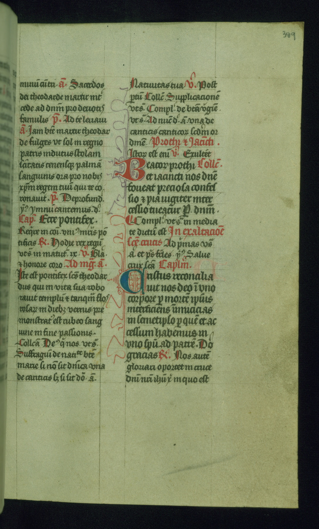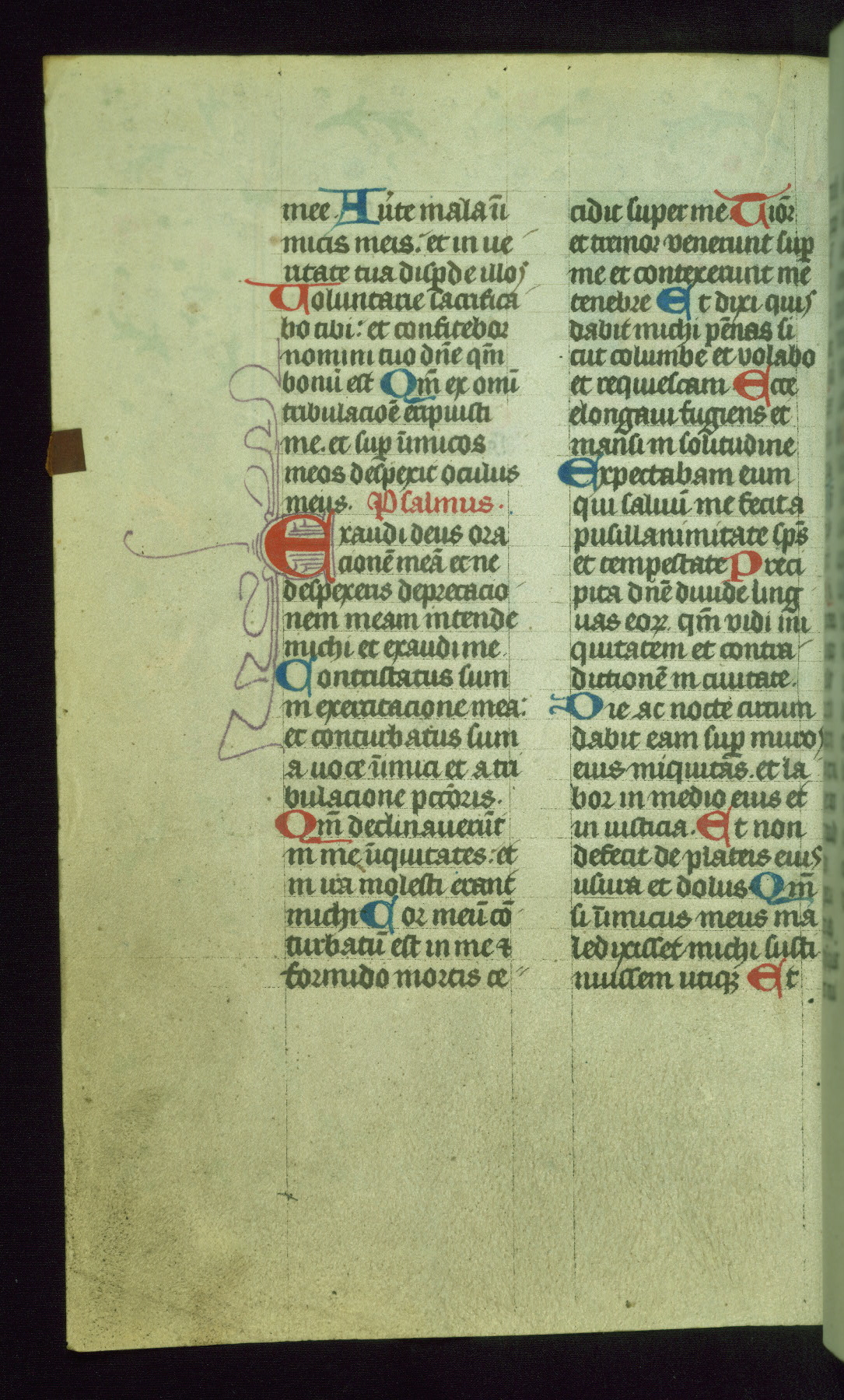 This small breviary, composed of more than 500 folios, is extraordinary for its length, considering it is the summer portion of a two-volume breviary for the use of Liège. The manuscript was completed for ecclesiastical use at the Cathedral of Notre-Dame and St.-Lambert in Liège ca. 1420. This attribution is suggested, for instance, by the petitions to the congregation of this cathedral (fols. 114v-117v), as well as the armorial shield of the family of Surlet de Chokier of Liège represented at the opening of the Psalms. The manuscript has modest, but interesting, decoration with historiated and decorated initials marking the liturgical texts, and occasional angels playing instruments in the margins. The most notable pictorial effect is found in the initials inhabited by transparent figures on rich blue ground. The technique is found, for instance, on fol. 156r with the gold monstrance held by translucent angels for the feast of the Corpus Christi.